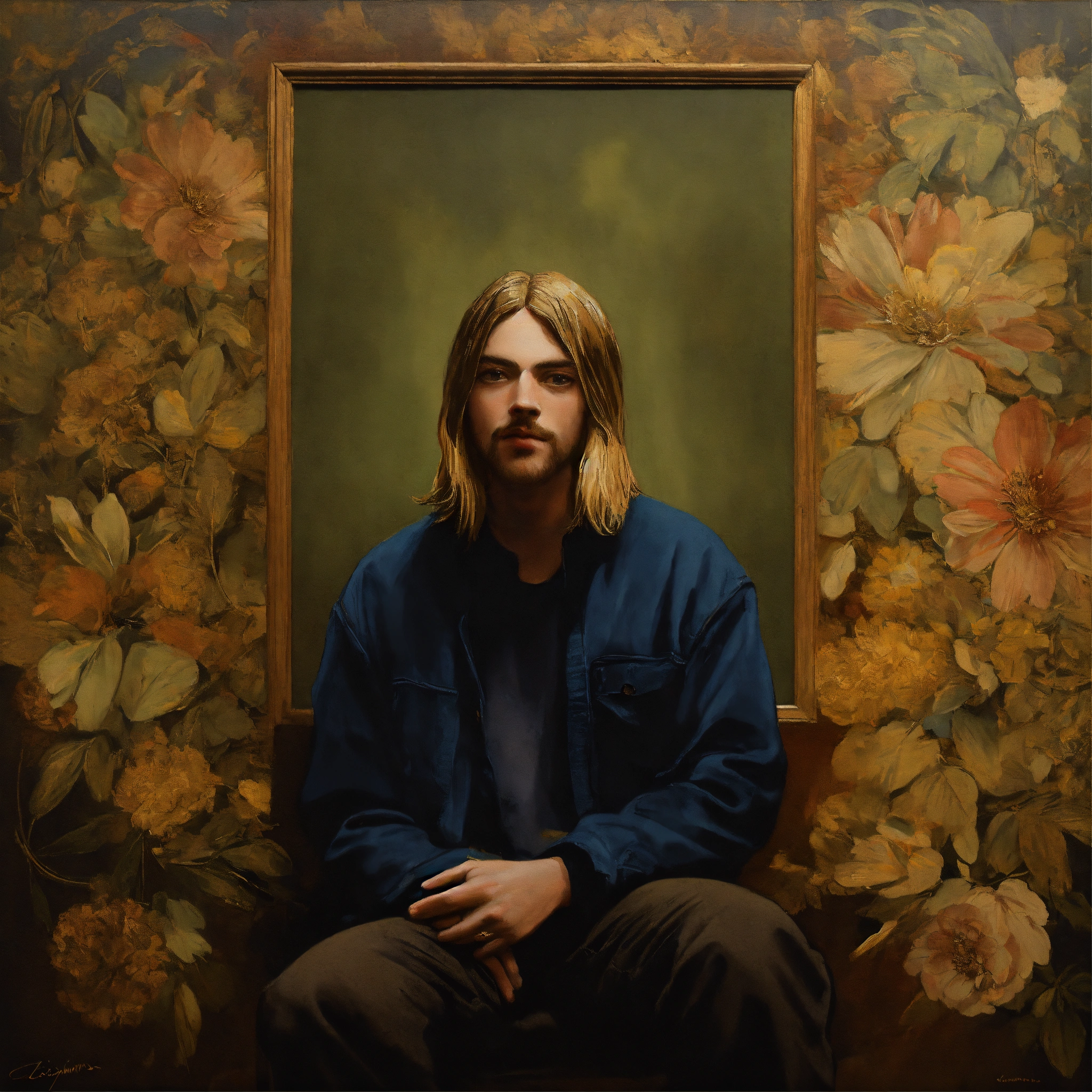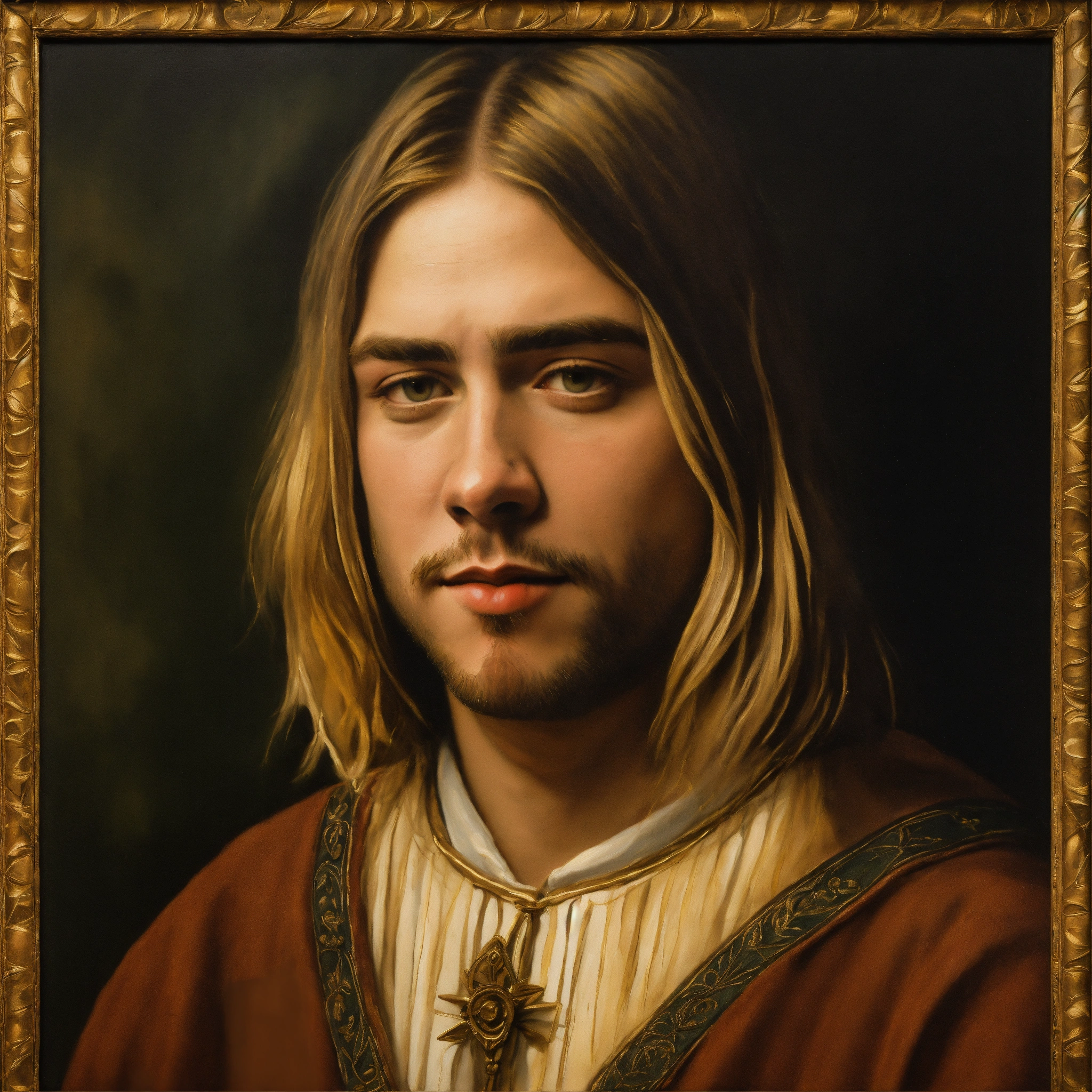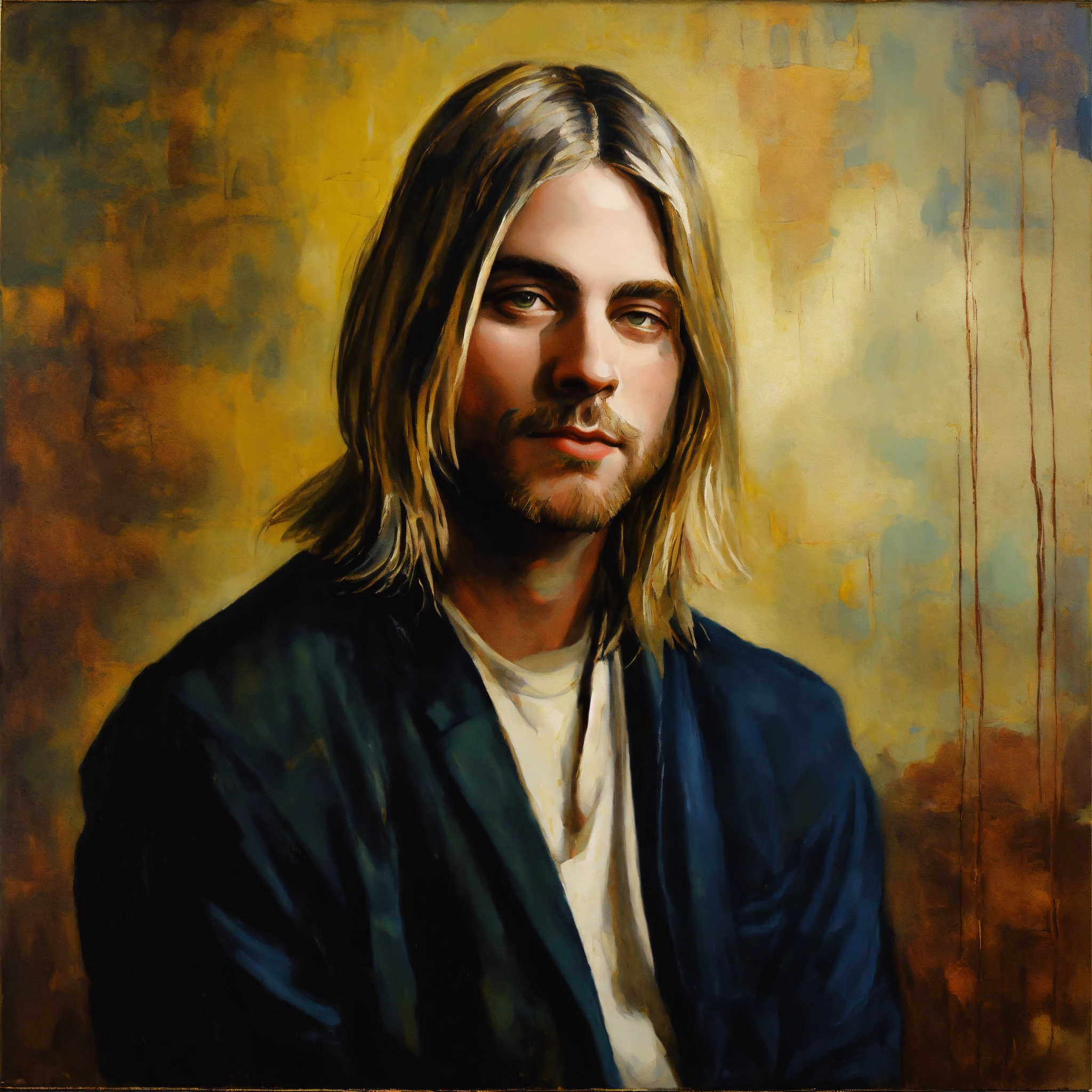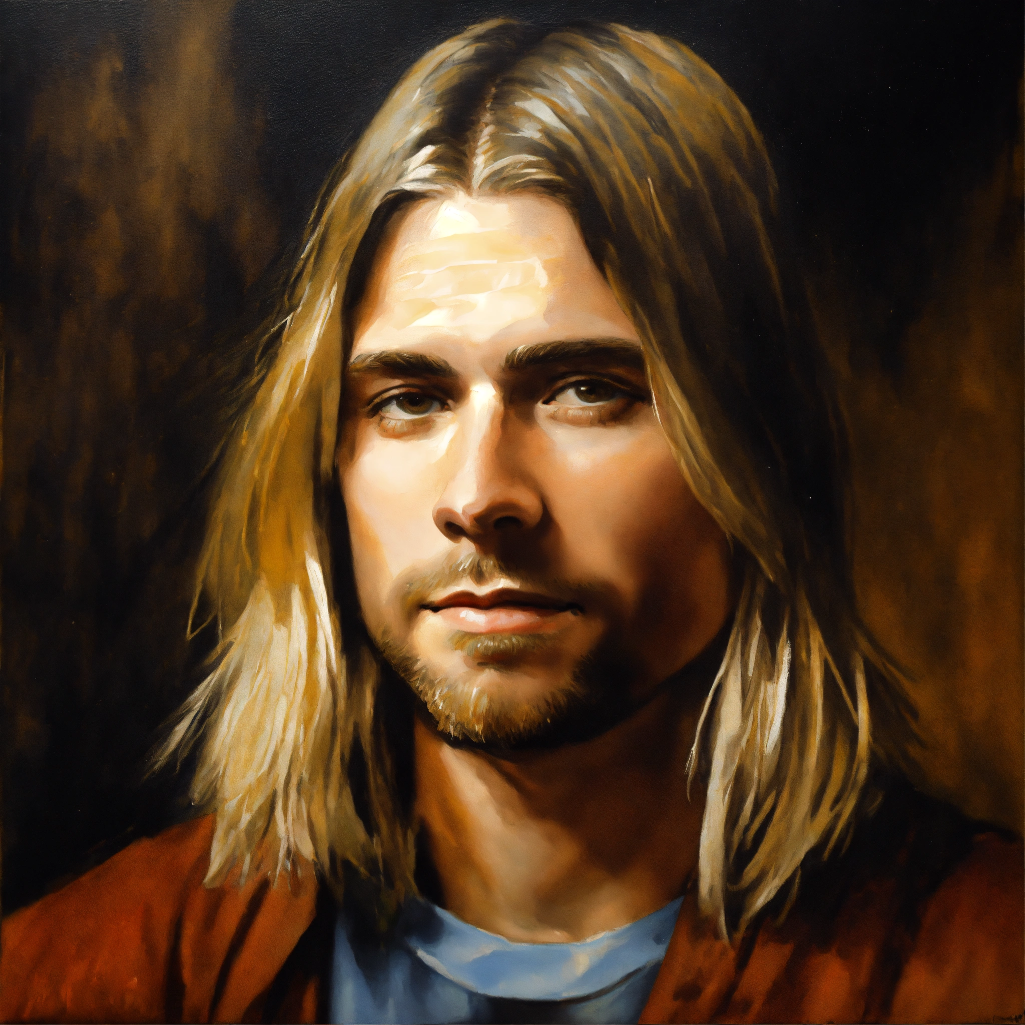 A portrait of kurt cobain in the style of leonardo da vinci, with a similar vibe to the mona lisa. kurt cobain should be seated in a chair, with a slightly enigmatic smile. the painting should be set in a dark, atmospheric room with a single window letting in a shaft of light. the overall tone of the painting should be moody and introspective. additional instructions use high-quality brushstrokes and a smooth, blended finish. pay close attention to the details of kurt cobains face, including his facial features, hair, and skin texture. use a limited palette of colors, with an emphasis on earthy tones. create a sense of depth and dimension in the painting.