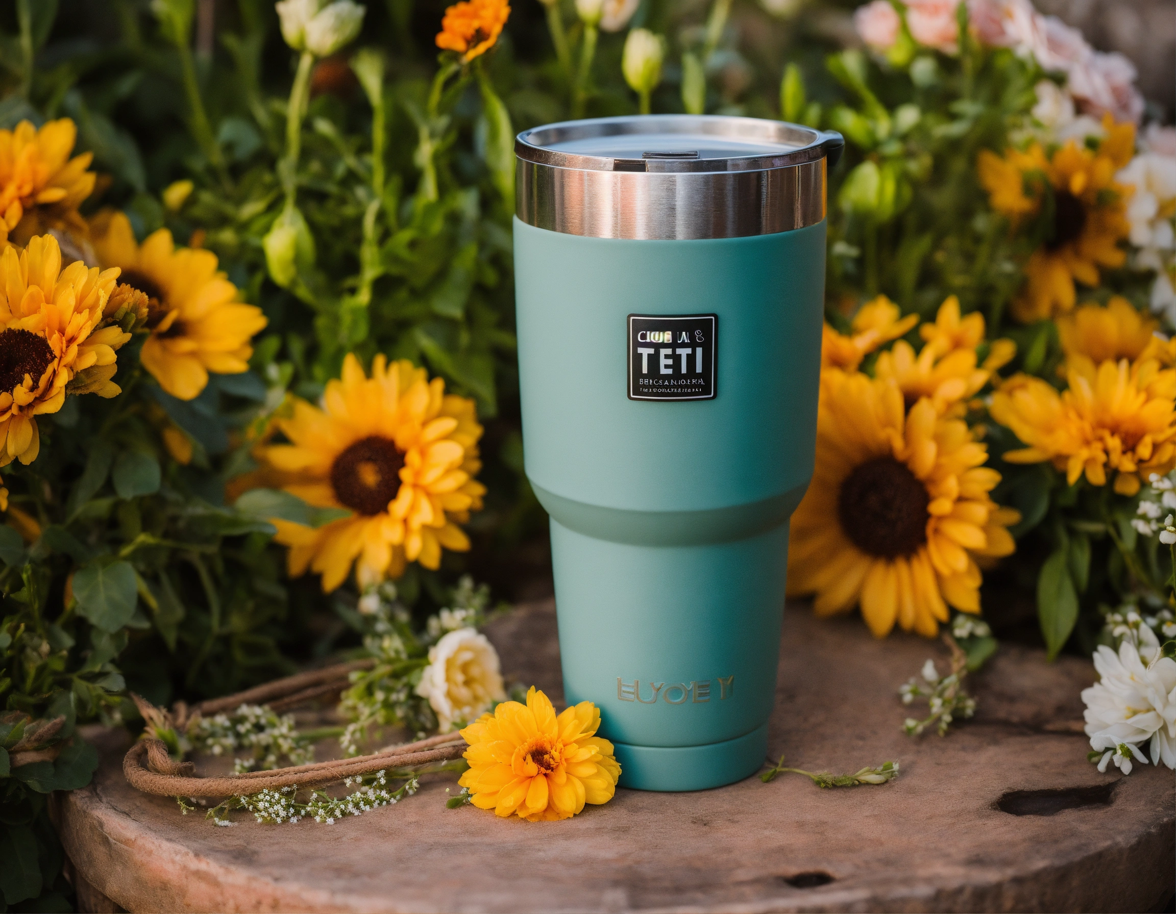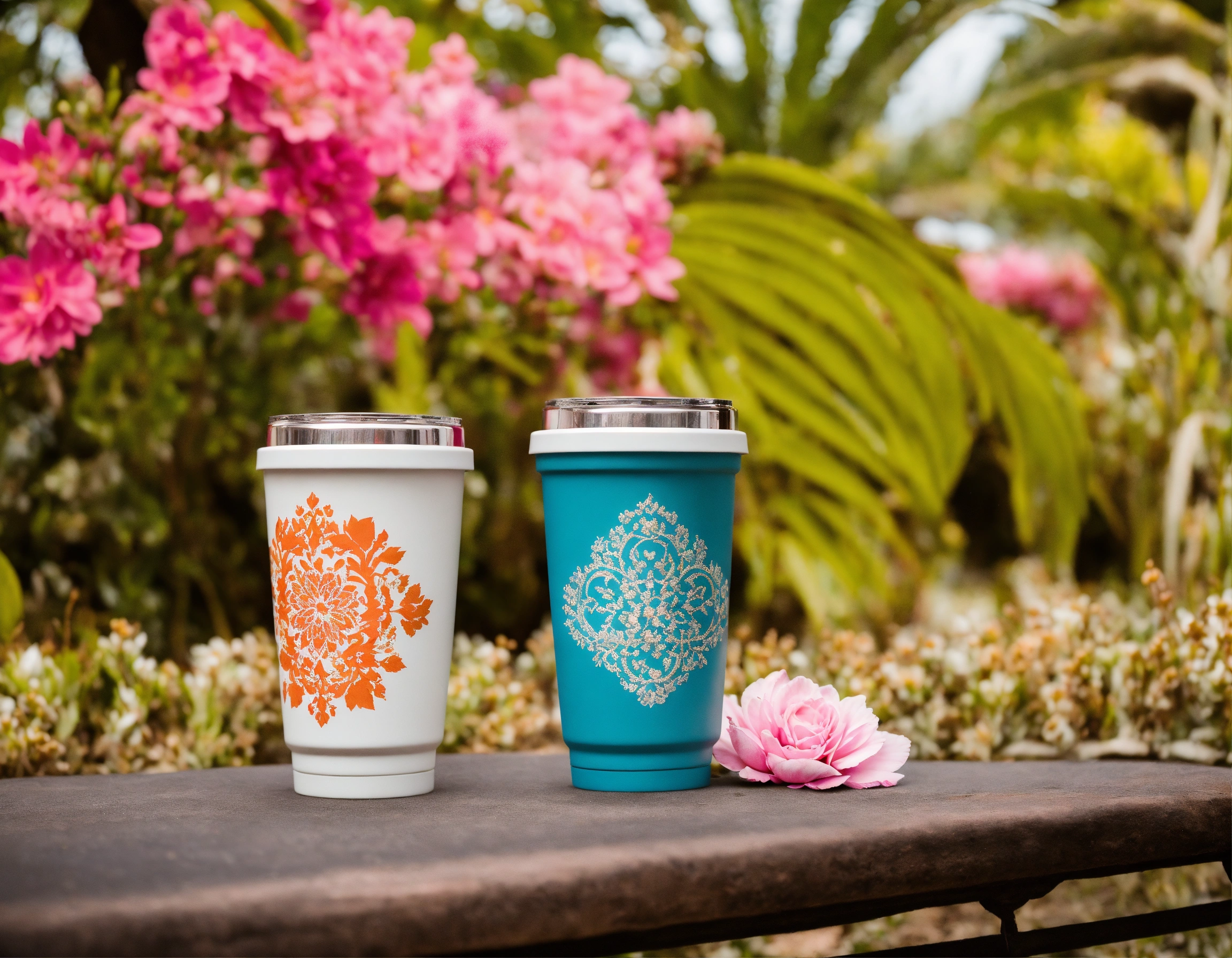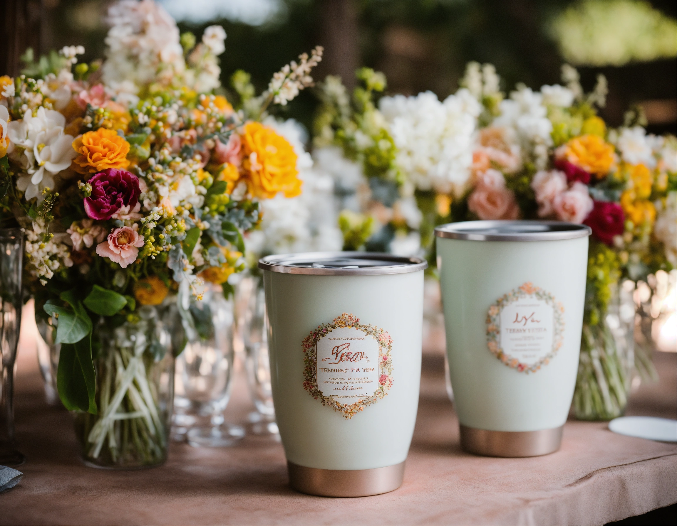 Imagen tipo fotográfica realista de producto de parejas combinadas de vasos termicos tipo yeti para el novio y la novia de una boda en locaciones de boda y ambientacion de bodas yucatecas en haciendas con flores