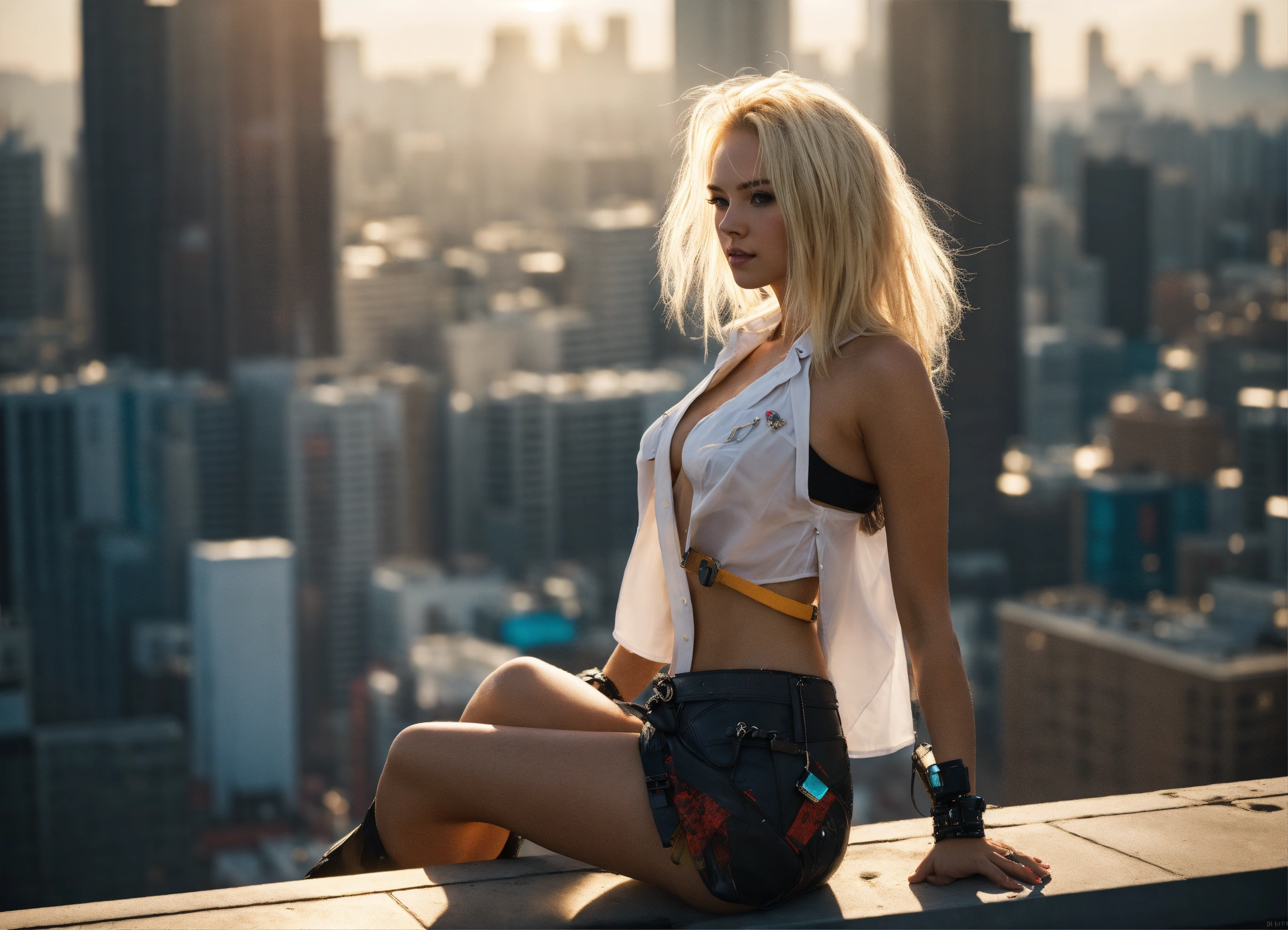 Top down view, photo, full body cyberpunk dream girls, futuristic, sunny weather, city, open shirt, bikiini, white, blond hair