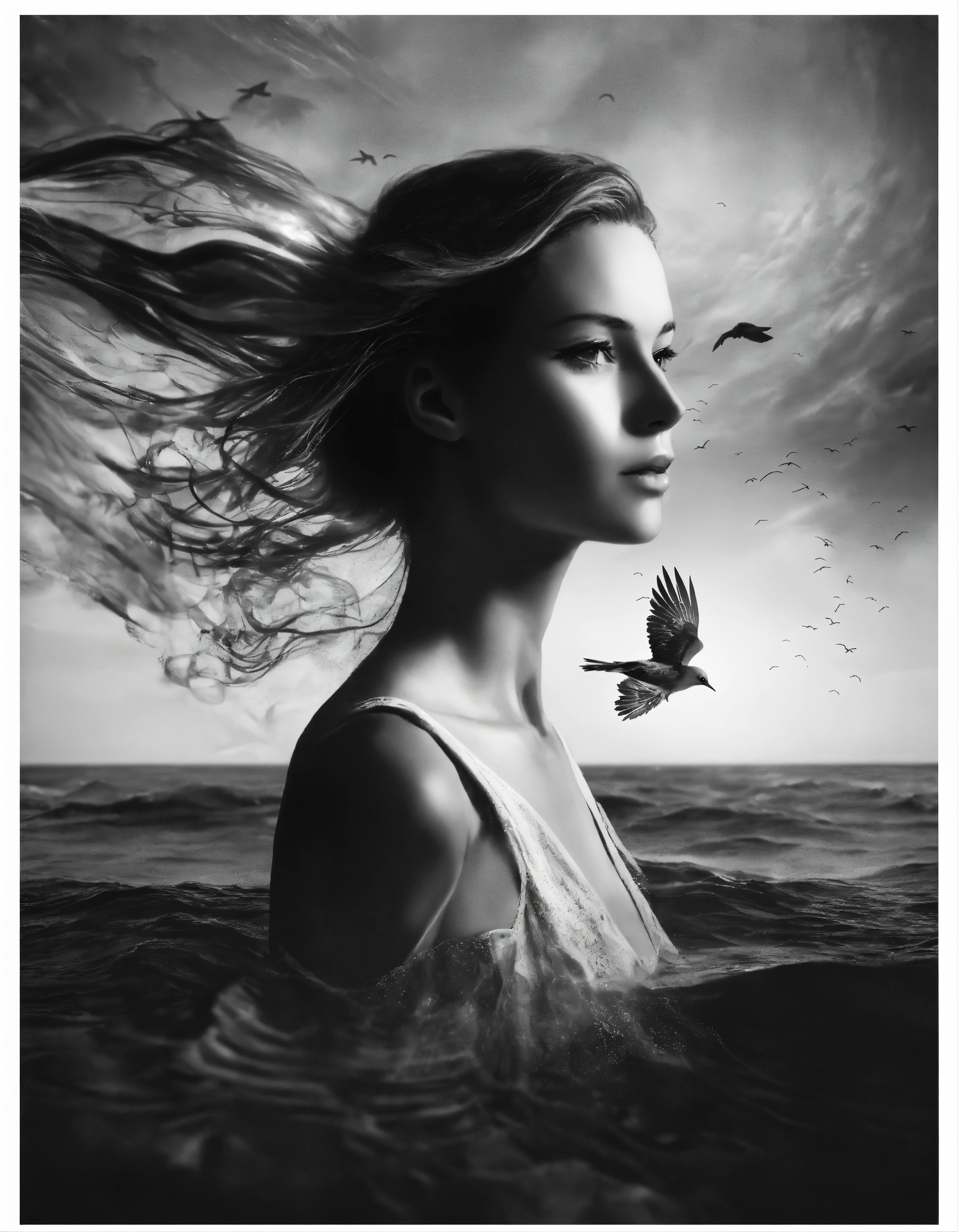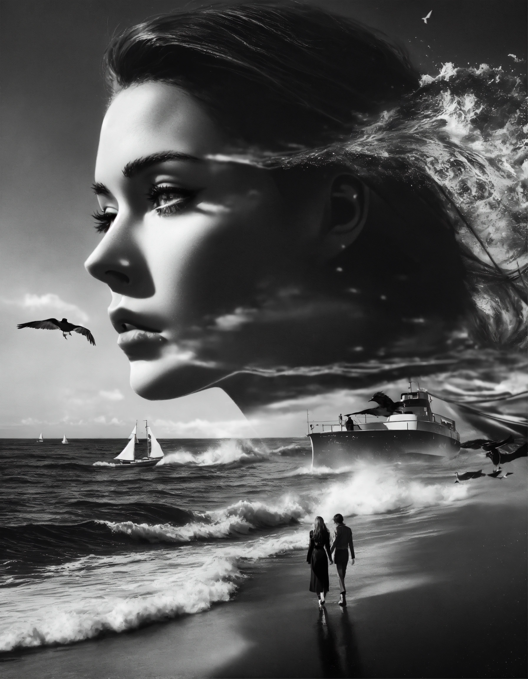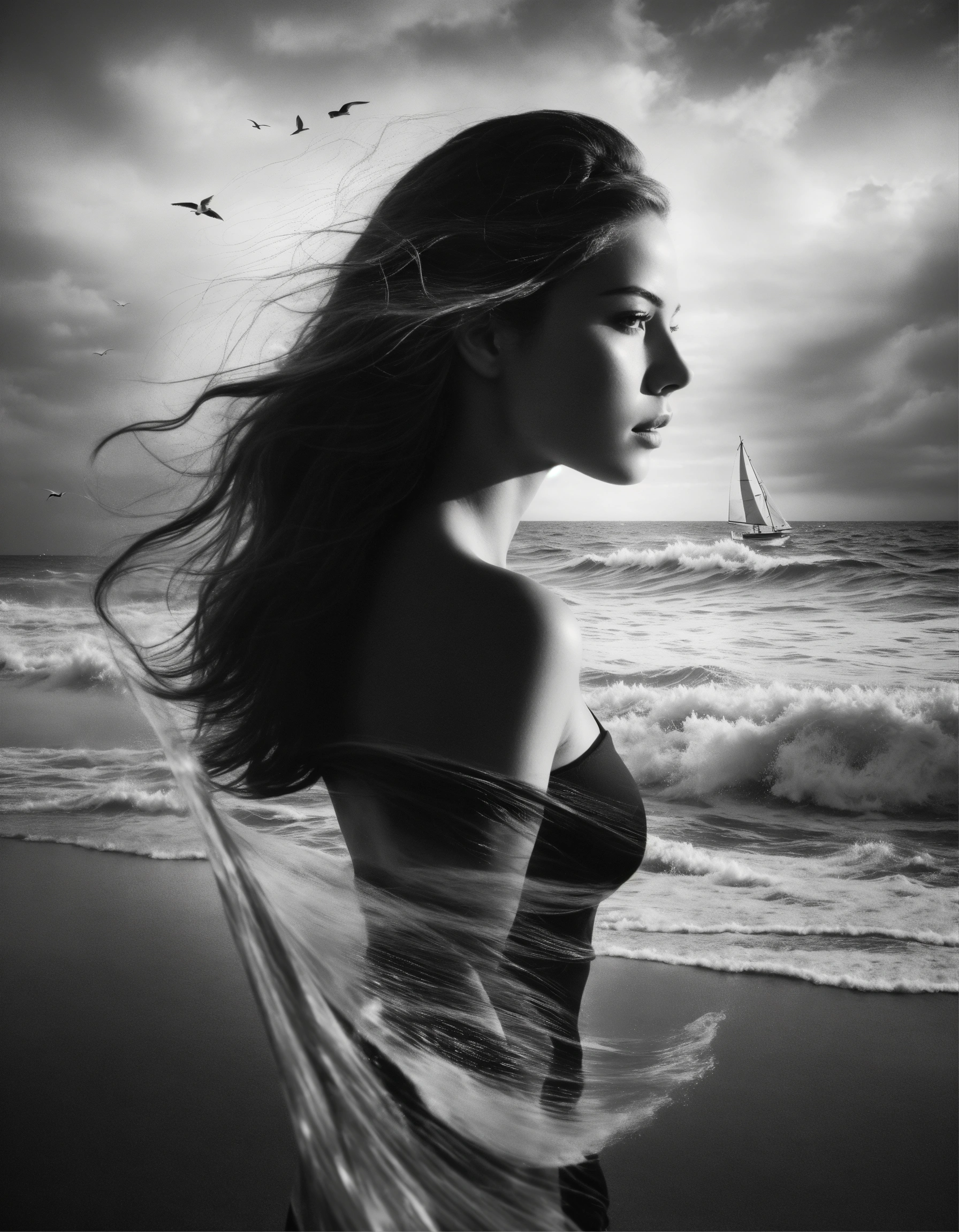 Variant, photo woman 12k ultra realistic, black and white, transparent photography, double exposure of a woman, and ocean, wave, man, beach, sailboat, and bird, black background, poster, photo, cinematic, fashion, portrait photography