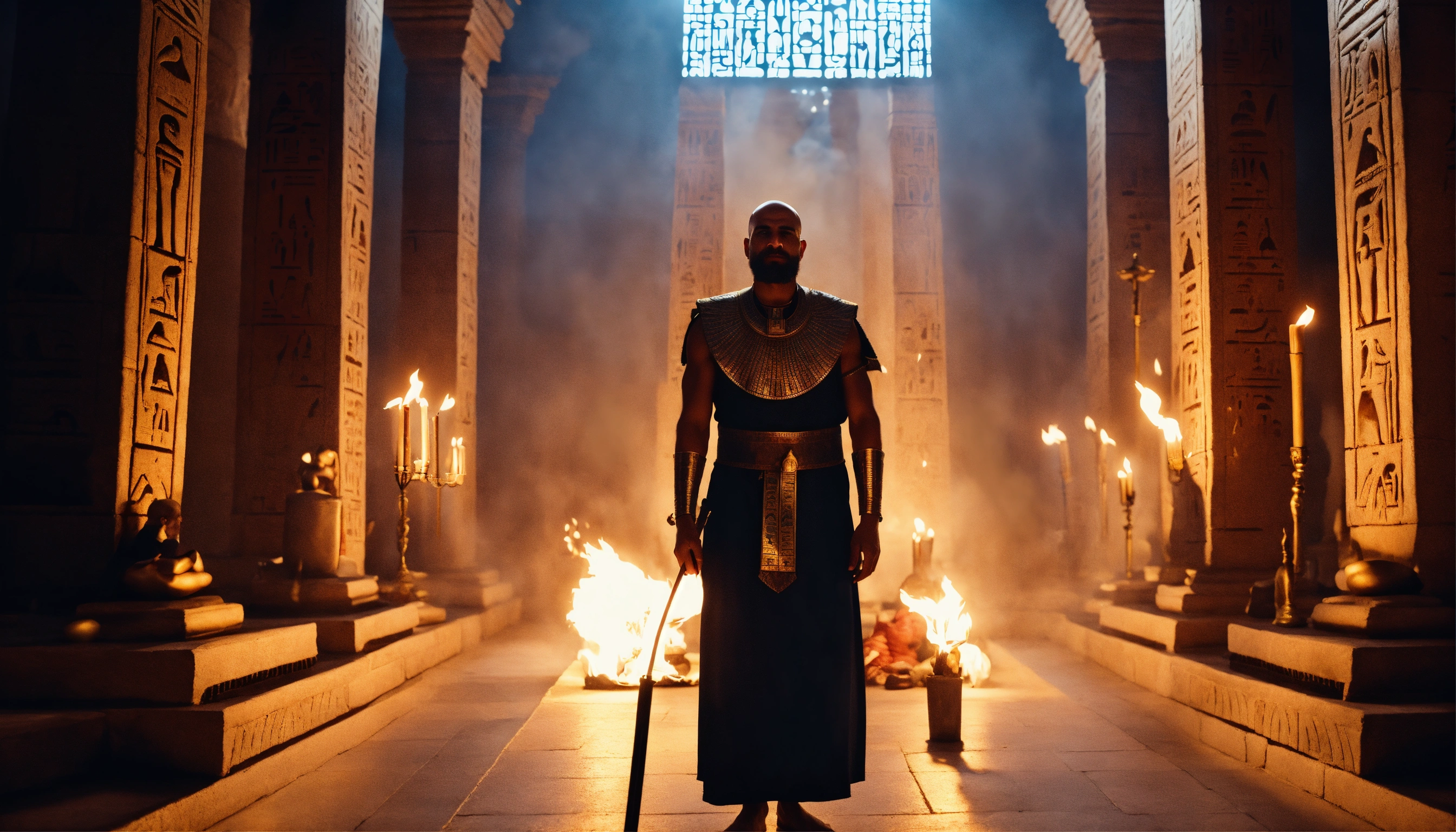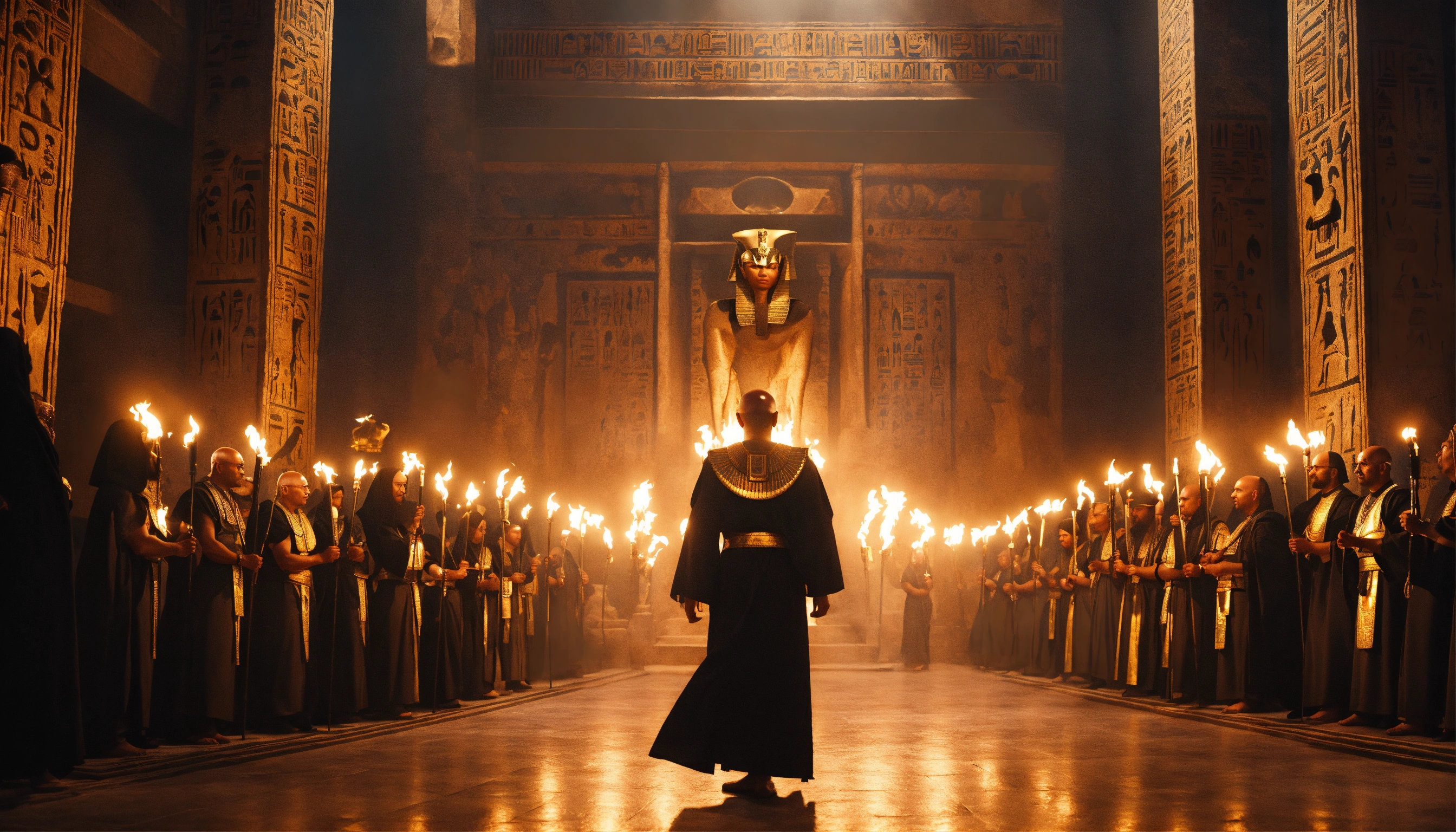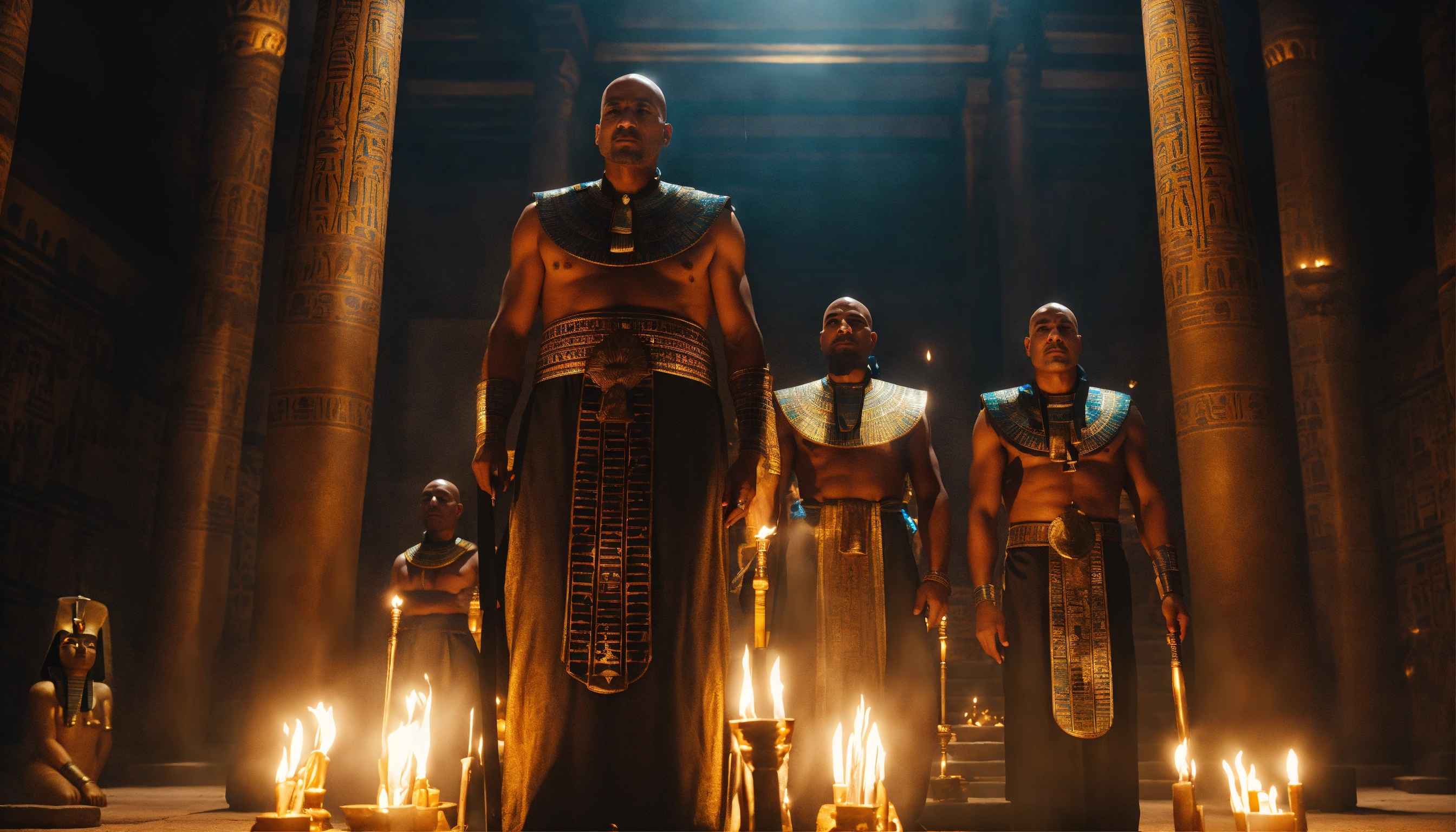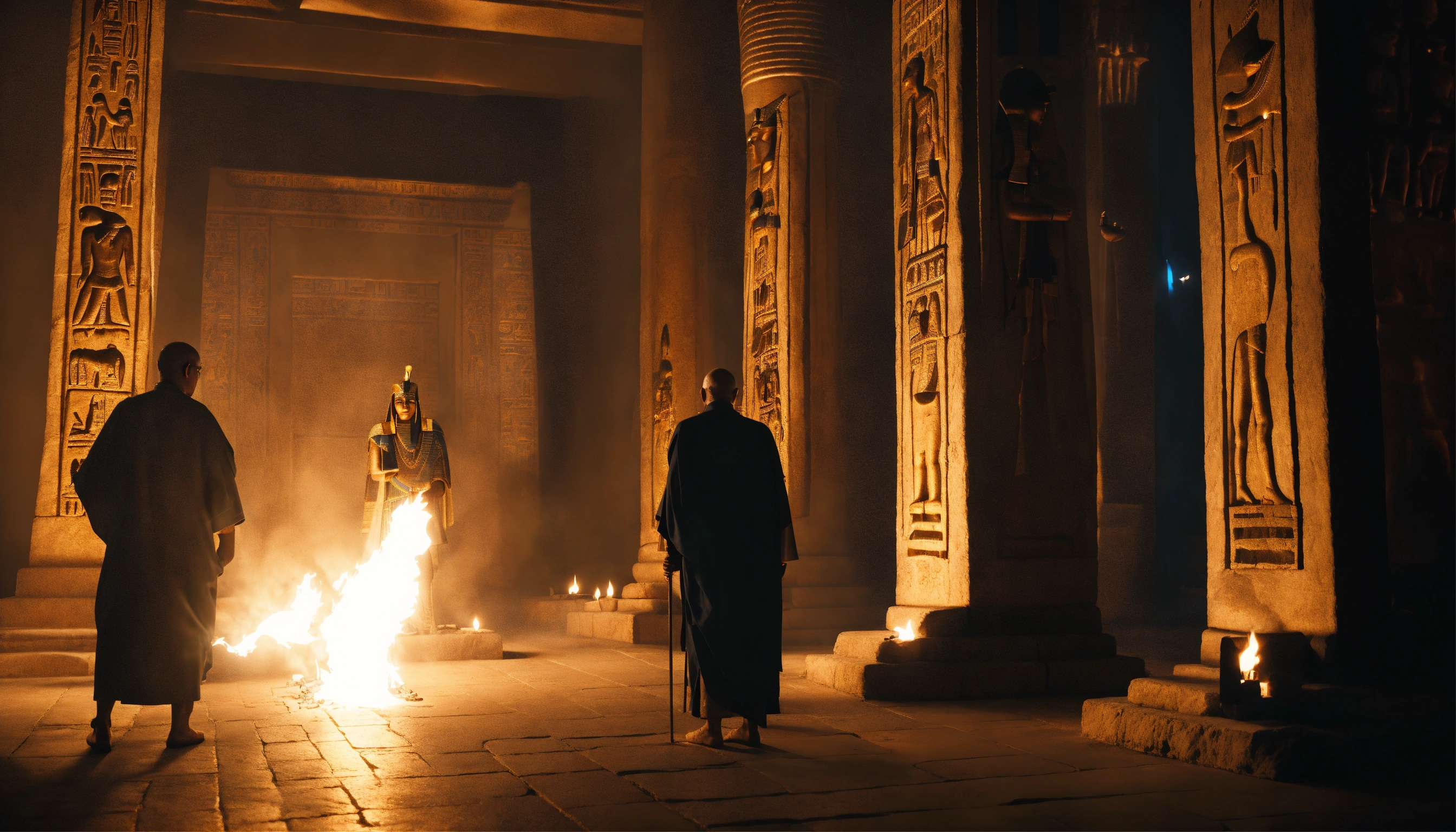 Egyptian bald priests are with the god amon-ra in the temple, they worship with torches in the dark hall, cinematic, 8k