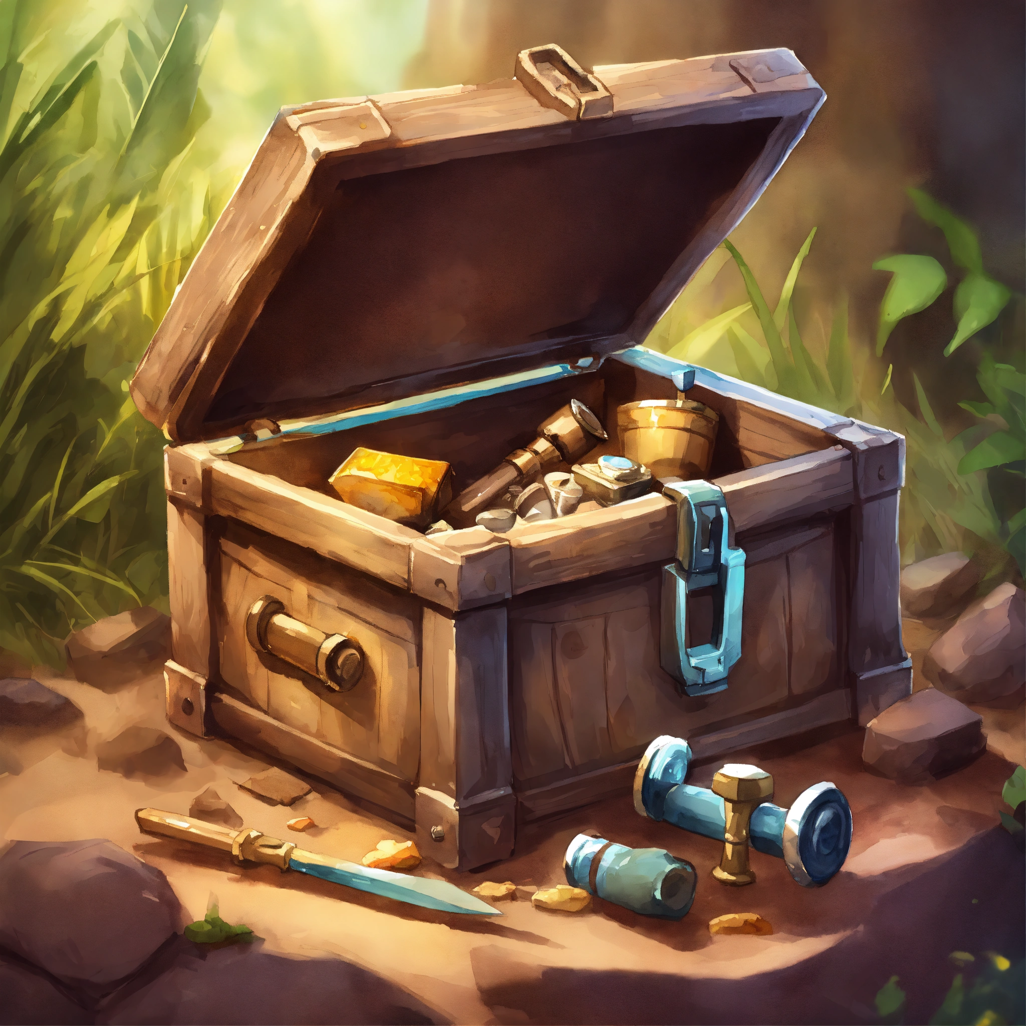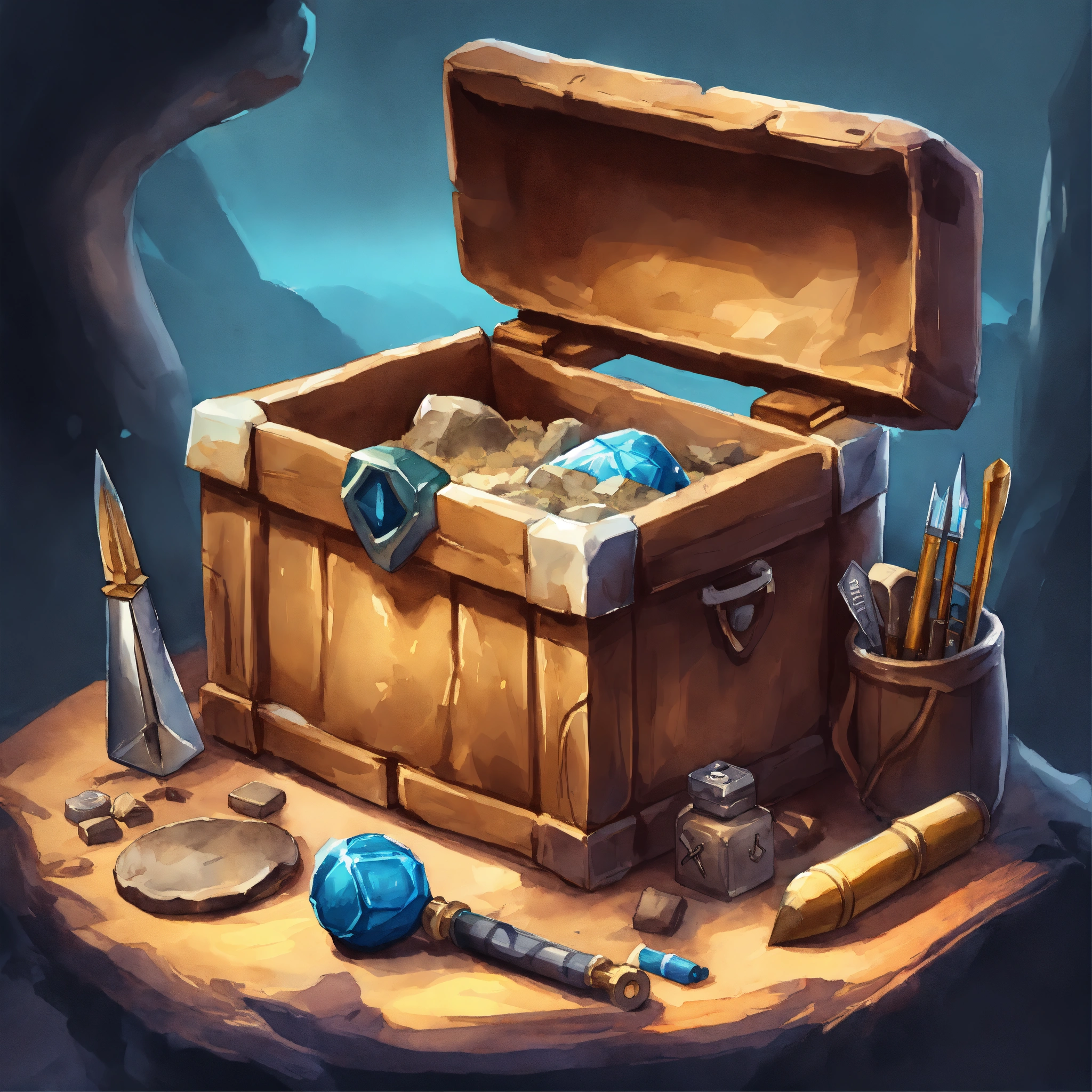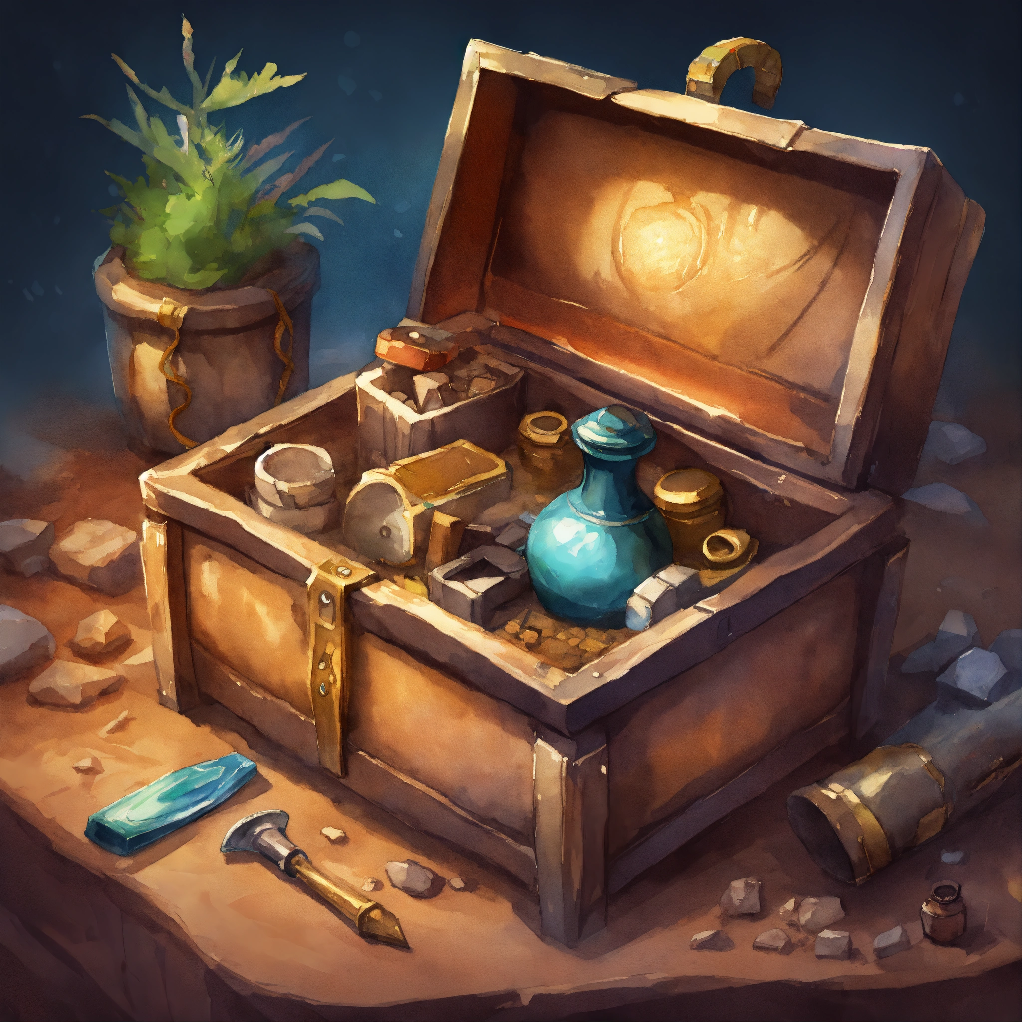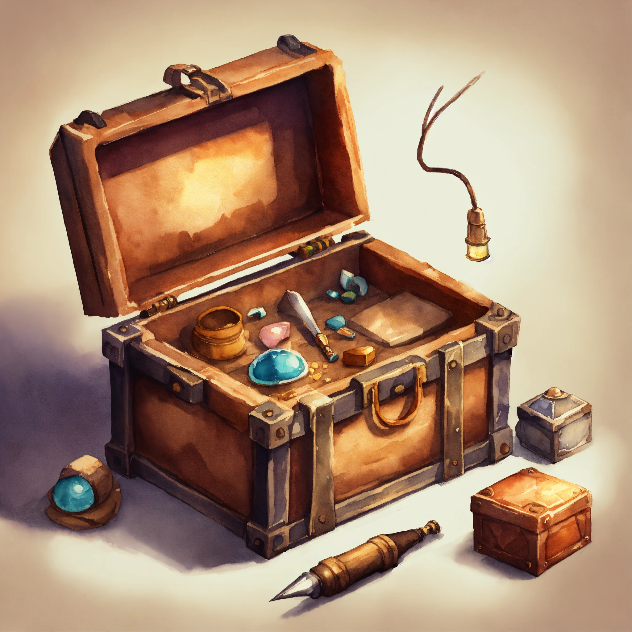 Small box with archaeologist tools, game icon, fantasy style, digital drawing, artstation, watercolor illustration