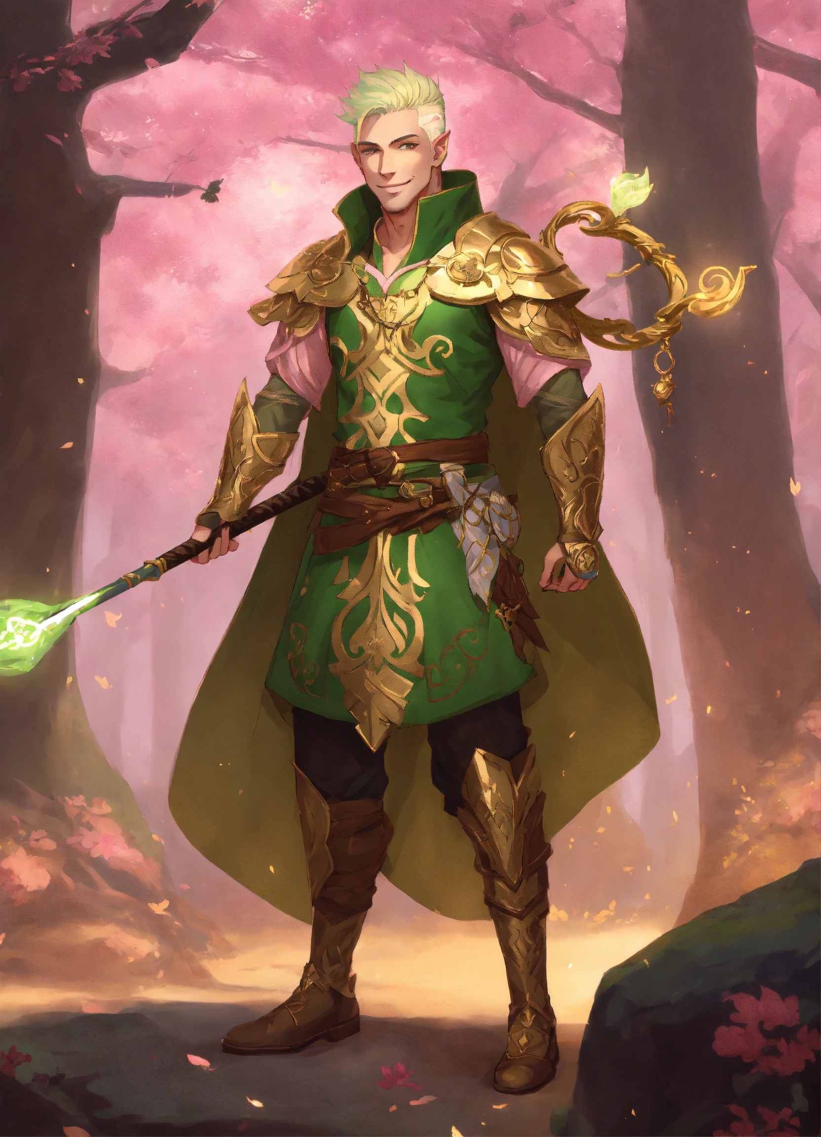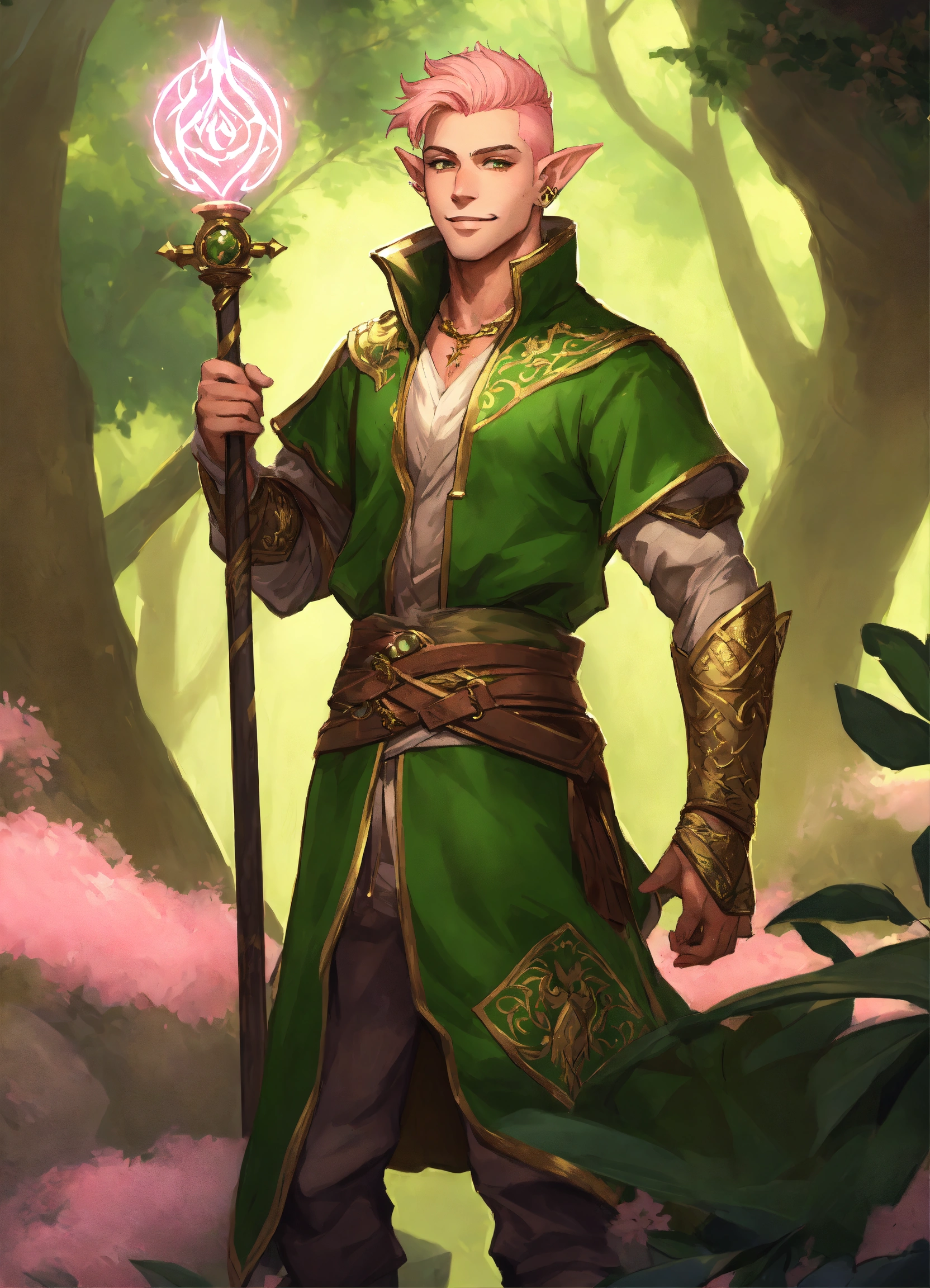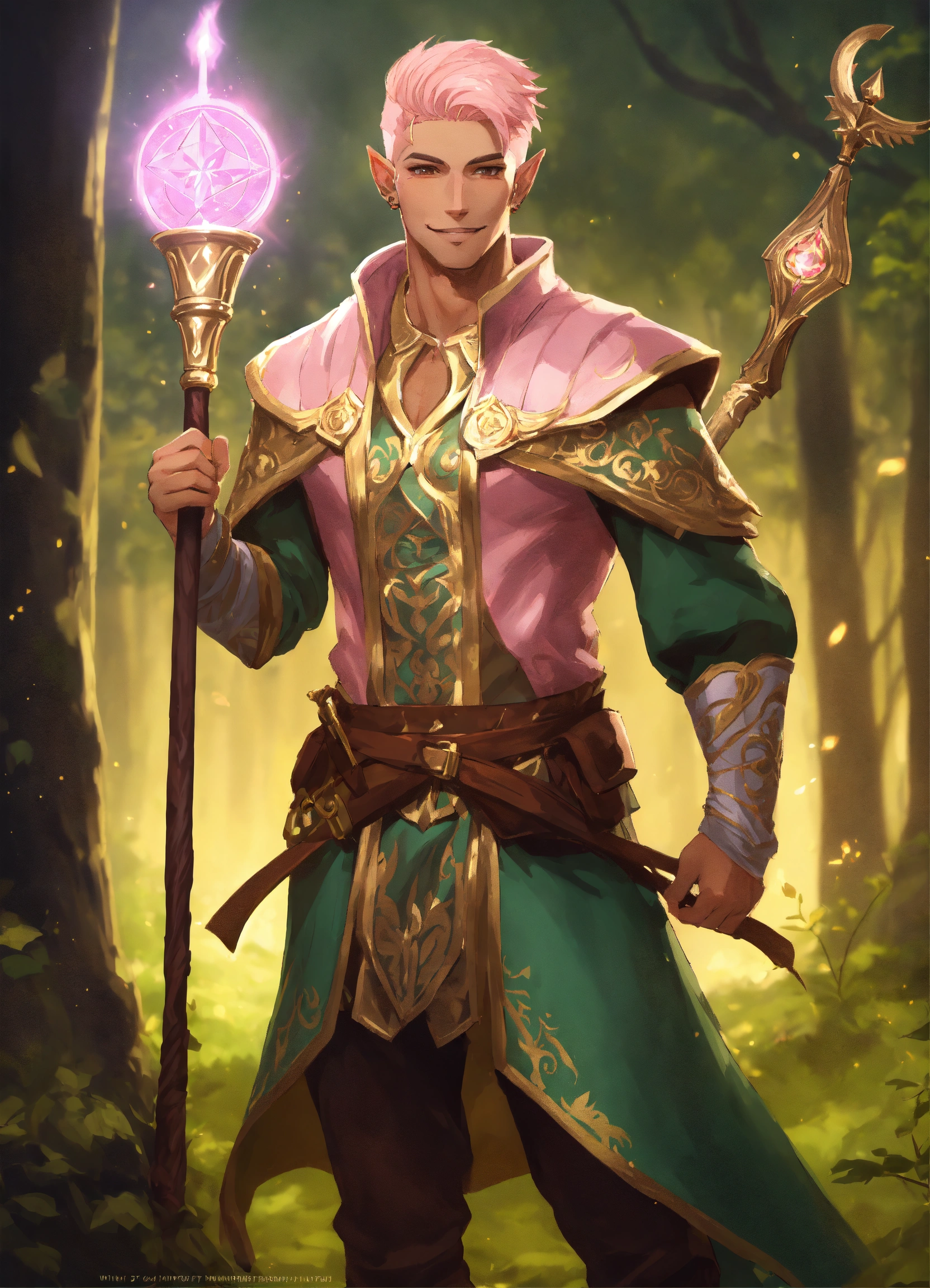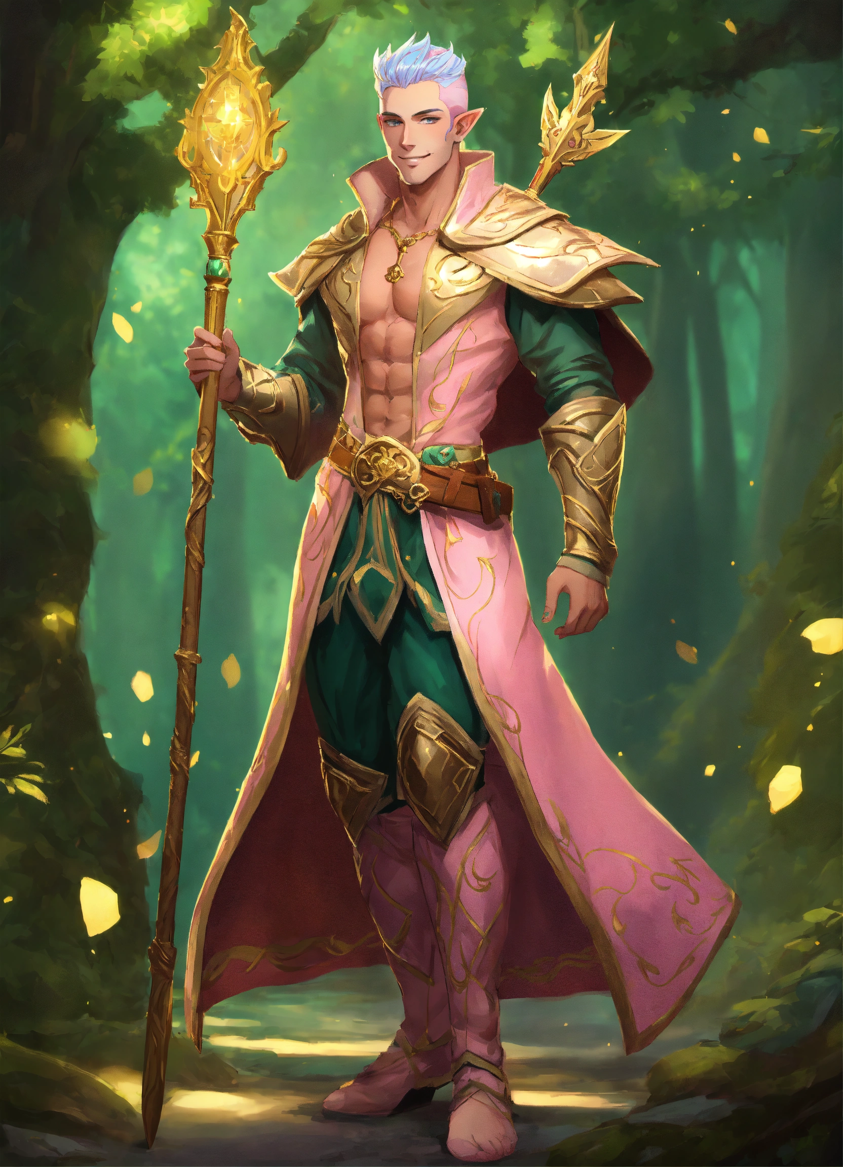 Male halfelf, pathfinder art style. 30 years full body muscular, smirk smile, short hair, casting illusion magic with a staff. very light pink hair, but withe-ish on the sides mystic face tattoos in gold color main colors, gold and light green same pink and gold color for background, in a mystic forest light mystic robe elf ears