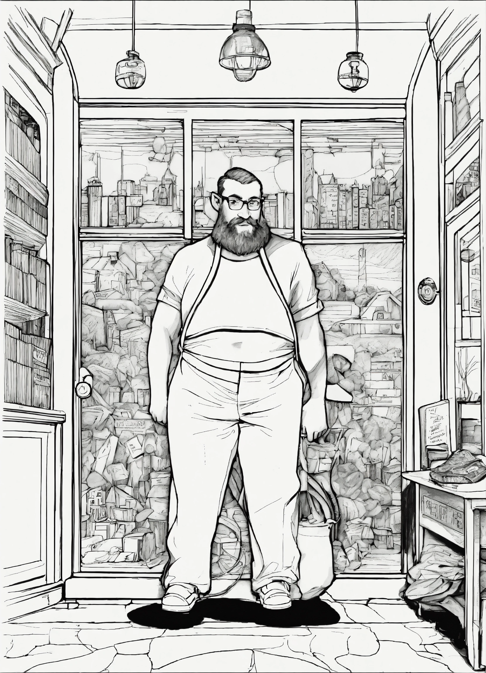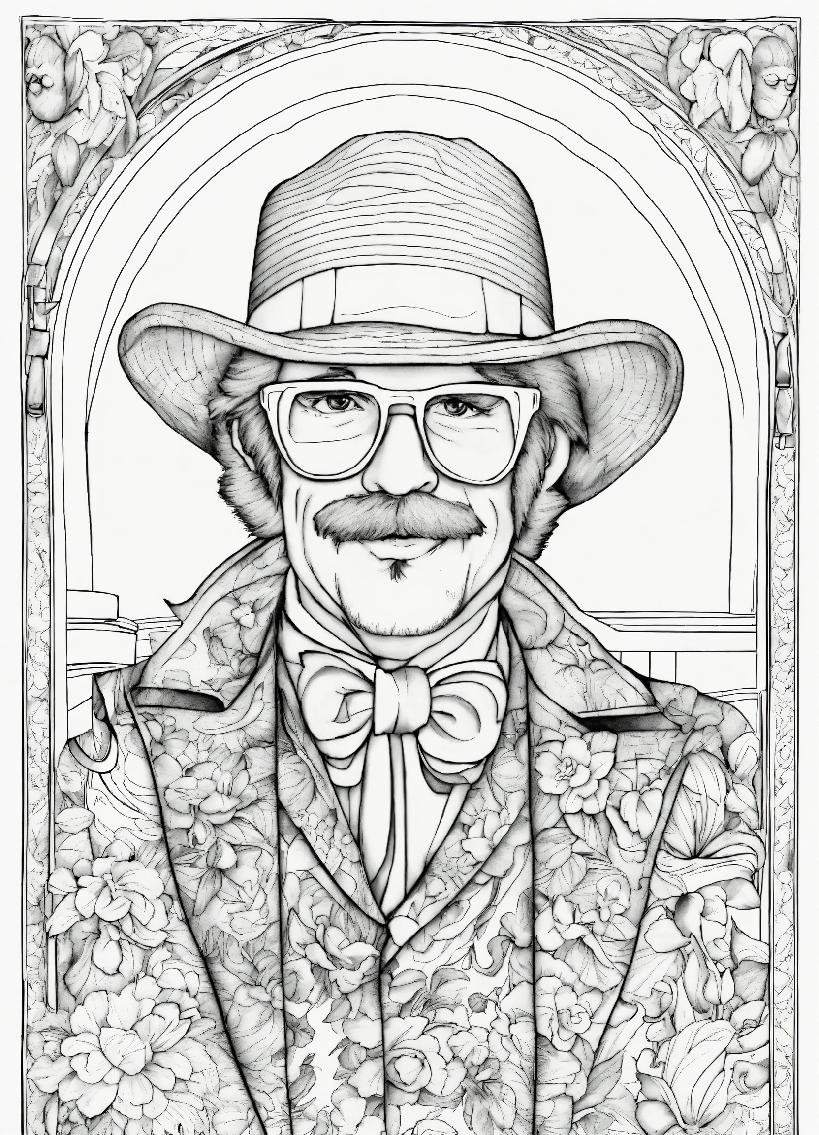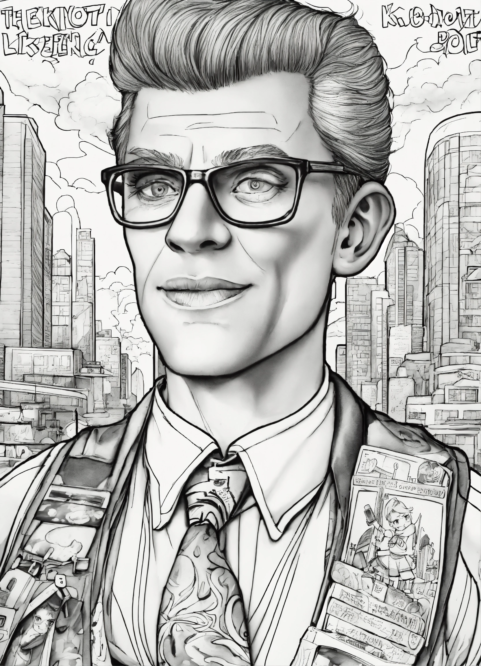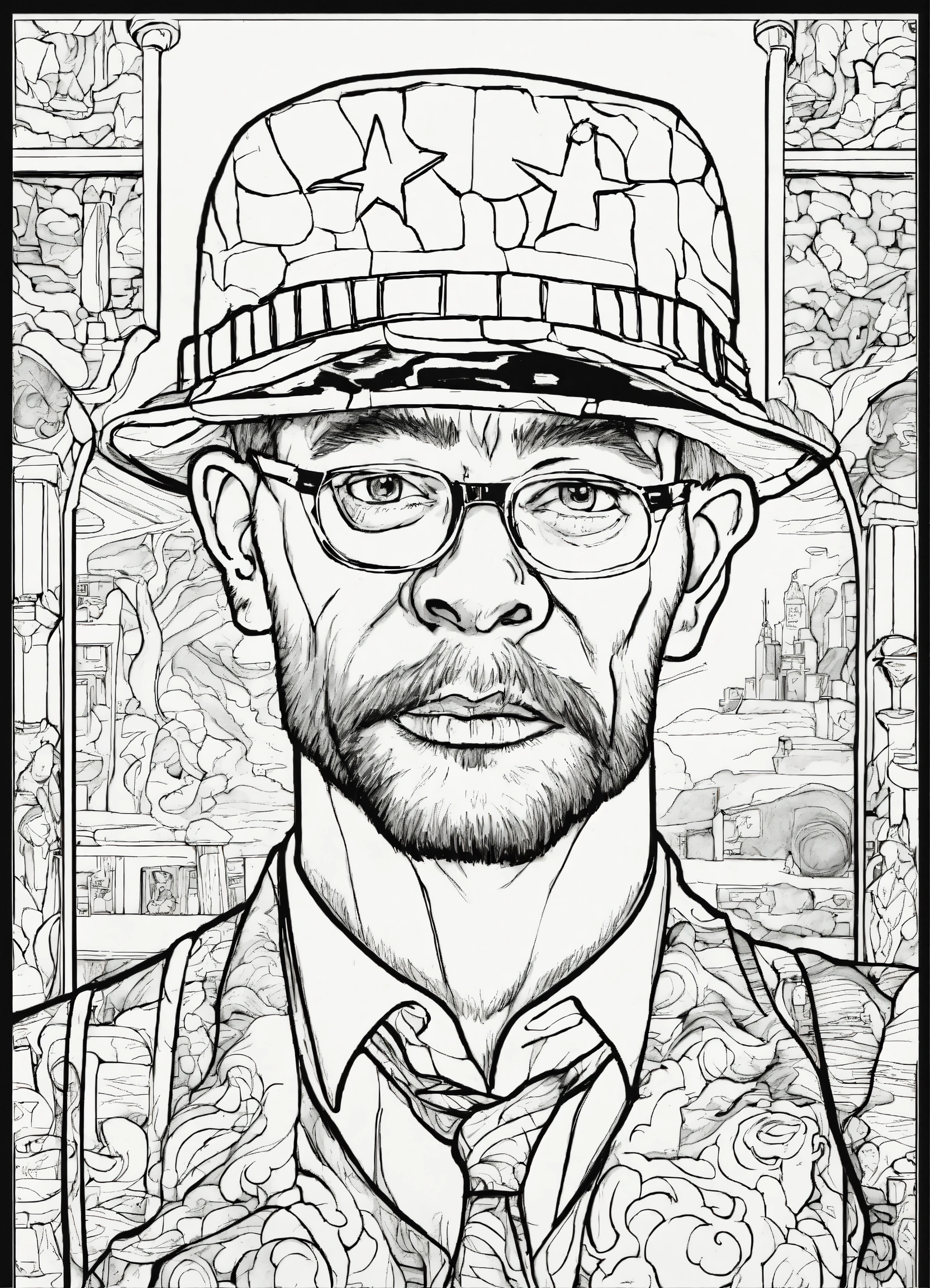 Coloring page for adults, caricature art, "the know-it-all" idiot hero, black and white, white background