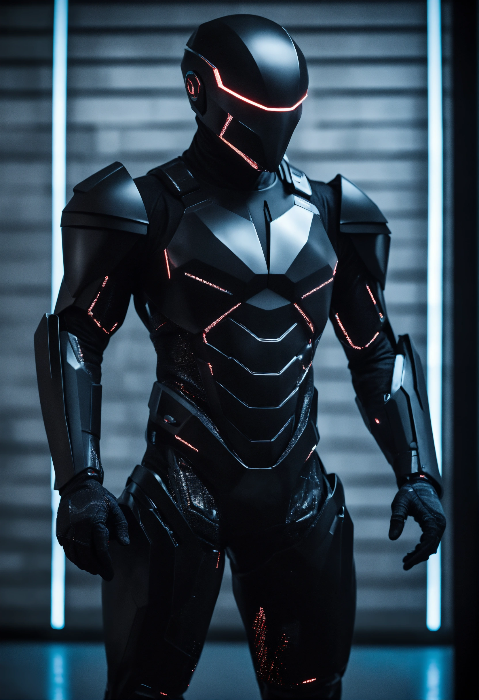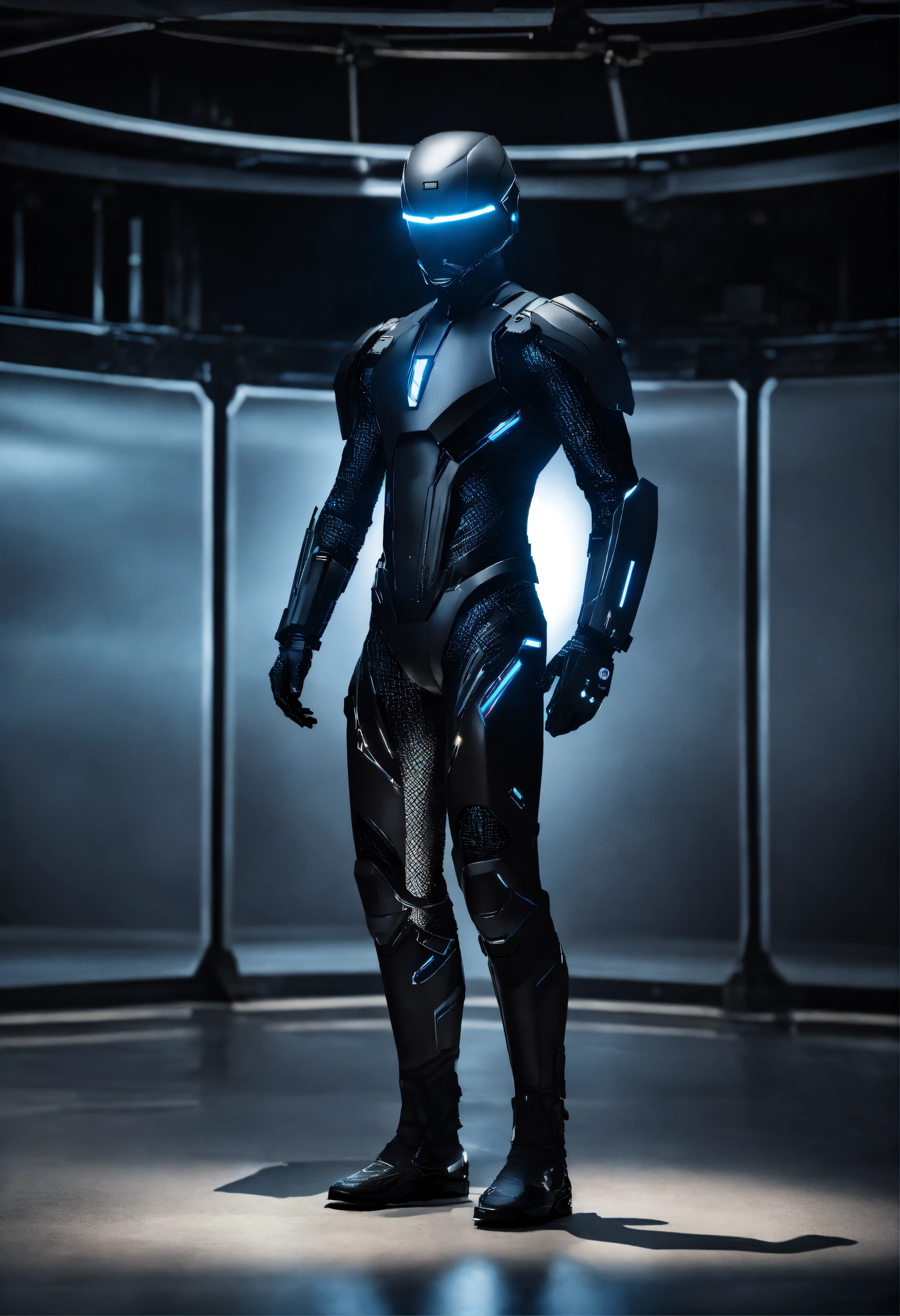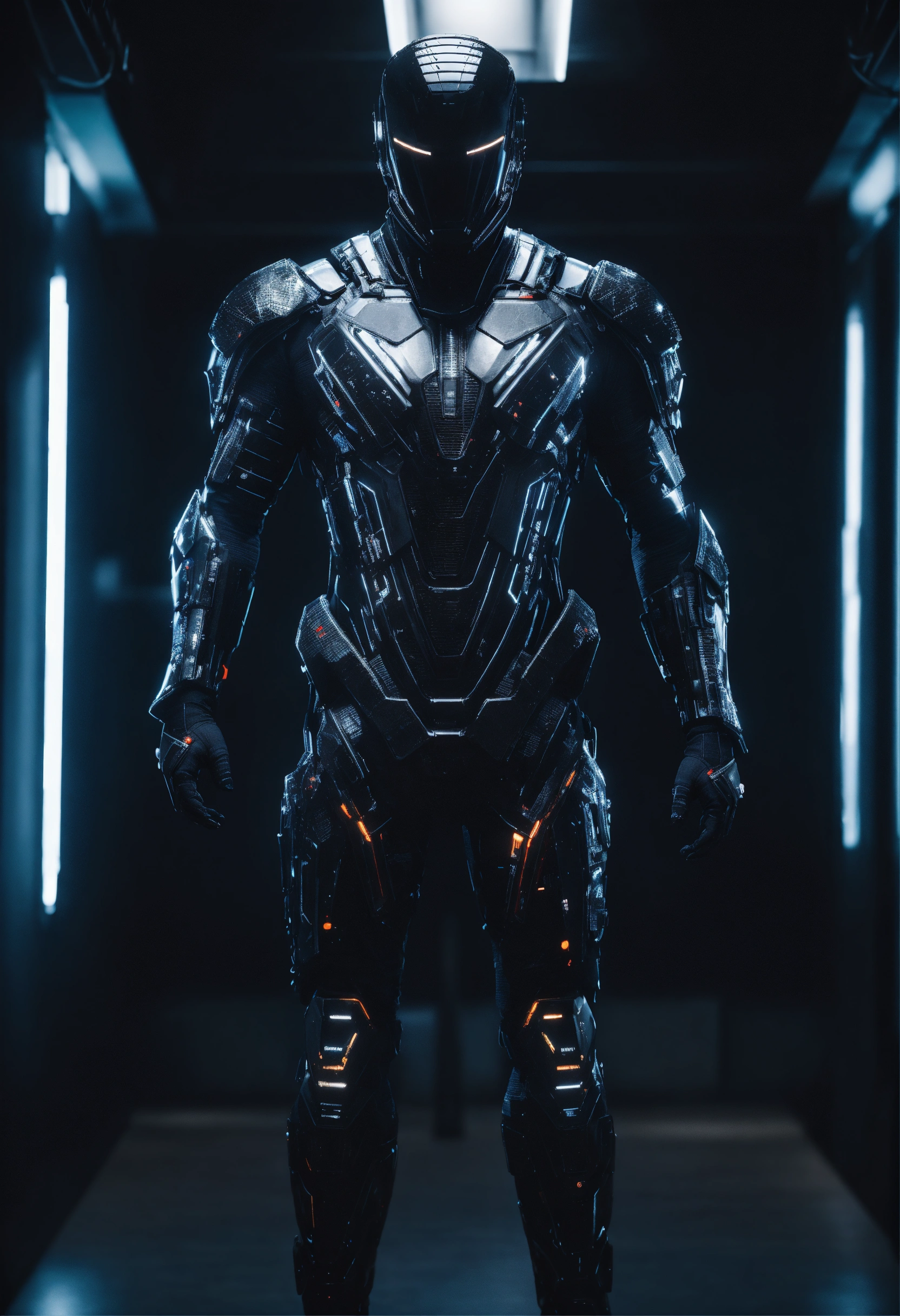 An ultrarealistic photograph of a minimalist futuristic full body power suit, without lights, made of black mate metal and polymer, full crystal hull, for a fit man, imposing, modern minimalism, elegant, dystopia, mysterious, godlike, scary, in a dark room, 8k