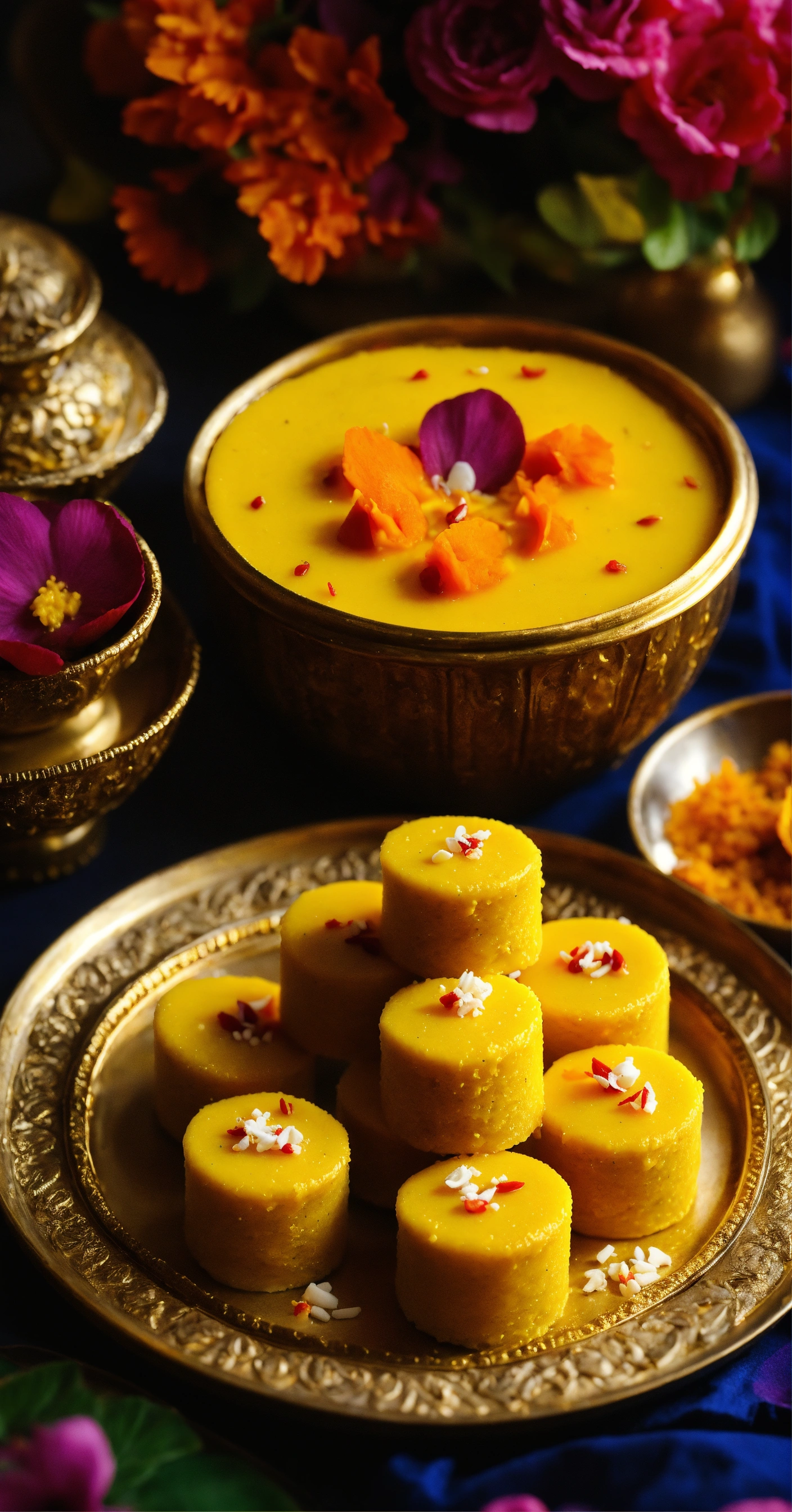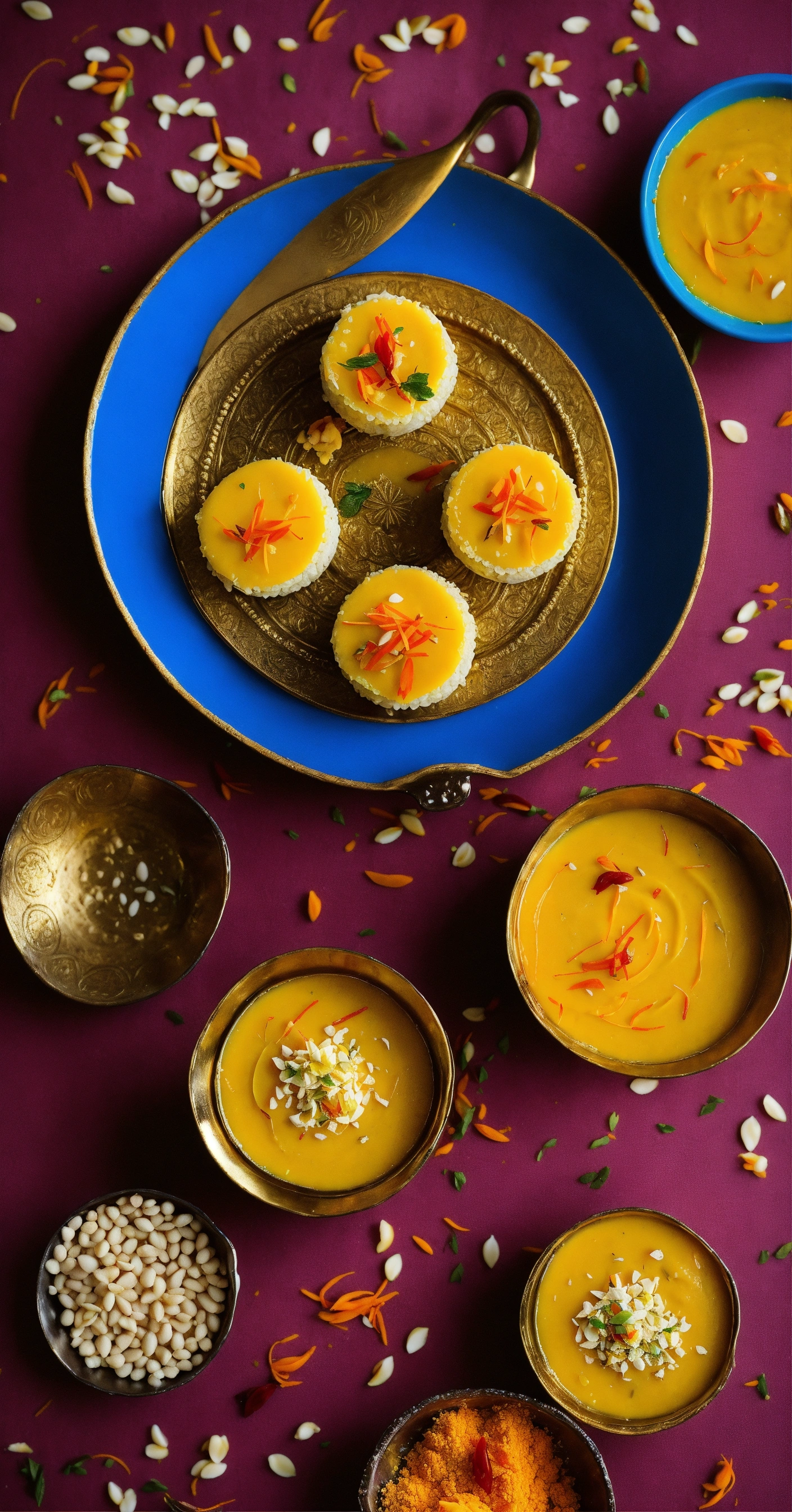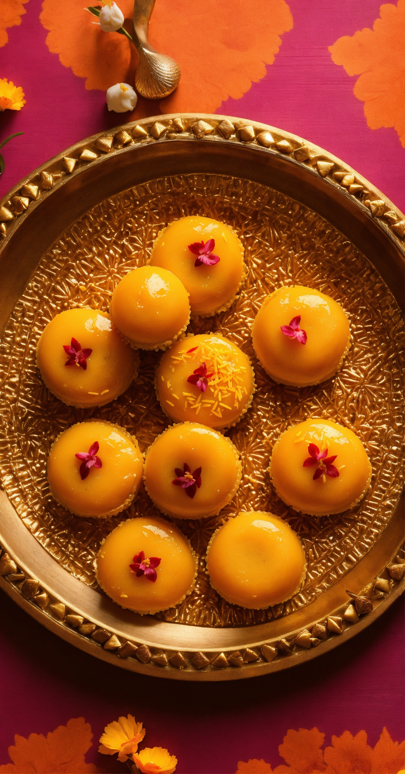 Create an instagram-worthy display of kesar sweets 1, use a rustic wooden or pastel backdrop, 2, arrange sweets on a decorative tray with golden accents, 3, highlight "kesar malai chaup" in the center with saffron strands, 4, add symmetry with more "kesar malai chaup" around, 5, give variety and height with "kesar malai rolls, " 6, place "kesar rasgulla" at the base for balance, 7, sprinkle saffron strands and have a saffron bowl, 8, ensure good lighting and capture from a slight overhead angle, 9, use warm colors in the background or props for a harmonious feel, this setup will make your kesar sweets instagram-ready and visually appealing