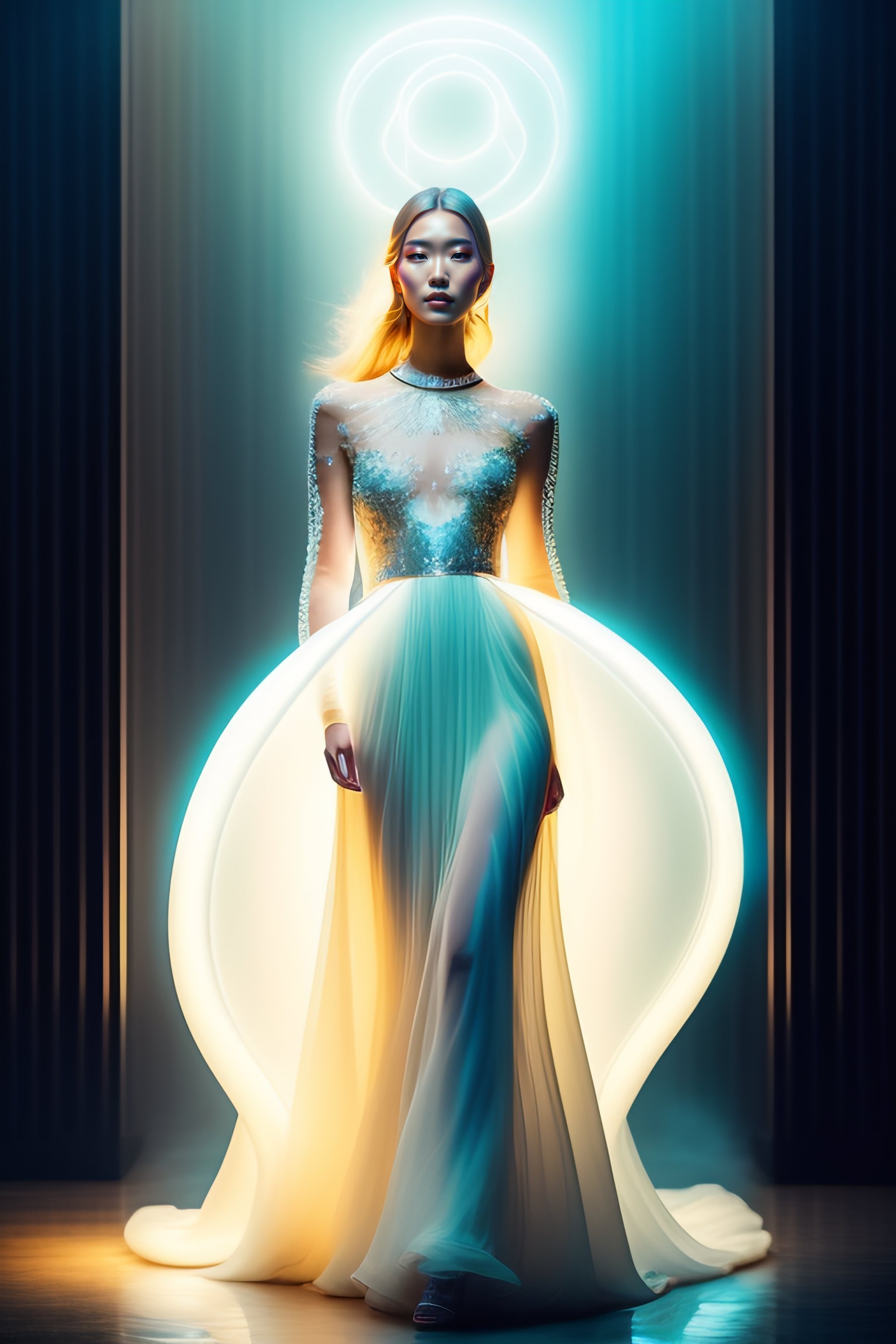 Swirling glowing transparent bioluminescent liquid-like long dress