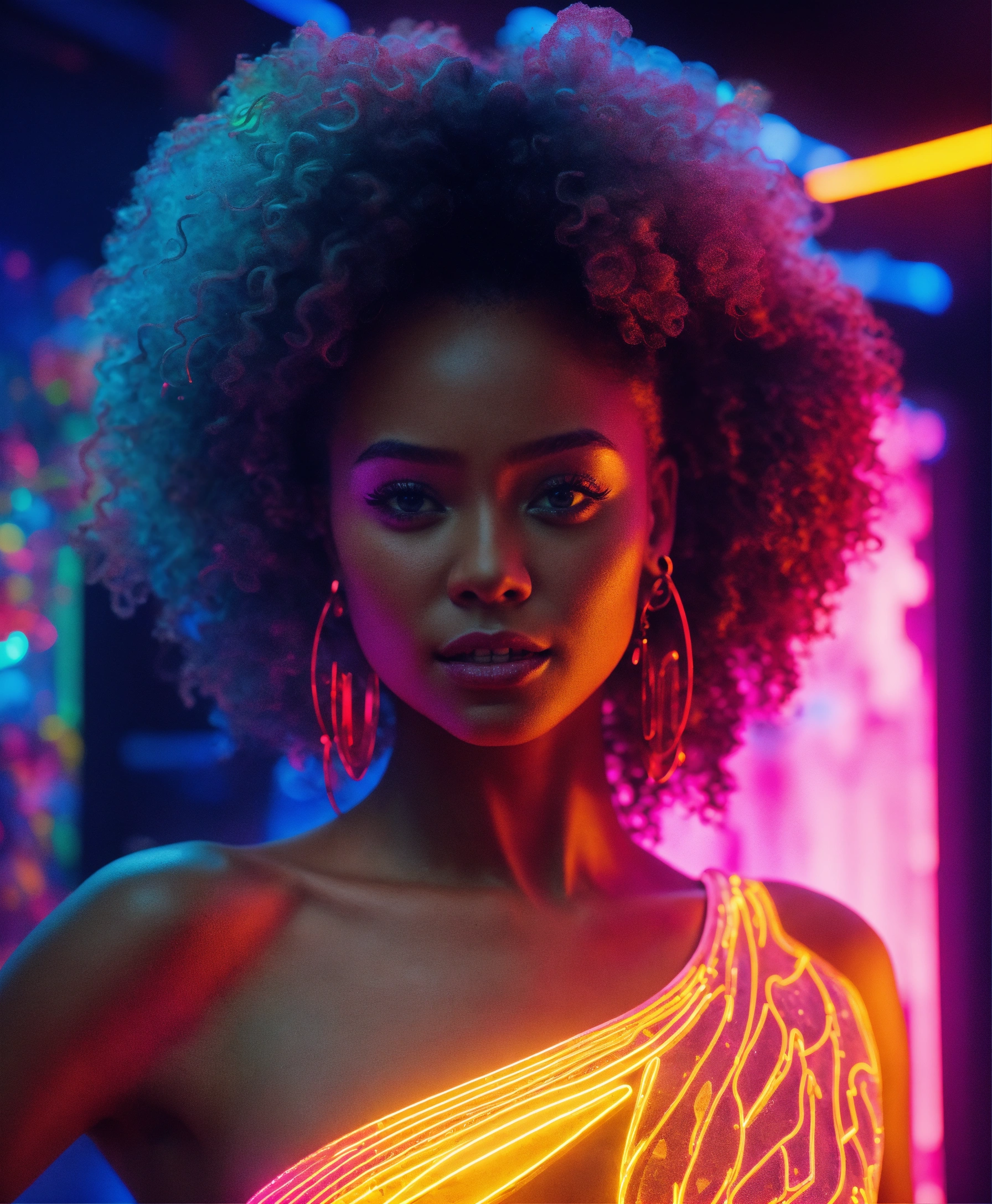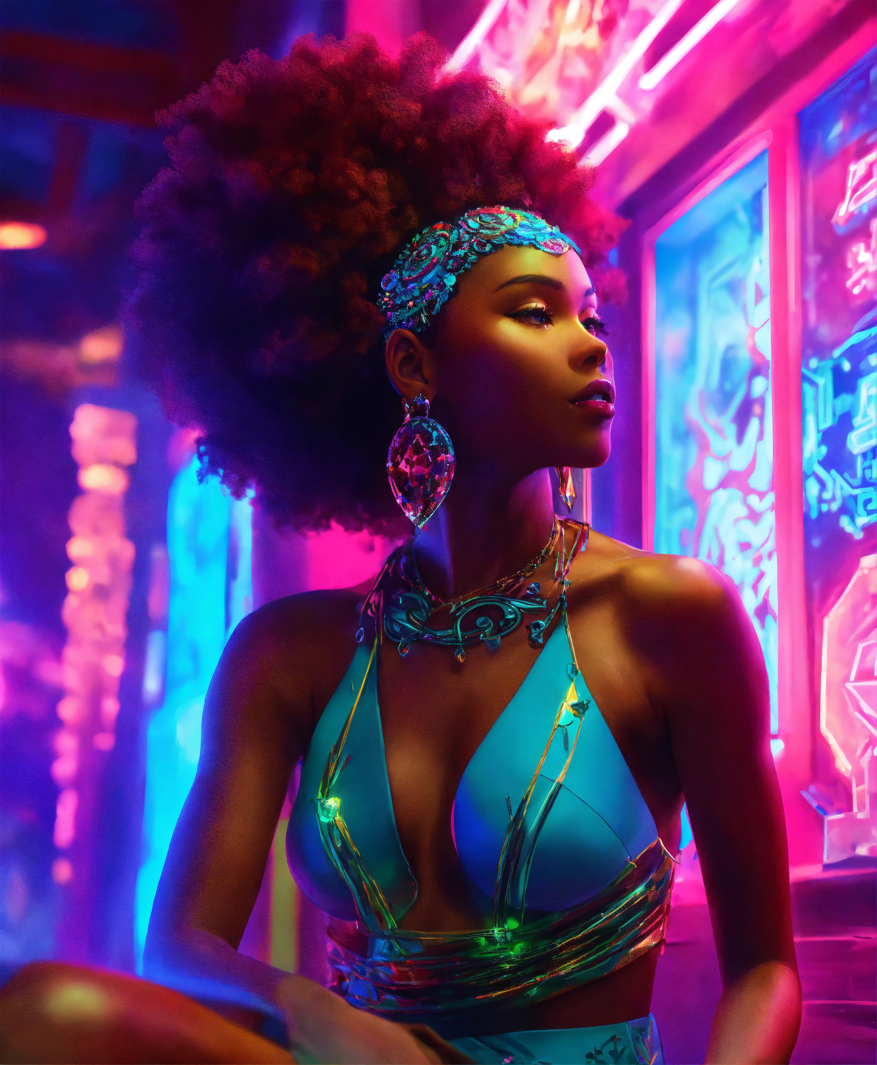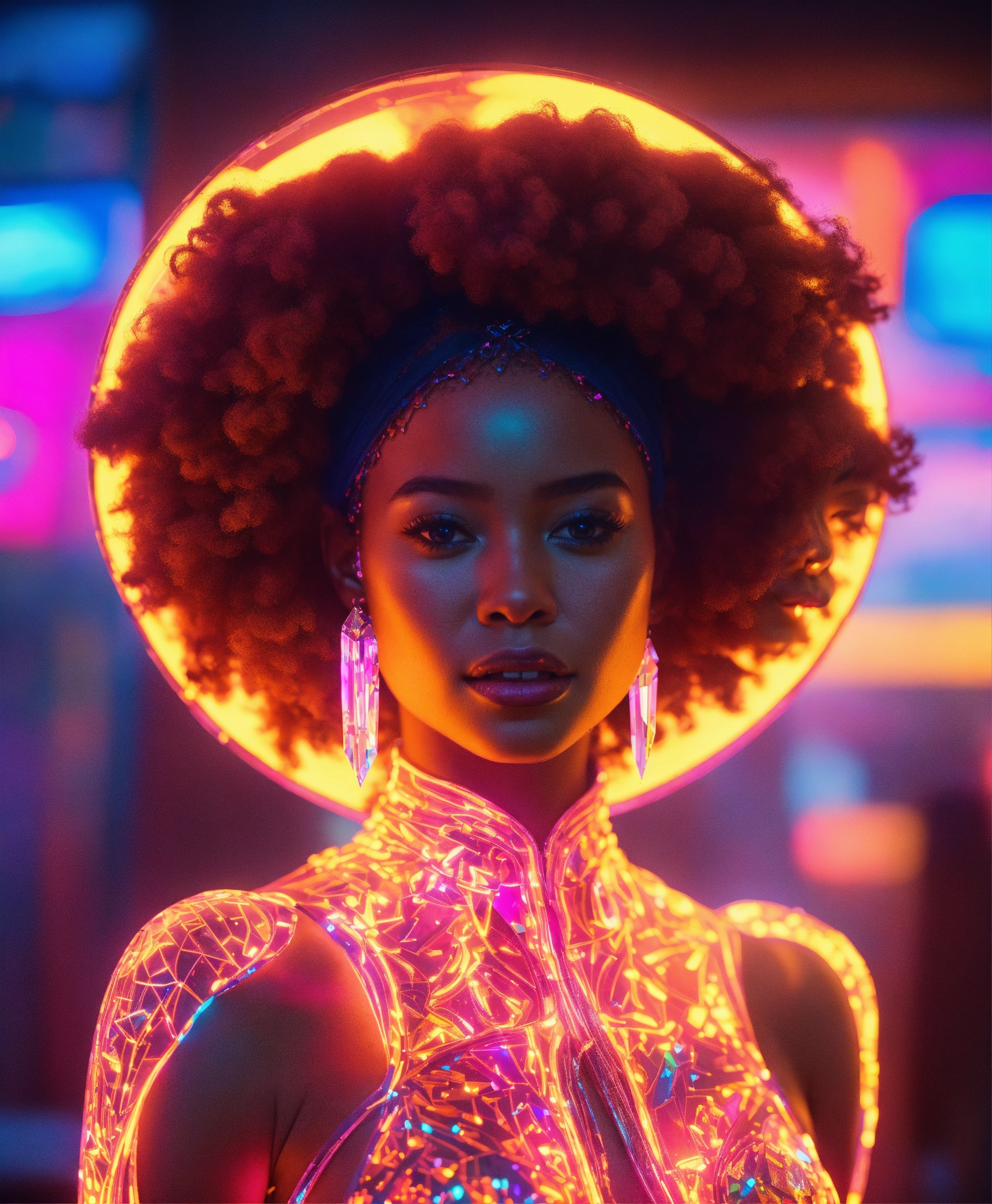 Cartoon animé 8k features of an afrocentric woman intricately carved from clear glass with vibrant neon plasma running through her. set against a wavy background, the glow of neon accentuates her crystalline skeletal structure. gentle lighting, combined with neon, illuminates her, emphasizing the crystal's facets and plasma's luminosity, with a brightly lit ambiance reflecting serenity, purity and joy, while the neon adds a modern touch of chaos