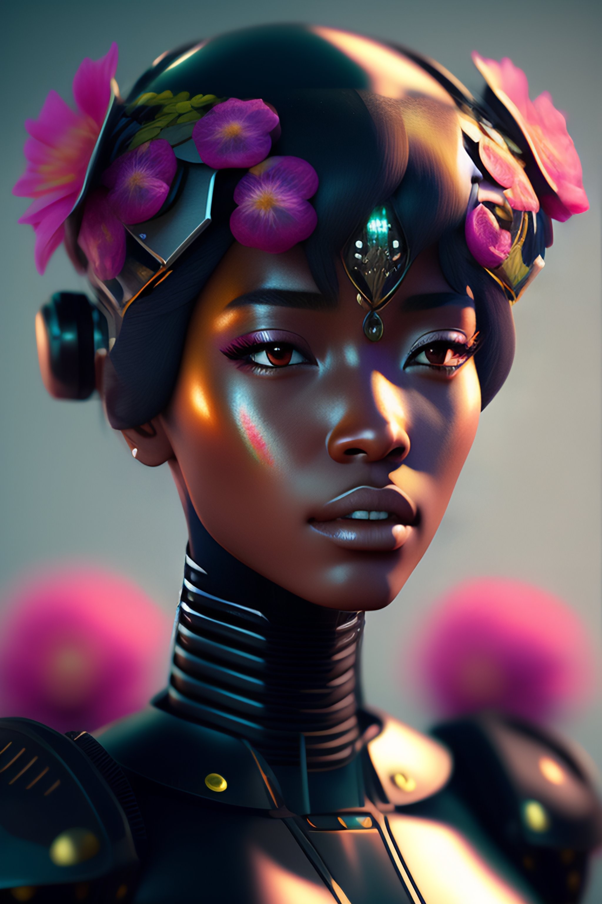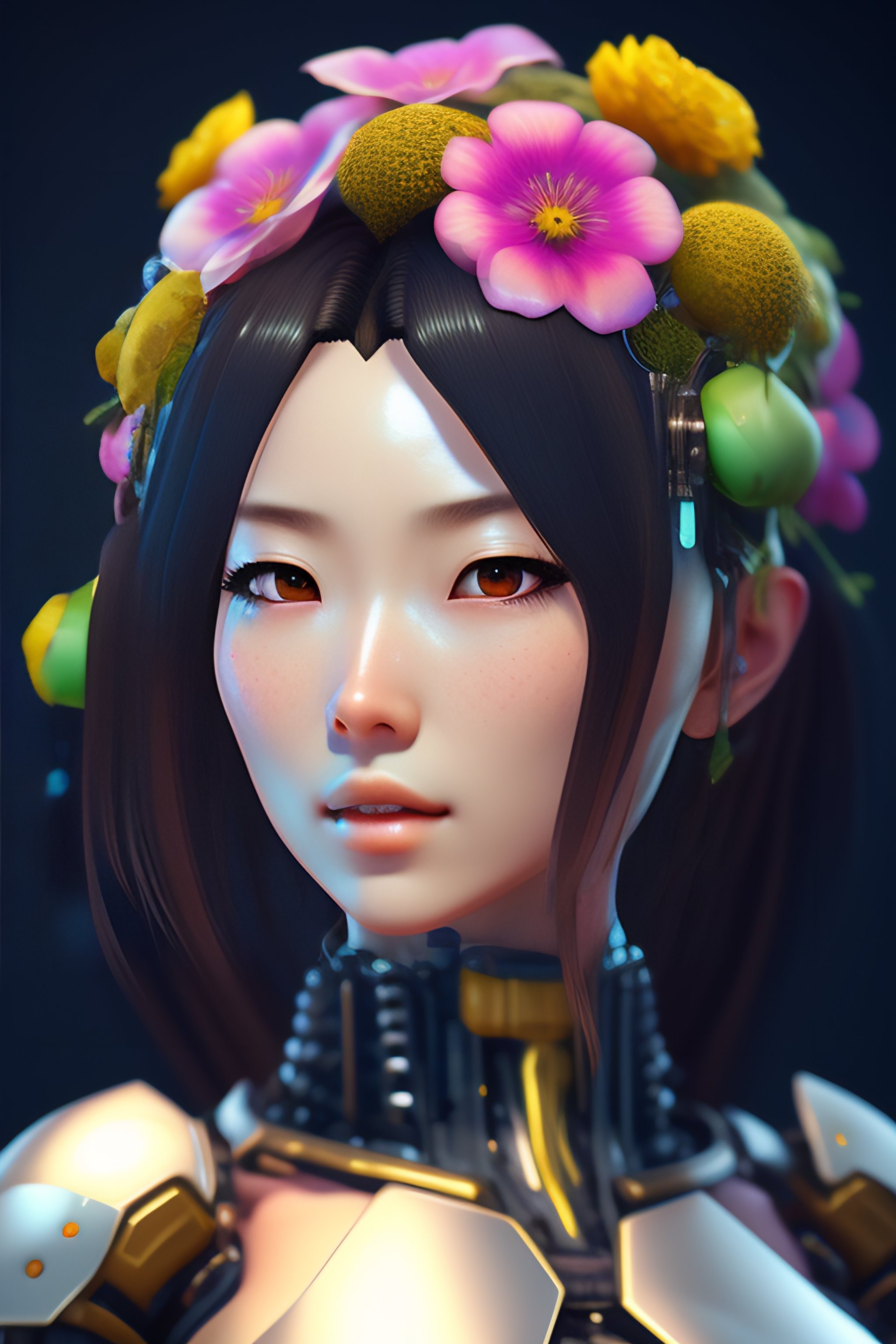 Anime female mechanical android head with flowers growing out. 3d render in unreal engine 5