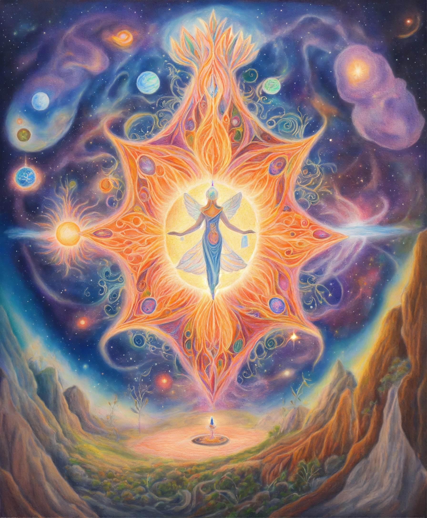 Colored pencil drawing of spiritual cleansing treatment, enlightened spiritual beings caring for a person, galaxy and cosmic elements