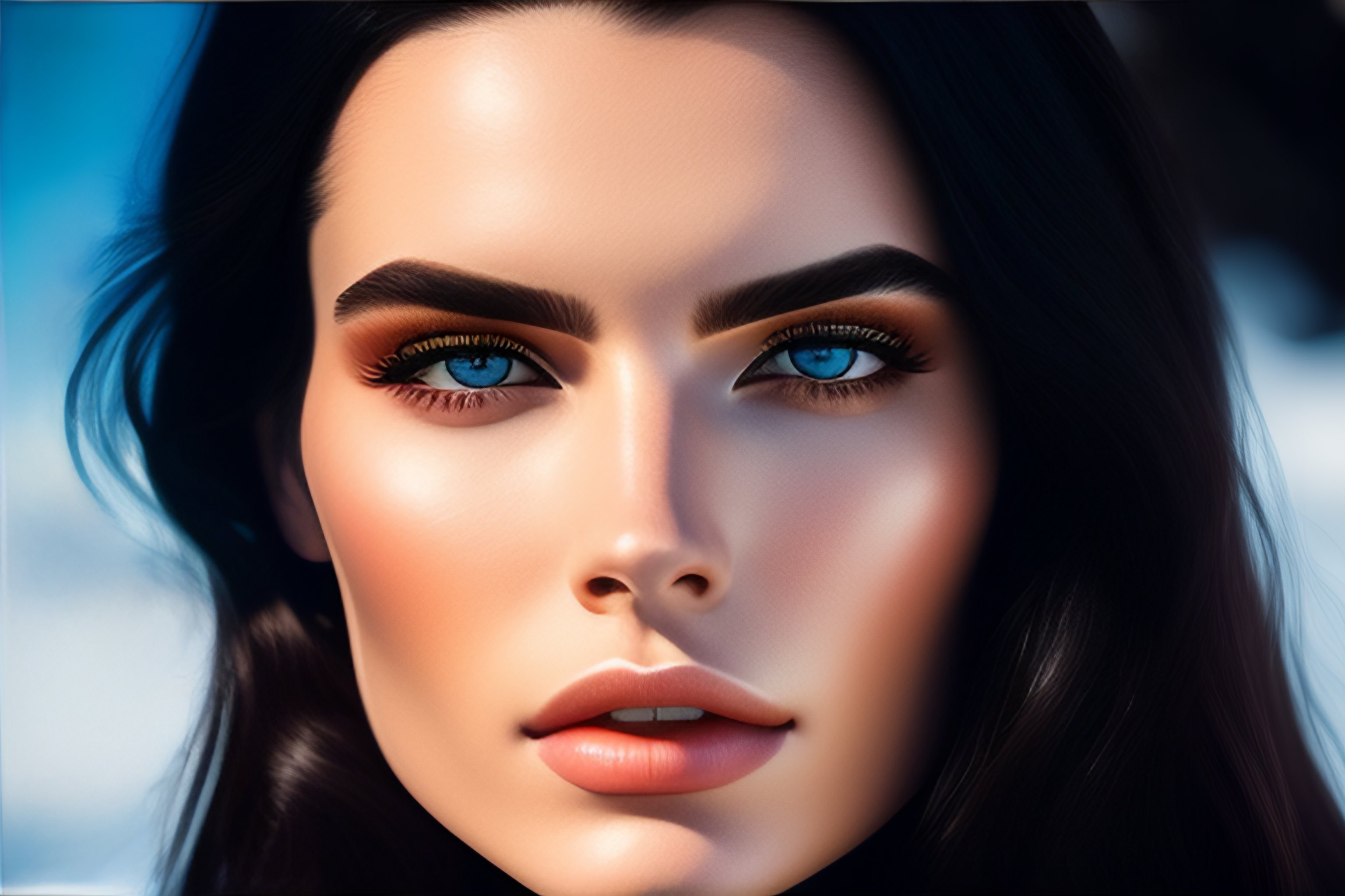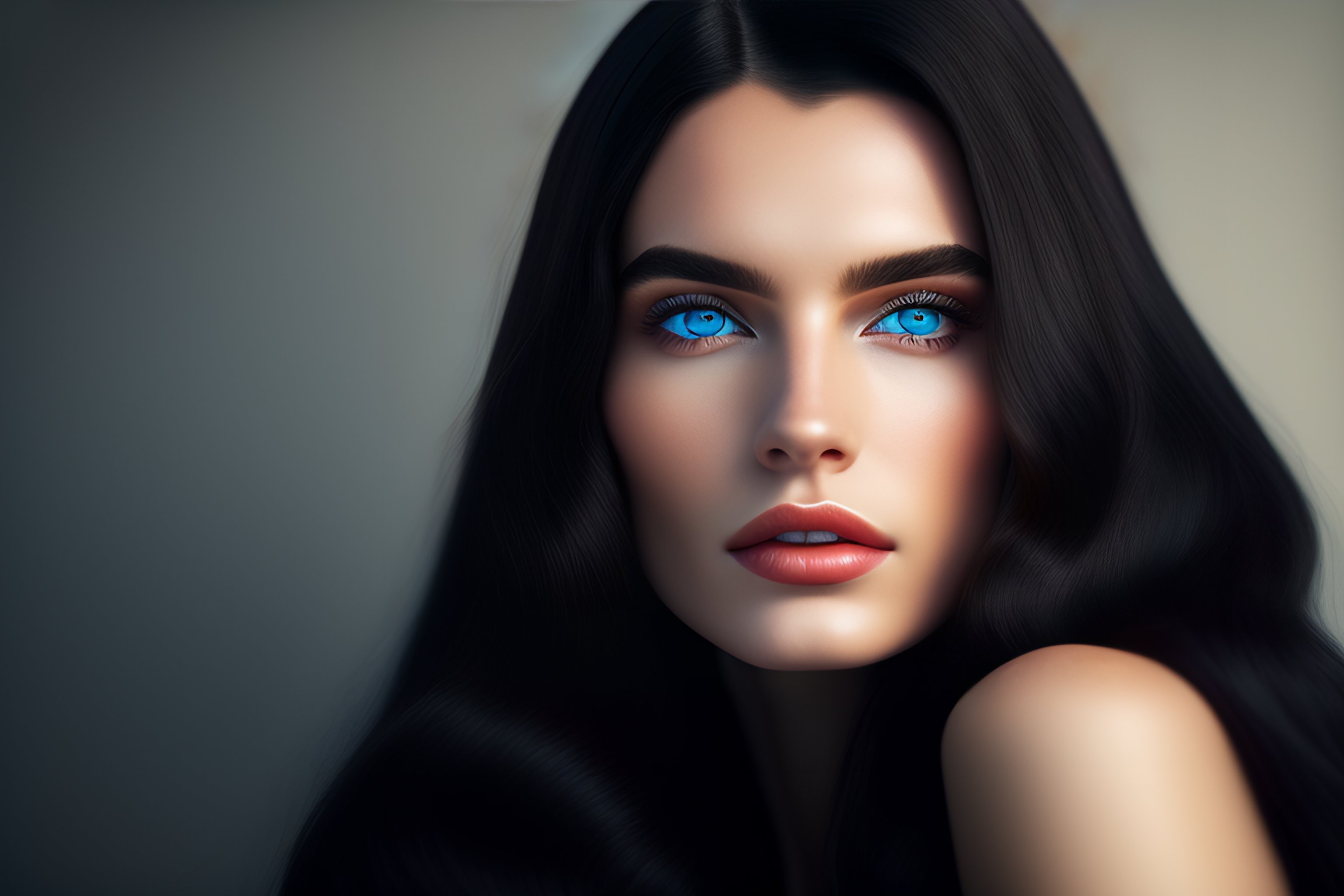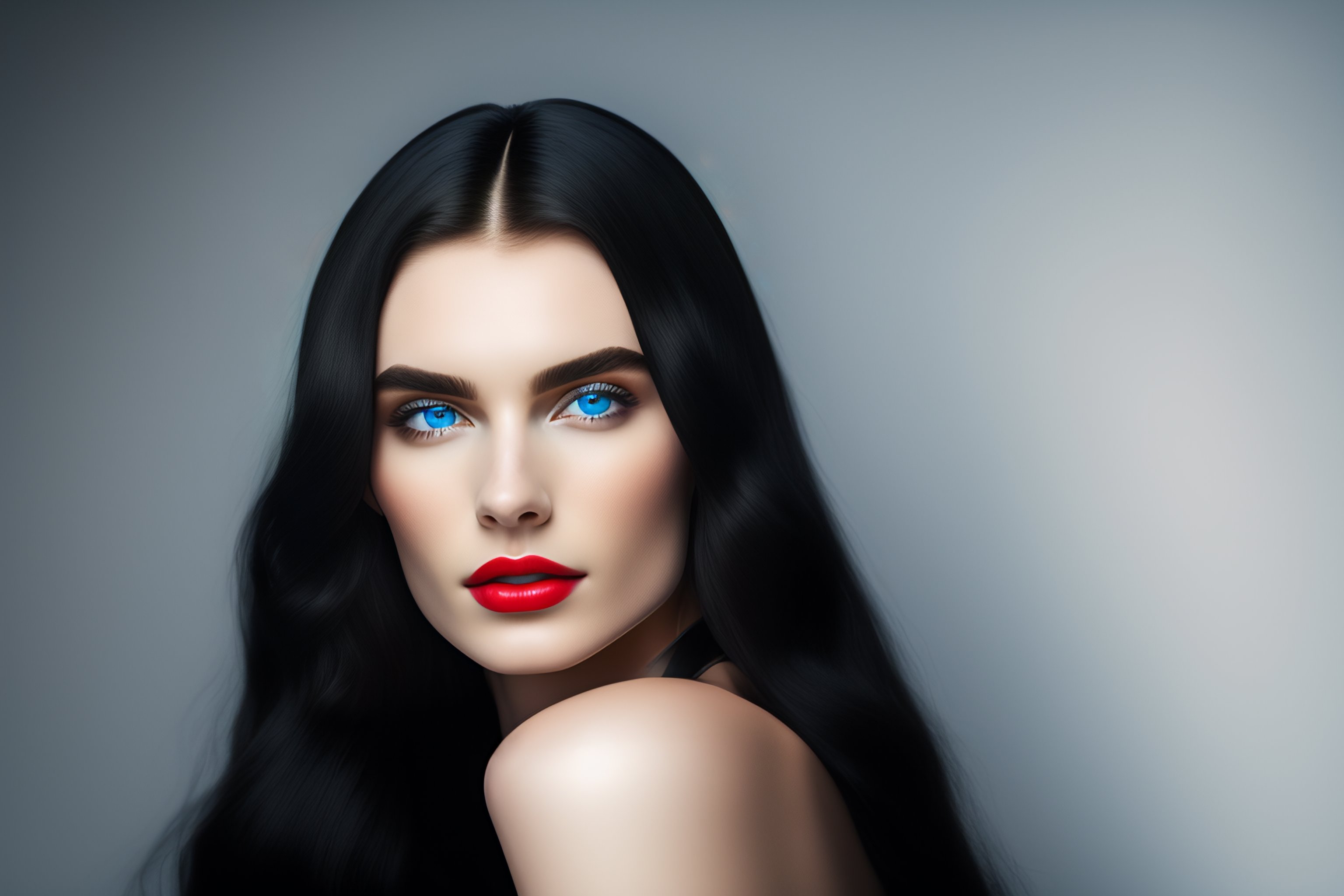 A portrait of a beautiful white girl, long straight raven black hair, stunning ice blue eyes, fine - art photography, soft portrait shot 8 k, mid length, ultrarealistic uhd faces, unsplash, kodak ultra max 800, 85 mm, intricate, casual pose, centered symmetrical composition, stunning photos, masterpiece, centered composition, thin red lip, fine eyebrows, very pale skin