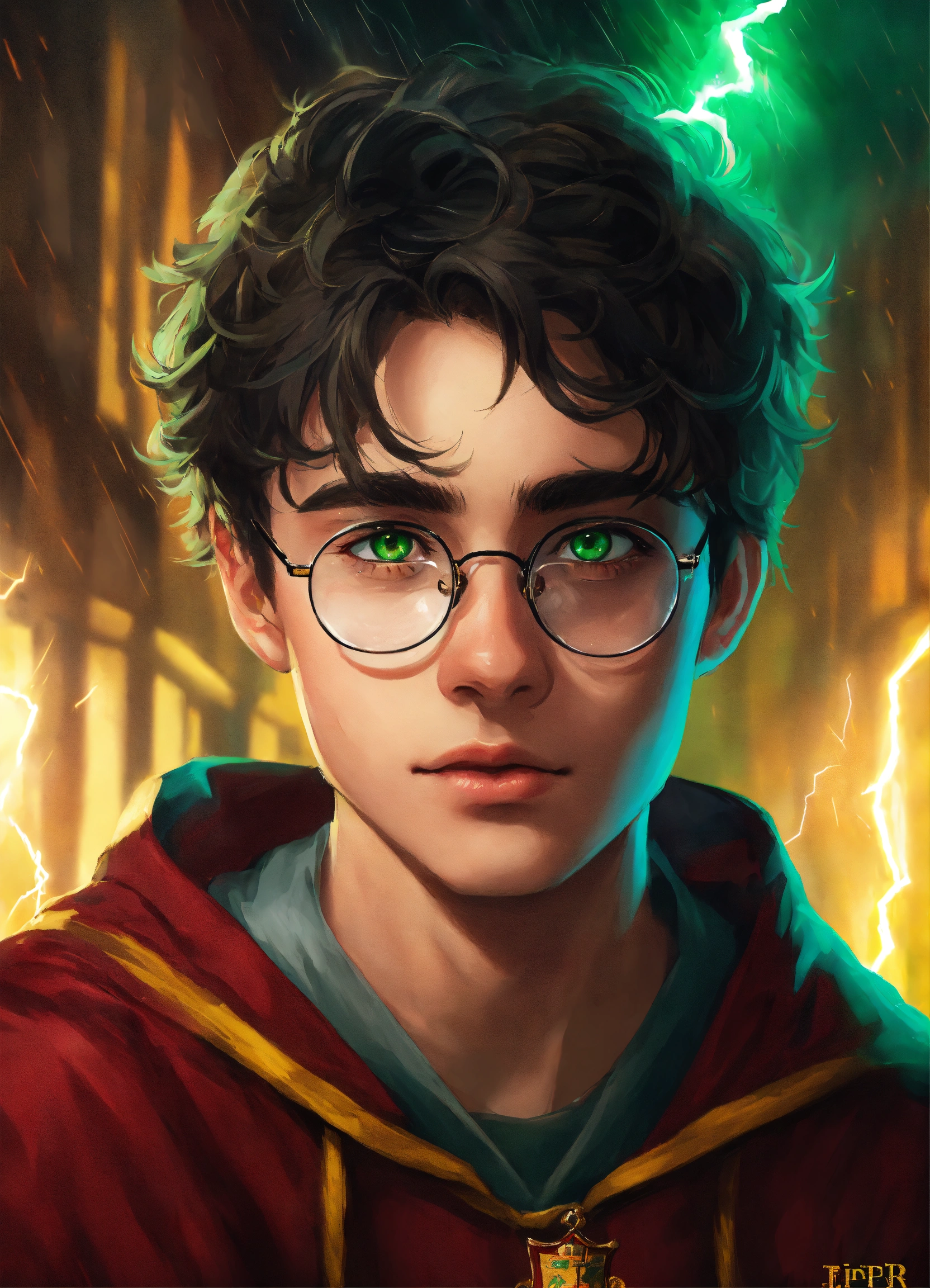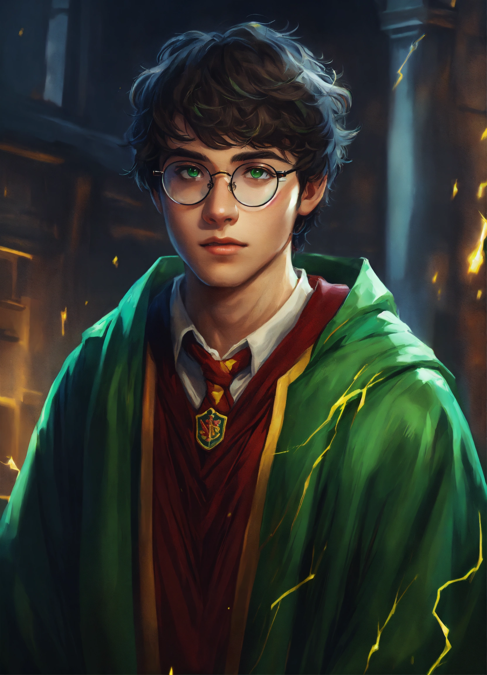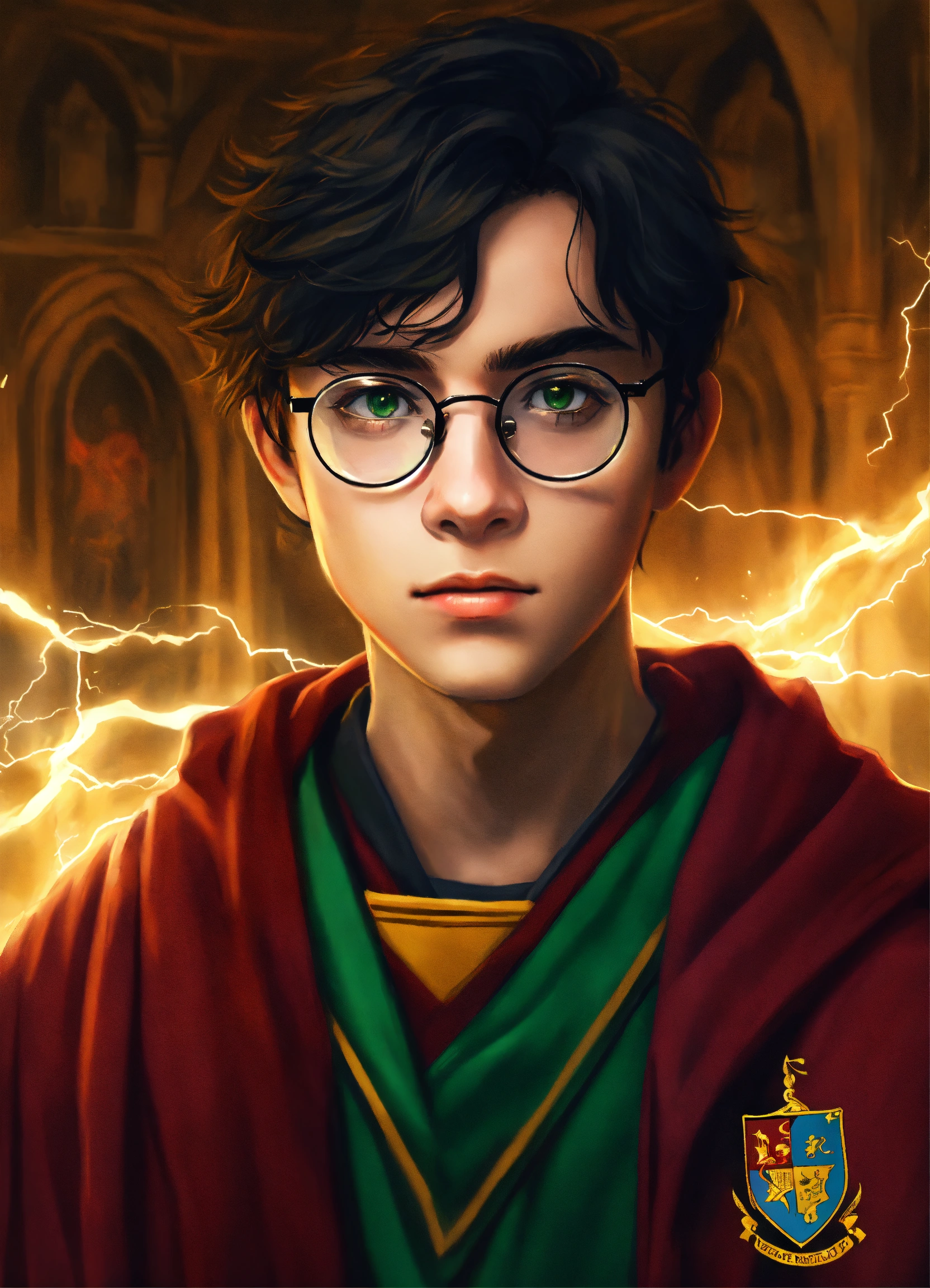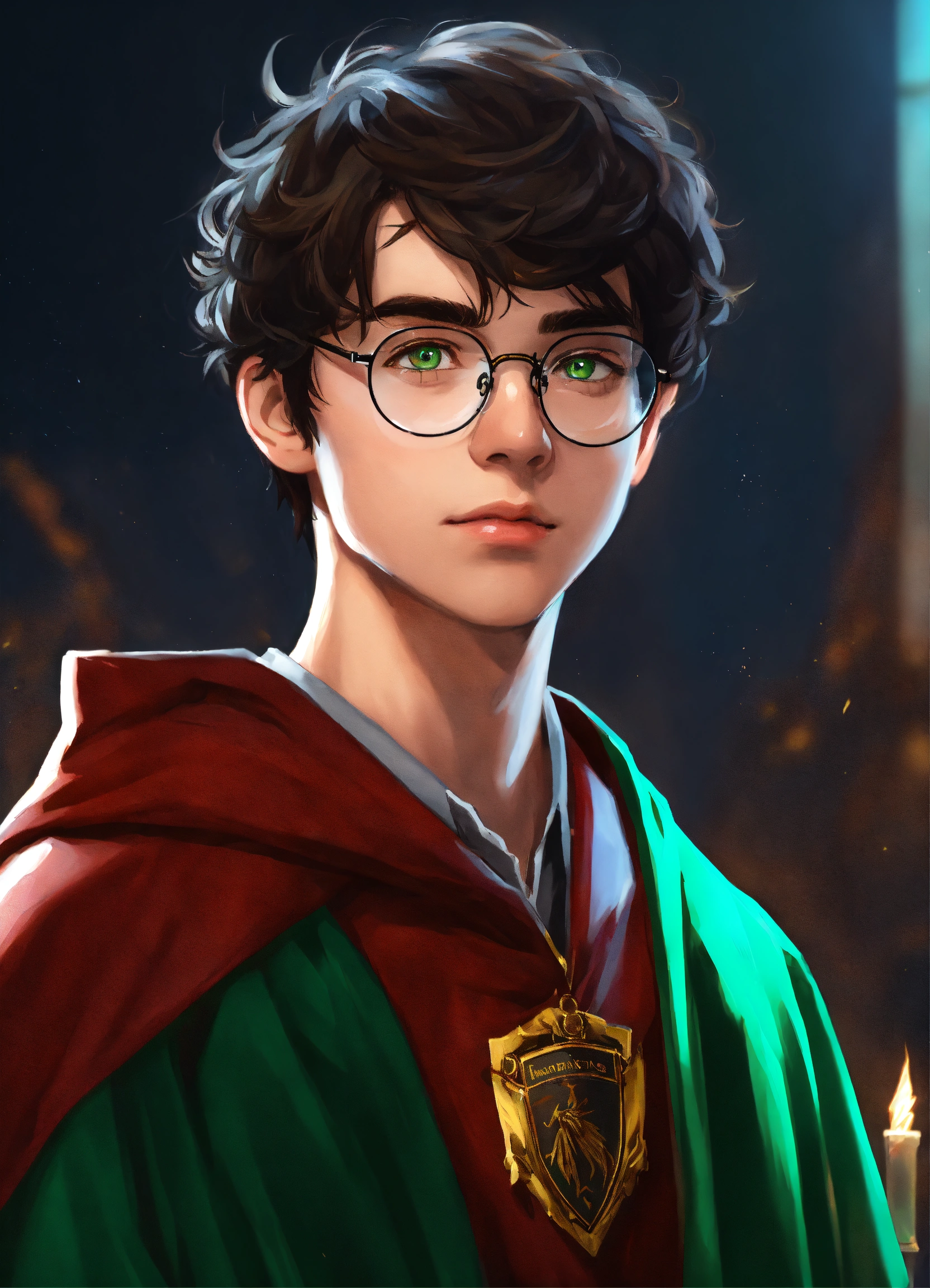 15-year-old, untidy black hair, bright green eyes, thin face, round rimmed glasses, lightning scar on his forehead, gryffindor robes, facing camera, facing forward, realistic