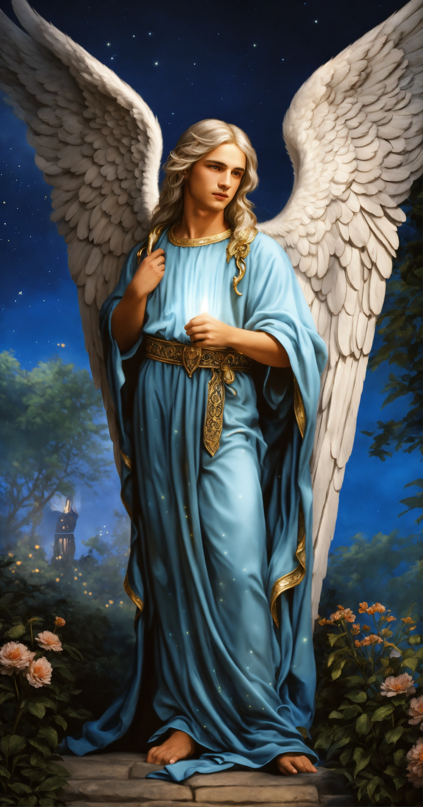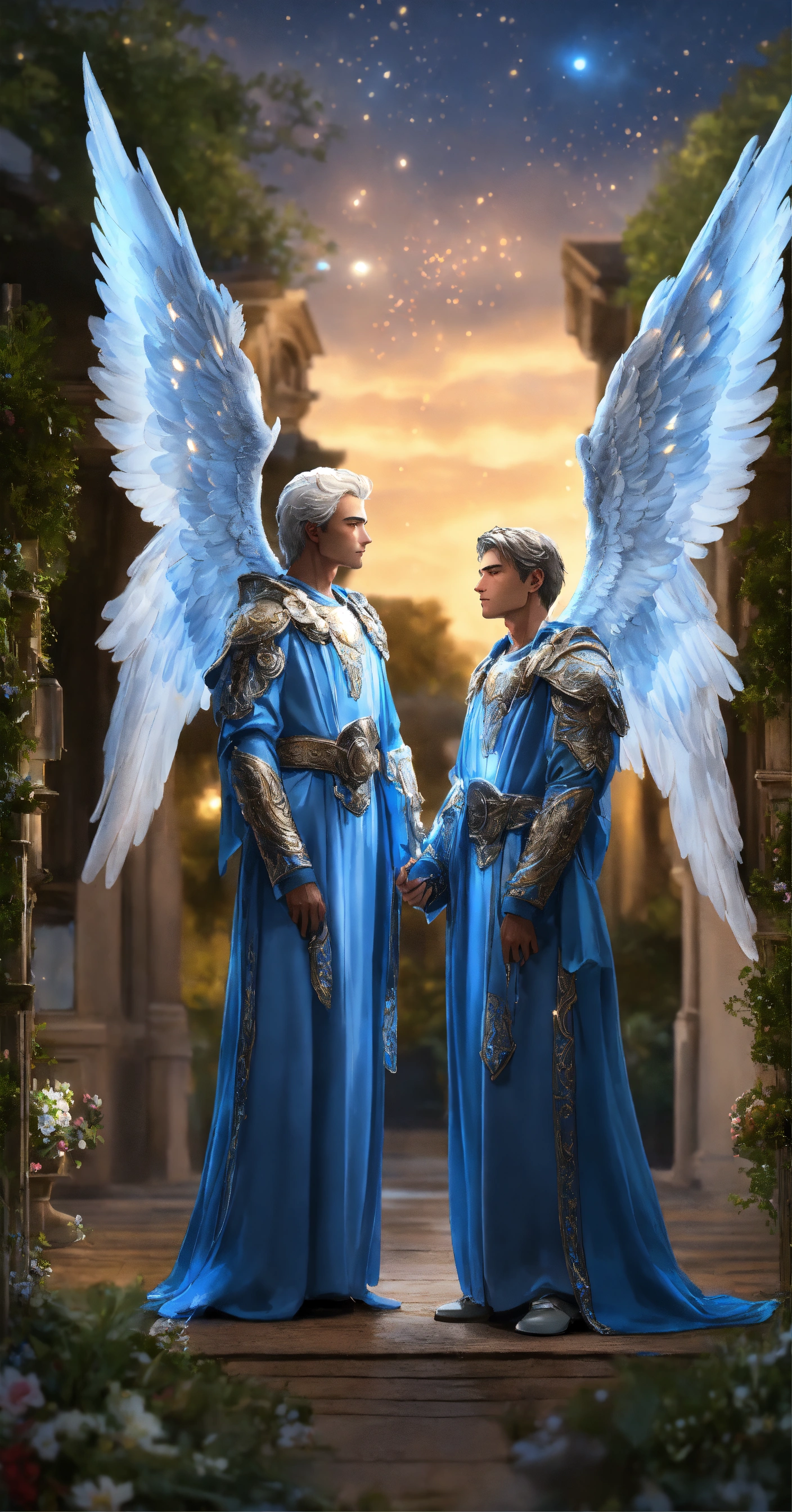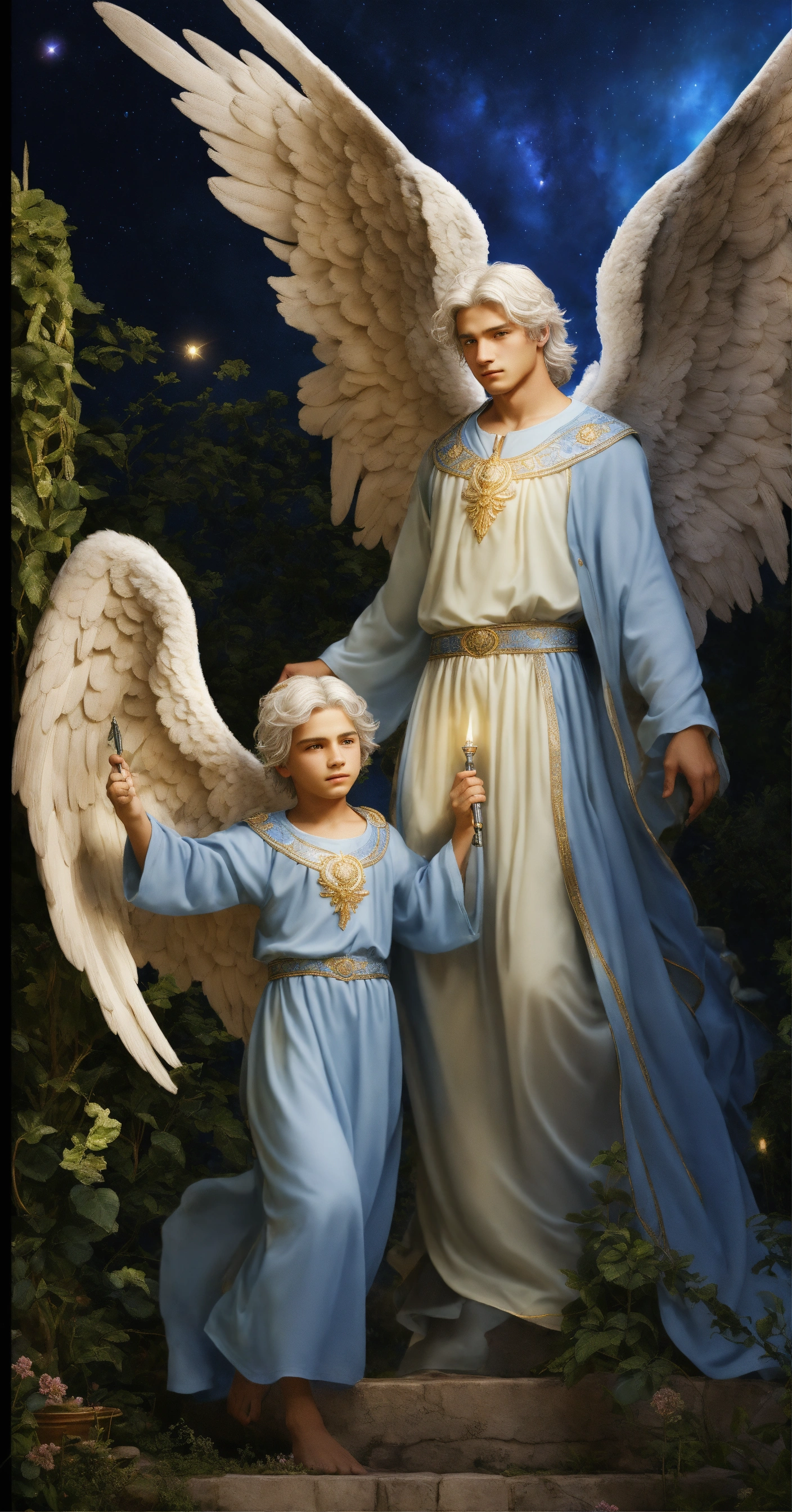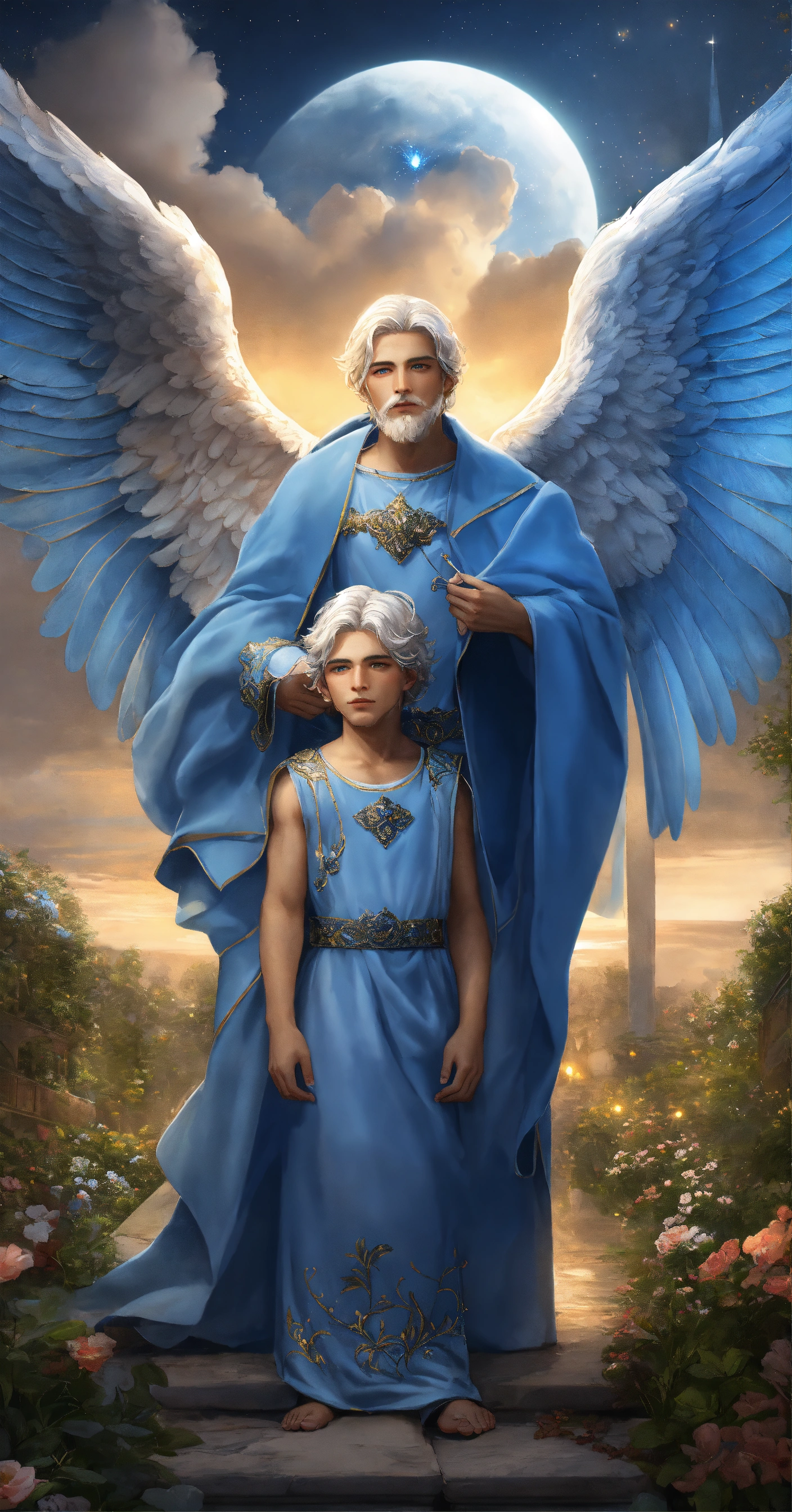 2 male guardian angels with detailed and luminous blue angel wings. 1 30-year-old male angel protecting a 9-year-old male angel child. the 2 male angels have large, uniform luminous blue wings. their faces beautiful and detailed. very clear eyes that open with a deep and penetrating look. detailed and manly short white hair. blue tunic-type dresses with many silver details. they are in a beautiful, detailed garden with a night sky. hyper-detailed, hyper-realistic illustration. realism. masterpiece. digital art, hd, high quality. high definition, high definition. 8k.