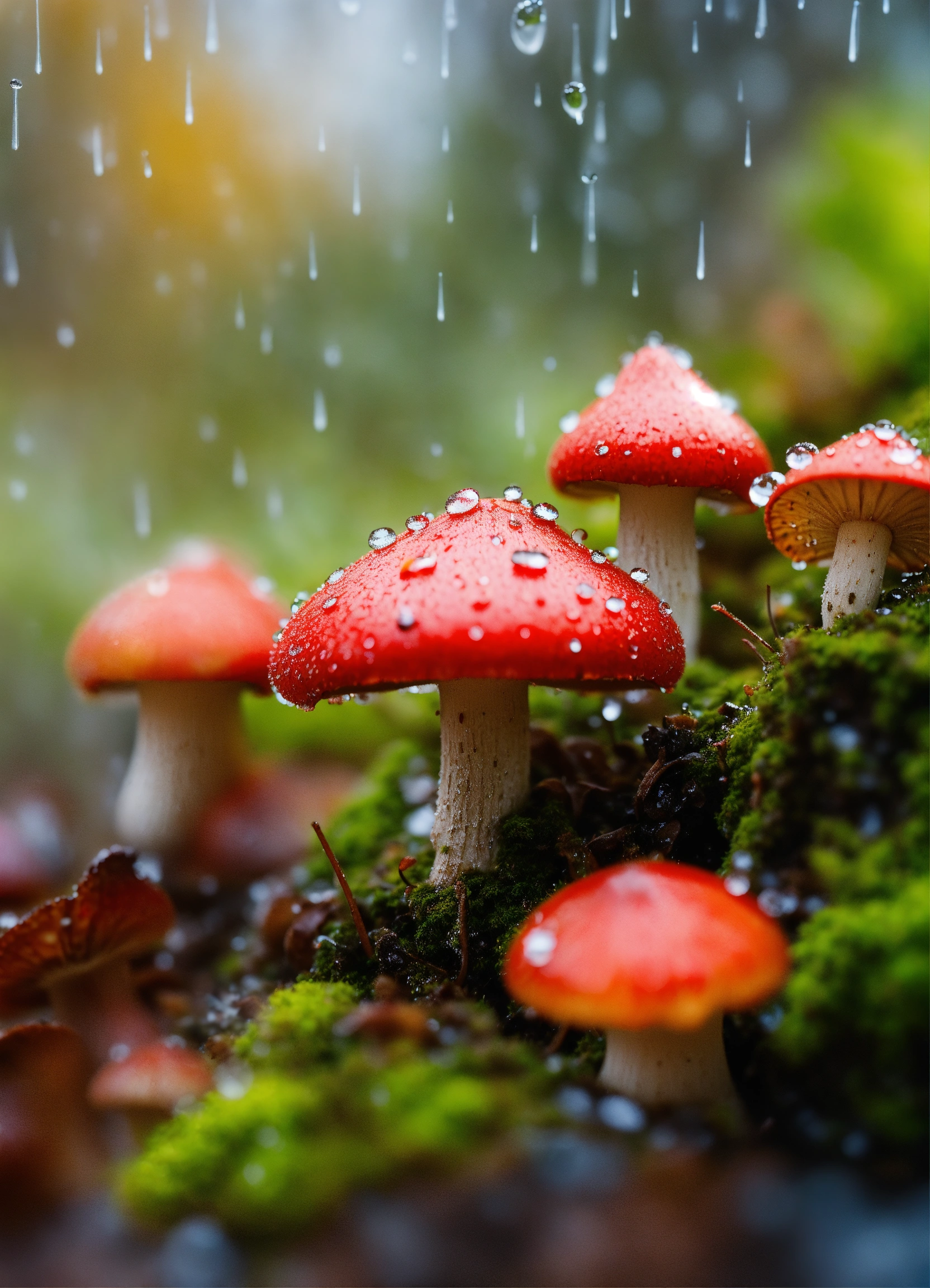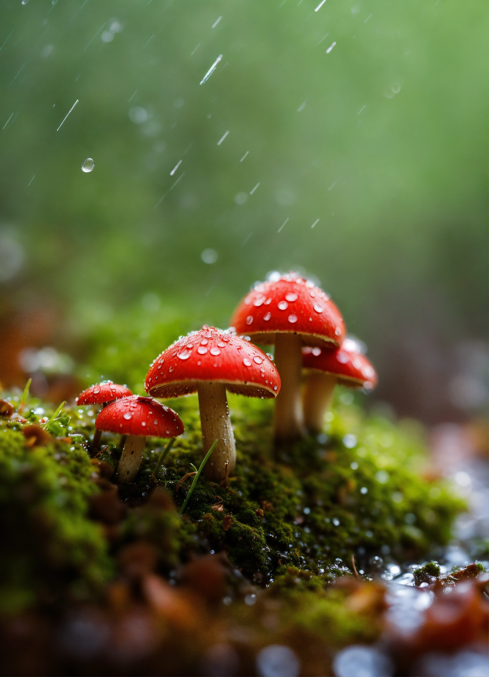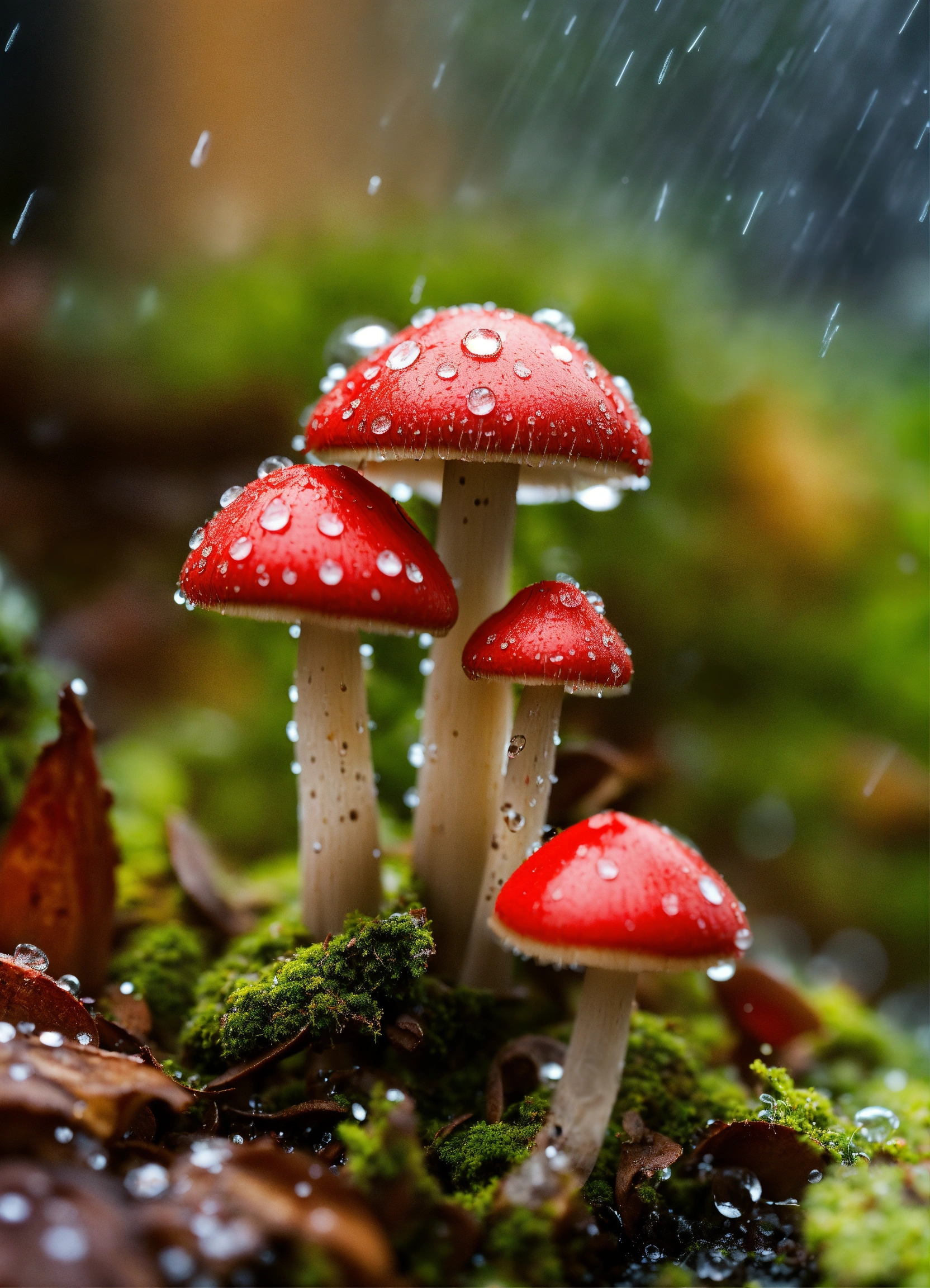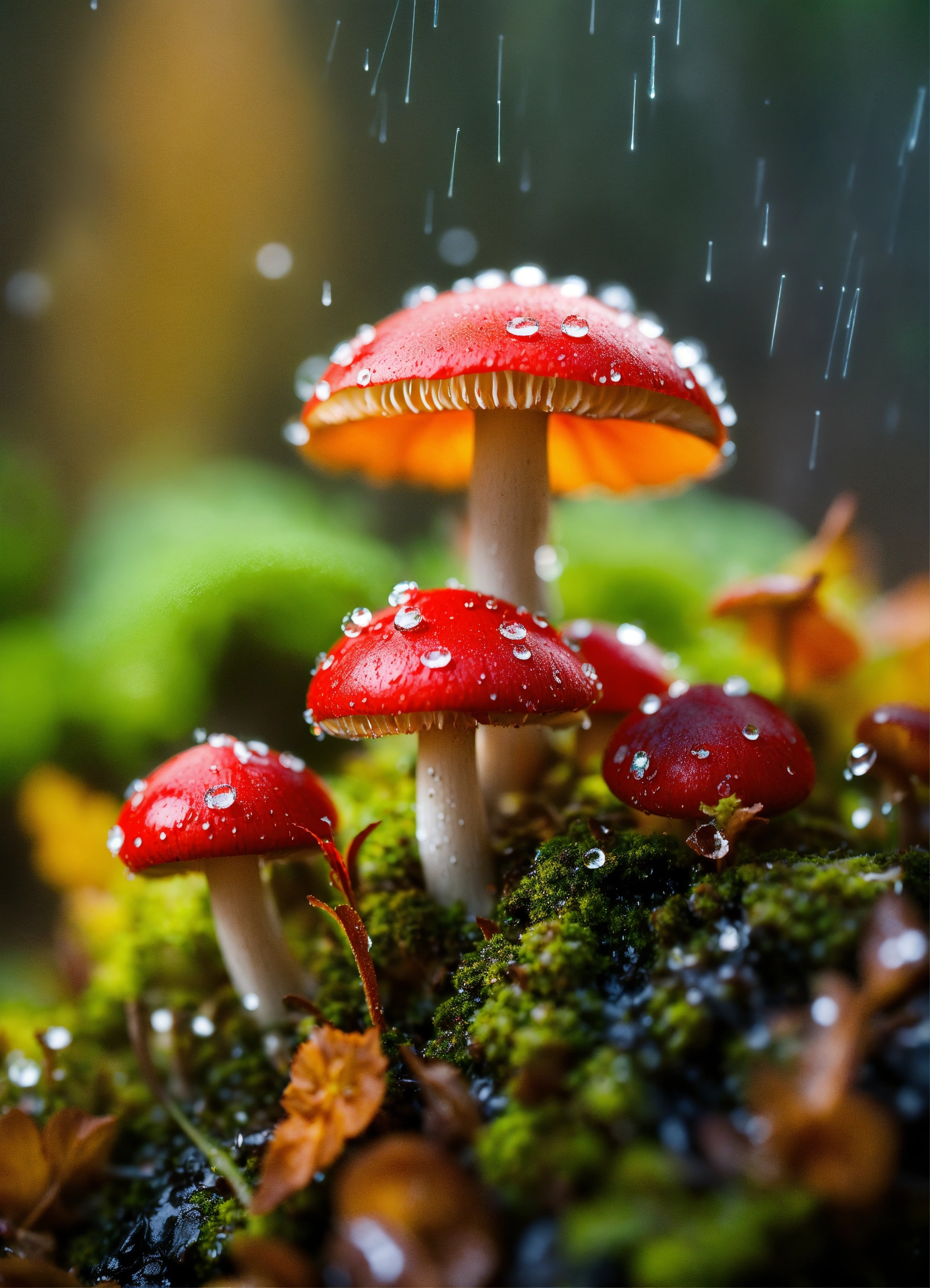 Macro photography of small intense red mushrooms with white spots while it is raining, with water drops, bokeh background, green moss below, autumn leaves, soft light