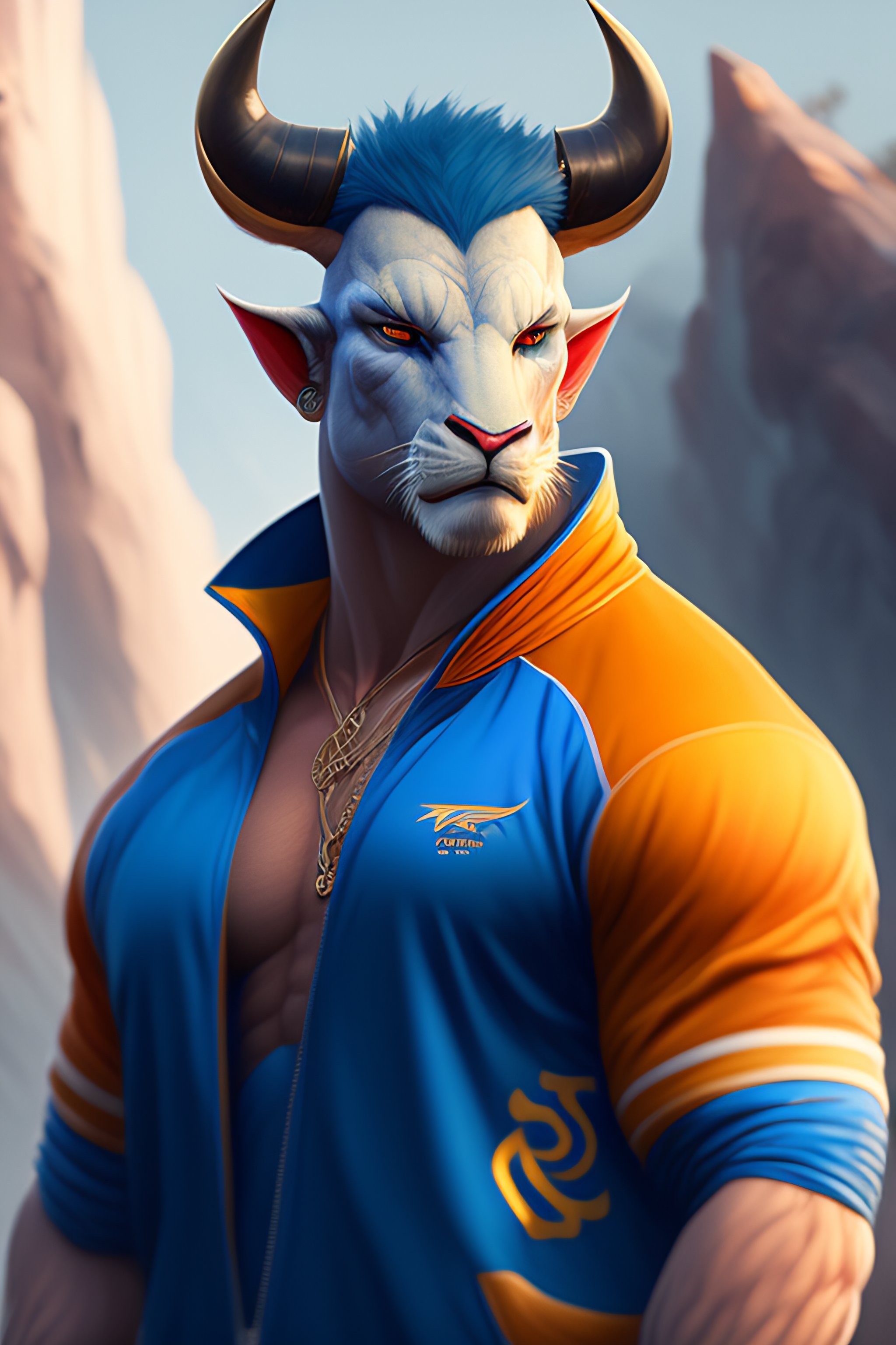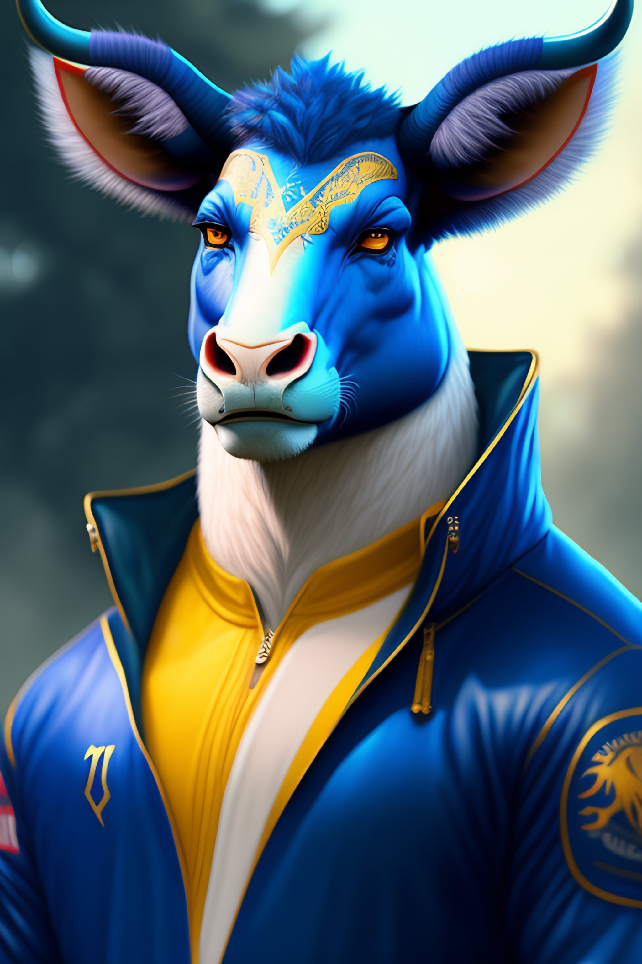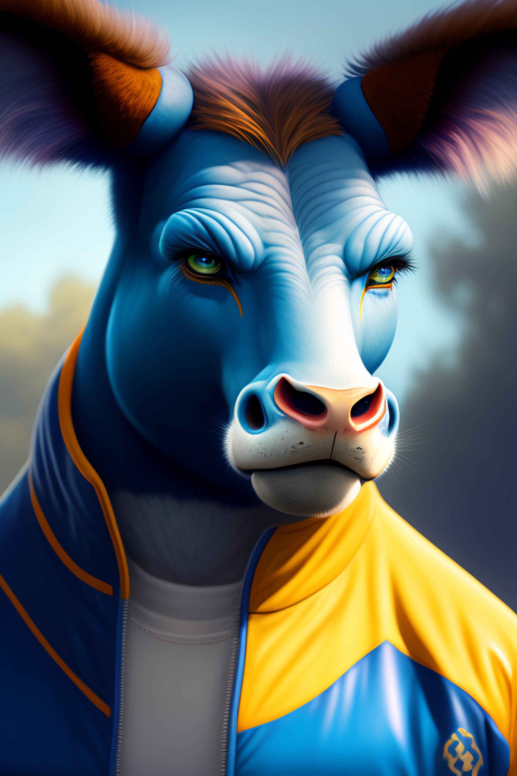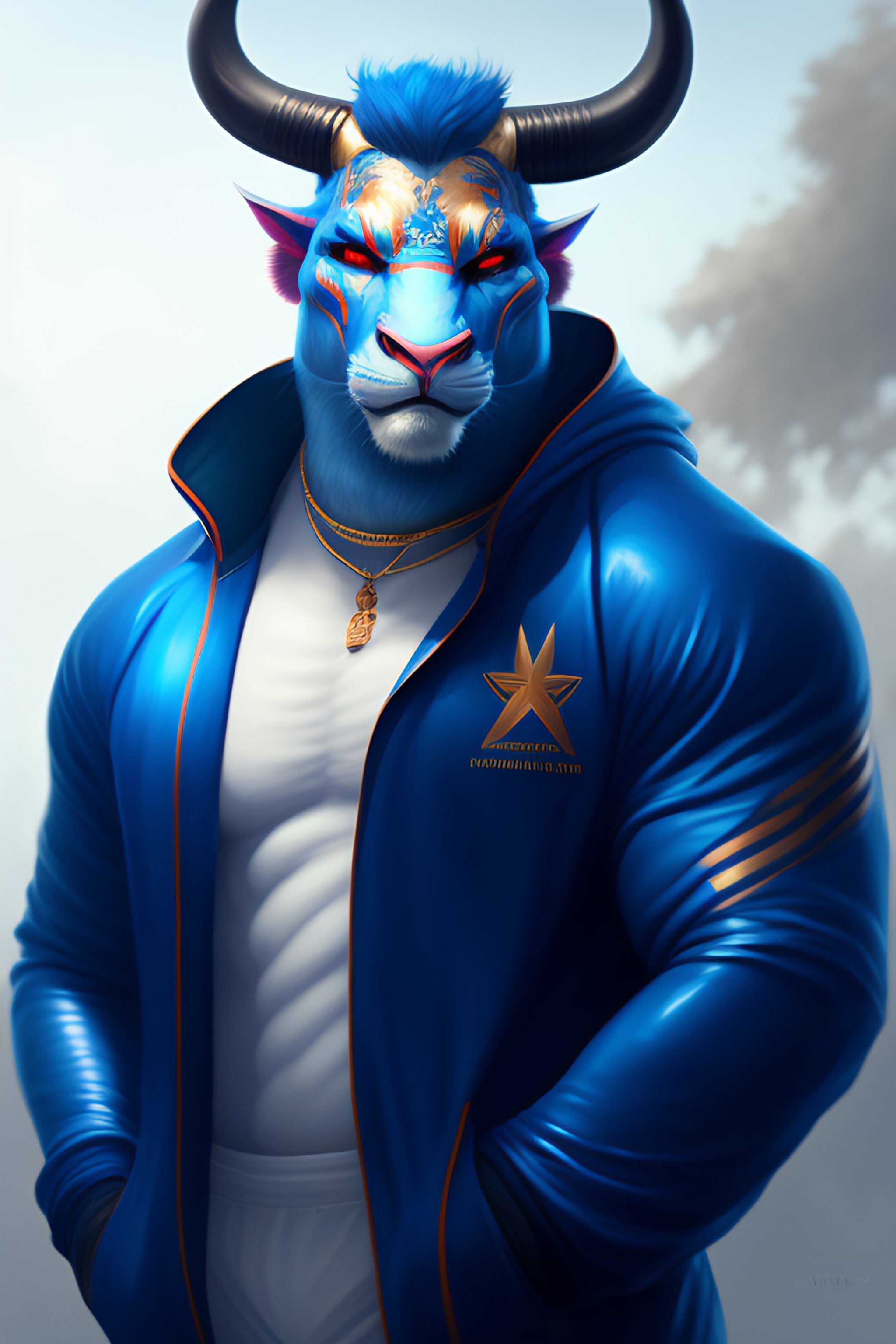 A award winnimg commission portrait of a fit anthro bull wearing a blue tracksuit, digital art, art by greg rutkowski, character design by charles bowater, professional character design, ross tran, artstation, deviantart, photorealistic, detailed face, hyperdetailed, 4k