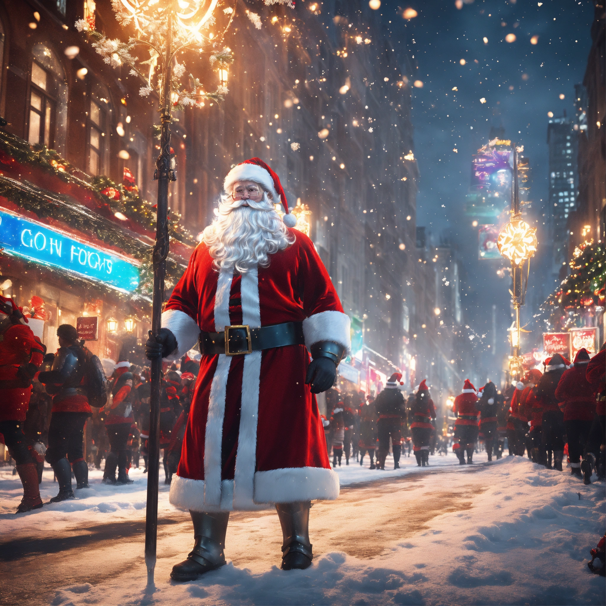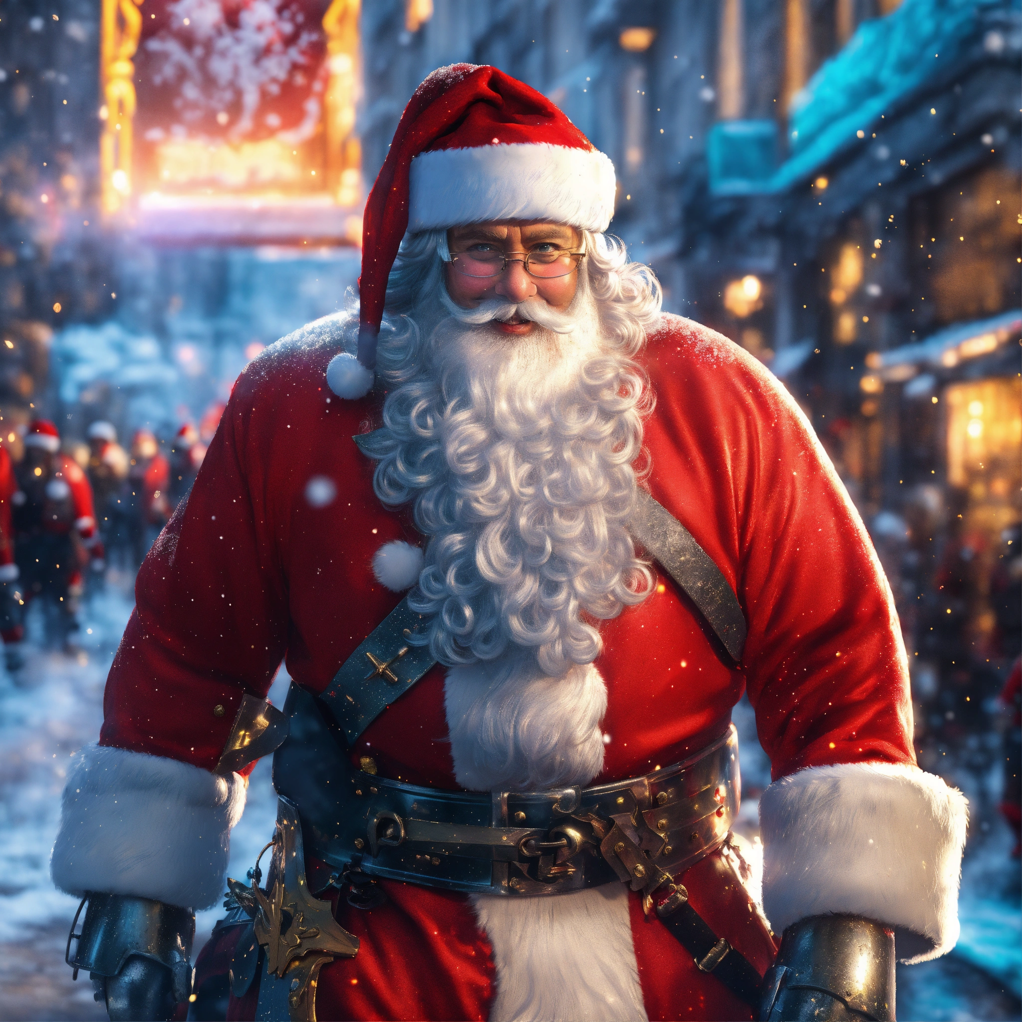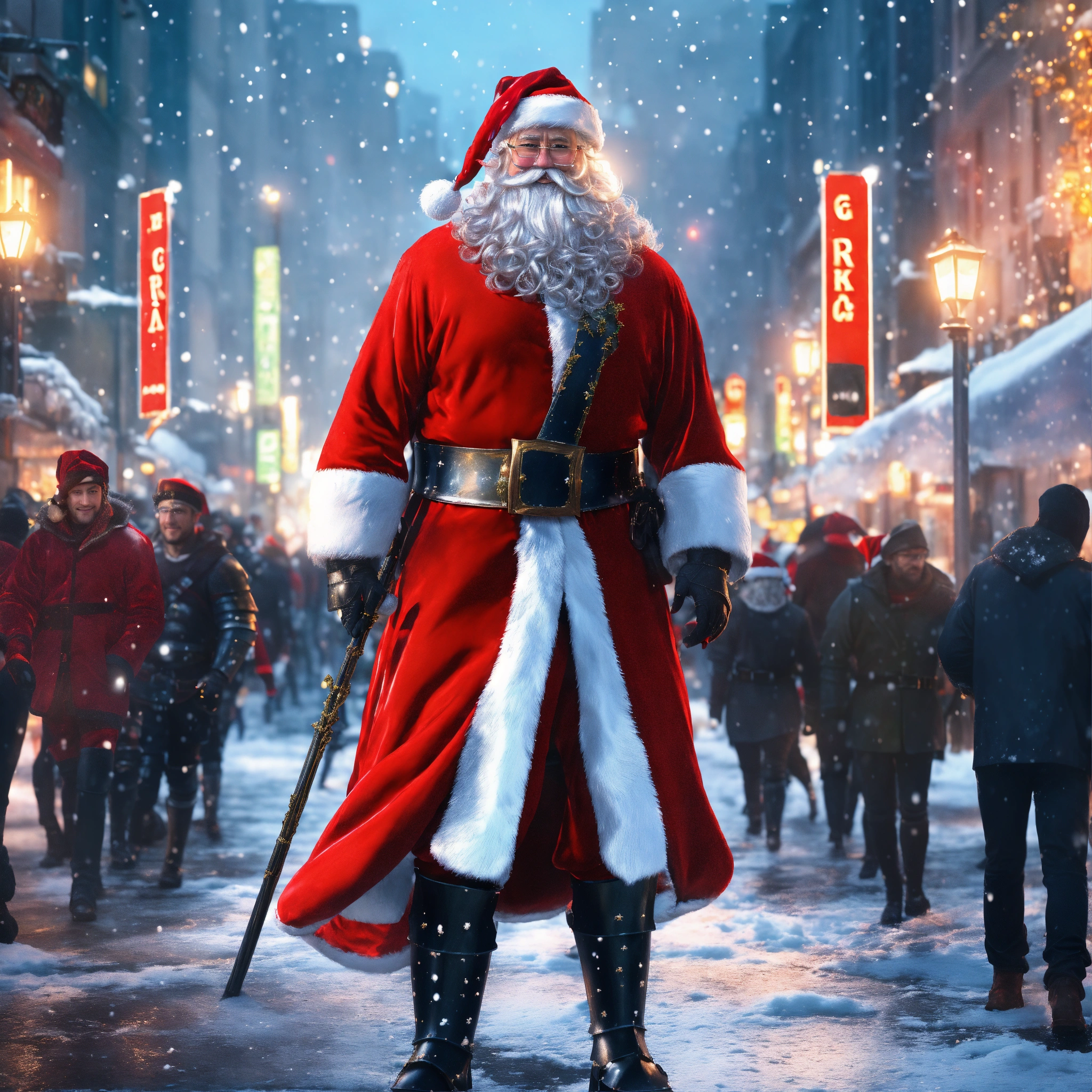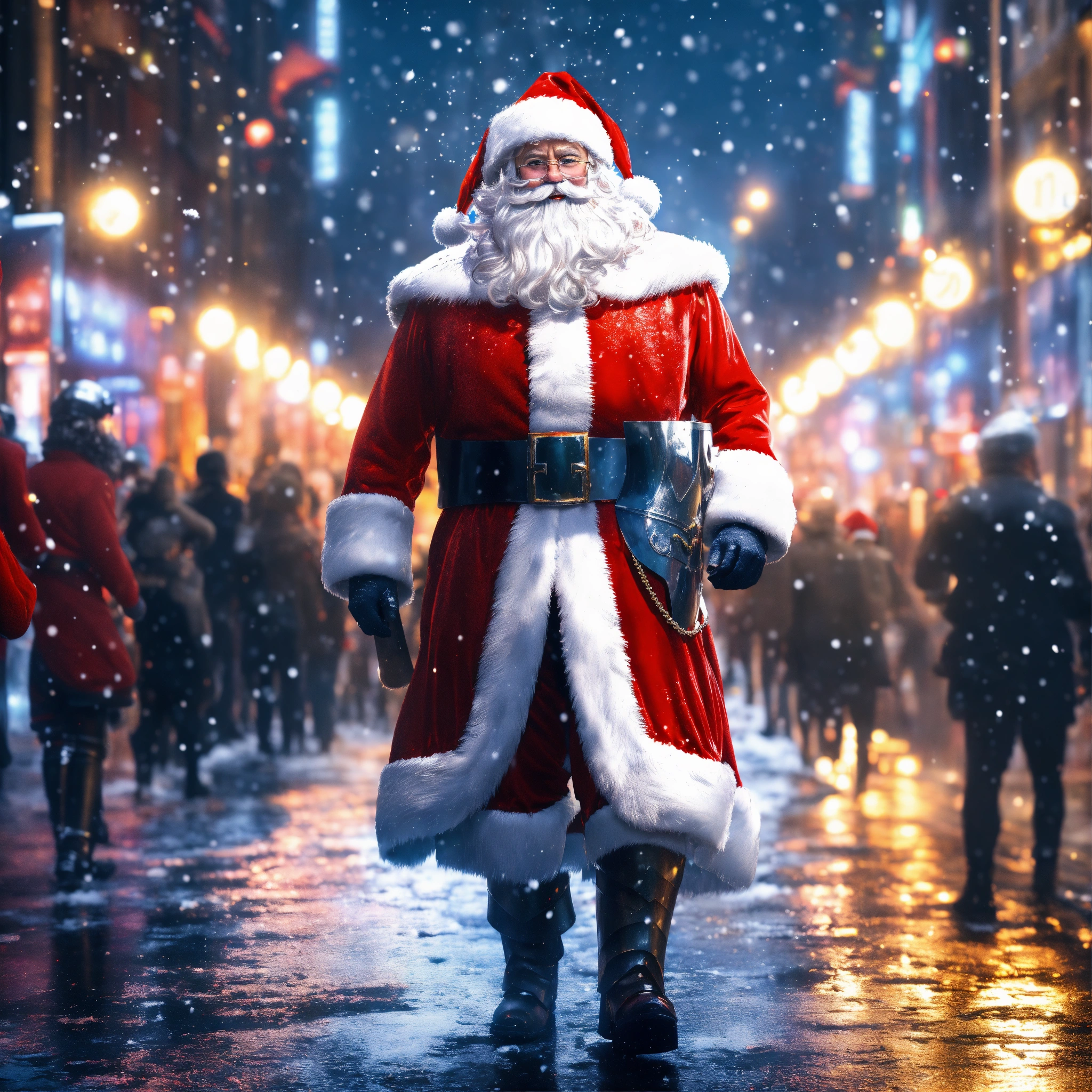 ((santa claus in armor walks down the crowded street of a modern night city)), full body, christmas spirit, detailed smiling kind face, natural skin, long red coat, red santa claus hat with metal base, hyperdetailed eyes, long staff, glasses, celebrating people wearing light clothes, line art, snowy shining background, ultra detailed artistic, super dynamic, snow splash, sun and ice, splatter, black ink, liquid silver melting, dreamy, glowing, glamour, glimmer, shadows, brush strokes, smooth, ultra high definition, 8k, unreal engine 5, ultra sharp focus, intricate artwork masterpiece, ominous, golden ratio, highly detailed, vibrant, production cinematic character render, ultra high quality model