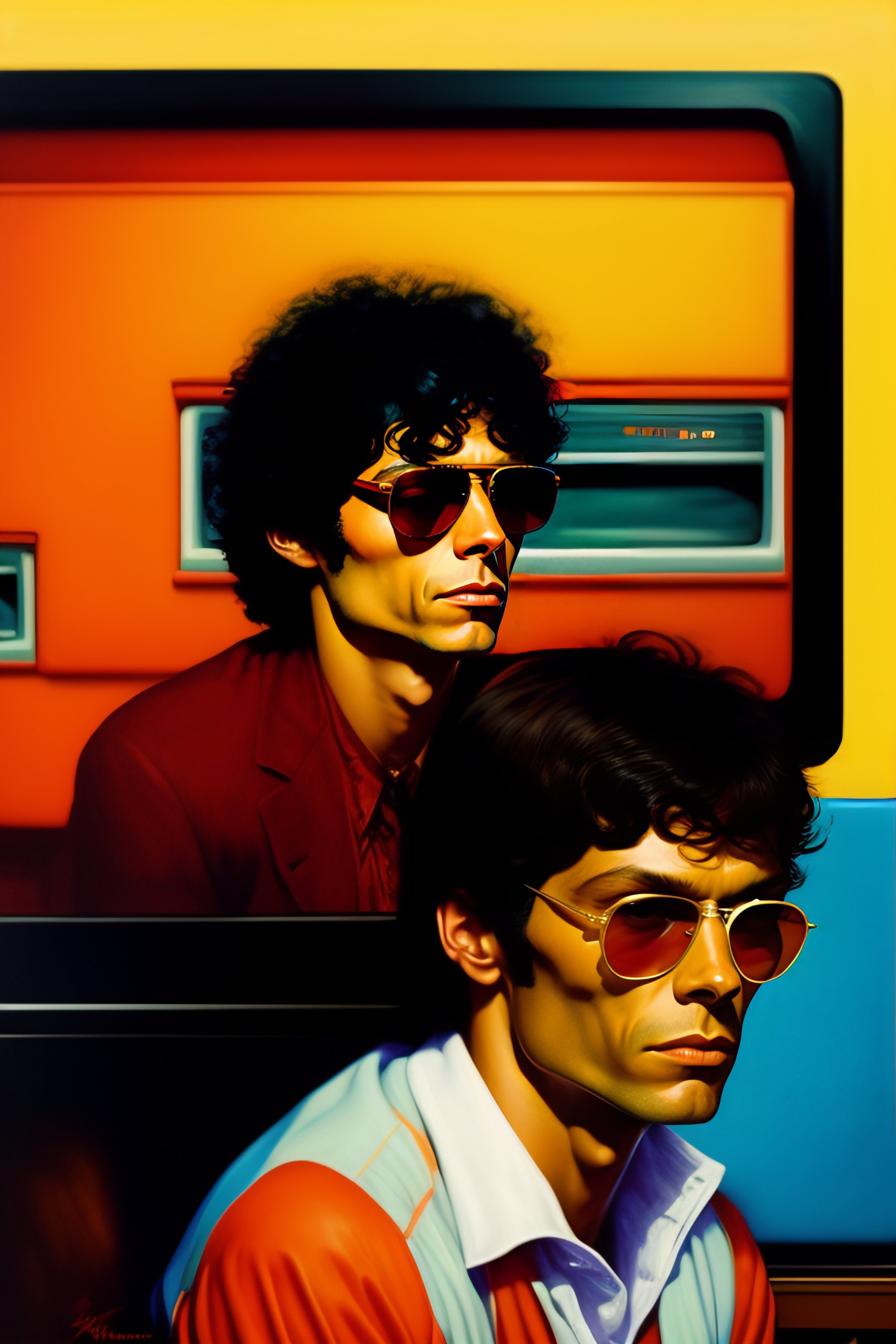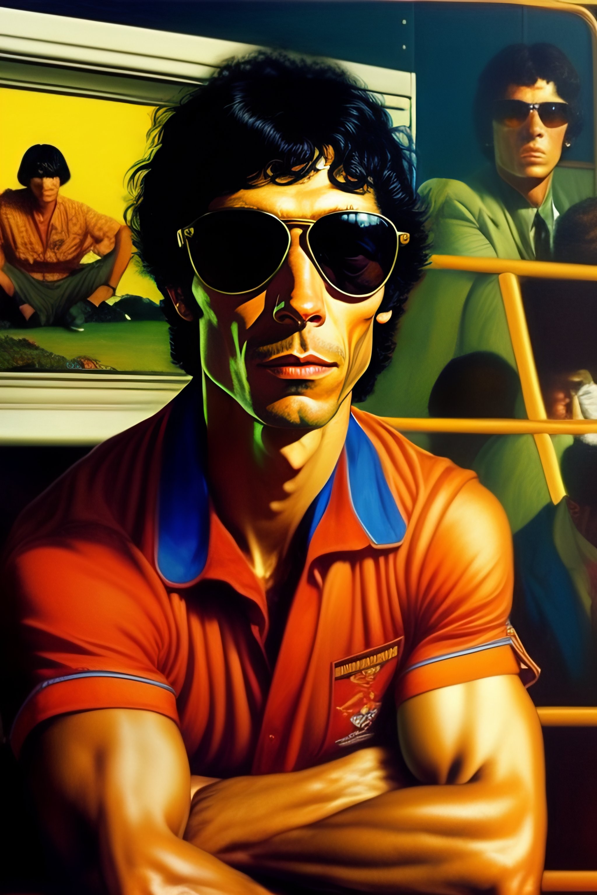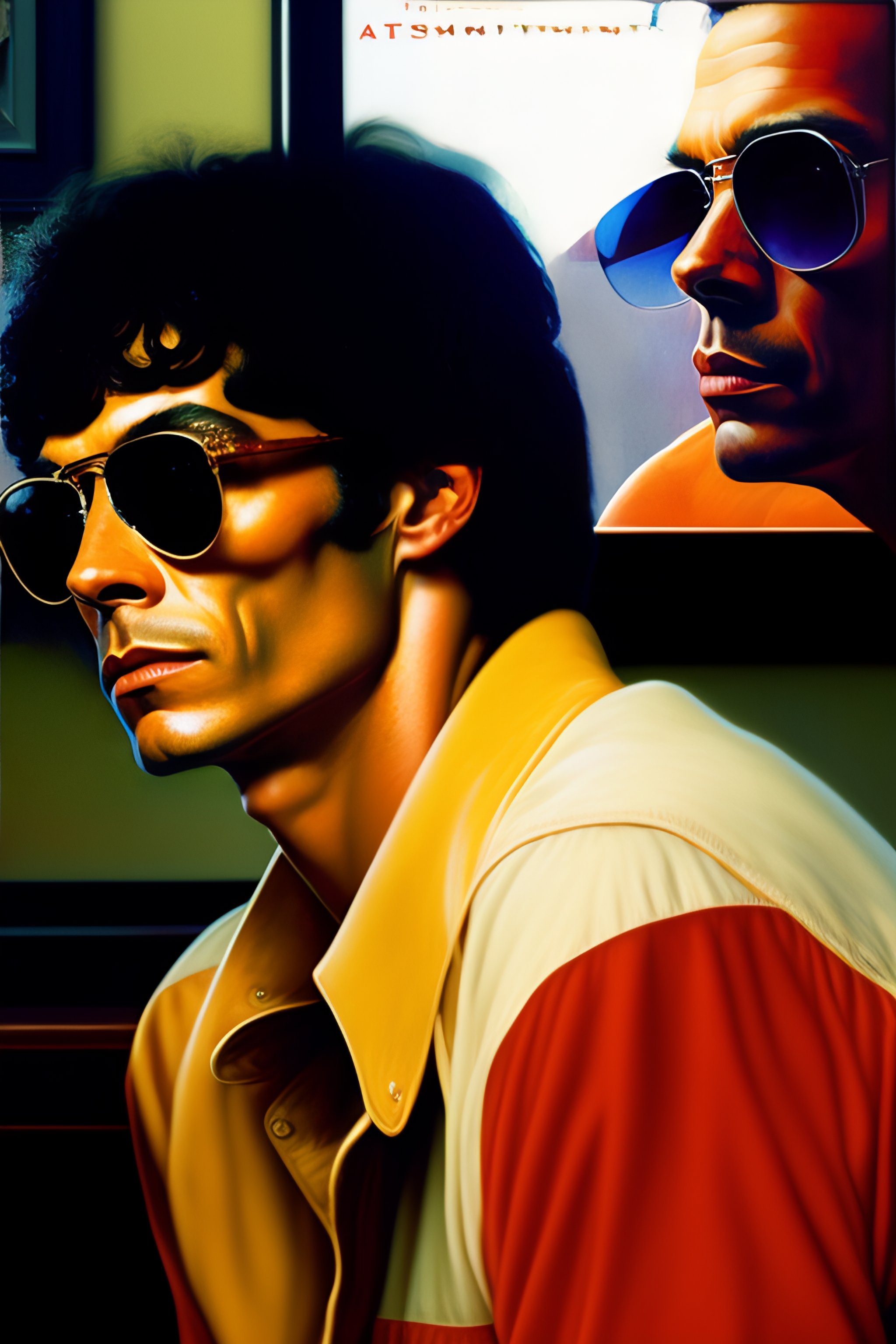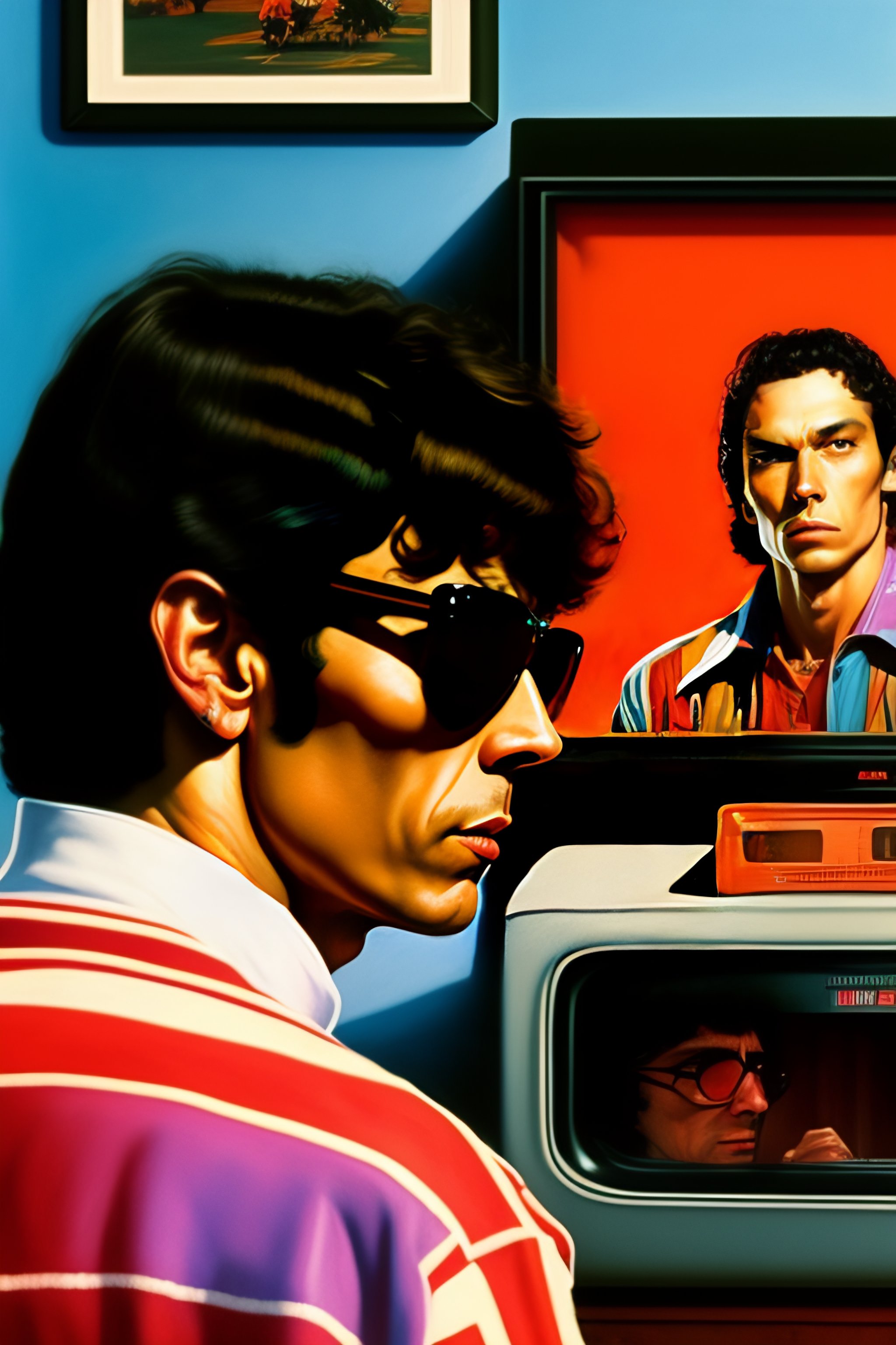 A norman rockwell painting of a the nightstalker, richard ramirez, watching television wearing brightly colored cheap sunglasses