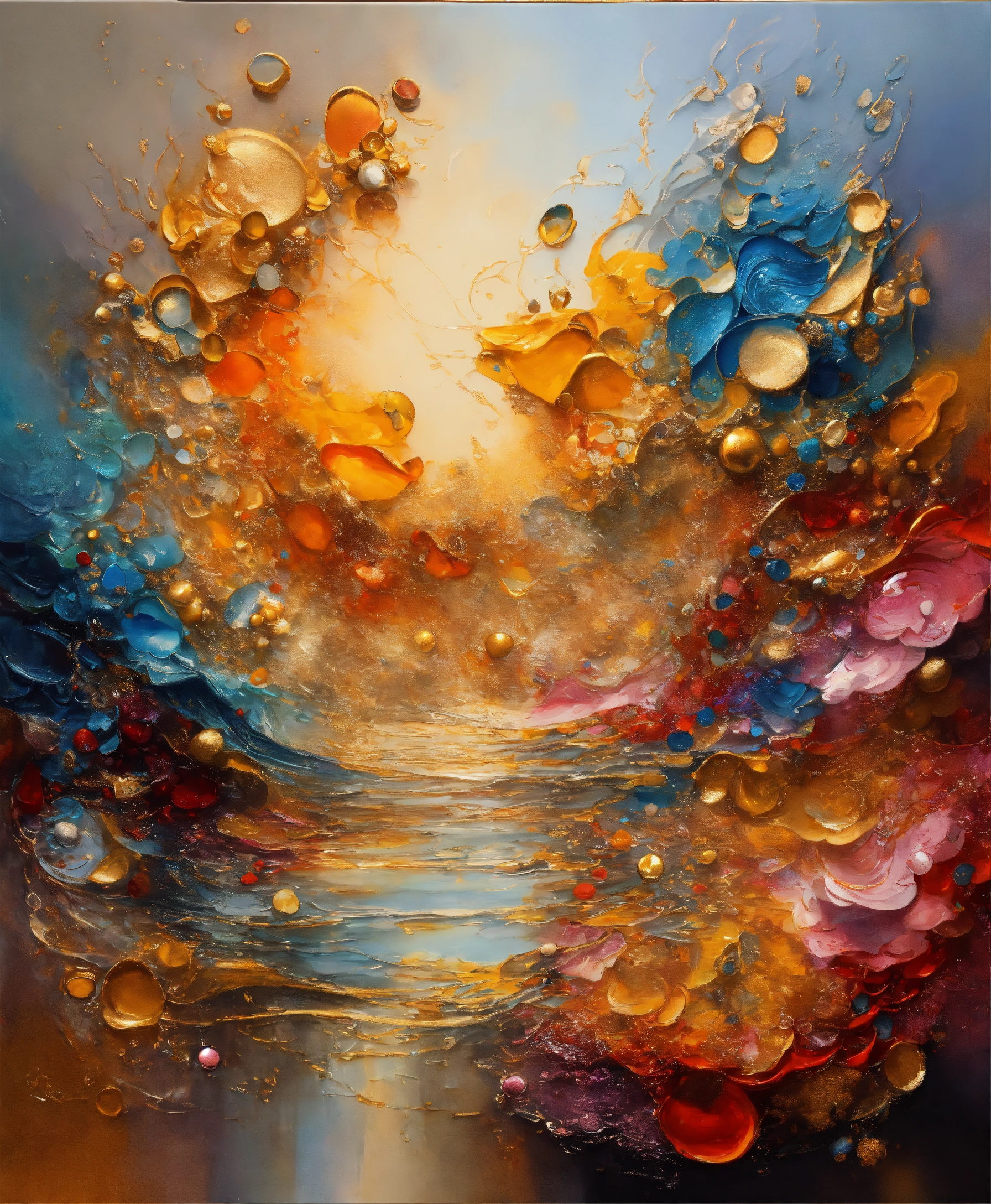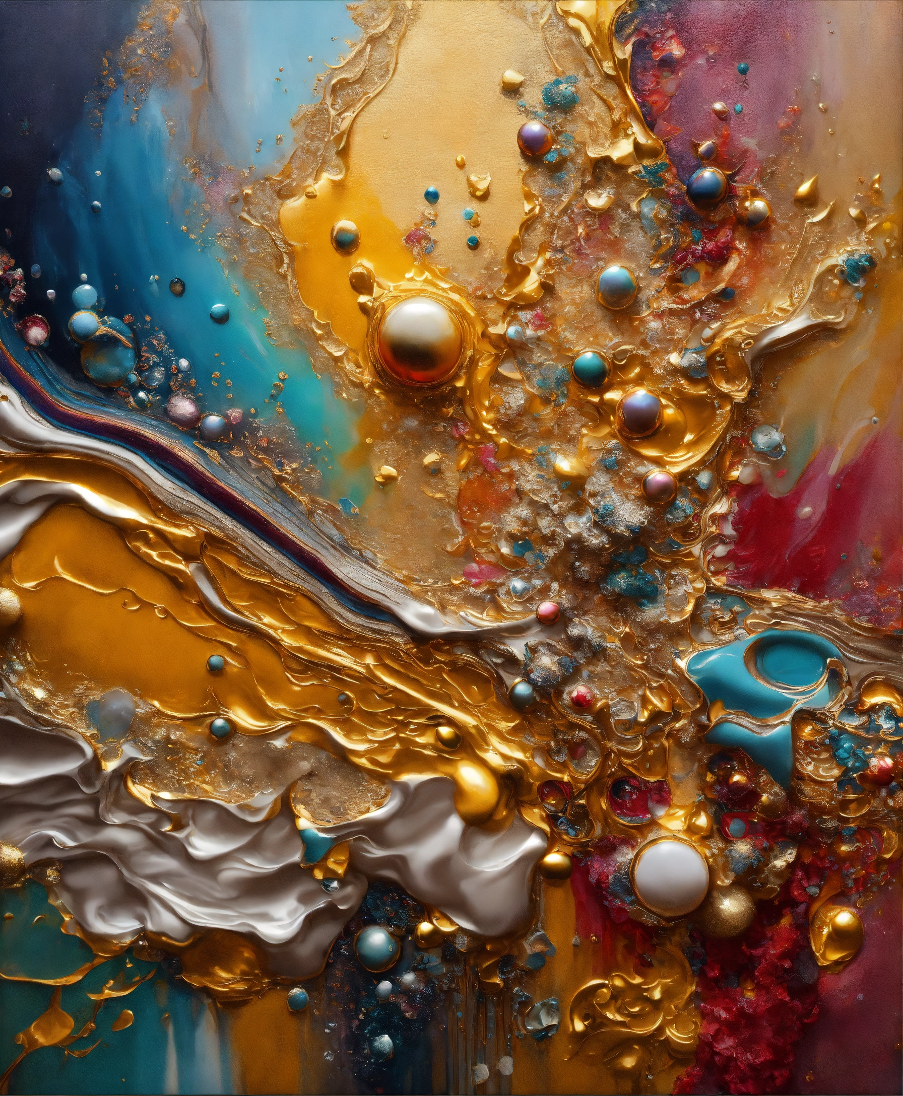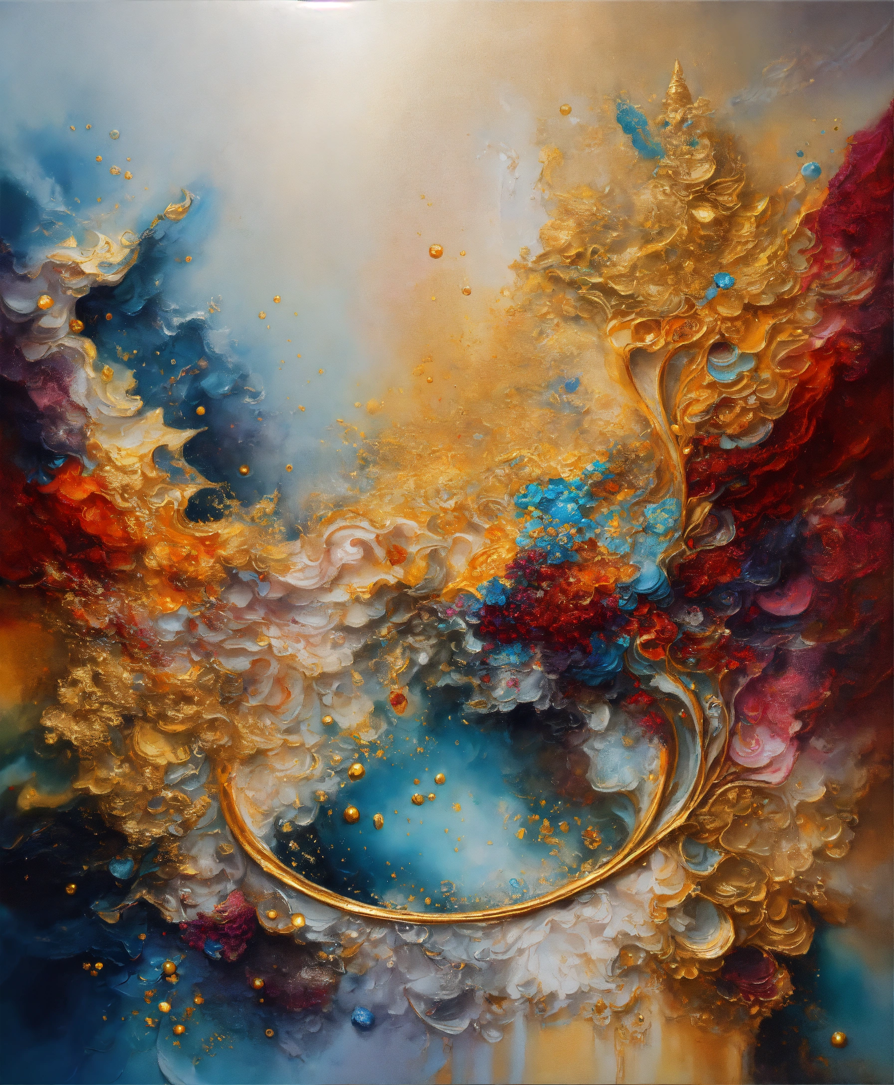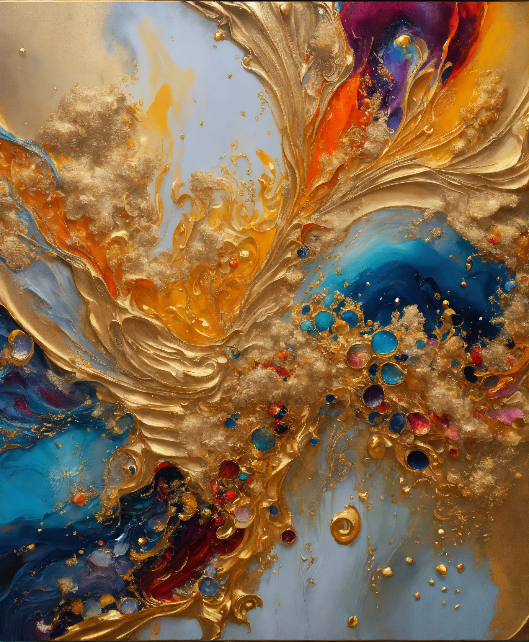 Colorful abstract painting oil and water complex complicated bright vivid colors beautiful opulent wealthy intricate all hues delicate hyperdetailed masterpiece awesome 24k gold and silver trim 8k