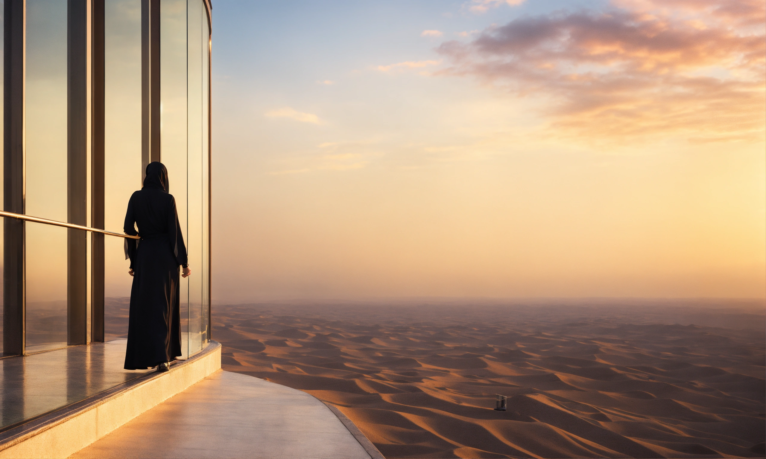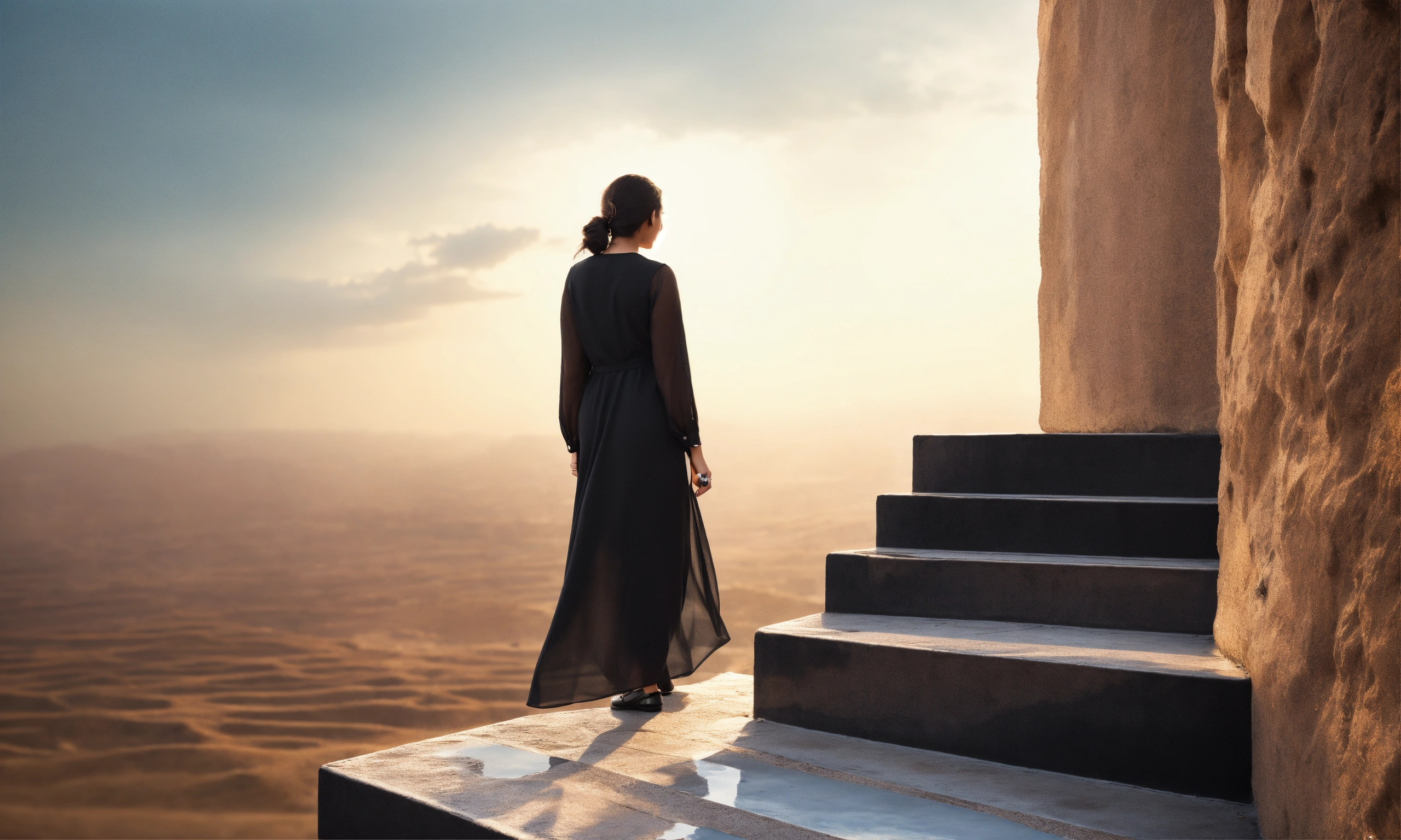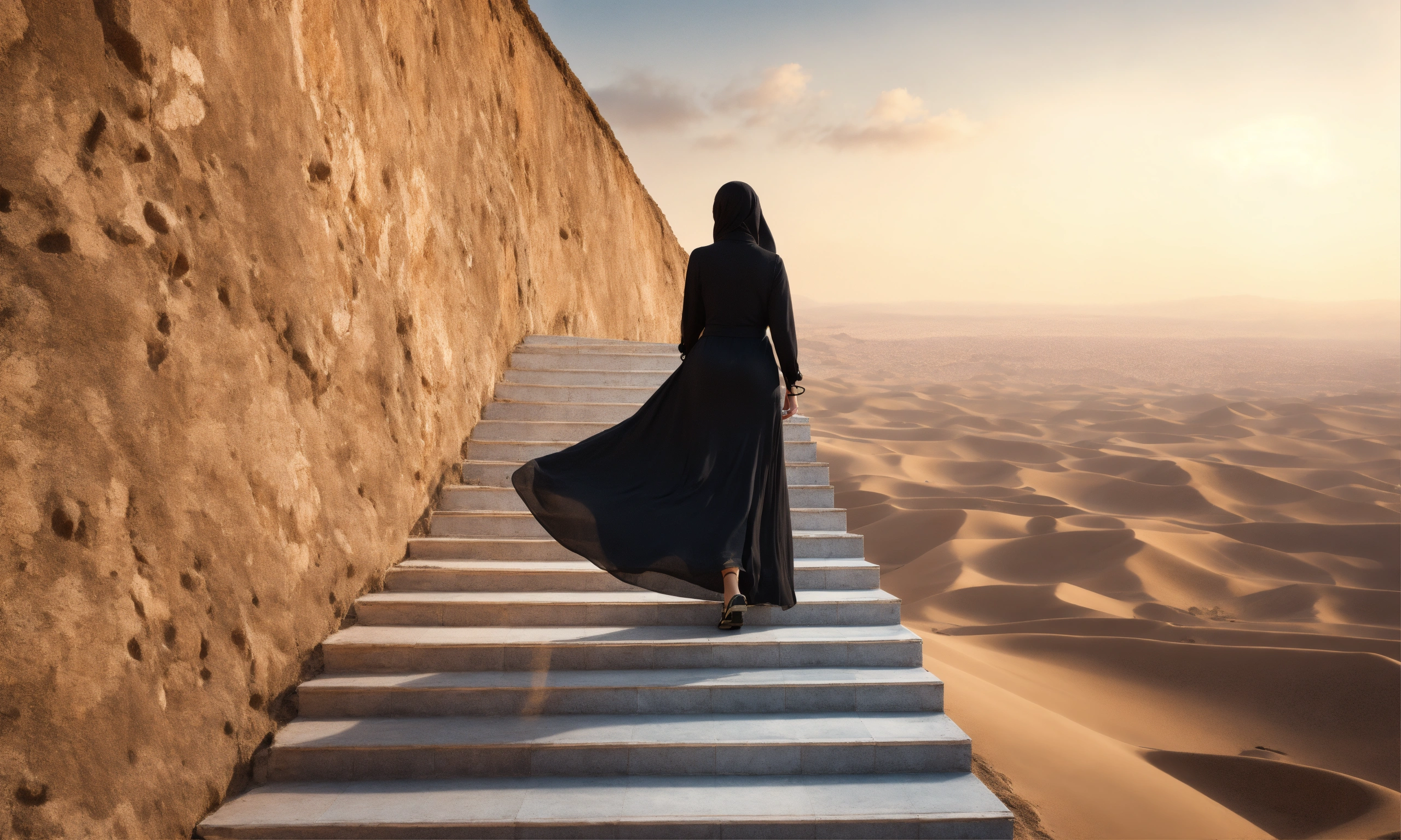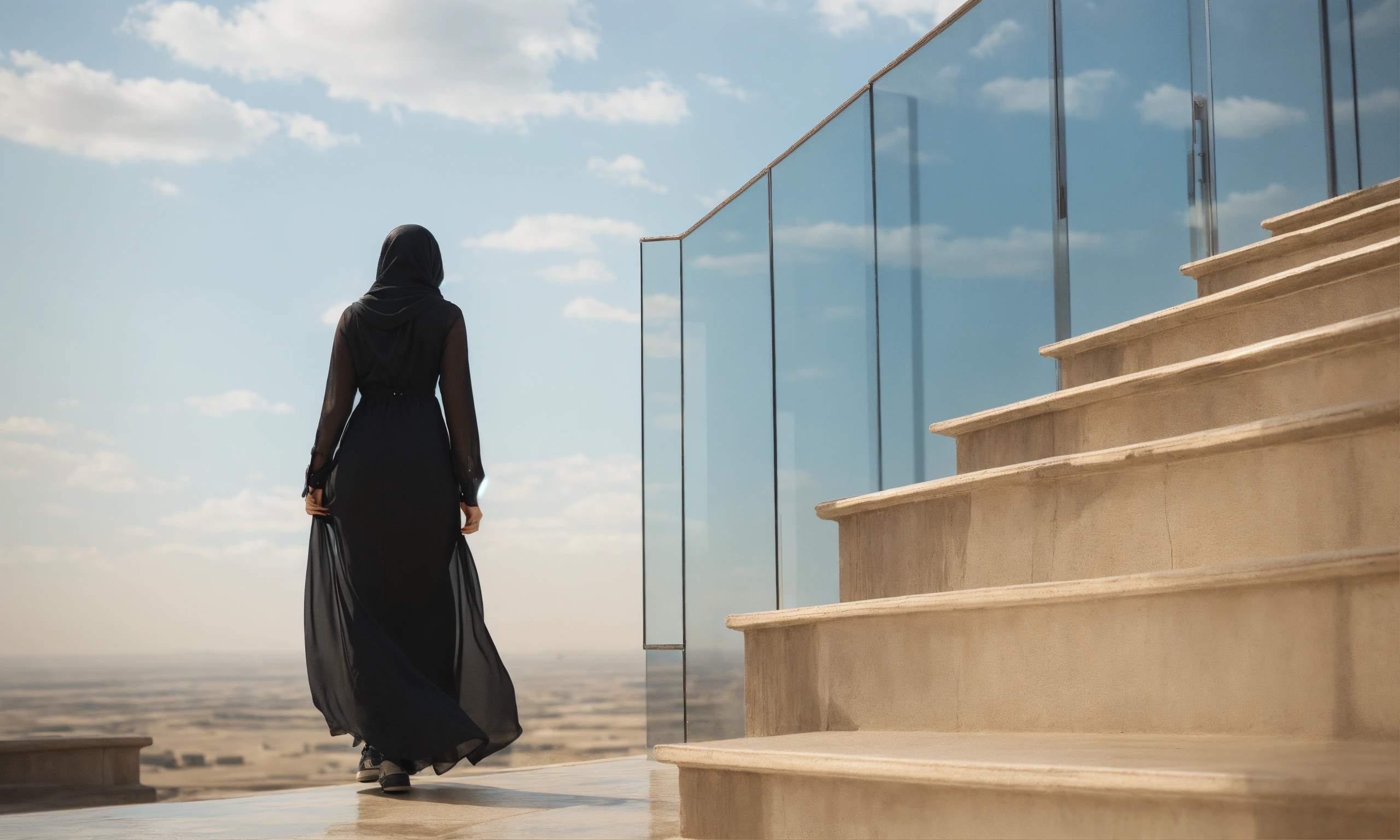 Saudi woman climbing six steps only, side way, close up, glass, black dress, modern, sky, natural light, warm, photo-realistic, 8k, high definition