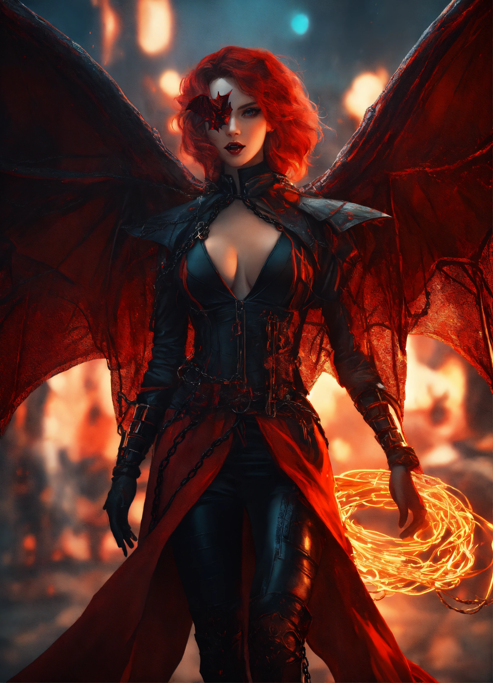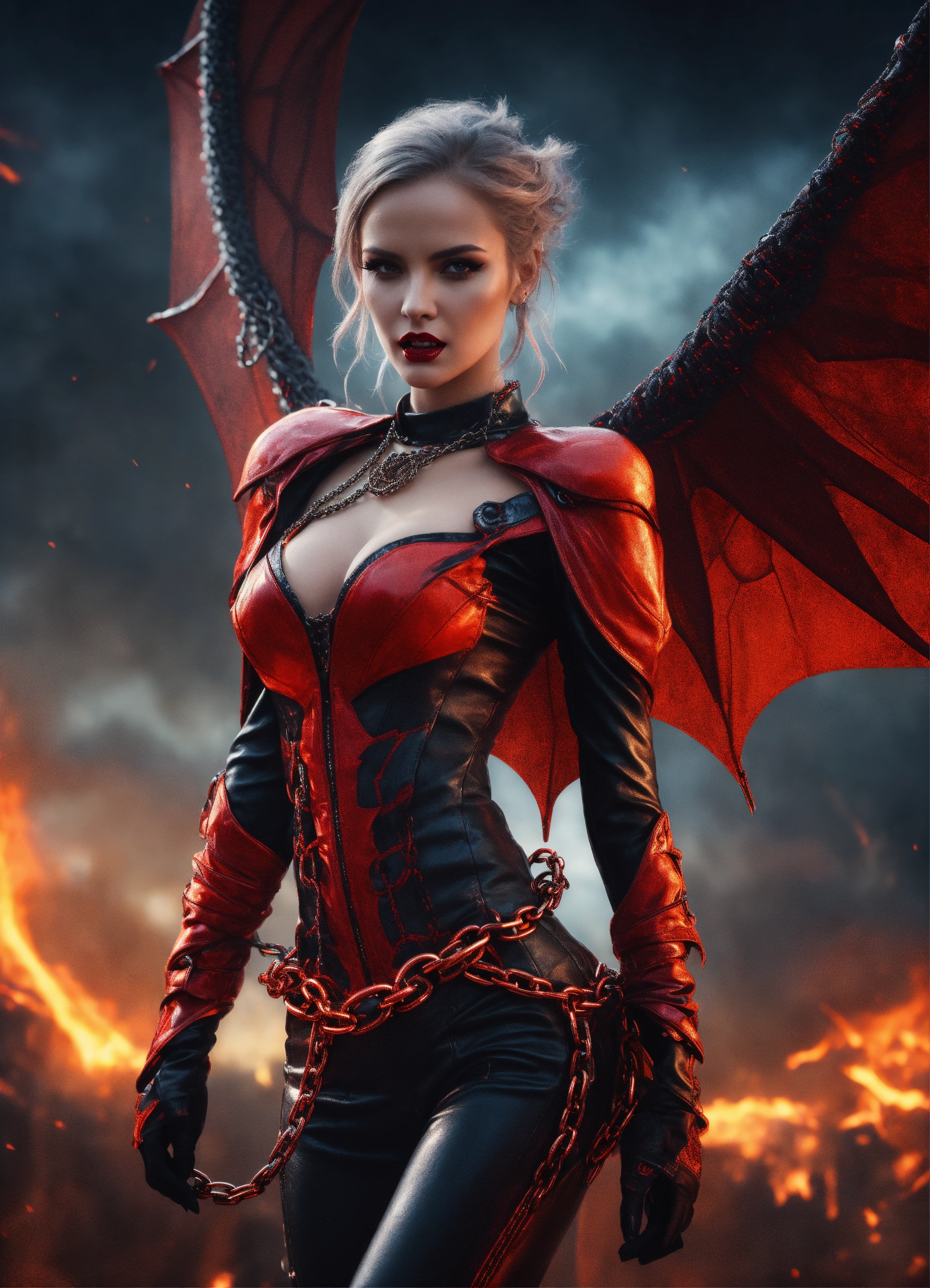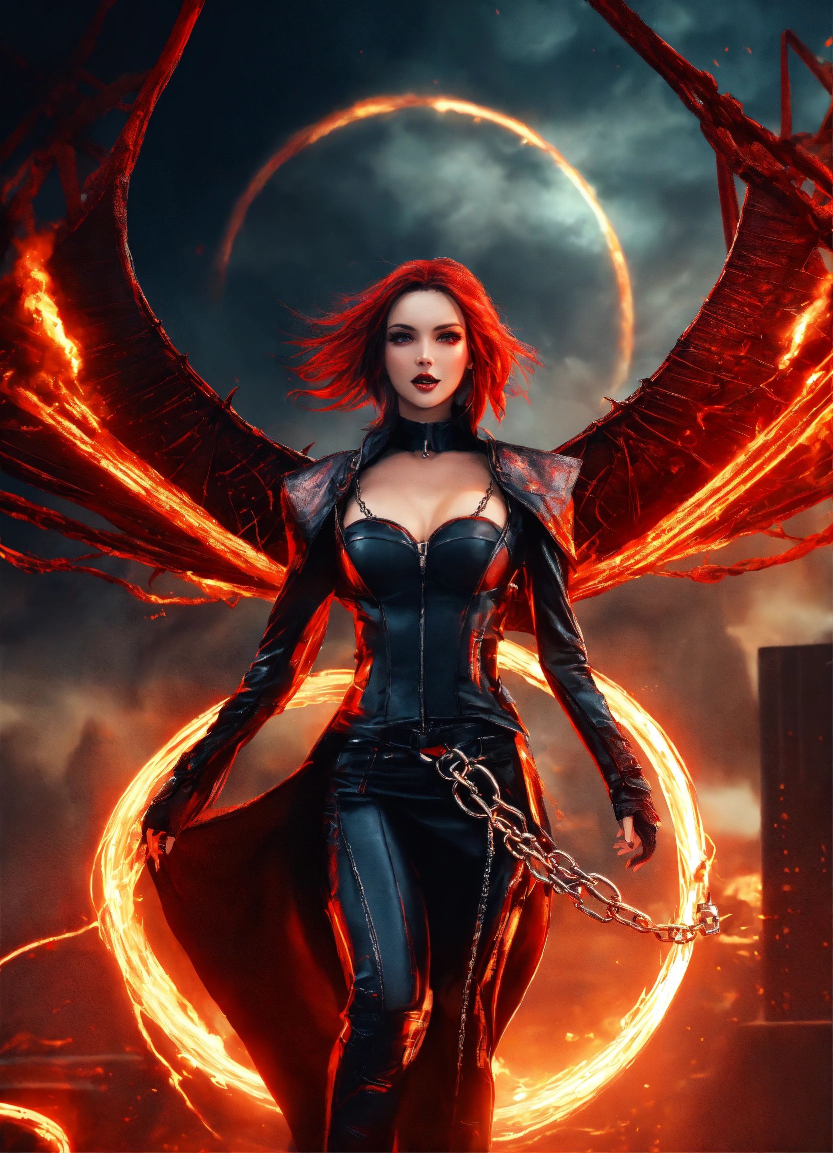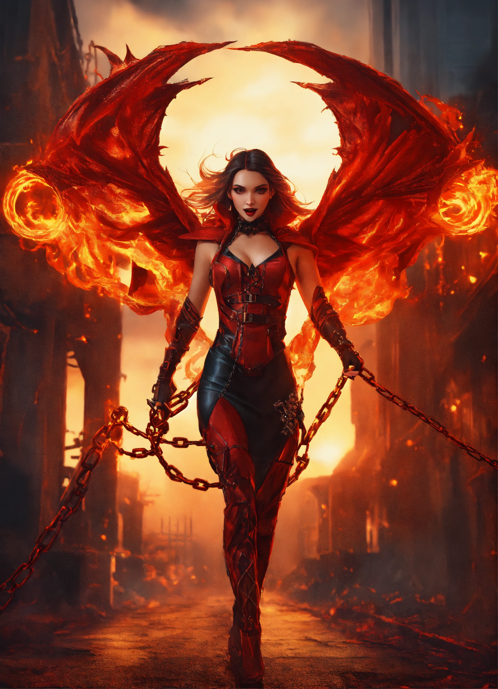 Full body evil futuristic vampire woman entangled in a red fiery spiral, attractive evil futuristic vampire warrior woman with bat wings entangled in a fiery spiral carrying chains, beautiful face with fangs, fully clothed wearing black dress carrying chains, floating in the sky, fantasy, high detail, realistic photo, high detail, digital painting, cinematic, stunning, hyper-realistic, sharp focus, high resolution 8k, insanely detailed