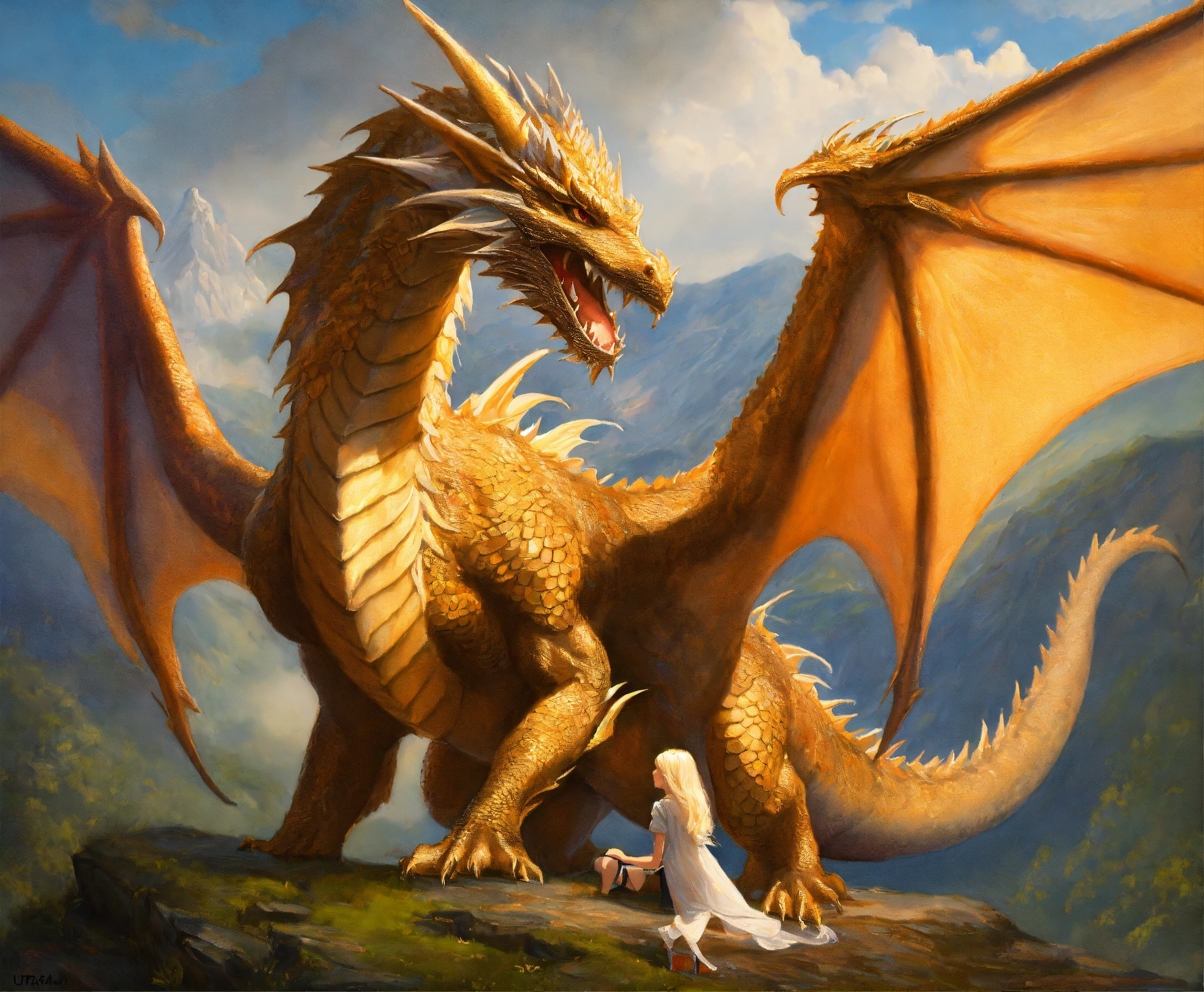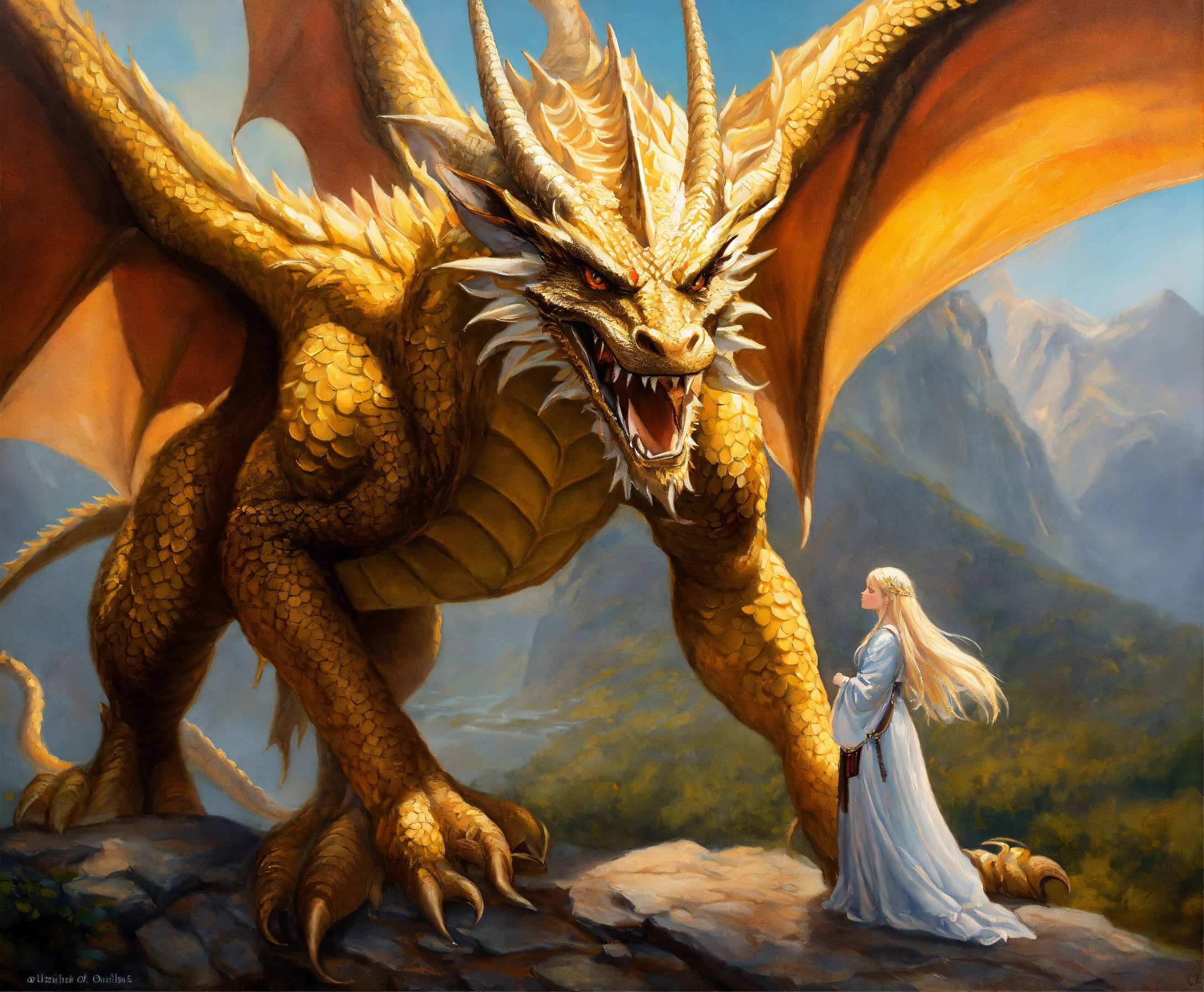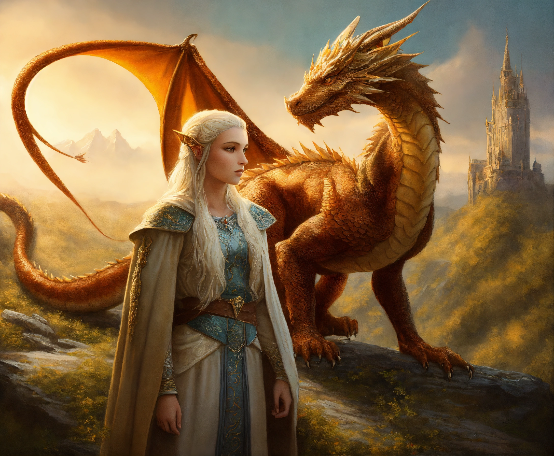 Oil painting of a magnificent dragon with a 16 year old whiteblond elvish girl standing by his side, ultra detailled, ultra realistic