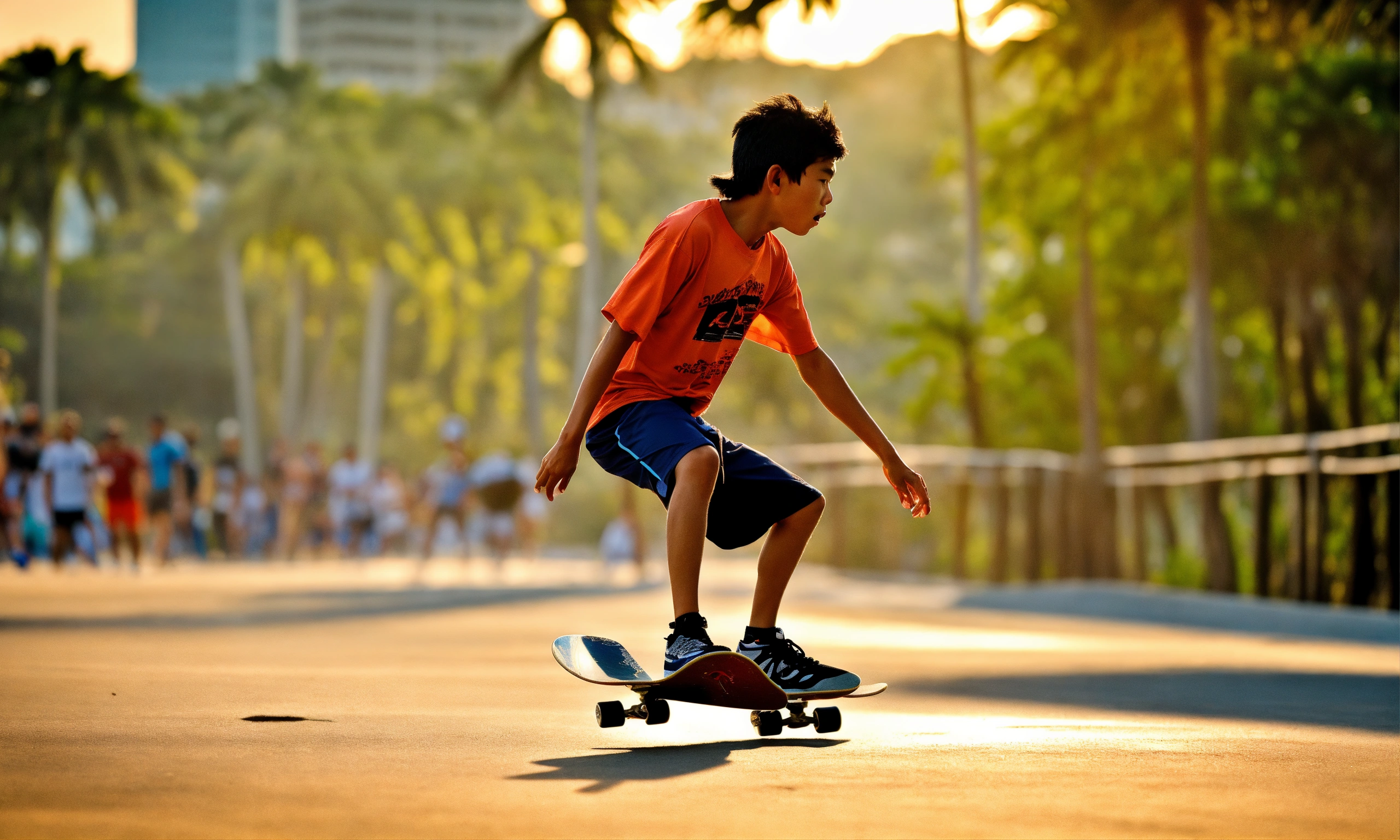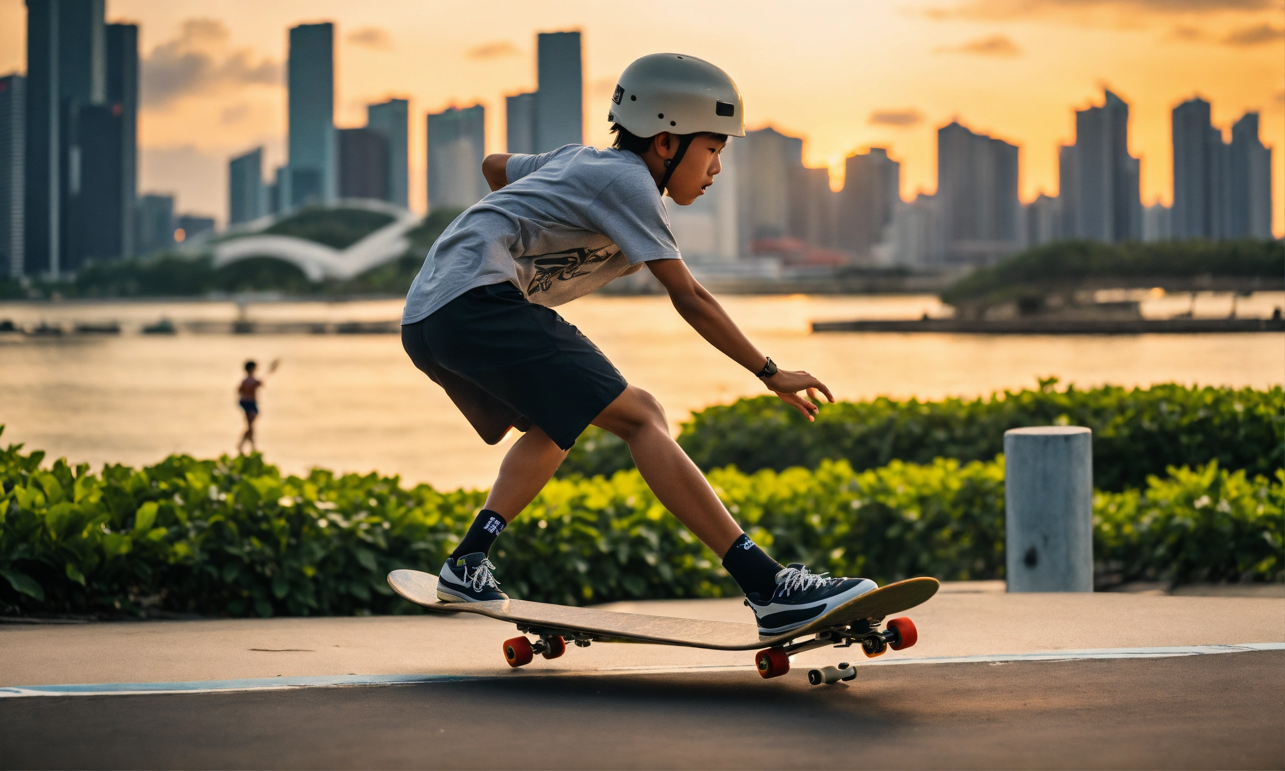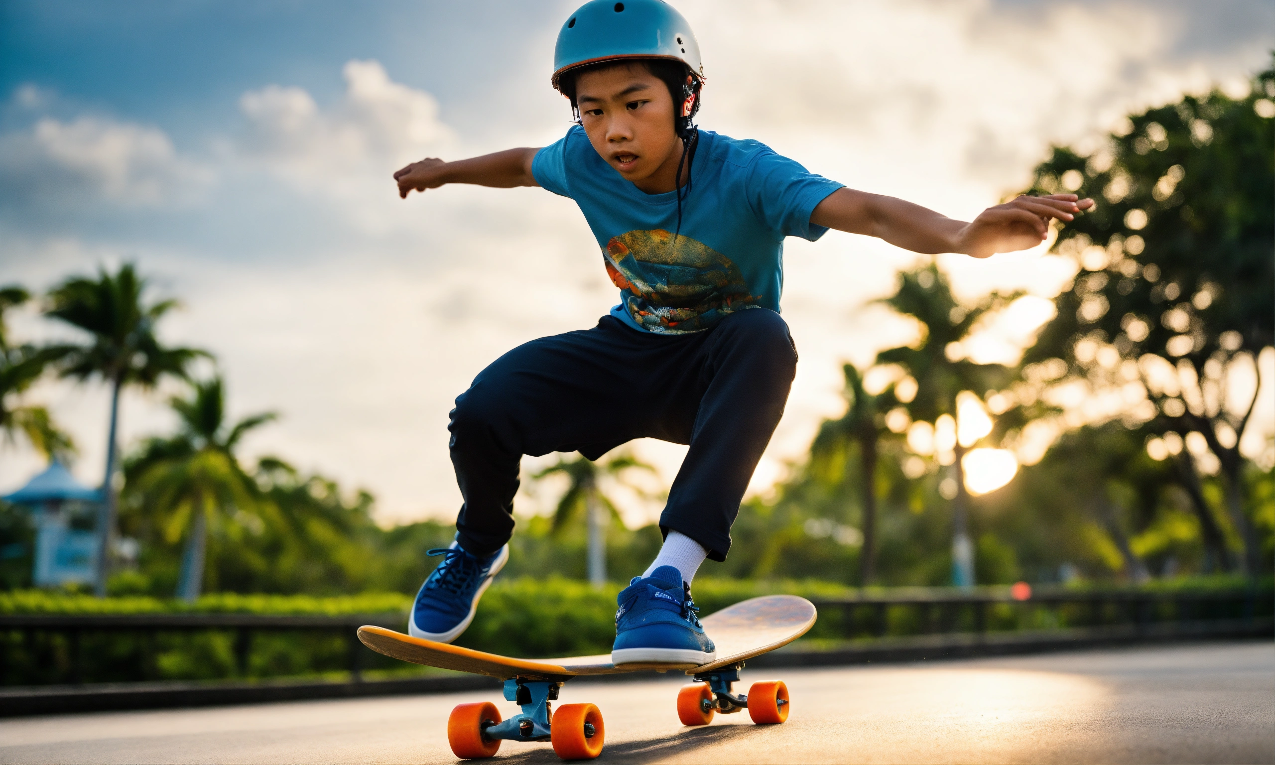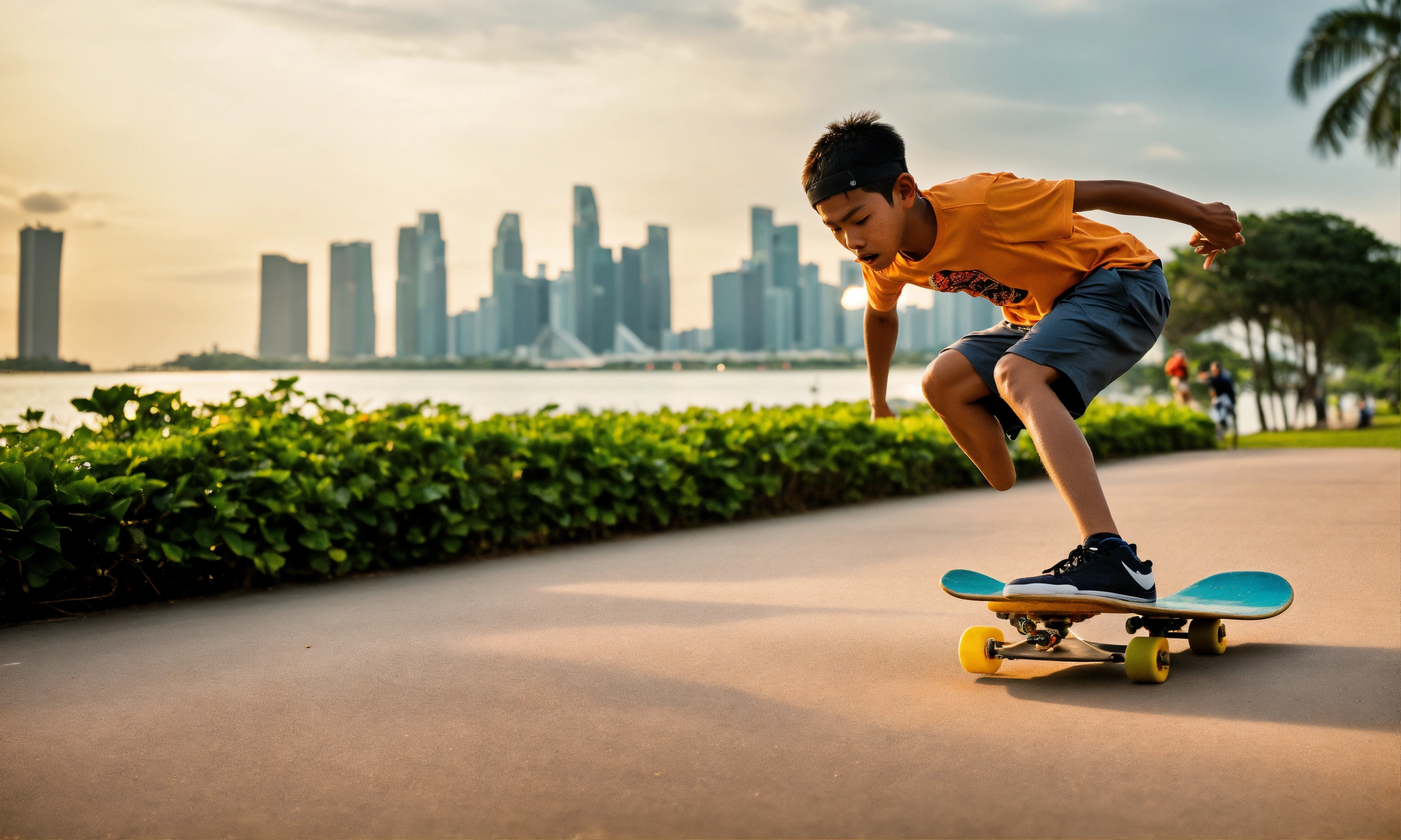 Afternoon sun, ultra-realistic photo, cinematic quality, close-up action shot at singapore's east coast park, singapore, the backdrop showcases the iconic scenery of the park. main focus a 9-year-old malay skateboarder in mid-air executing a challenging trick, his body contorted in concentration. intense focus radiates from his eyes, sweat glistening on his brow, exuding raw passion and unyielding perseverance; clothing contemporary skateboarding attire including protective gear, a t-shirt, shorts, and sneakers. expression grit and determination, a testament to his dedication to the sport. themes modern nostalgia, overcoming adversity, dynamic lighting emphasizes the contours of his face and body against the backdrop of east coast park, 50mm camera lens producing sharpness with a blurred background, portra 400 film, subtle film grain adding depth and emphasizing the raw energy of the moment.