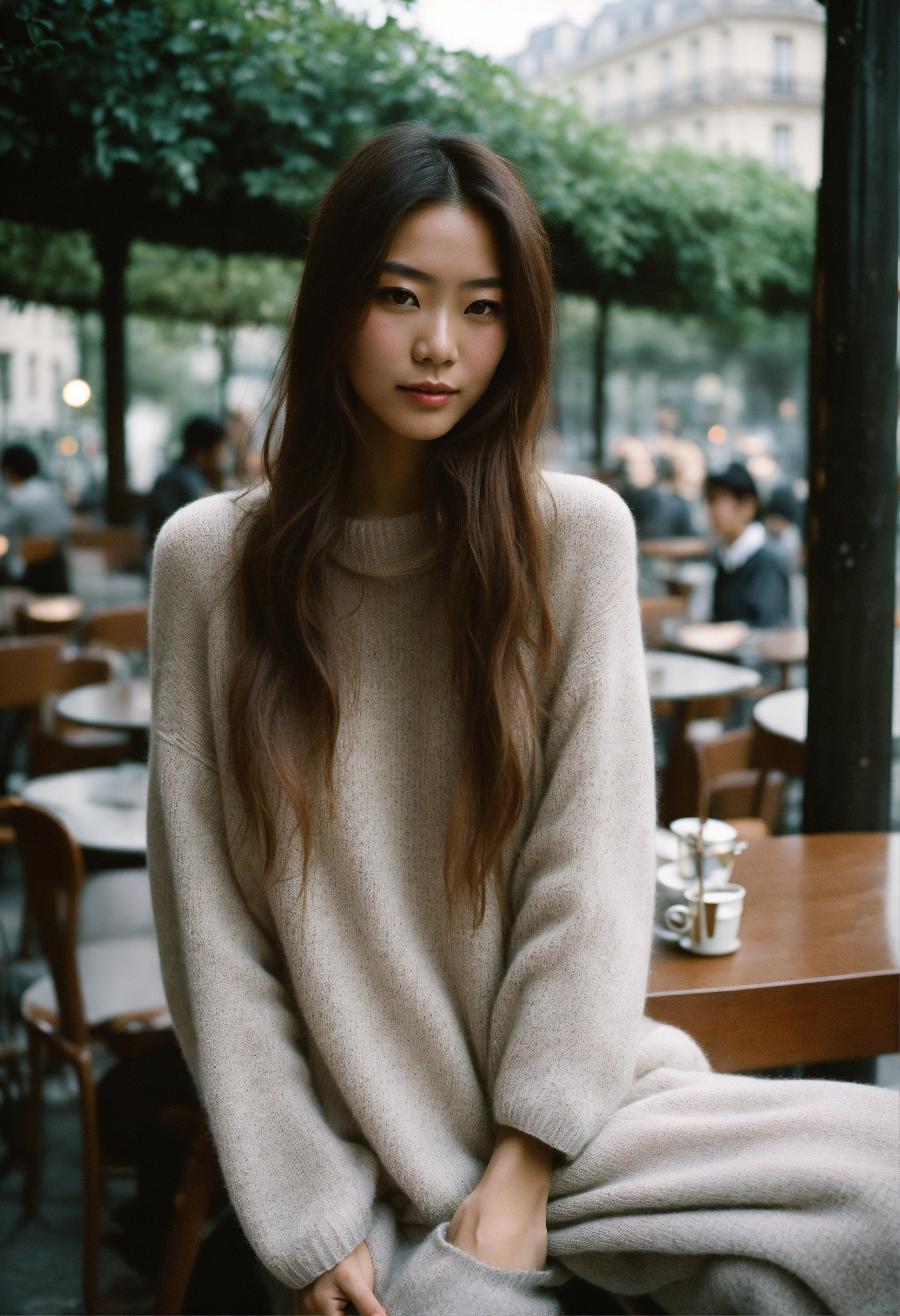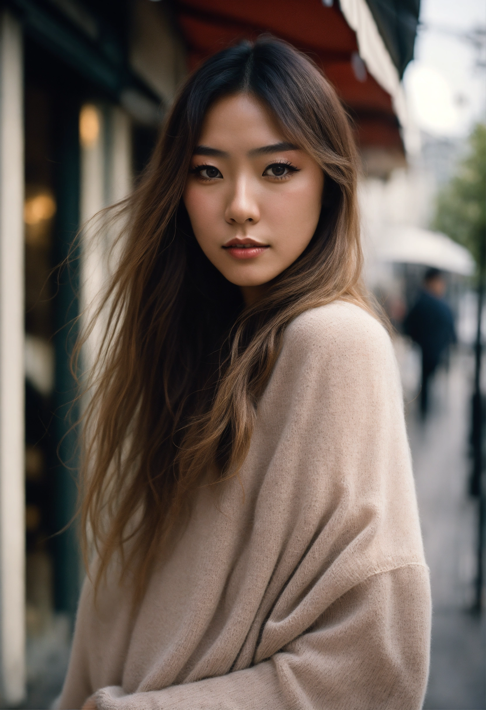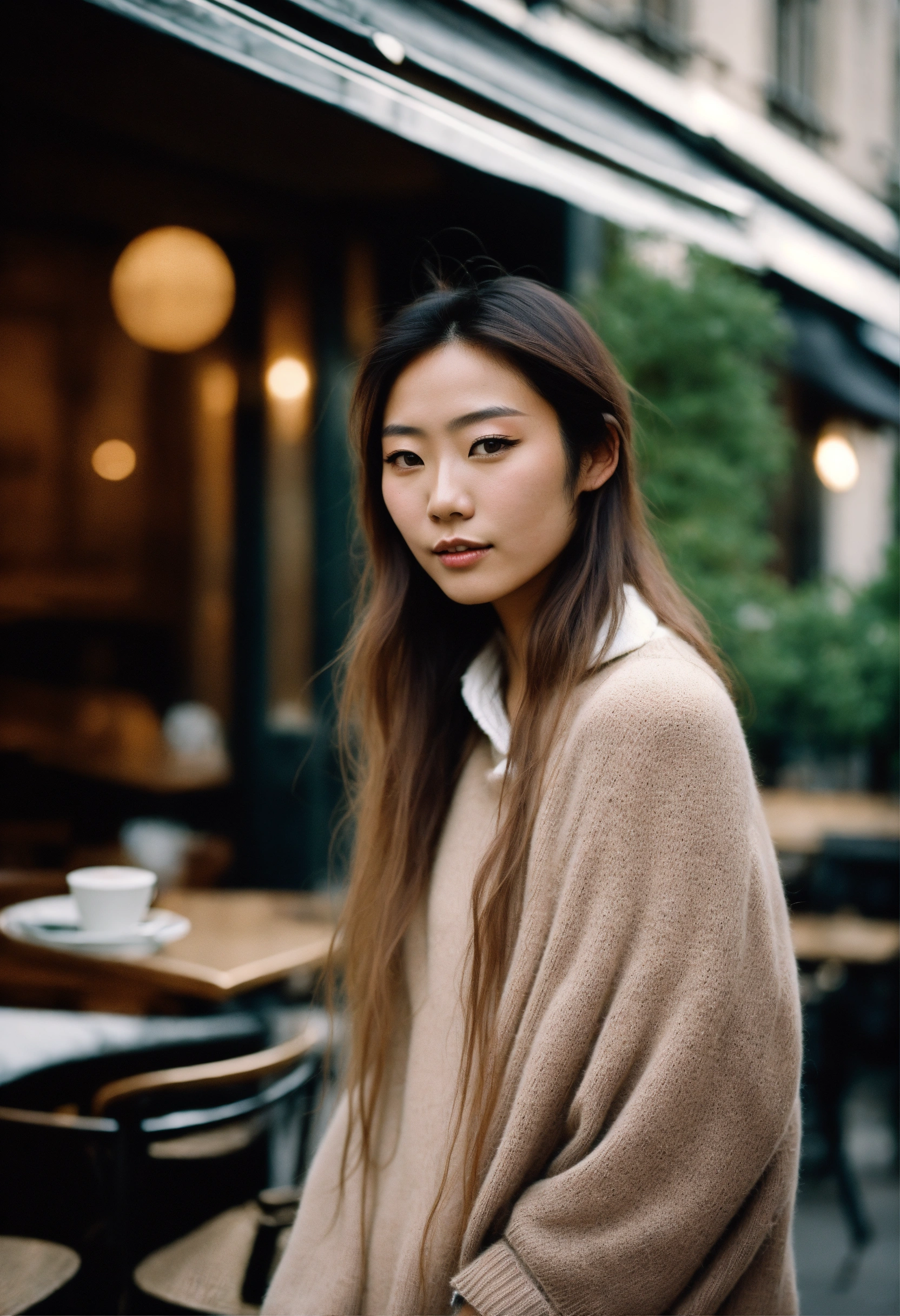 Portrait of a beautiful japanese fashion model with long flowing hair and leggings and oversized sweater, ethereal dreamy foggy, photoshoot by henri cartier bresson, editorial fashion magazine photoshoot, fashion poses, in front of parisian café terrace. kinfolk magazine. film grain. a soft smile