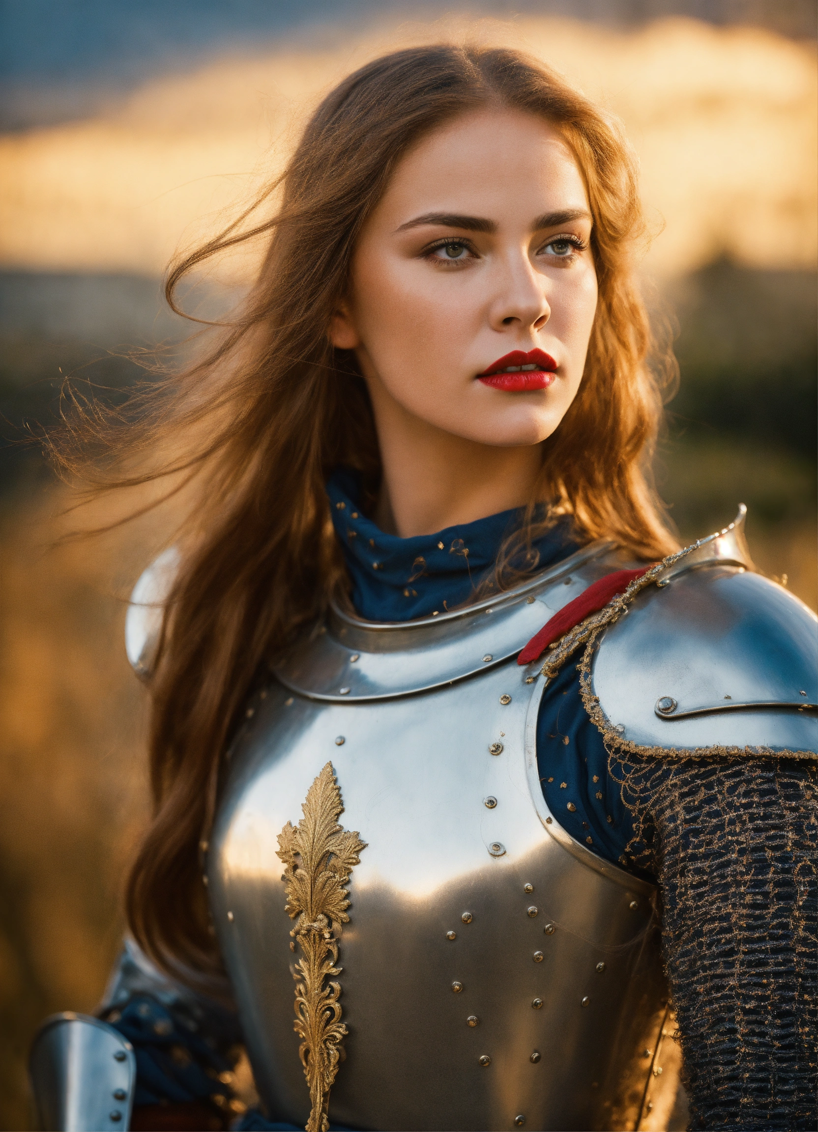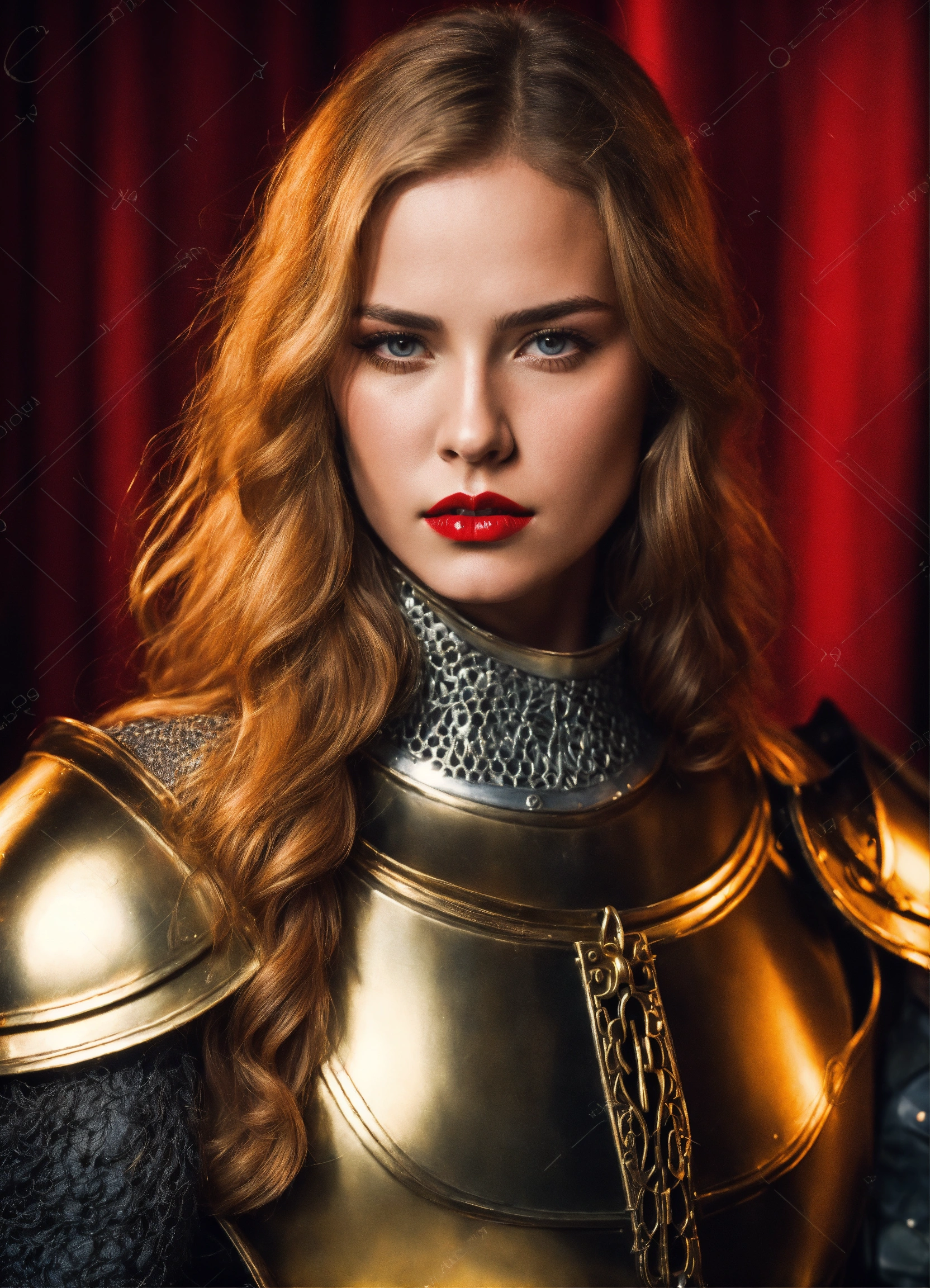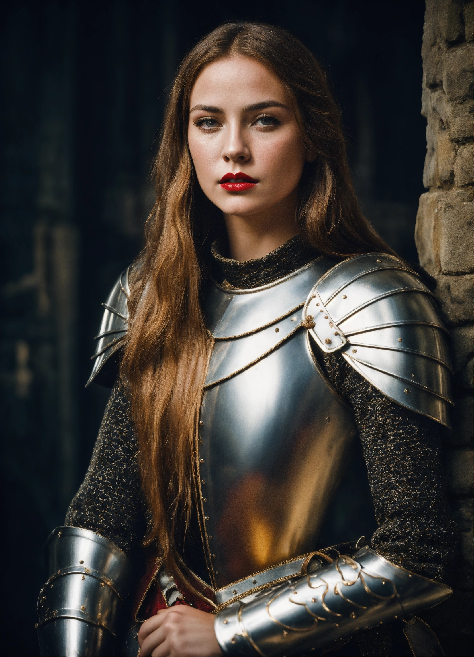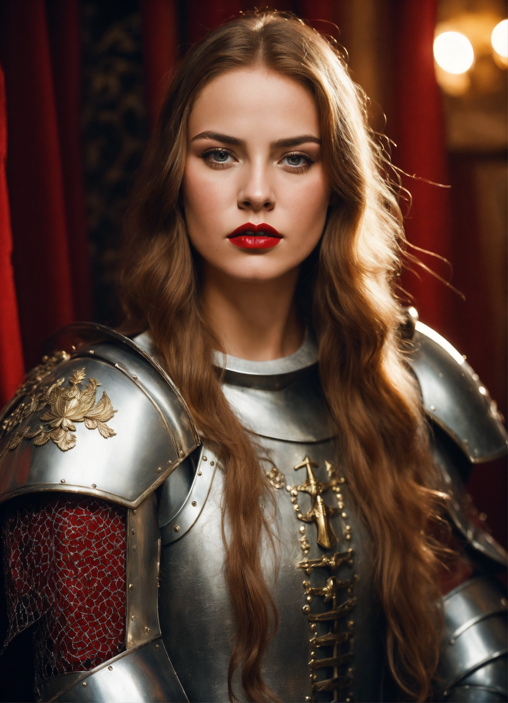 Photo quality portrait of young beautiful bond girl as a mediaeval knight in shining armor with flowing hair, red lips and a stern expression