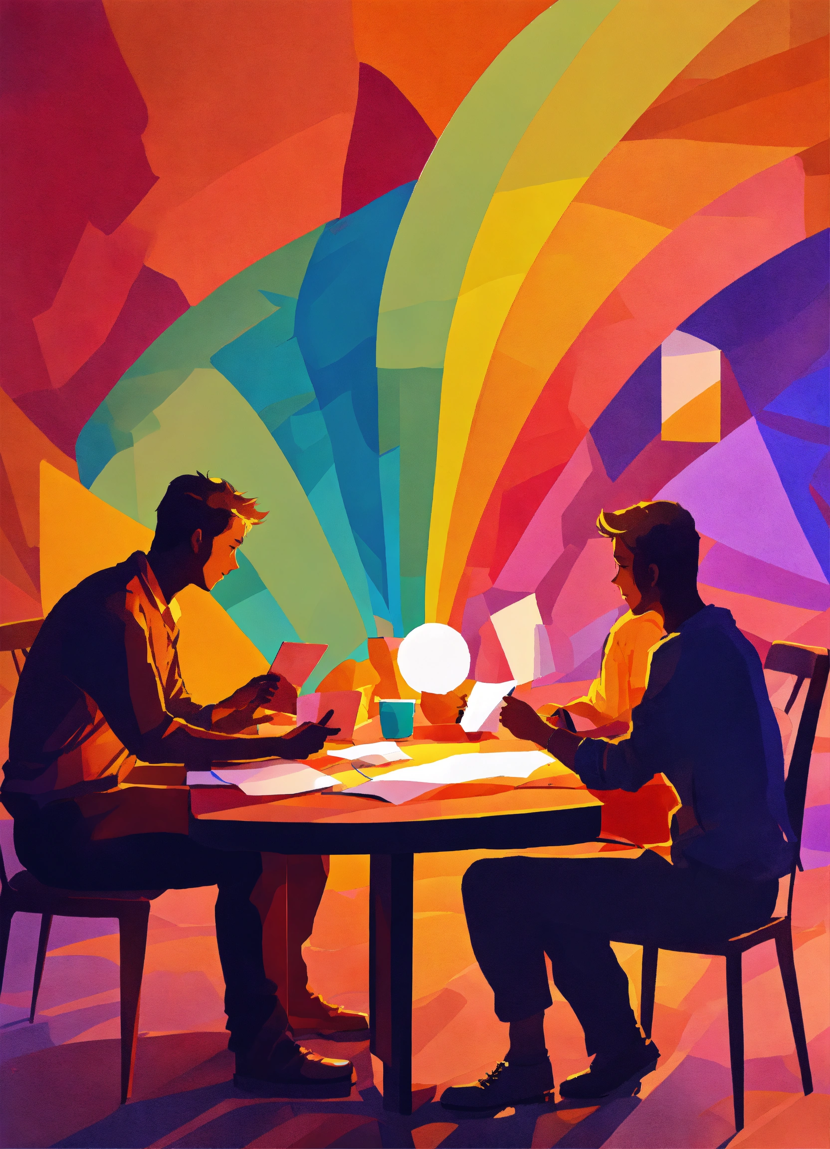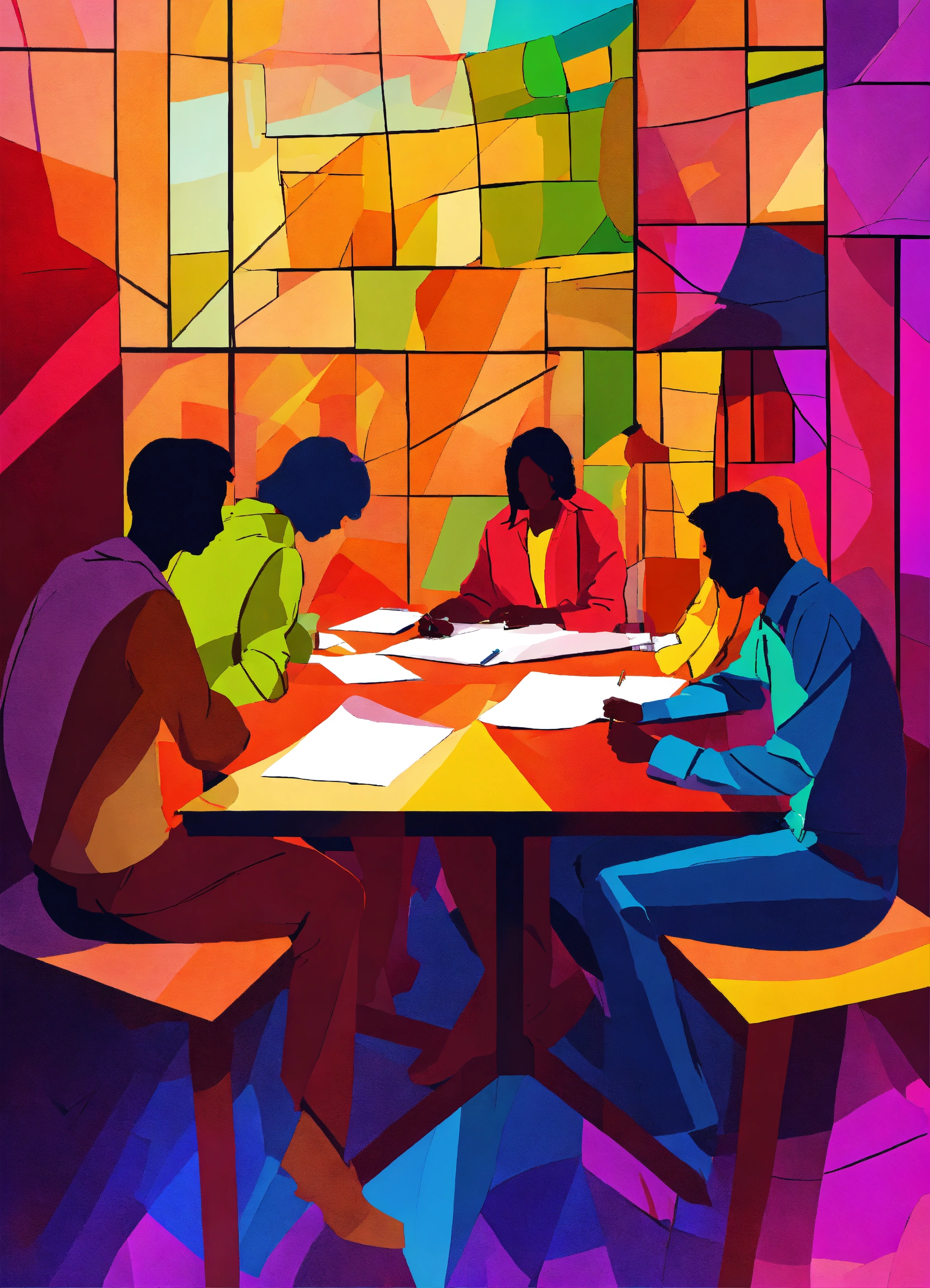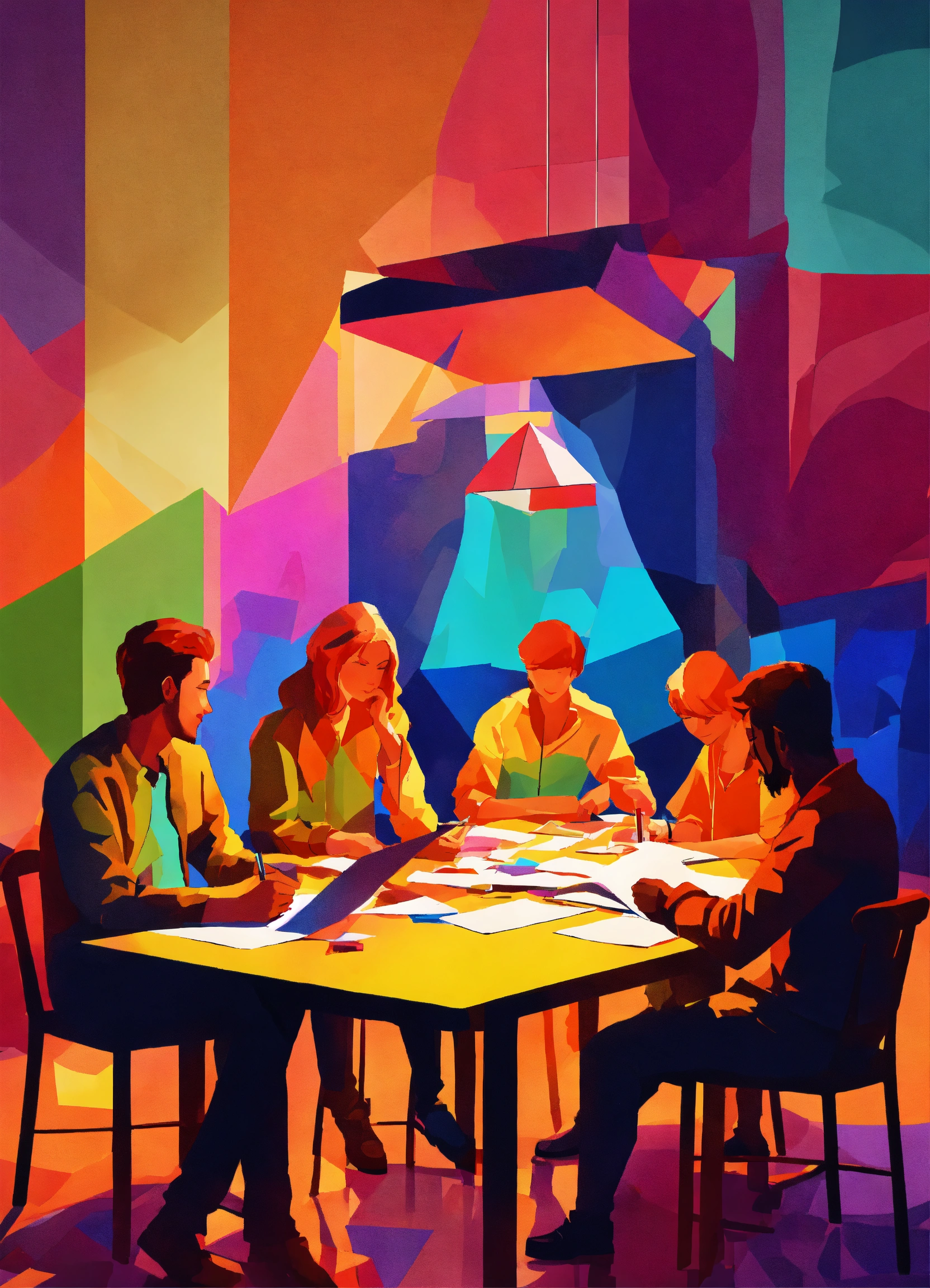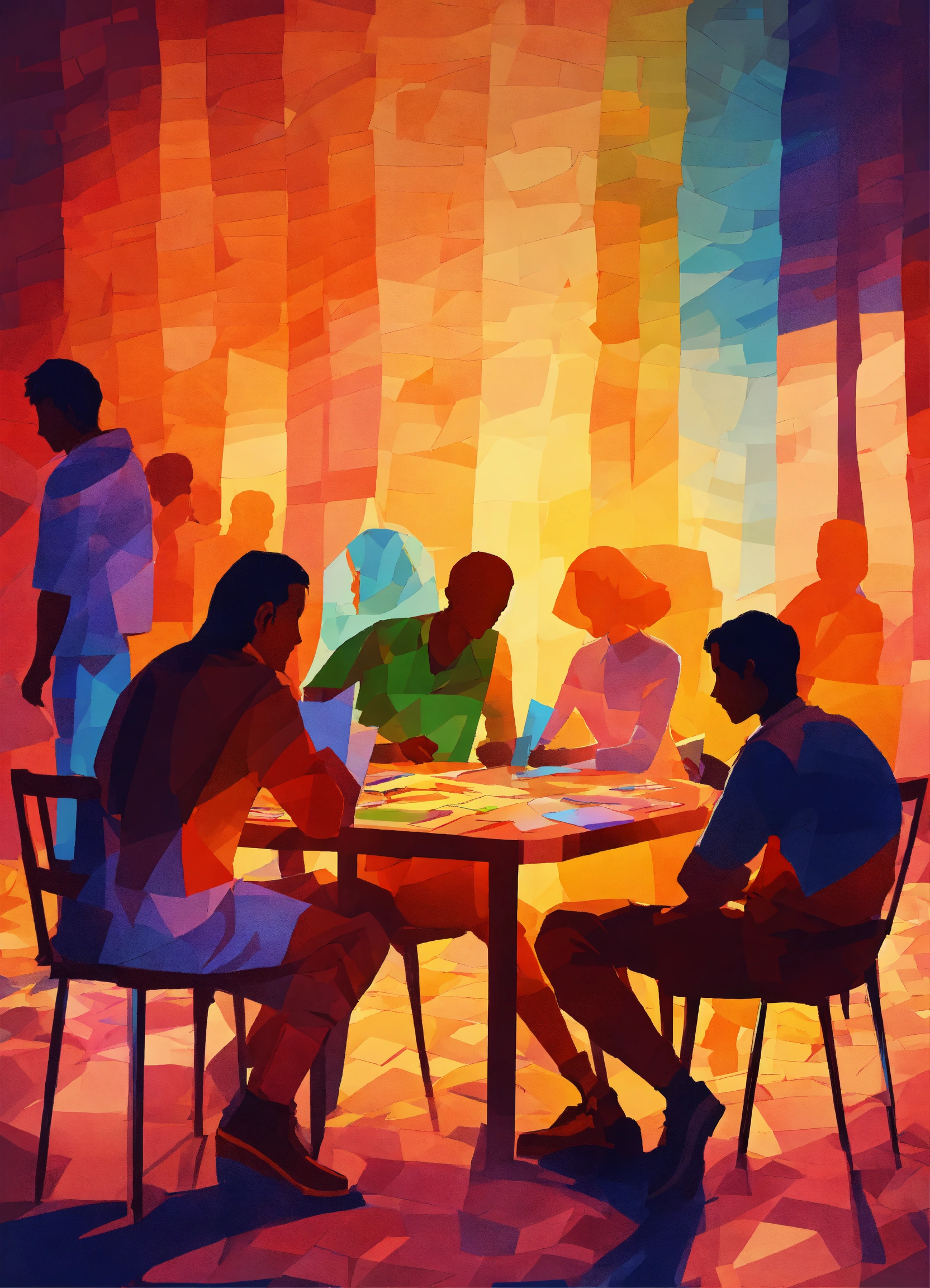 A group of friends, sitting at a table, socializing, completing a fun quiz with paper sheets at hand rainbow color, abstract, silhouette, warm ambiance, cubism art style, drawing, artwork, poster art