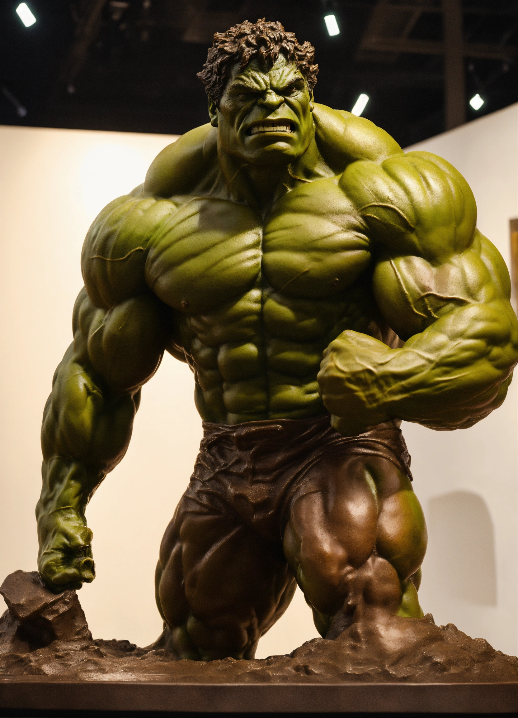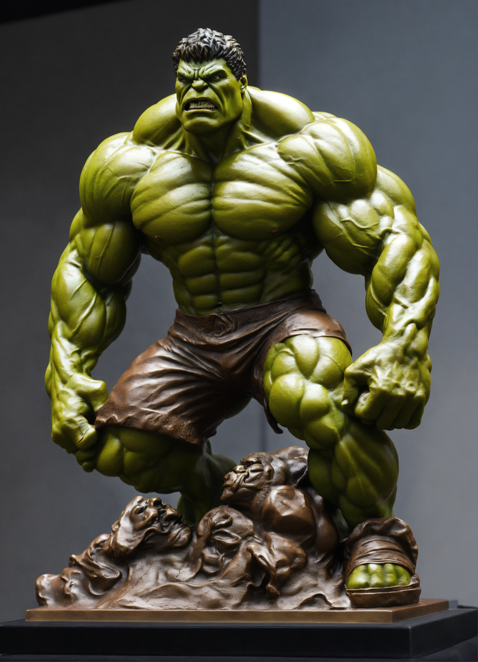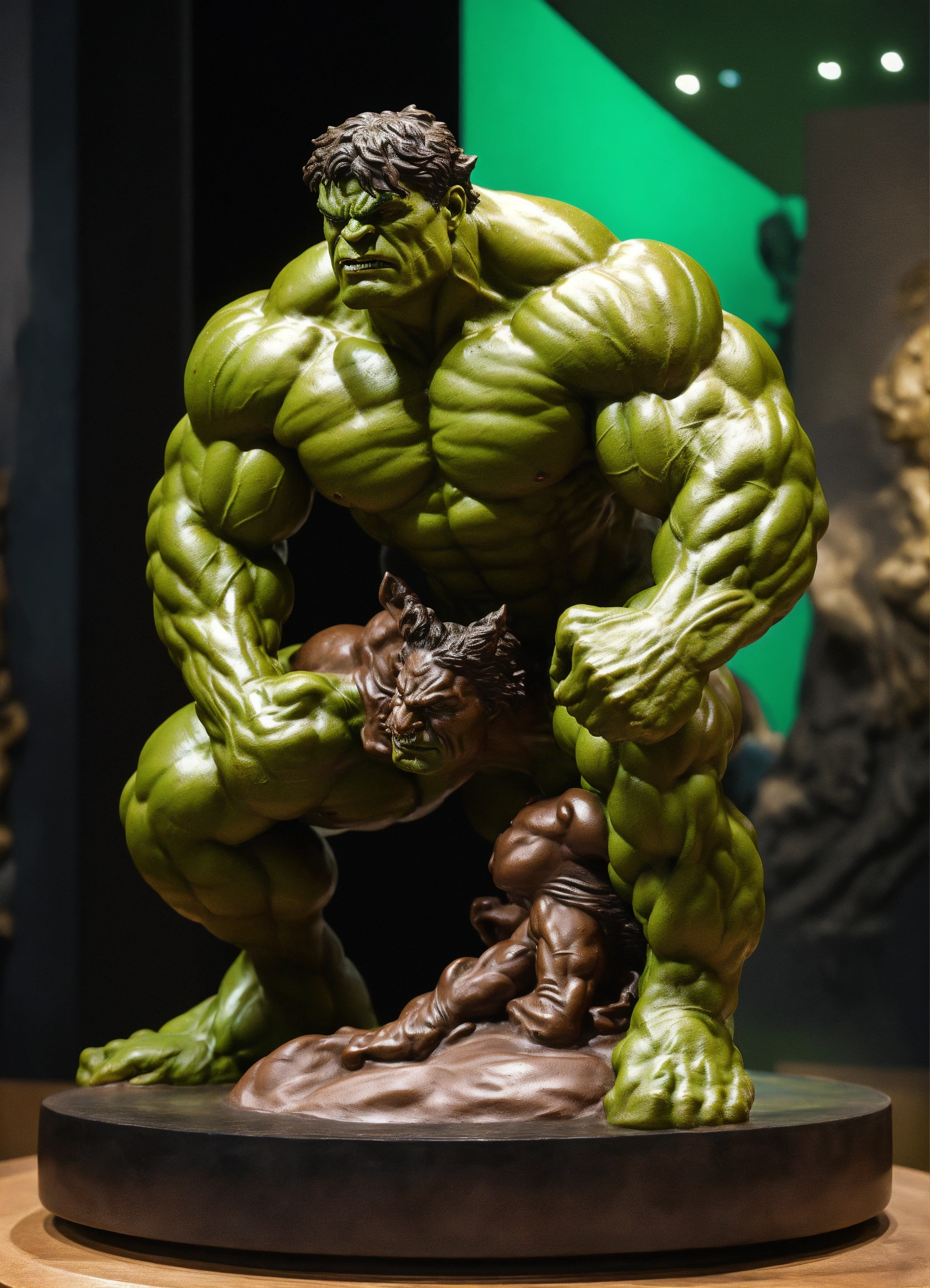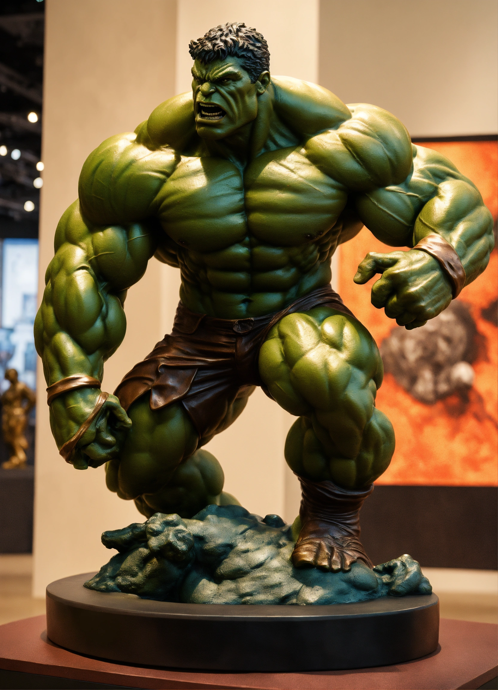 A sculpture of aged bronze resin depicting the muscular hulk holding an alien by the neck and poised to attack, on top of a base, with the background of the image resembling an exhibition museum, ultra-realistic photorealistic, ultra-definition 32k.