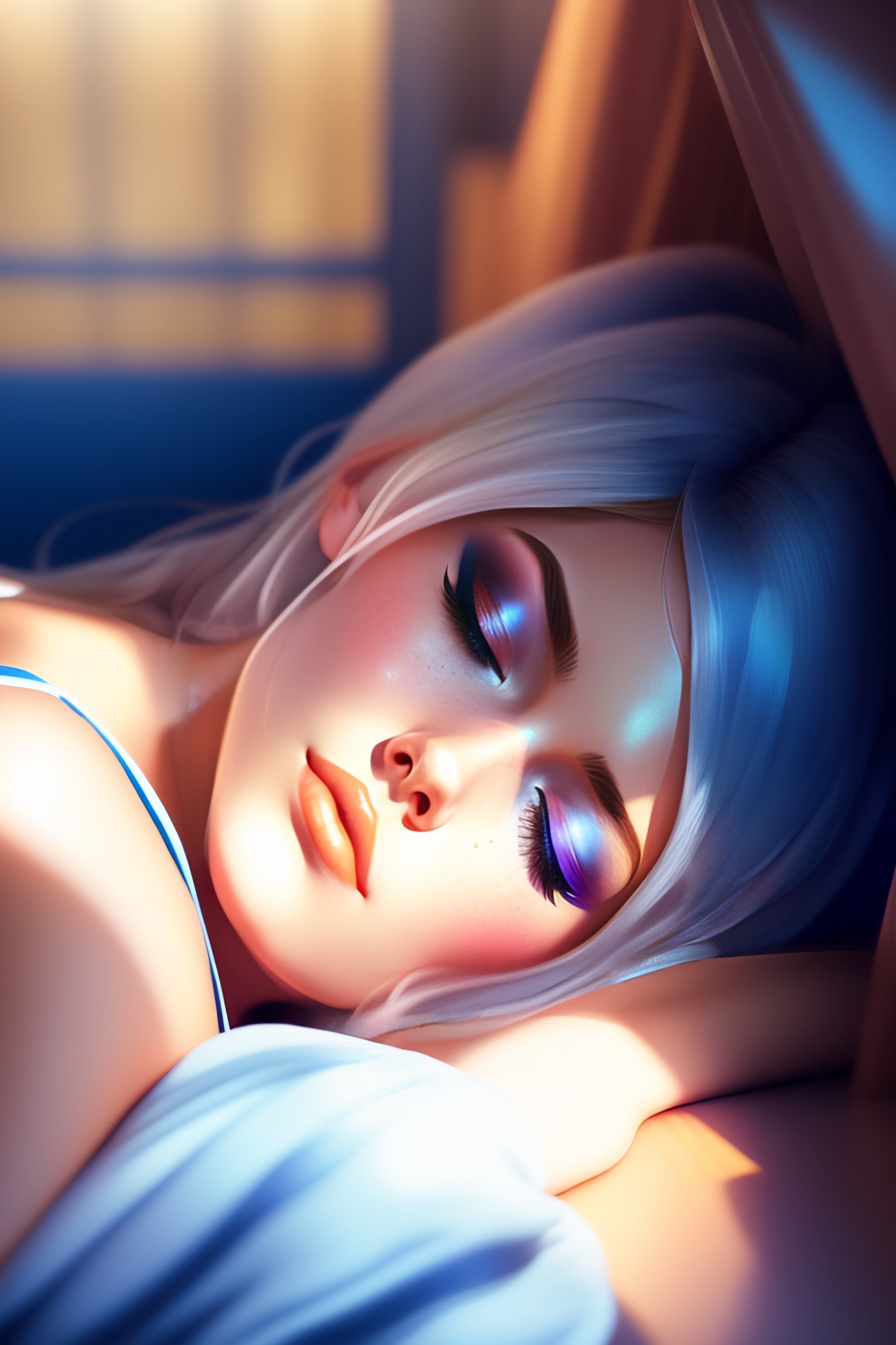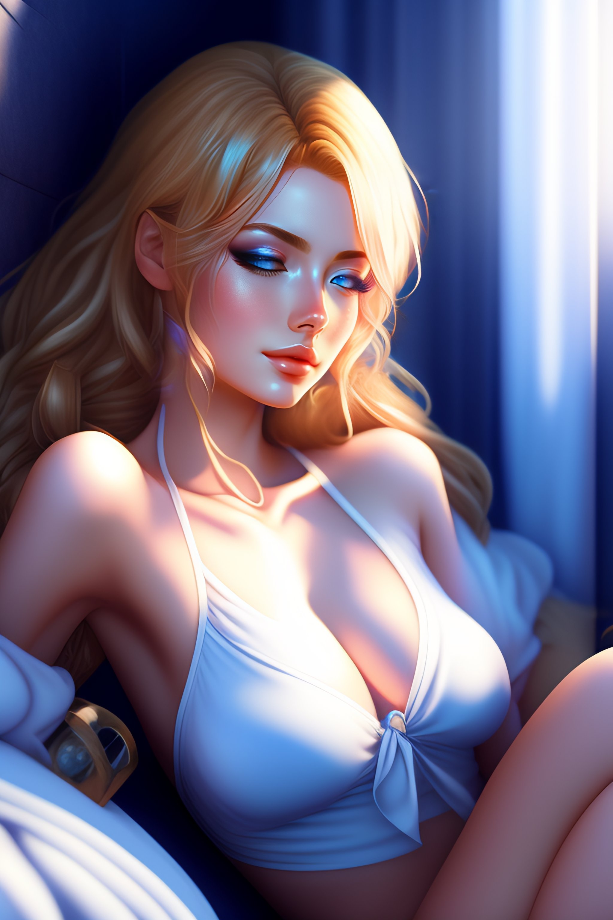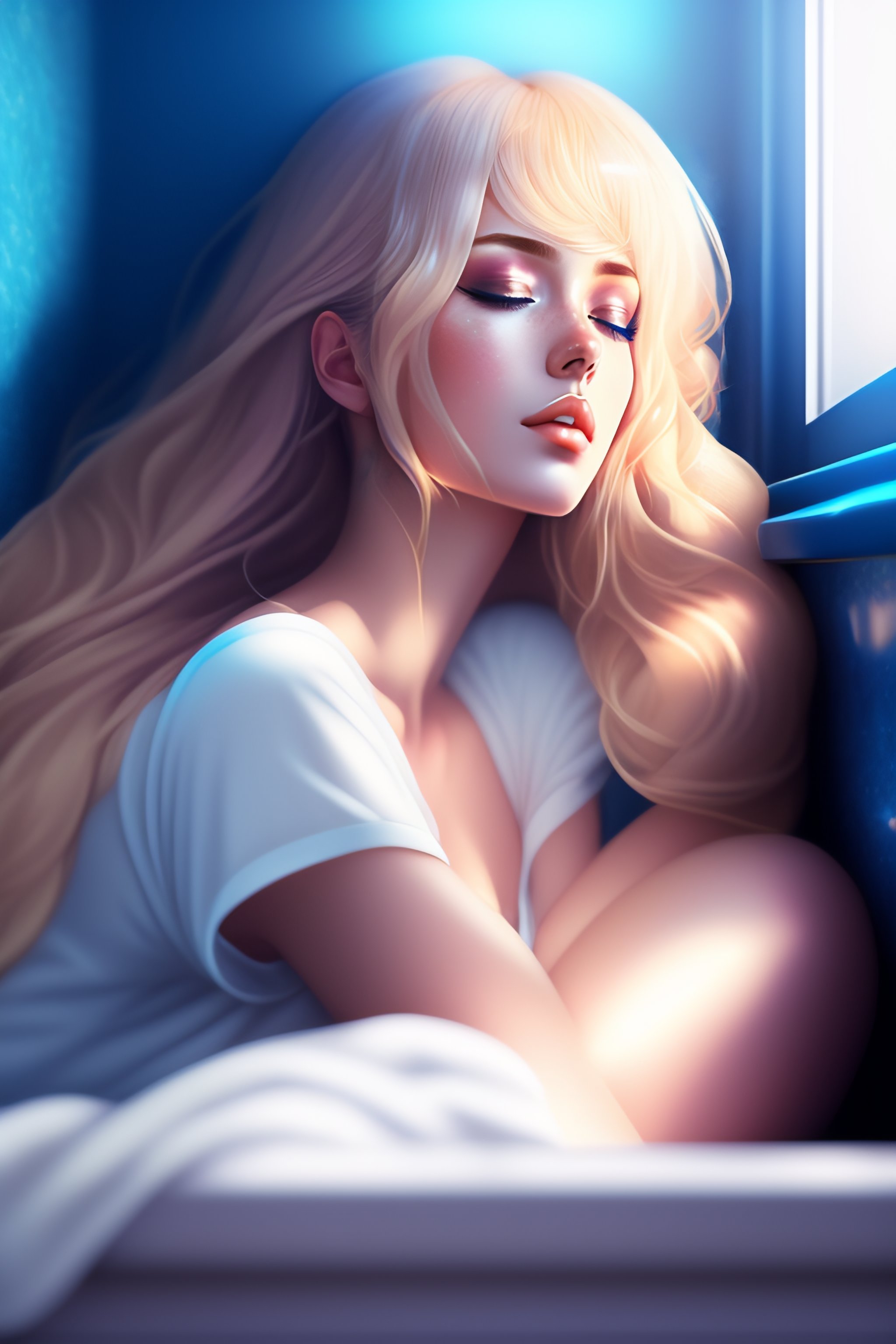 Full body anime style model girl sleeping inside bathroom on the bed, blonde, blue eyes realistic detailes, 2d illustration, glamour, fashion style, 8k
