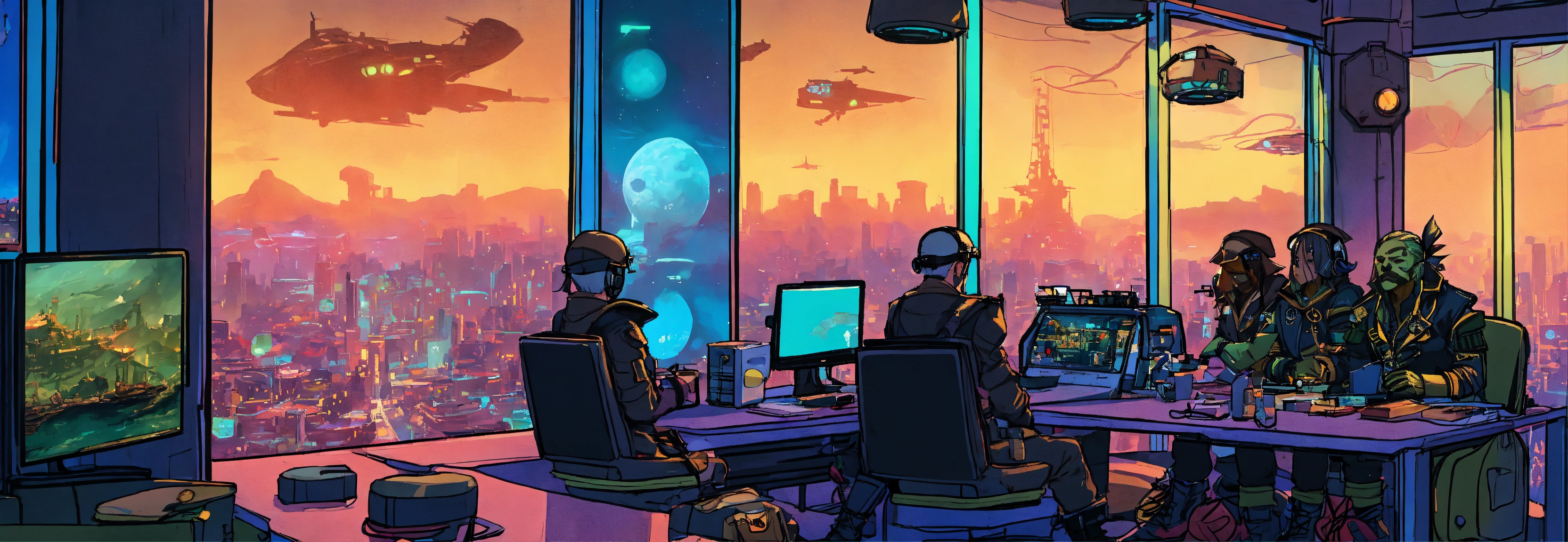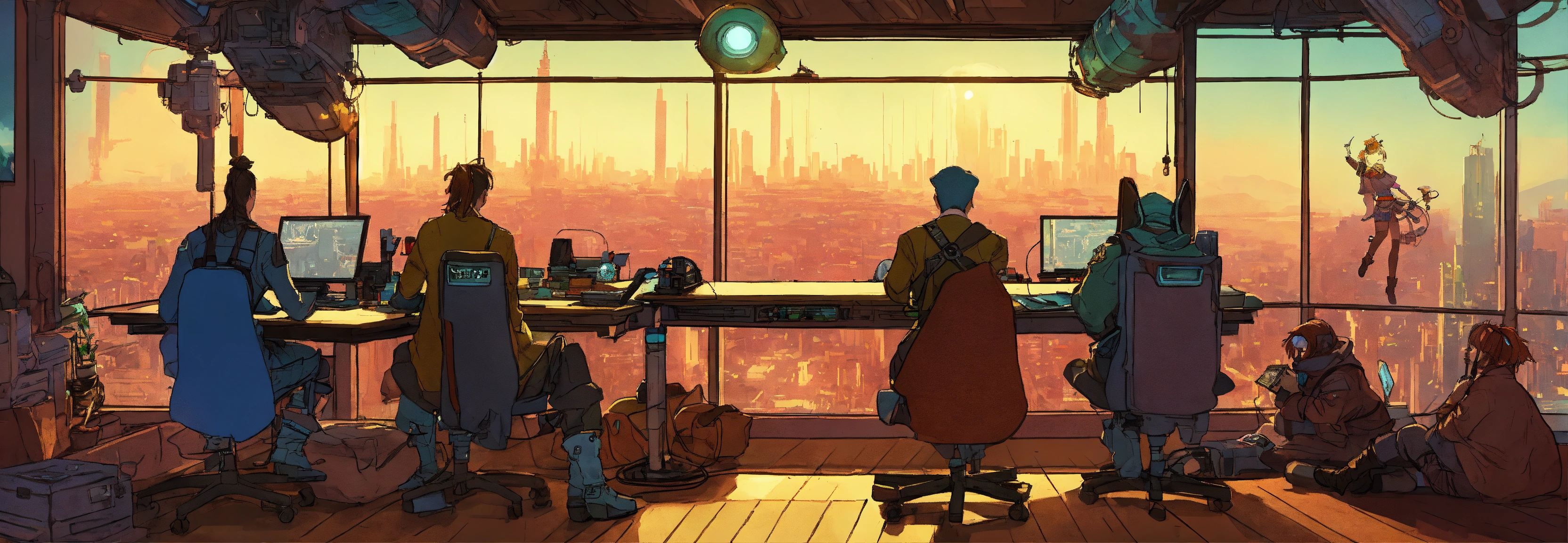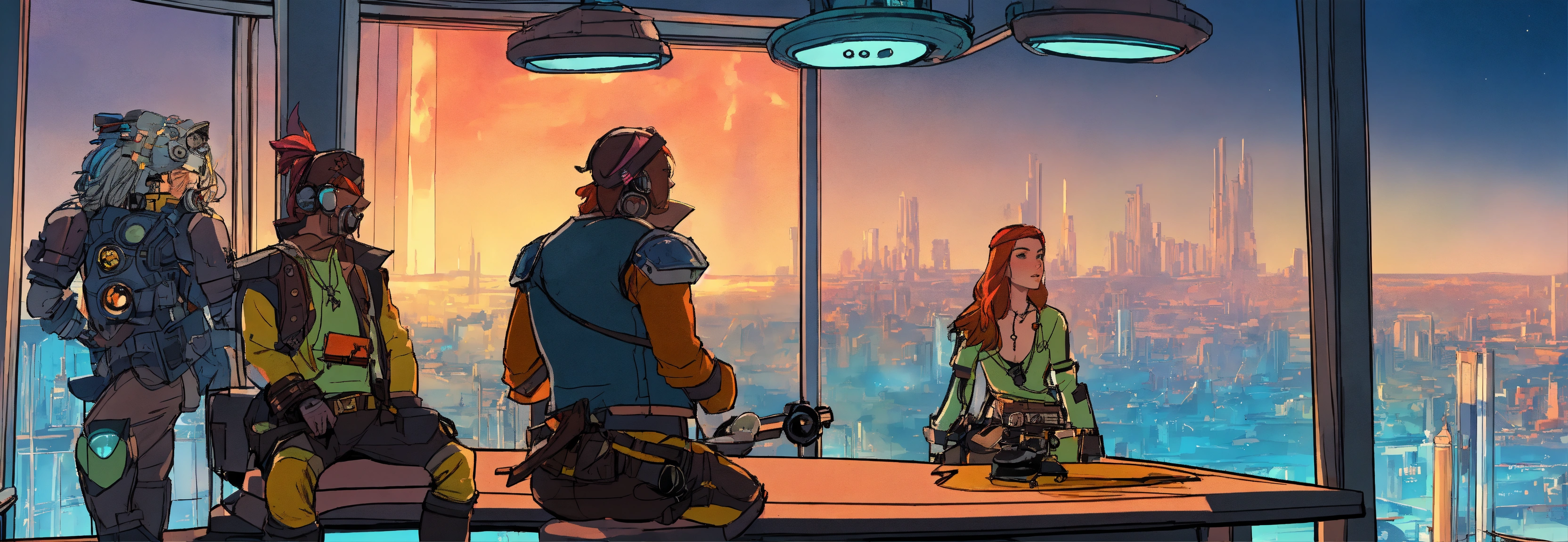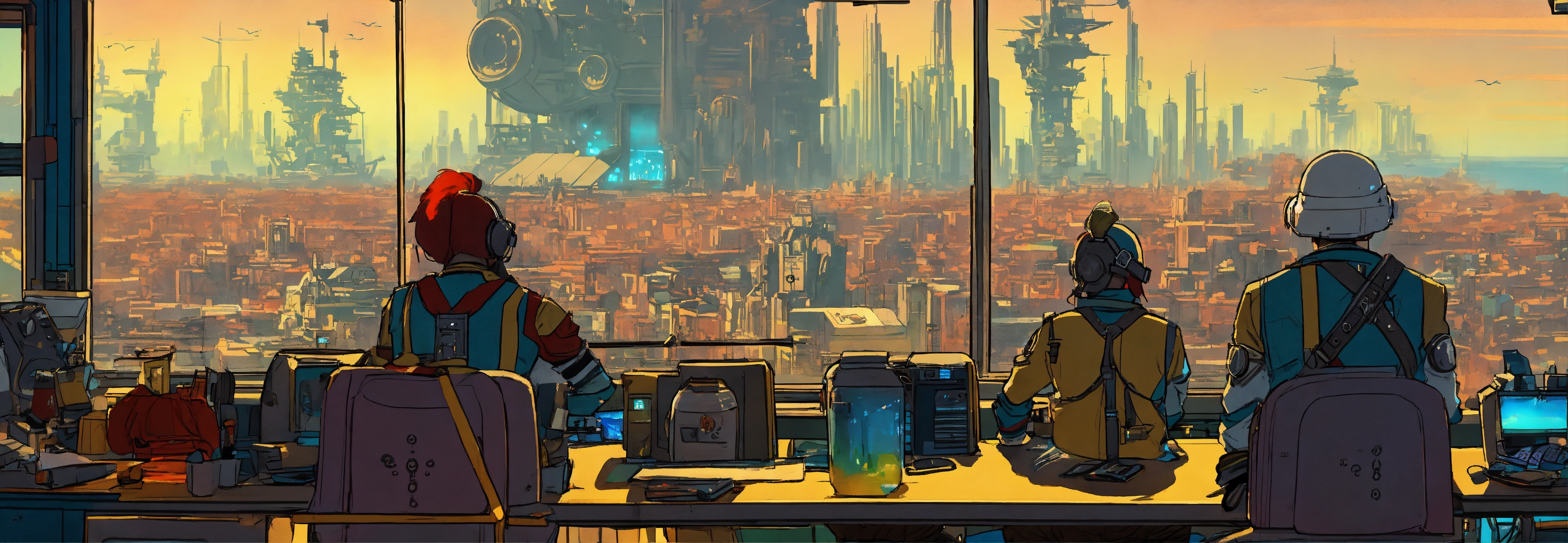 Futurepunk crew of pirates sitting on the desk and with boots on the table, the view outside of the enormous screen is overlooking a sci-fi megacity, the sci-fi ambiance should be filled with a colorful spectrum that creates an otherworldly feeling, the art style should be inspired by mattias adolfsson's work