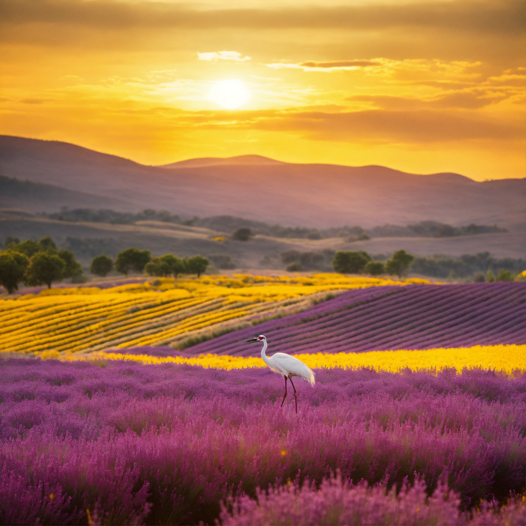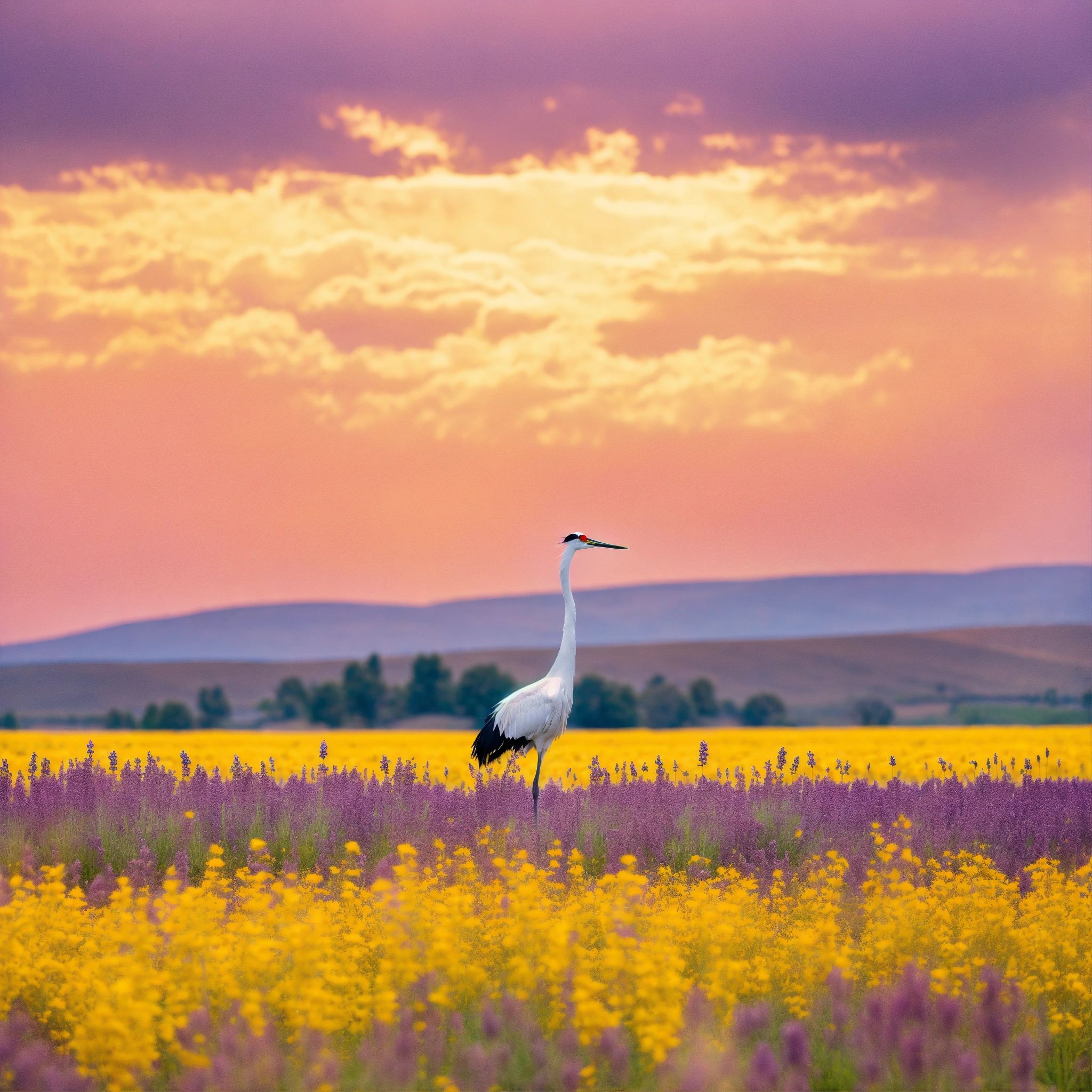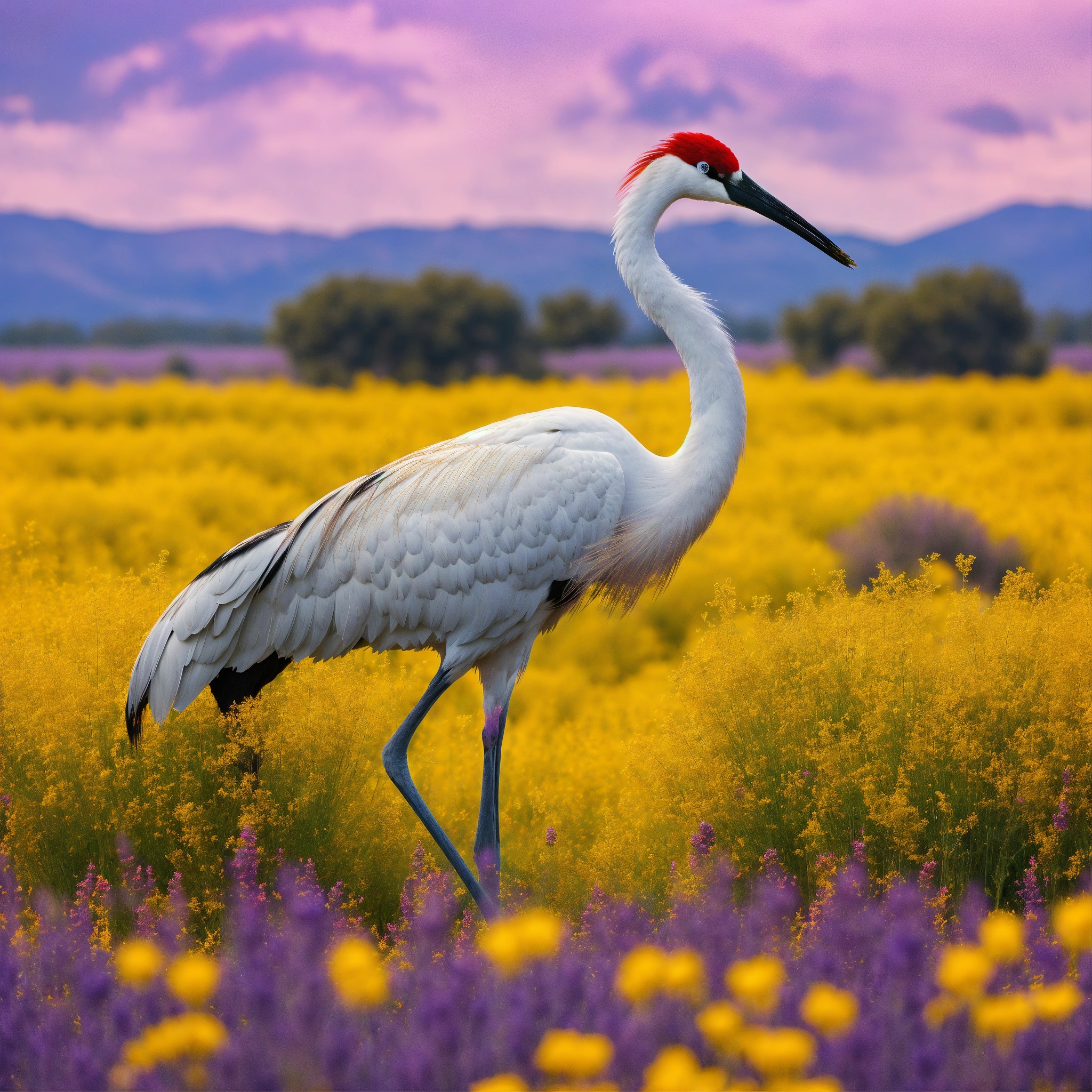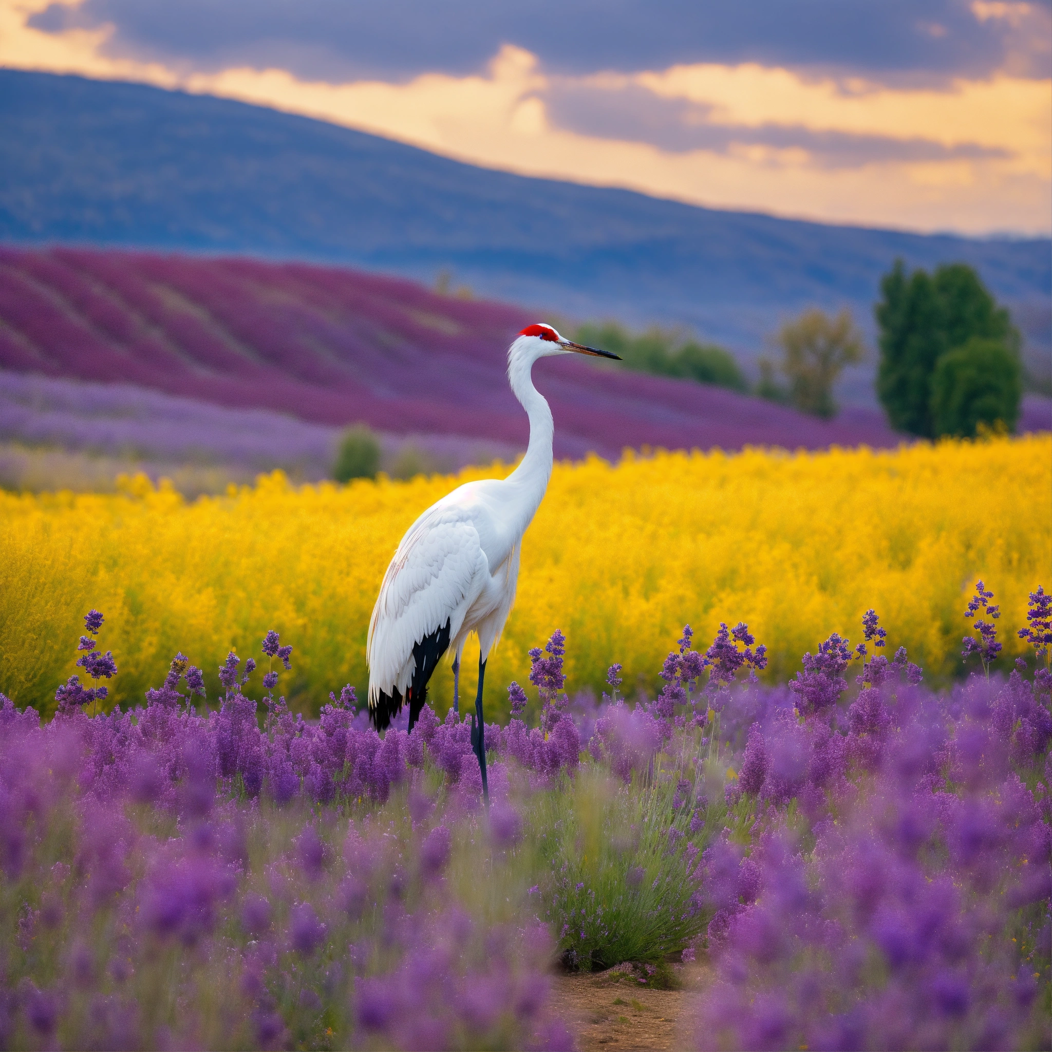 A white noble crane(red head) in the center of vast yellow-lavender field