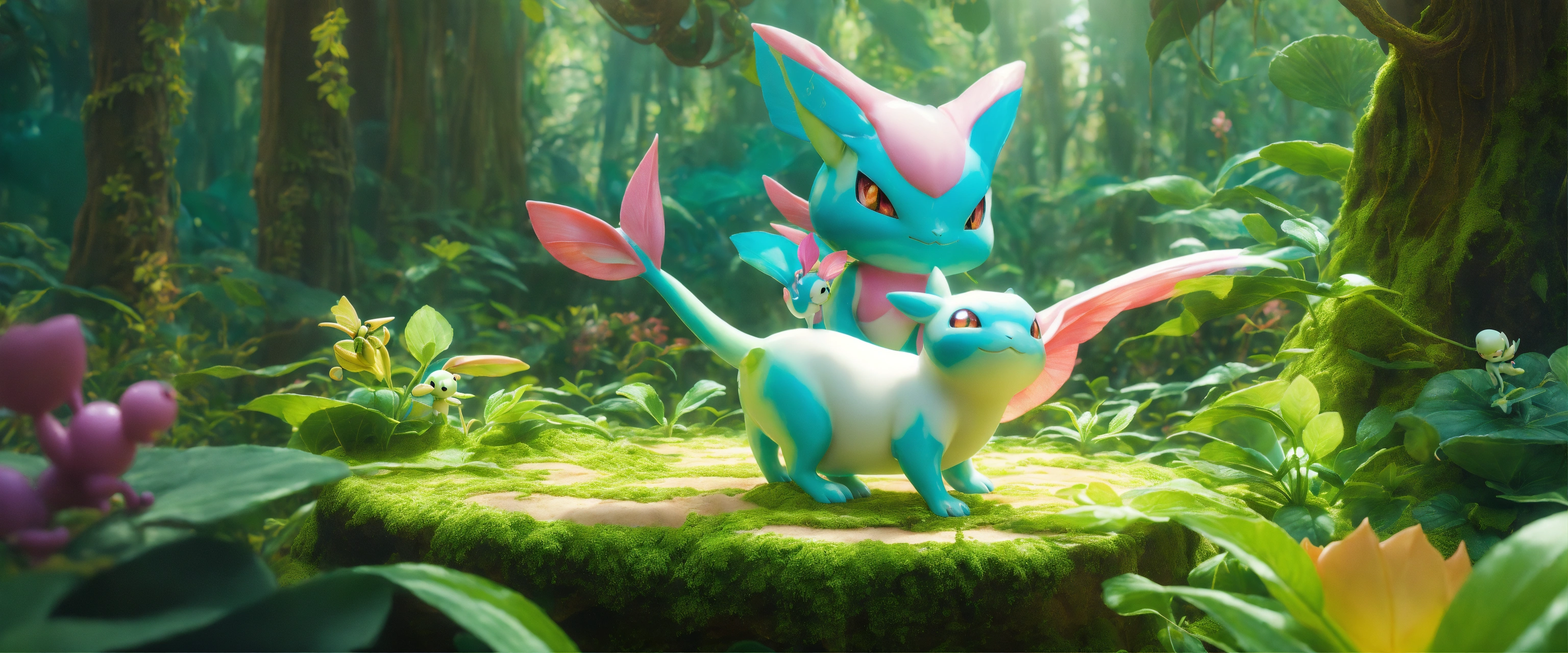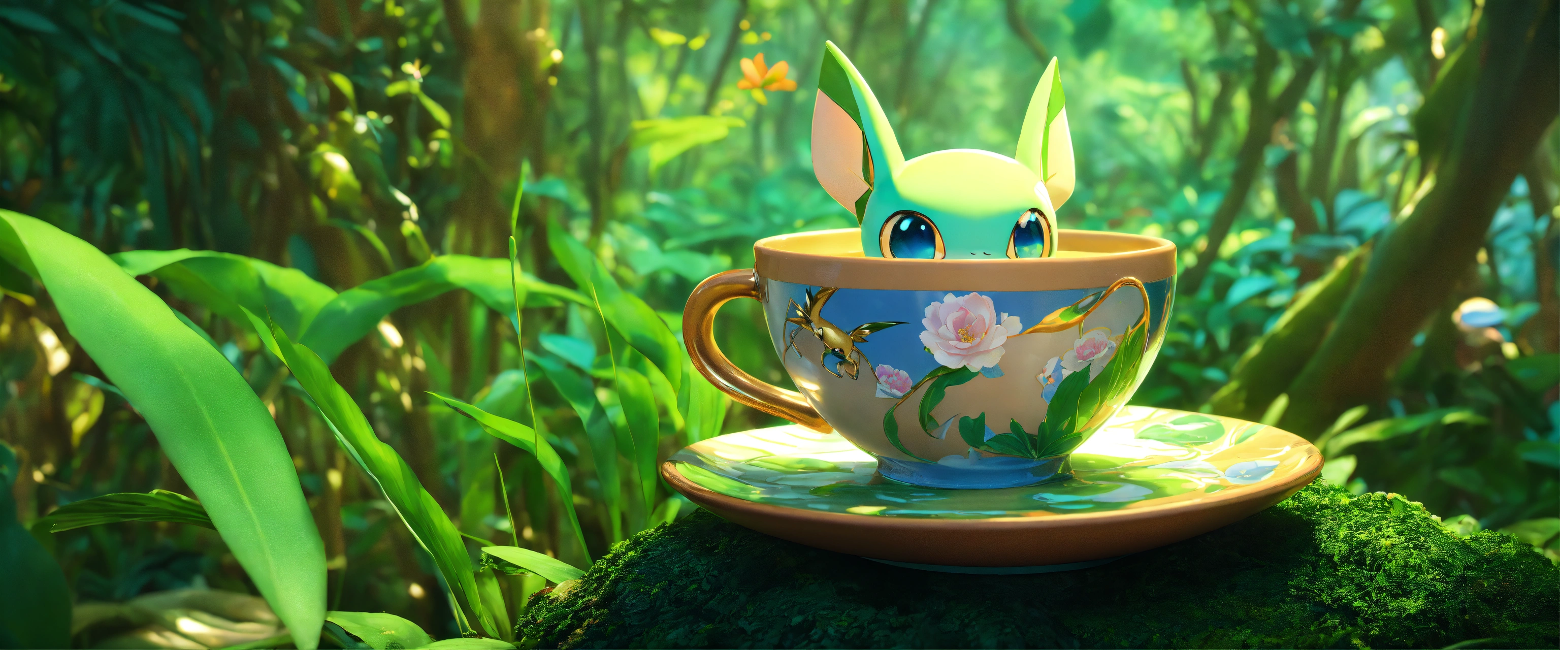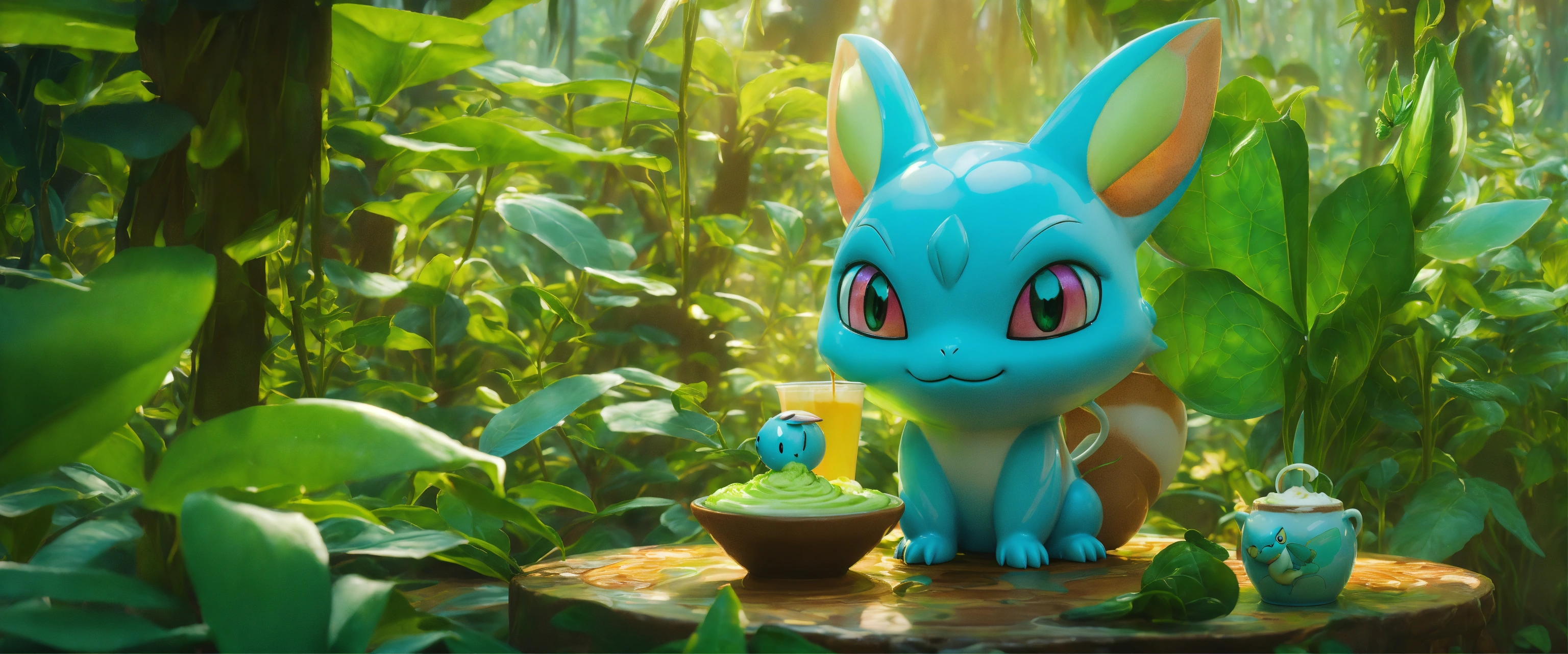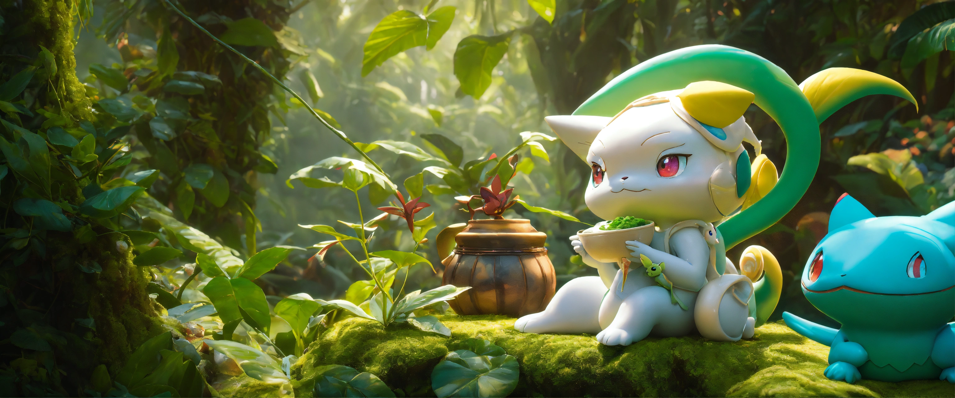 Extremely ultrarealistic photorealistic 3d cute off white ceramic celebi and mew pokemon holding a matcha latte in a vast jungle, by james jean and android jones jeff koons erin hanson joe fenton dan mumford professional photography, natural lighting, volumetric lighting maximalist photoillustration 8k resolution intricately art nouveau detailed, complex, elegant, expansive, fantastical