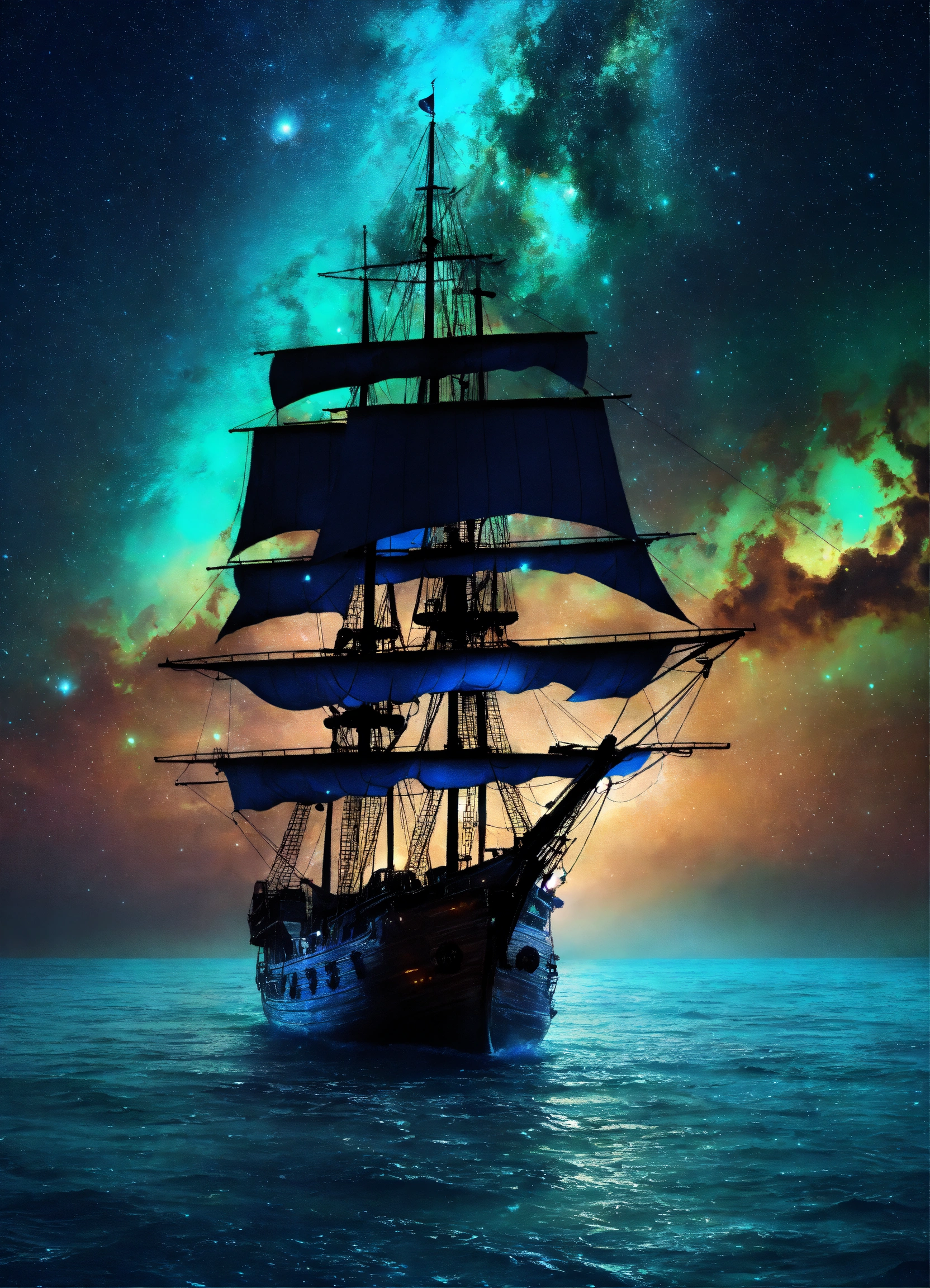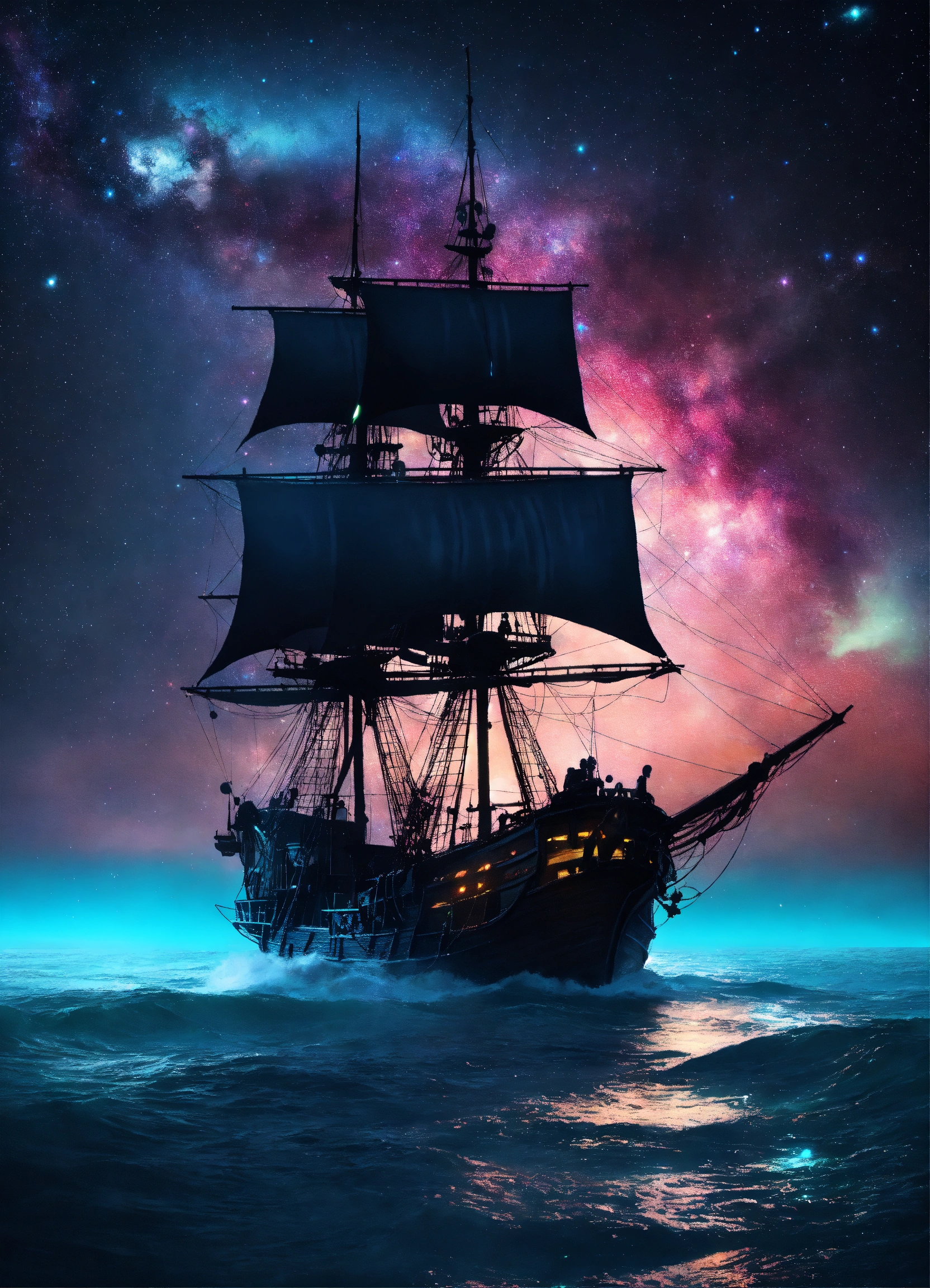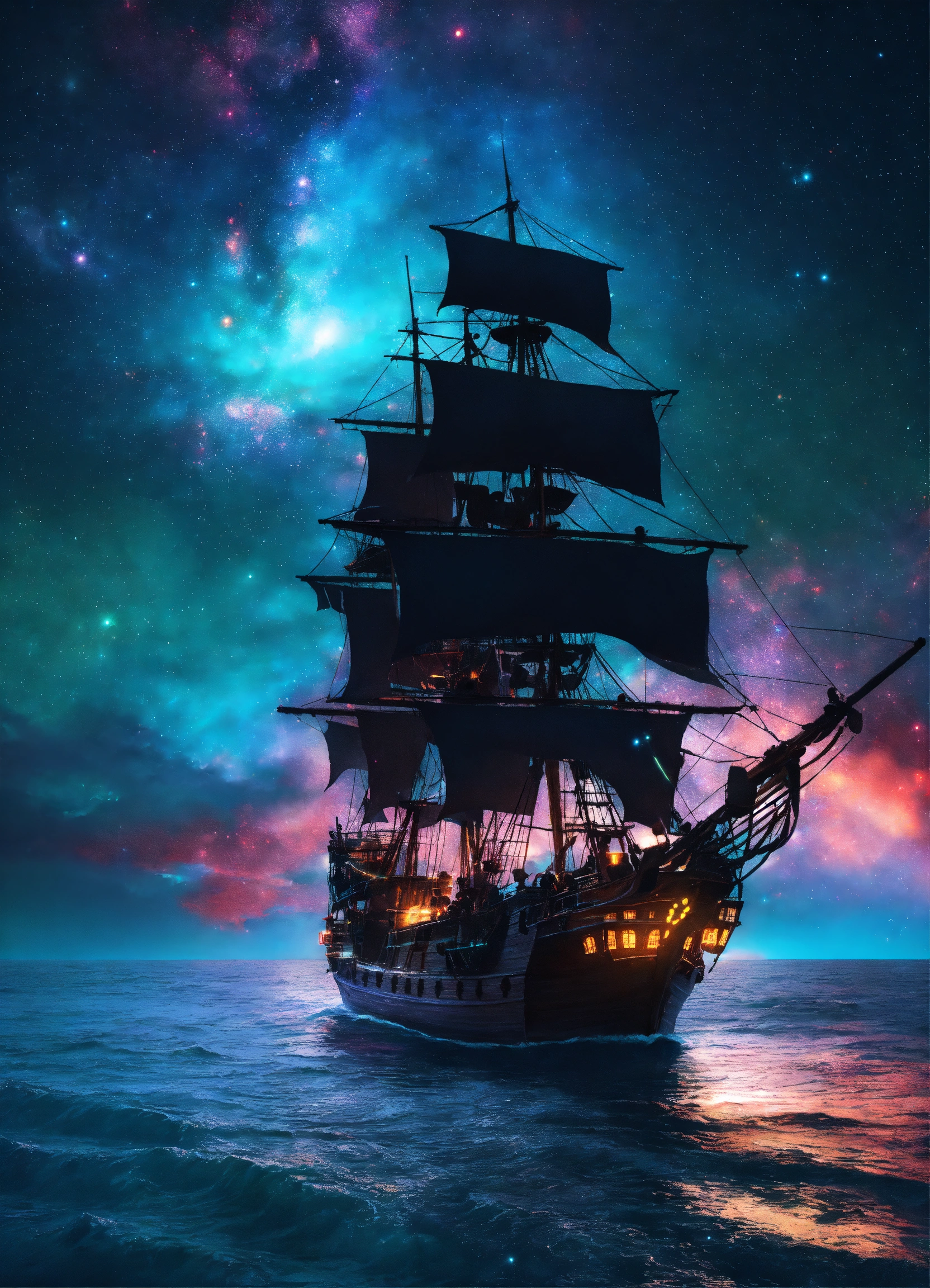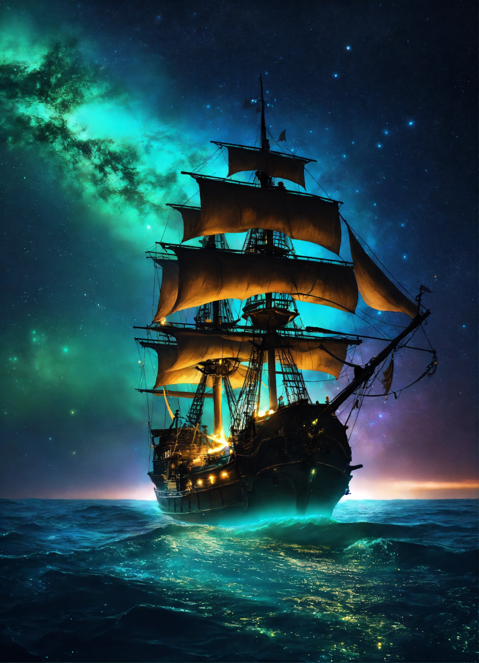 (pirate ship sailing into a bioluminescence sea with a galaxy in the sky)