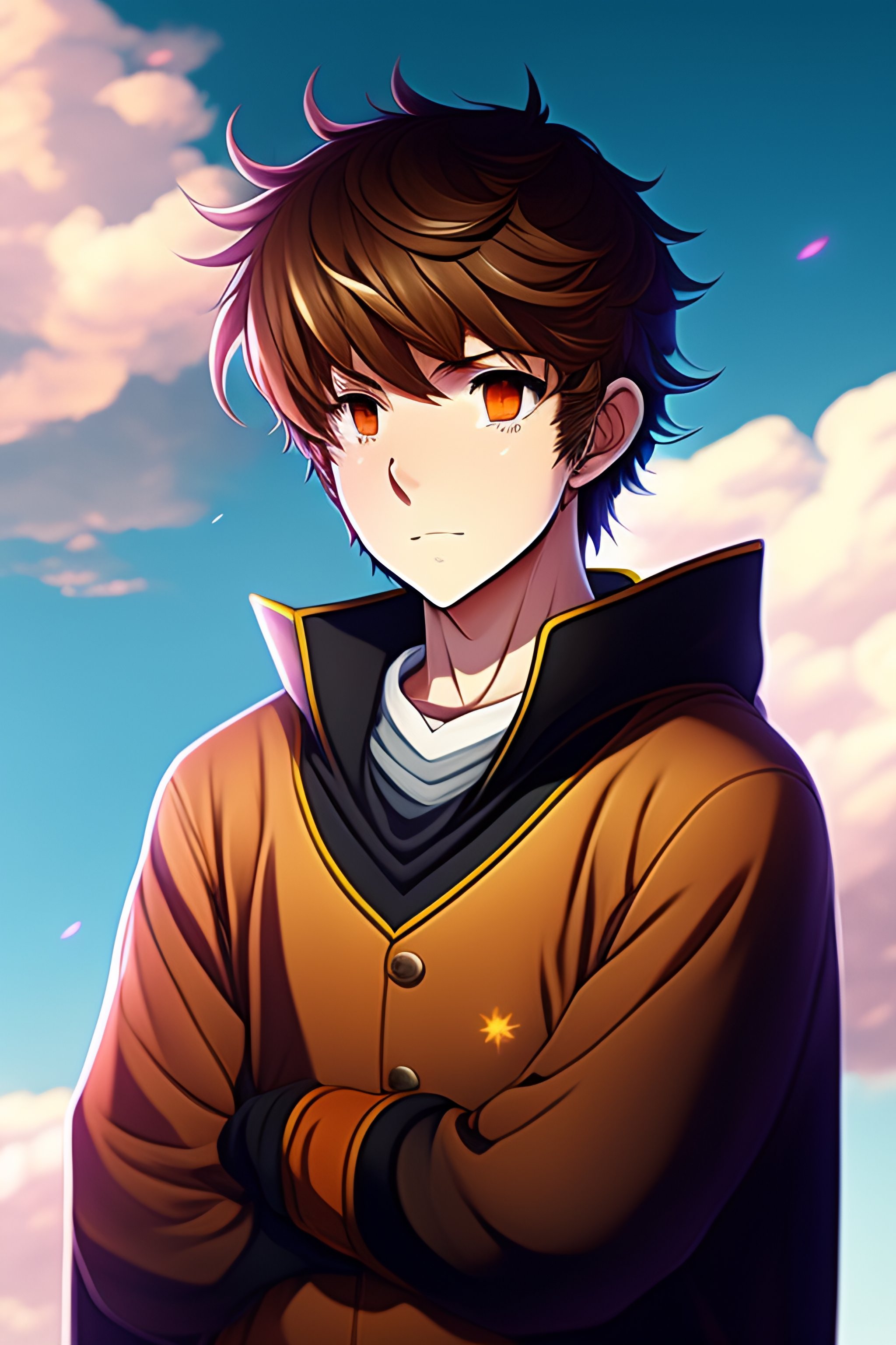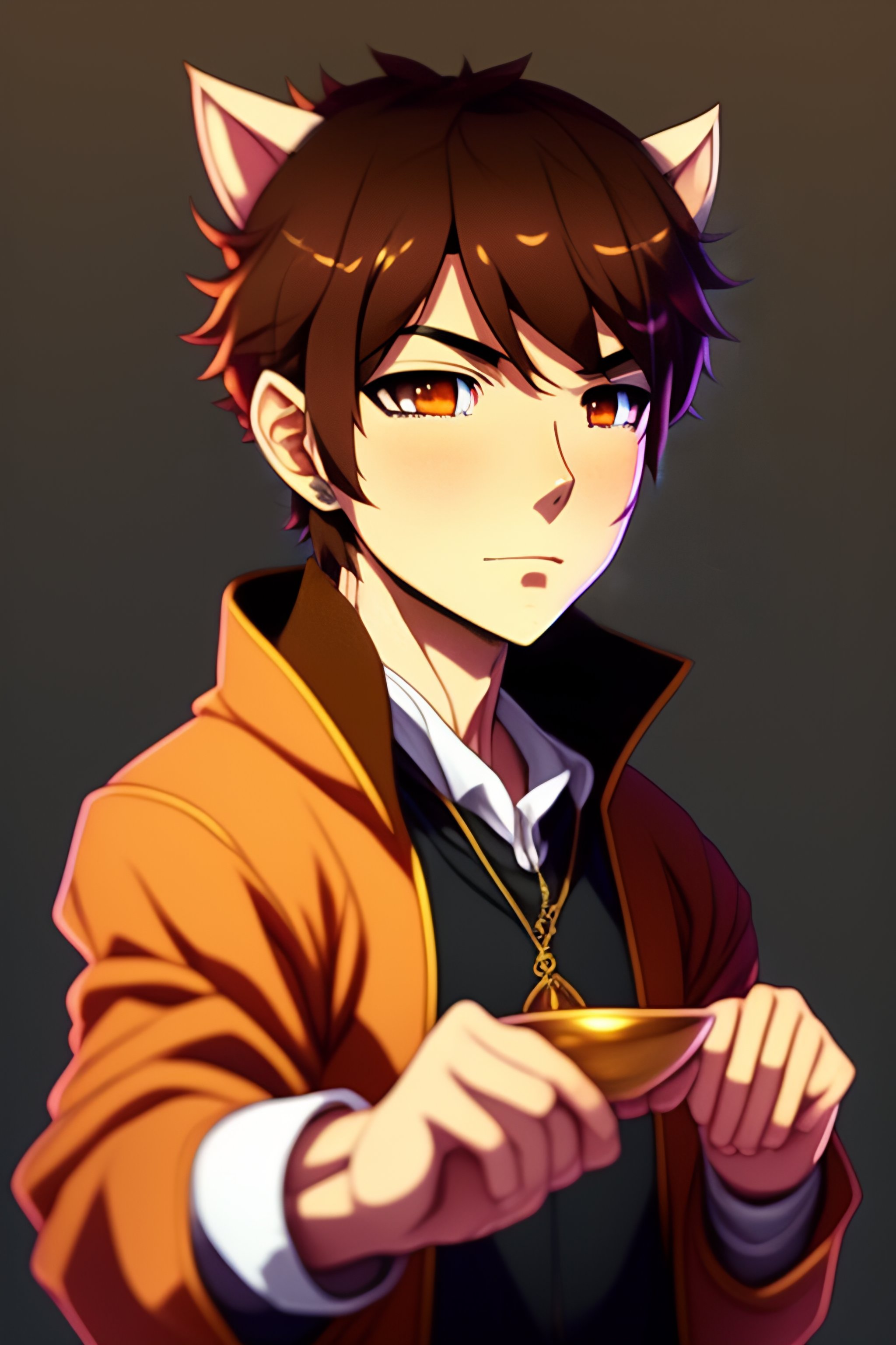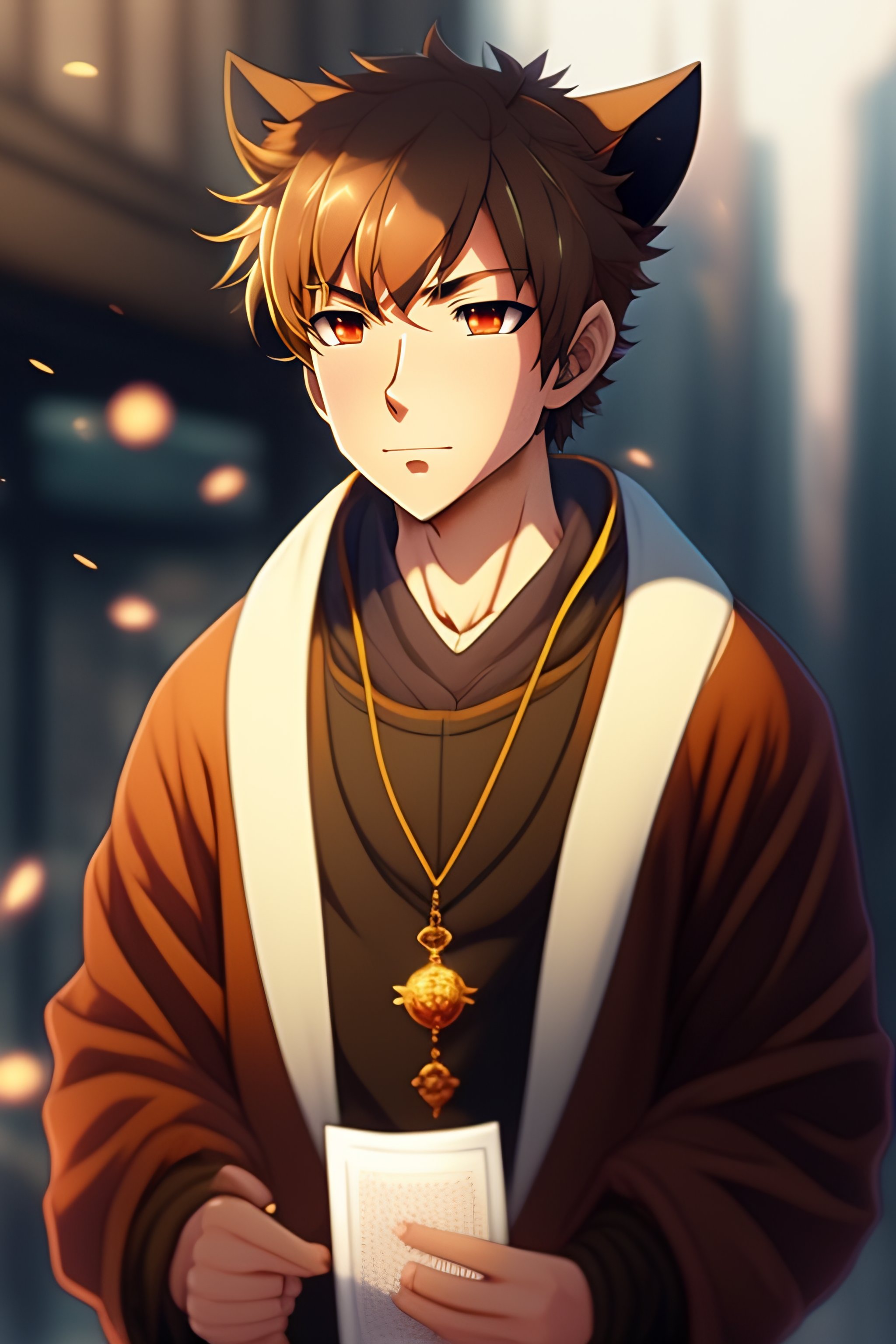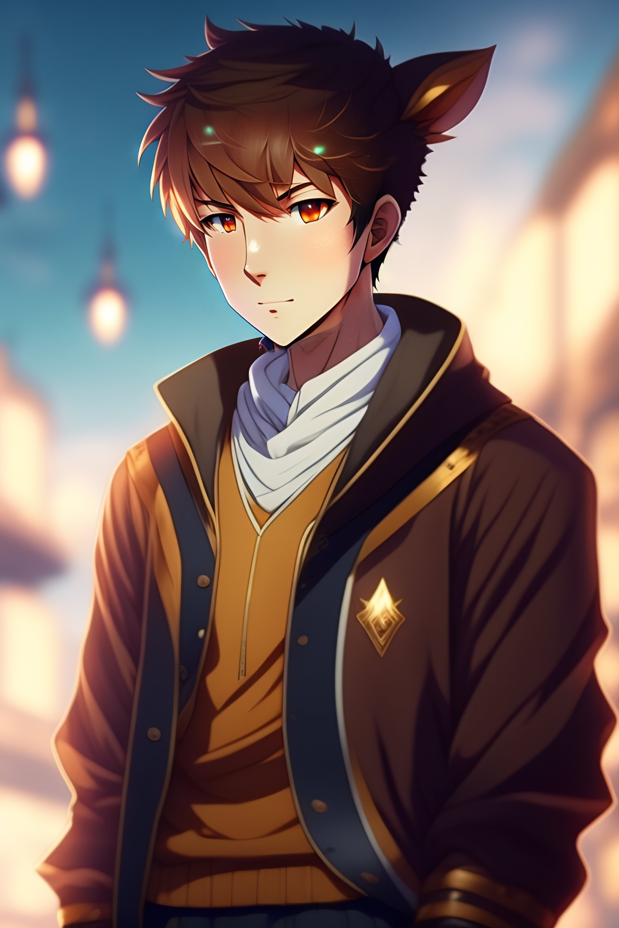 Anime male anime character young male, novice magician, wearing light brown sweatshirt with bear ears