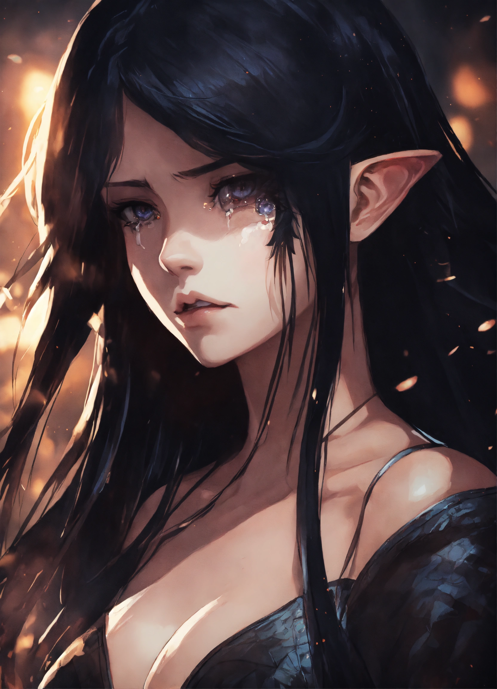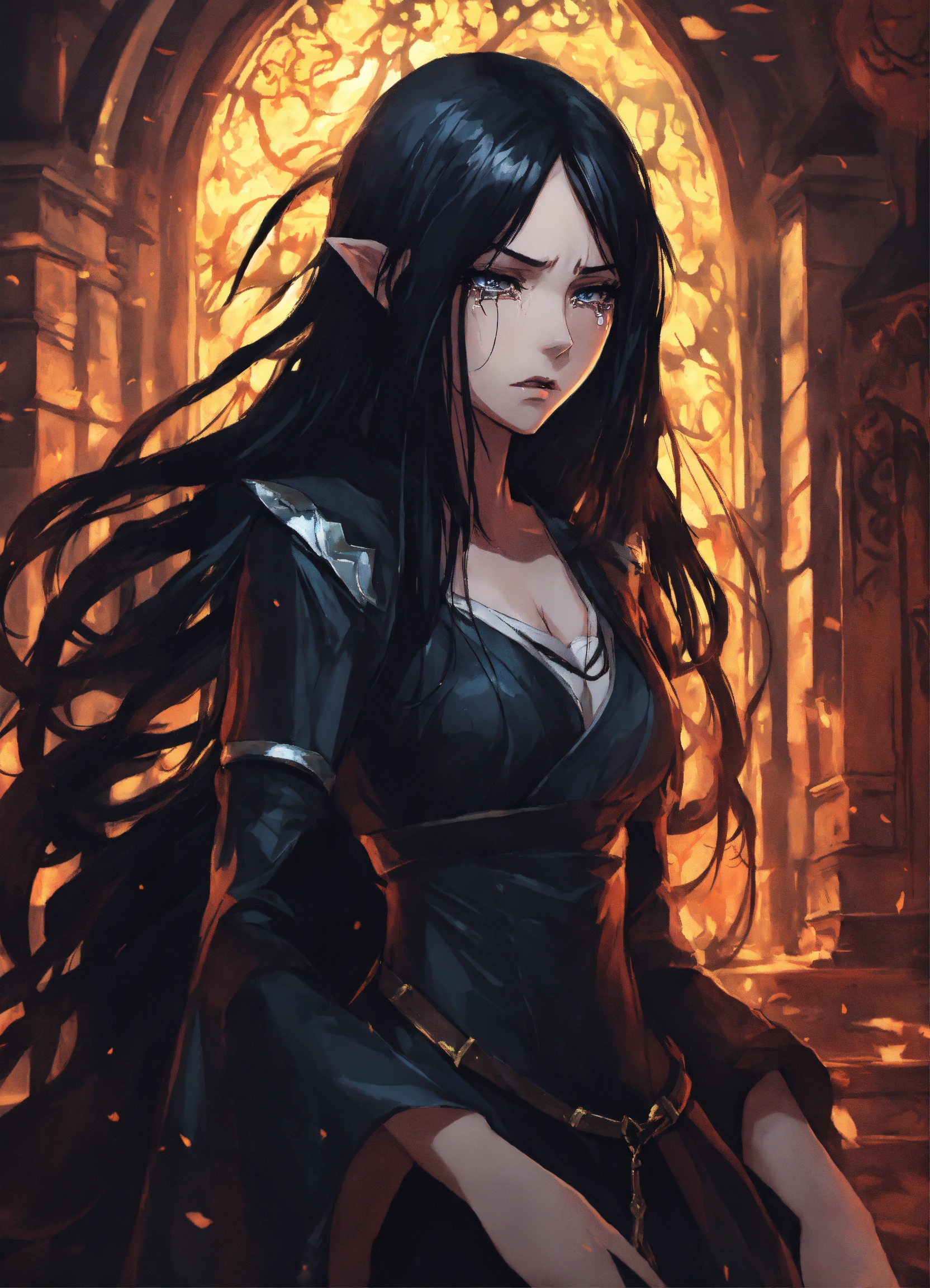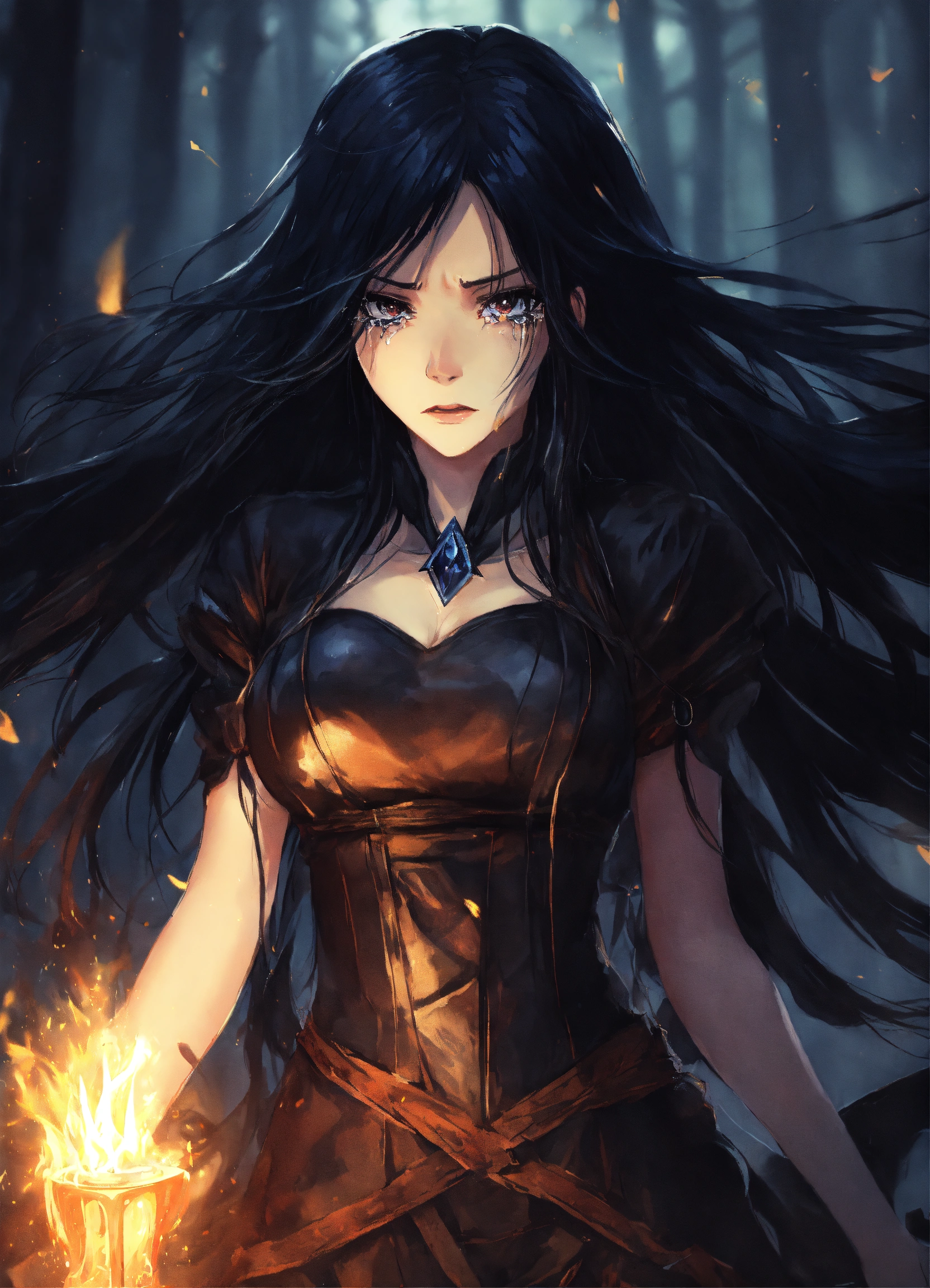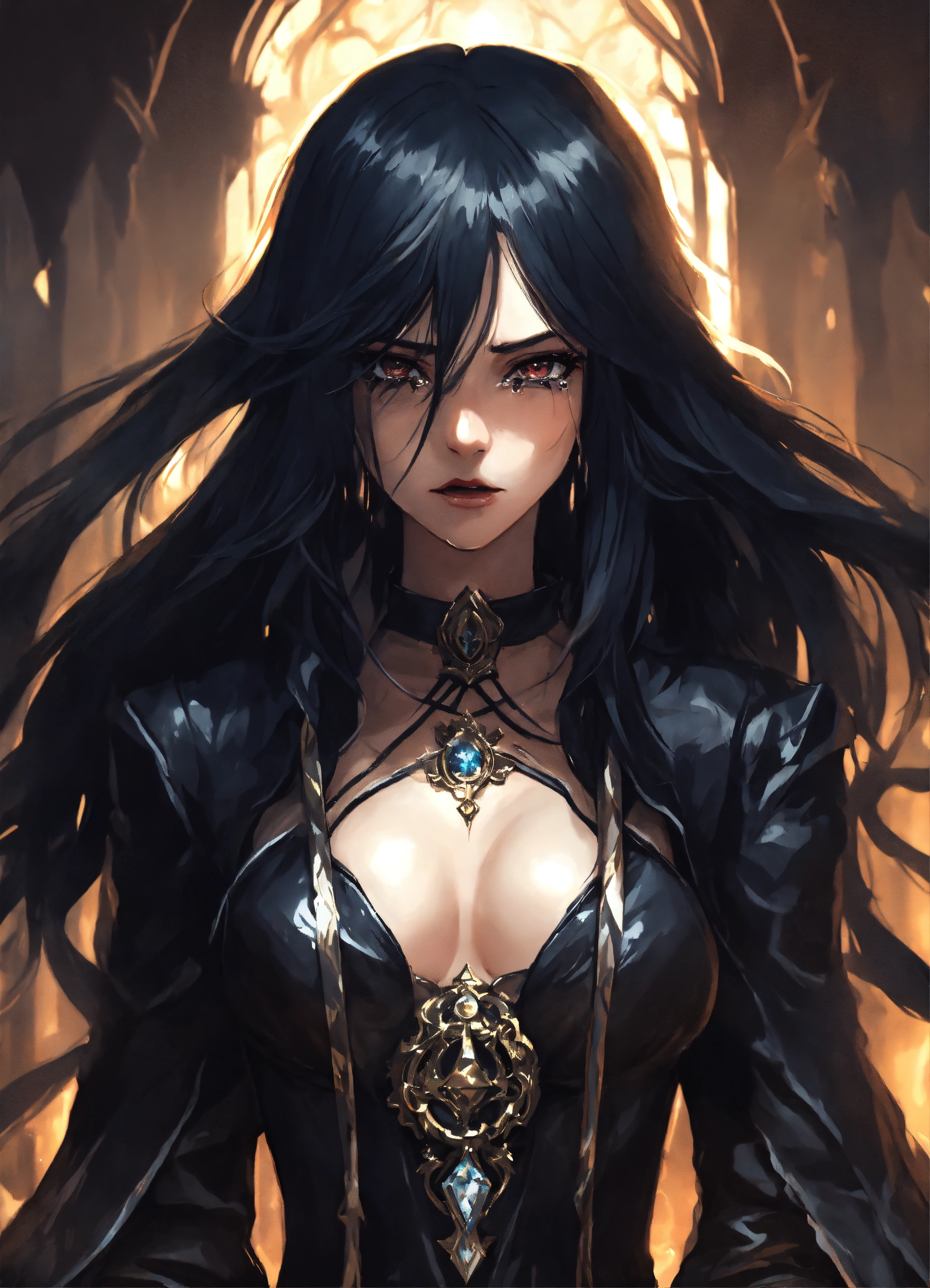 2d epic anime manga style, mysterious sorceress, terrifying scowl, crying leather dress, long black hair, white pale skin, in the shadows