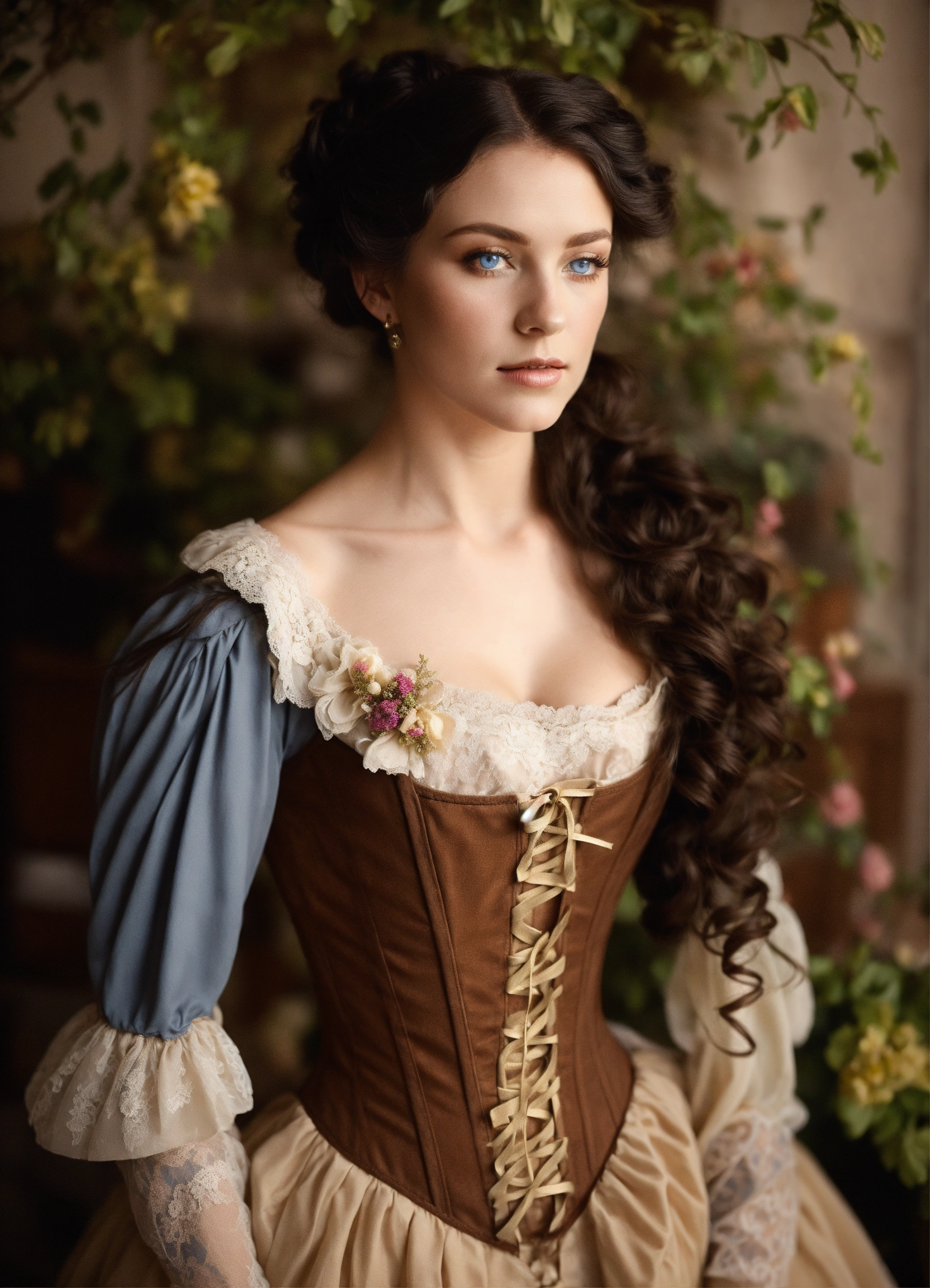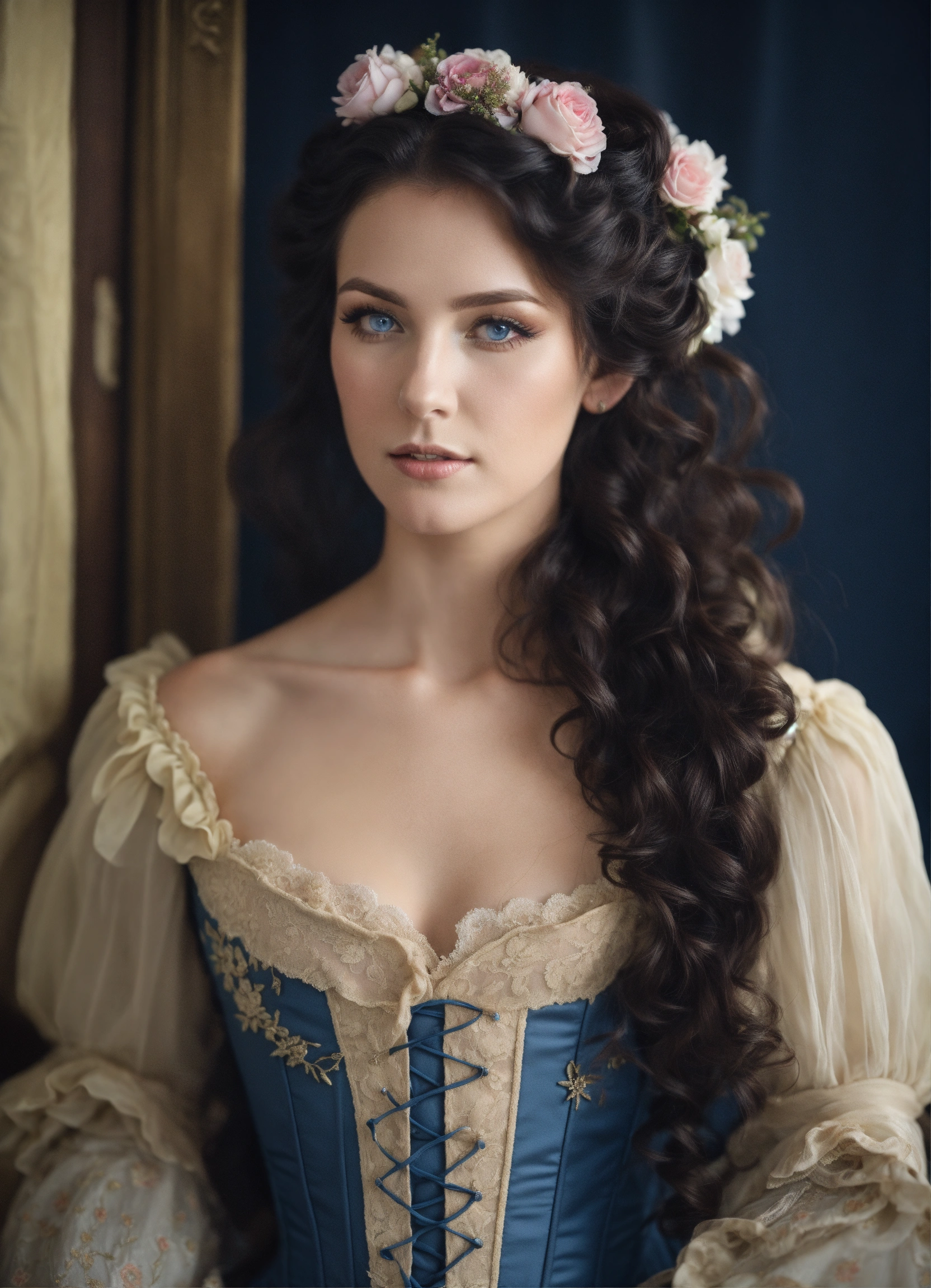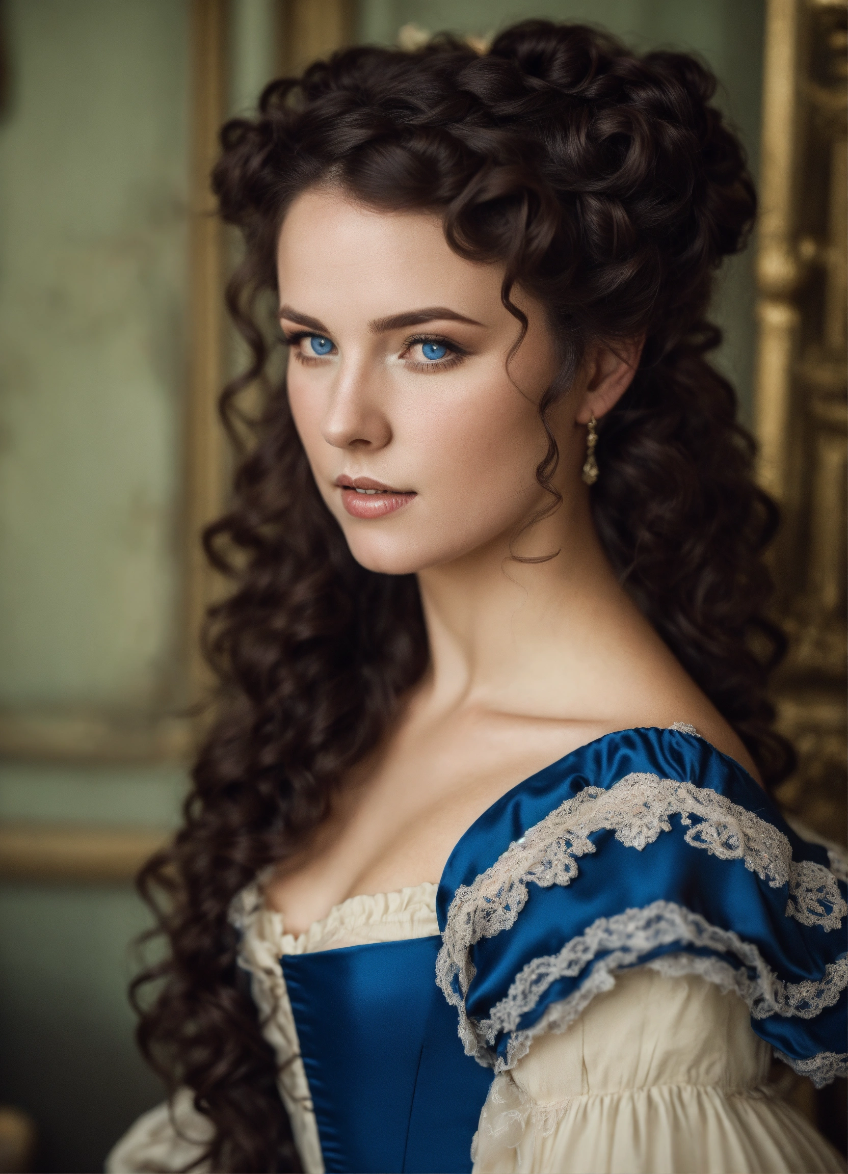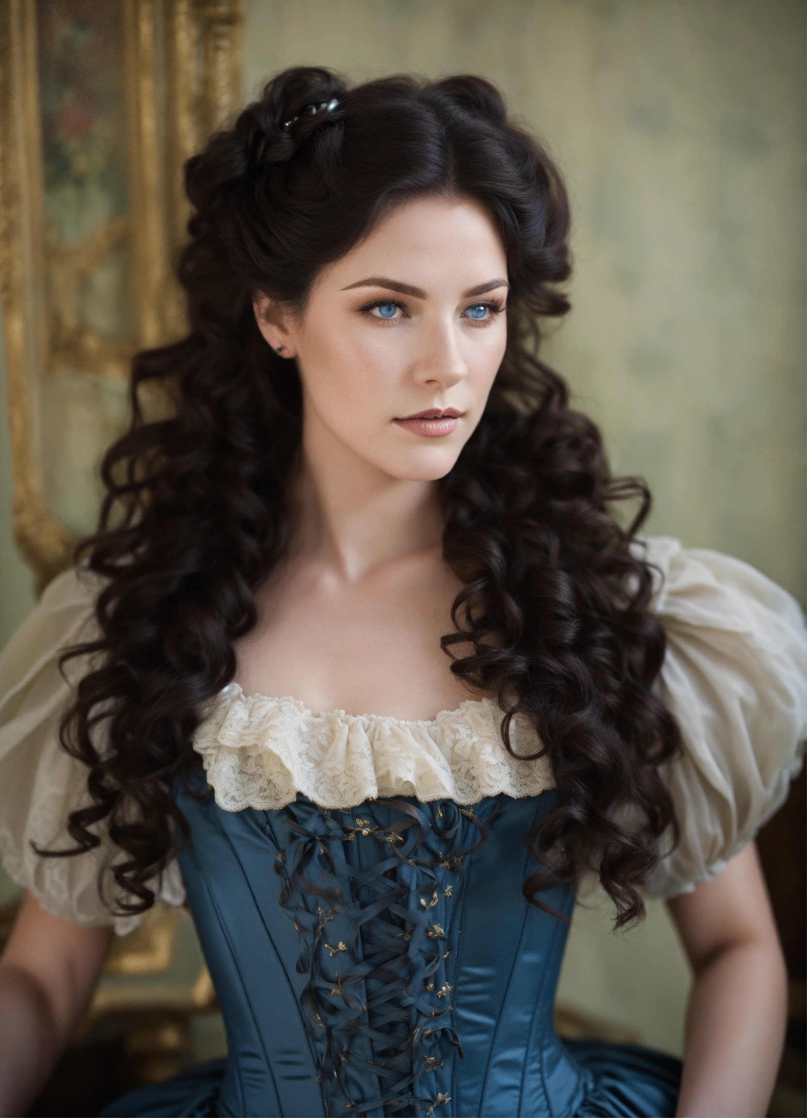 Dark hair french woman, blue eyes, pale skin, angular features. long curly hair, half up half down, styled into a lose up do. she is dressed in a 1910 french dress and corset.