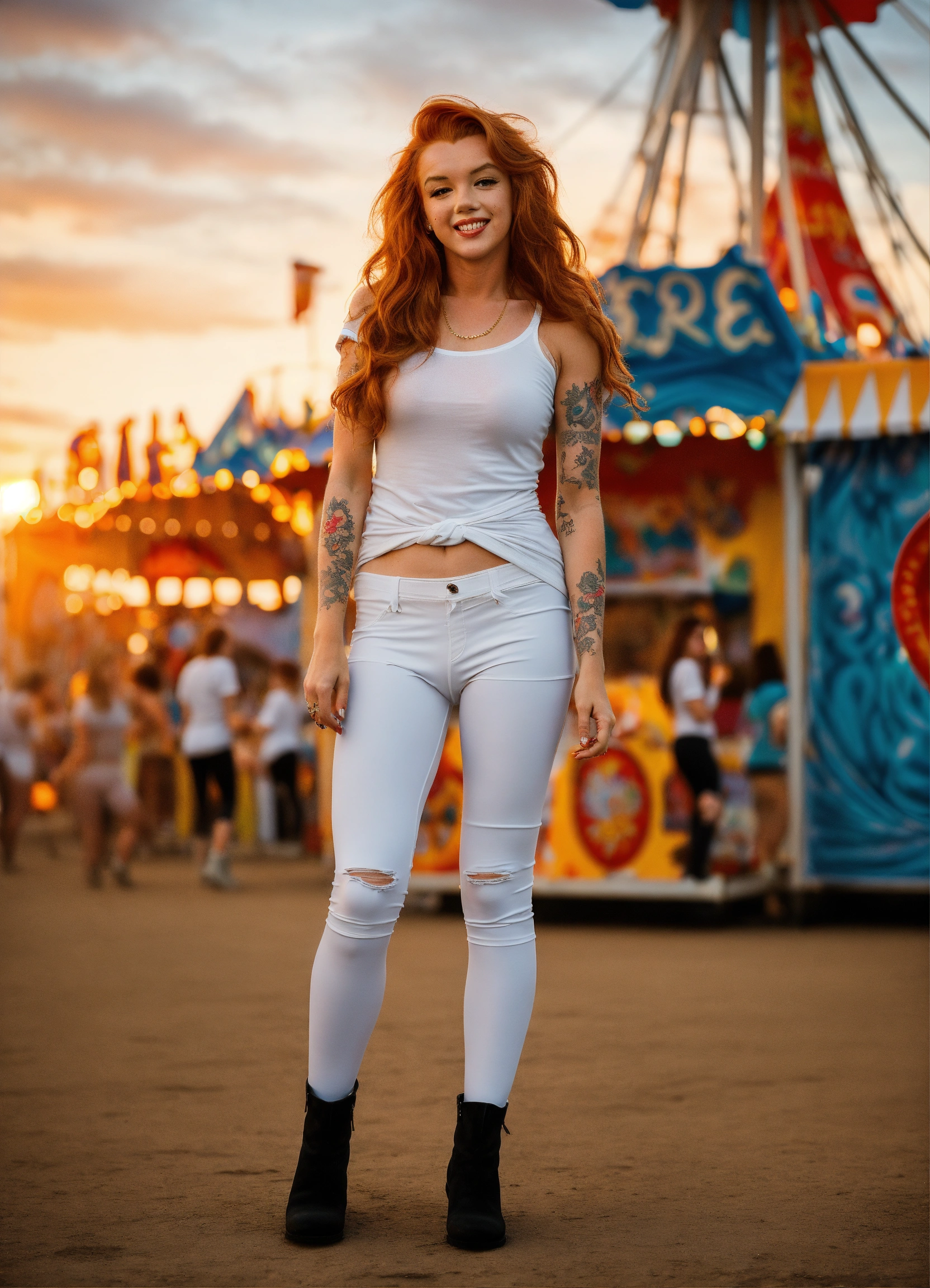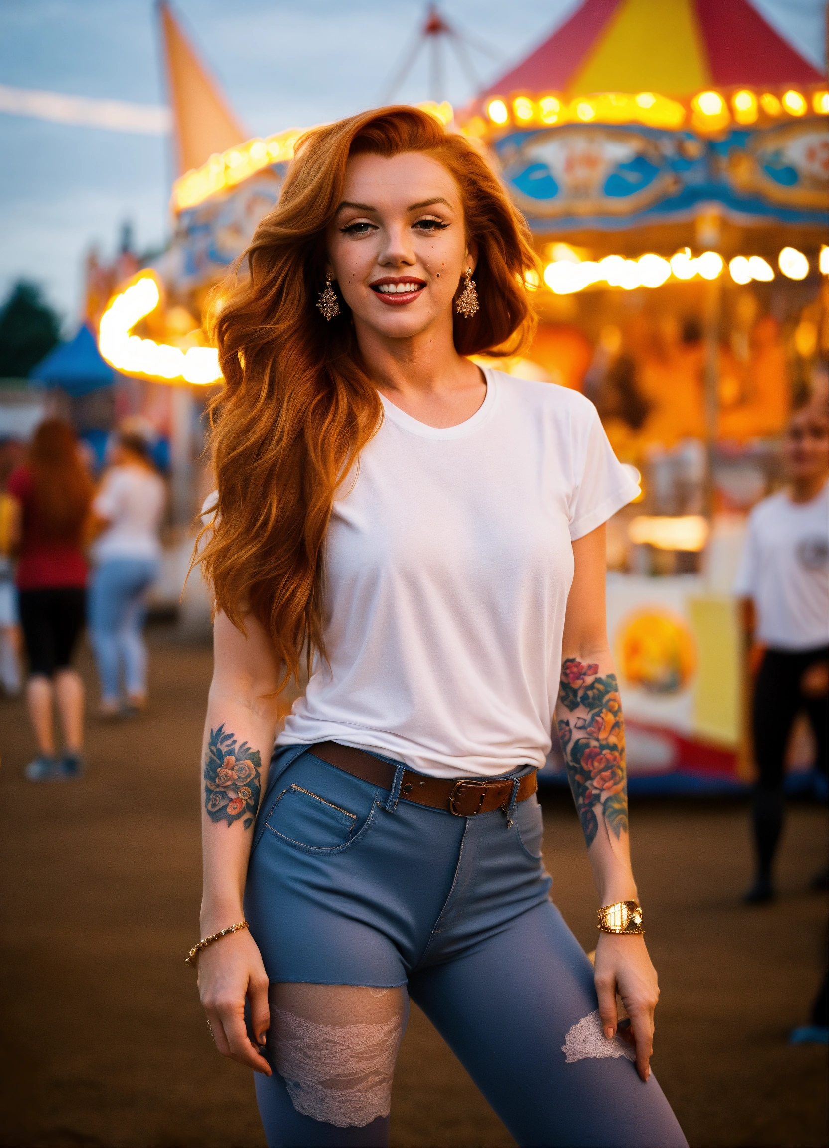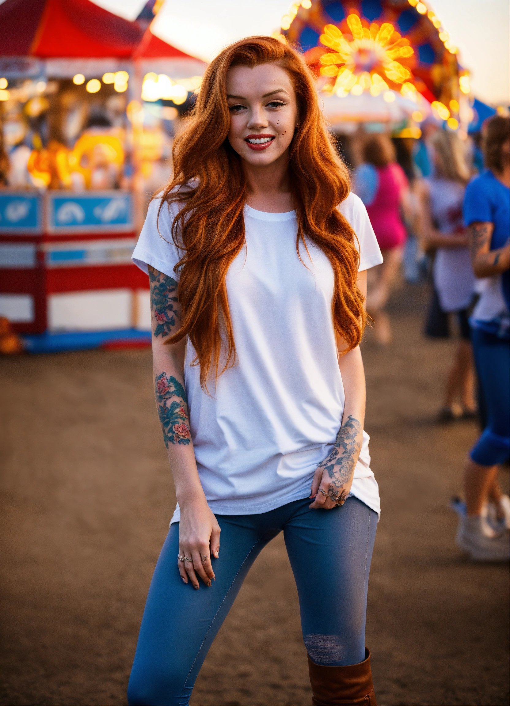 Full body photo of one happy-looking marilyn monroe type model with very long auburn beautiful hair, modeling plain blank white t-shirt, with soft leggings and boots at a carnival at golden hour. front of shirt needs to be visible and blank. she has tattoos on her arms.
