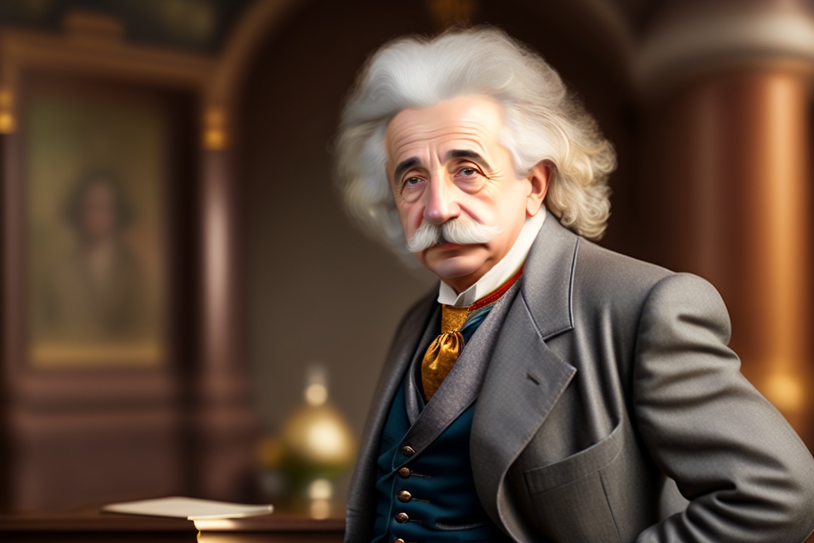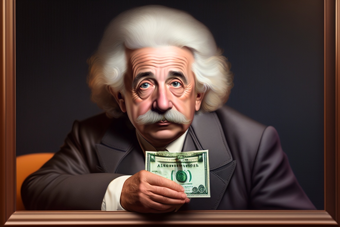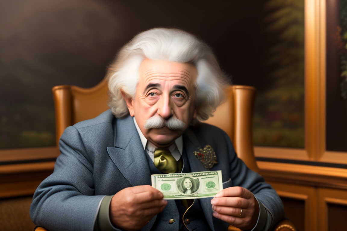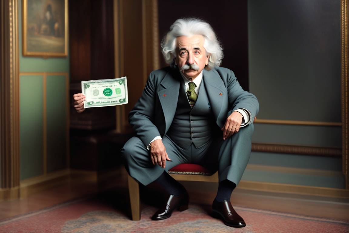 Extremely detailed full-length color photo of albert einstein, with his hands in front of him holding a dollar bill