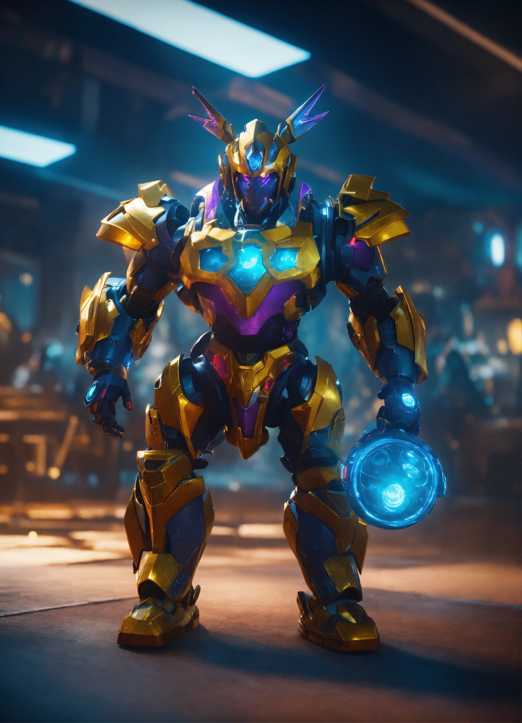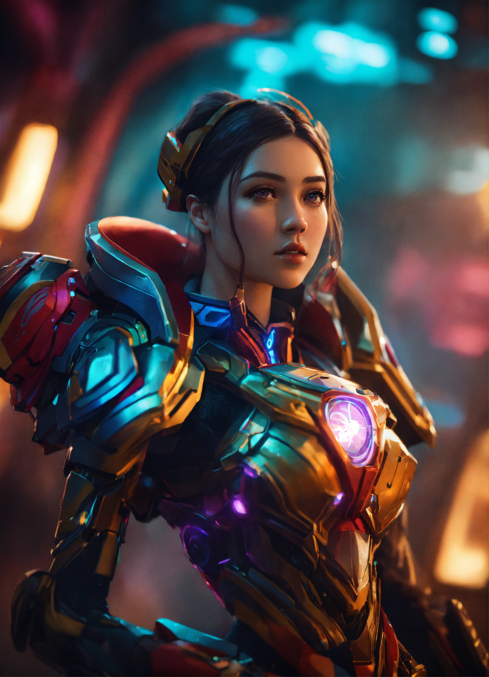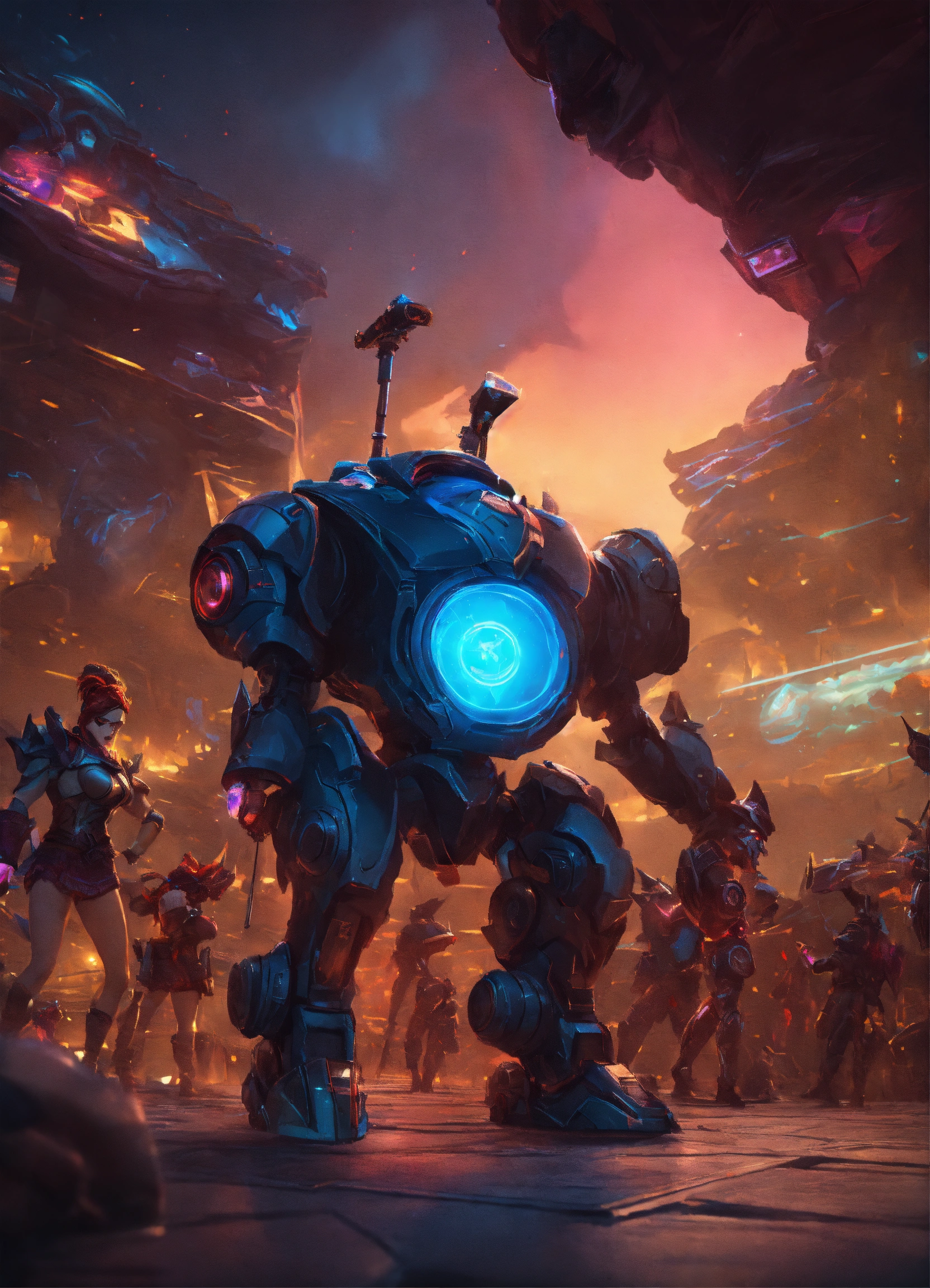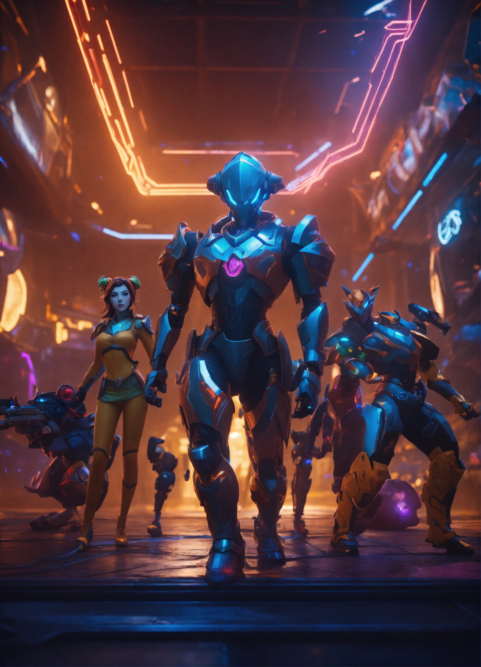 Wide angle environmental shot of ai augmented human intelligence league of legends, vibrant, photo realistic, realistic, dramatic, dark, sharp focus, 8k.