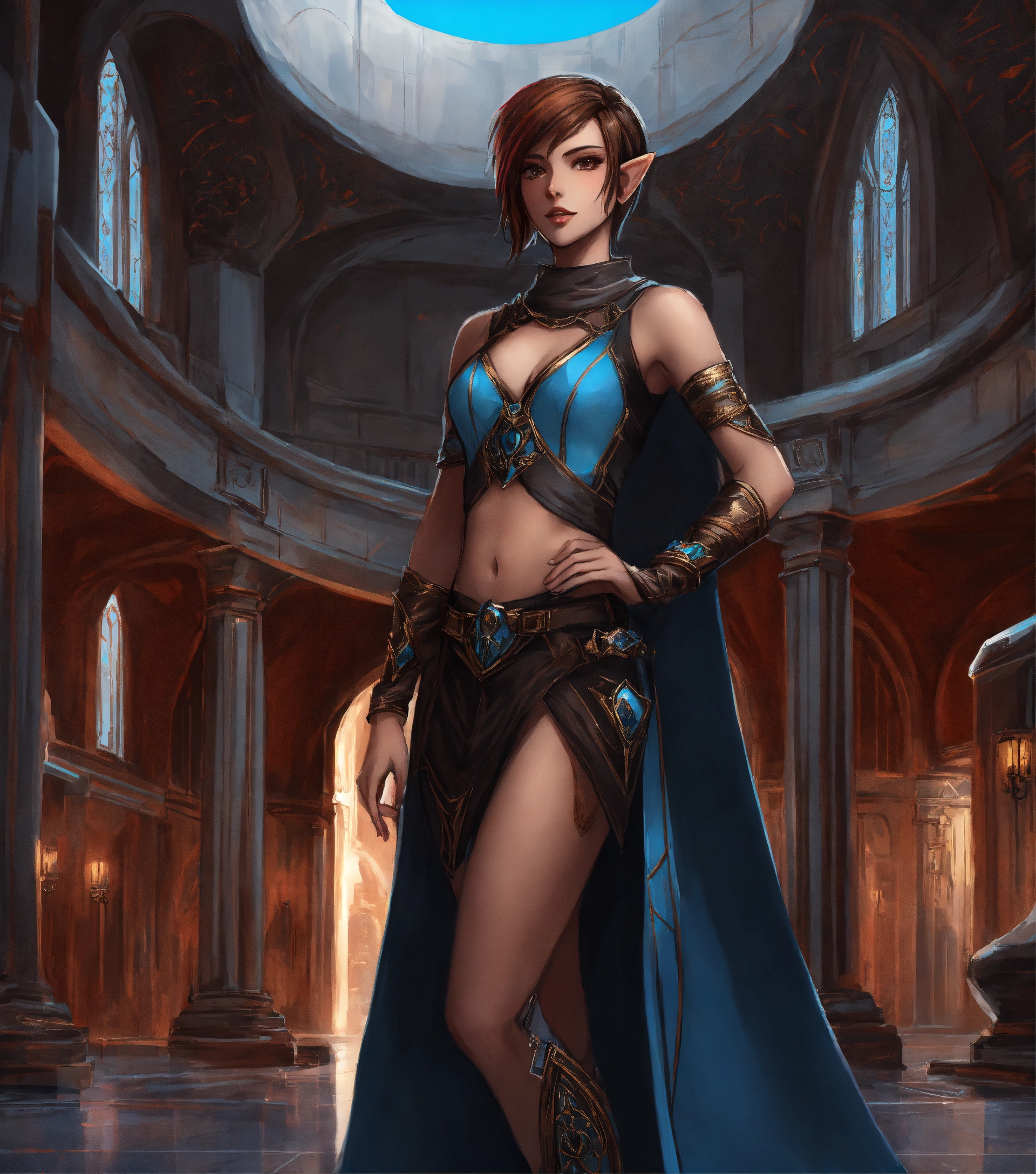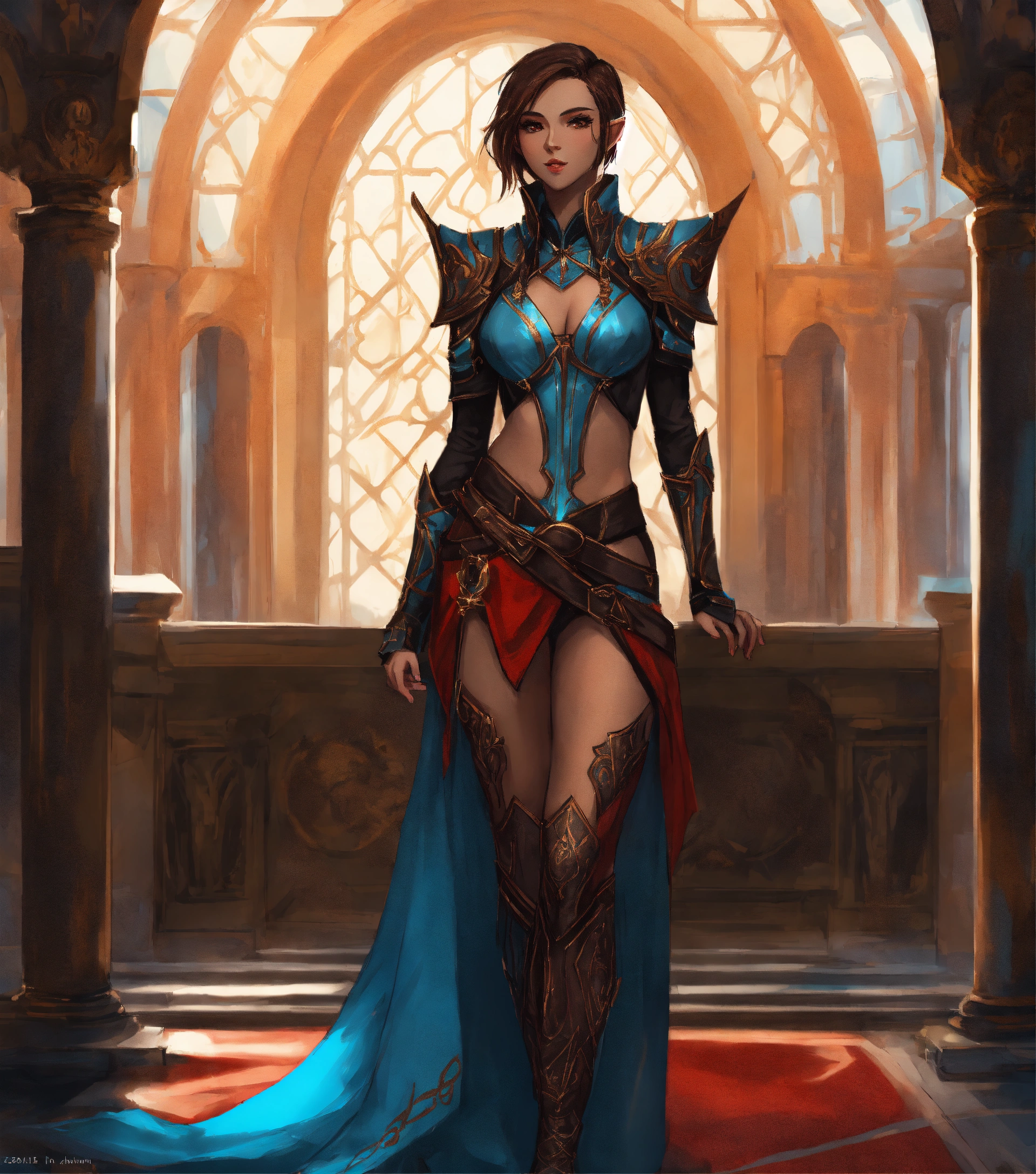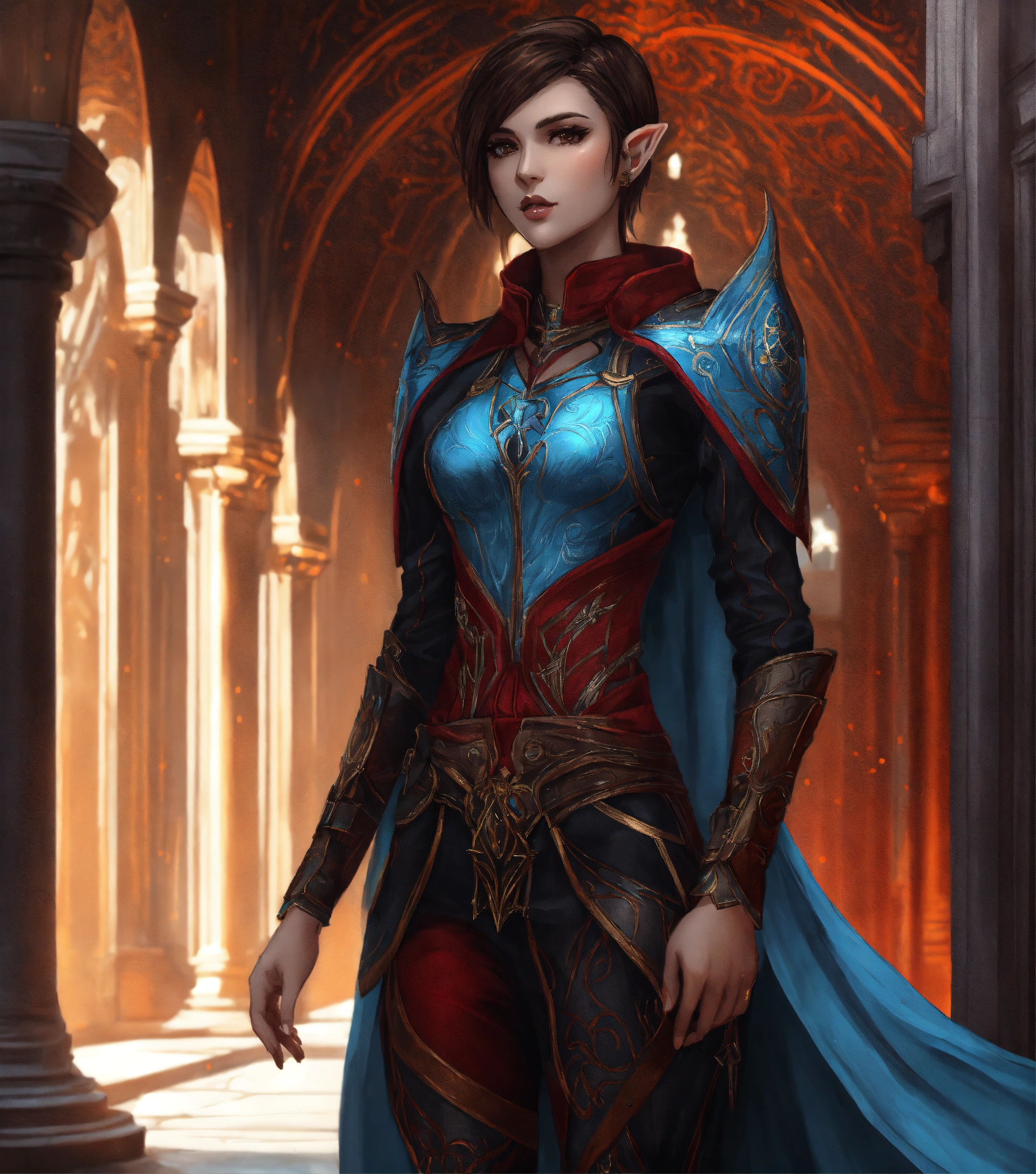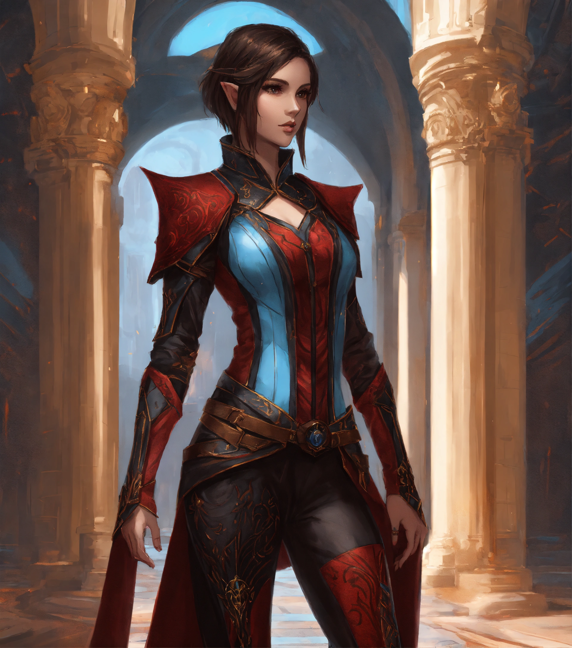 Full body drawing of a high elf, royalty, futuristic, black and hot crimson and light blue sci fi outfit, female, beautiful, short brown hair, 25 years old, standing in a black marble elven palace courtyard