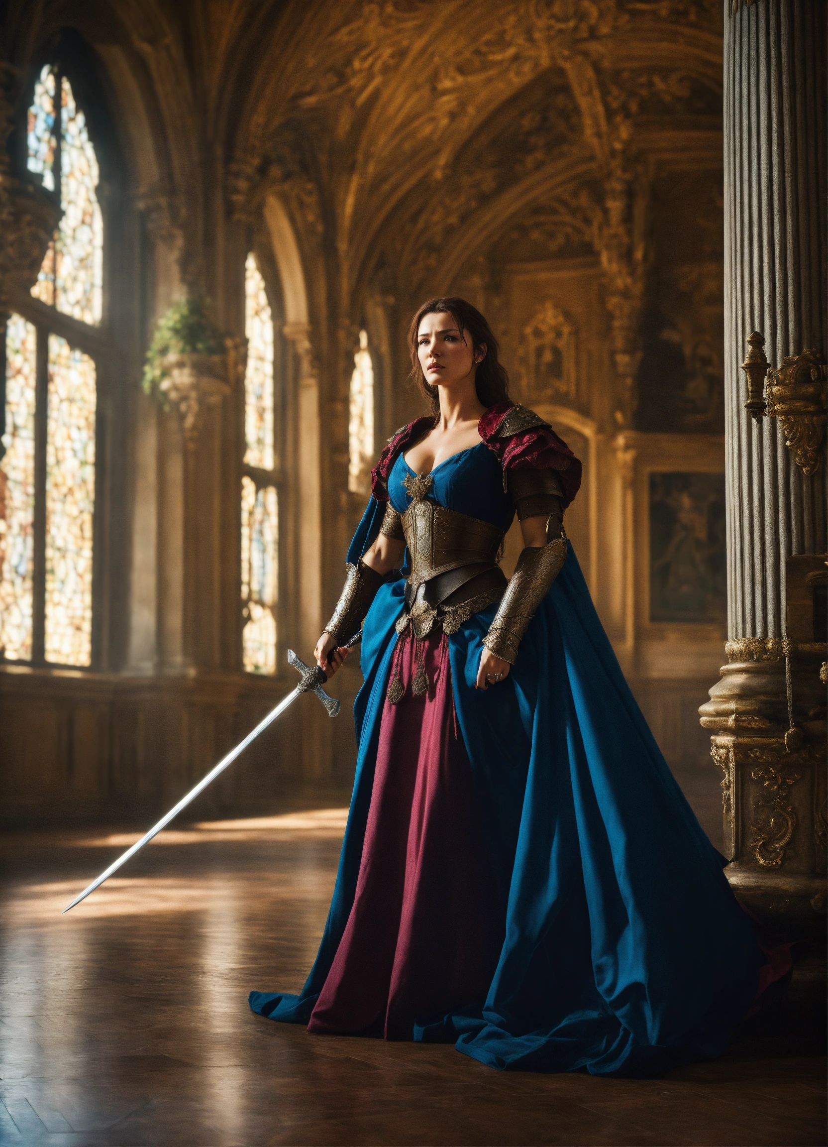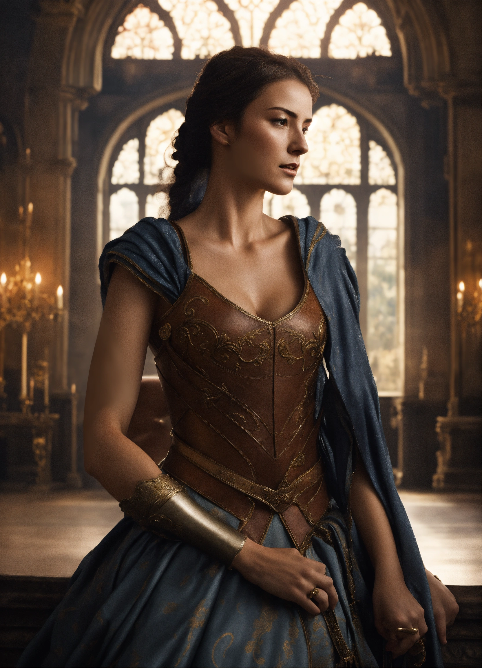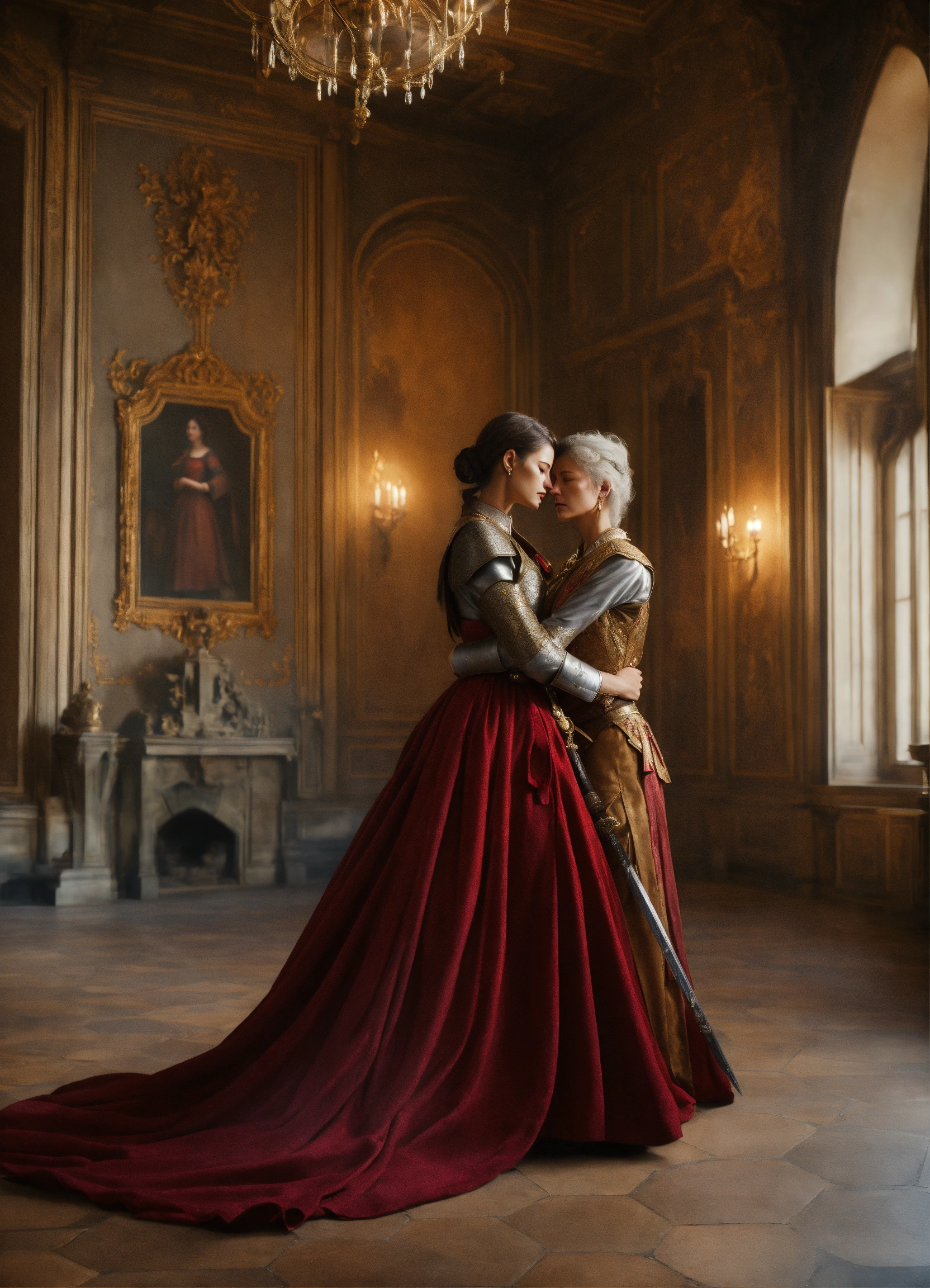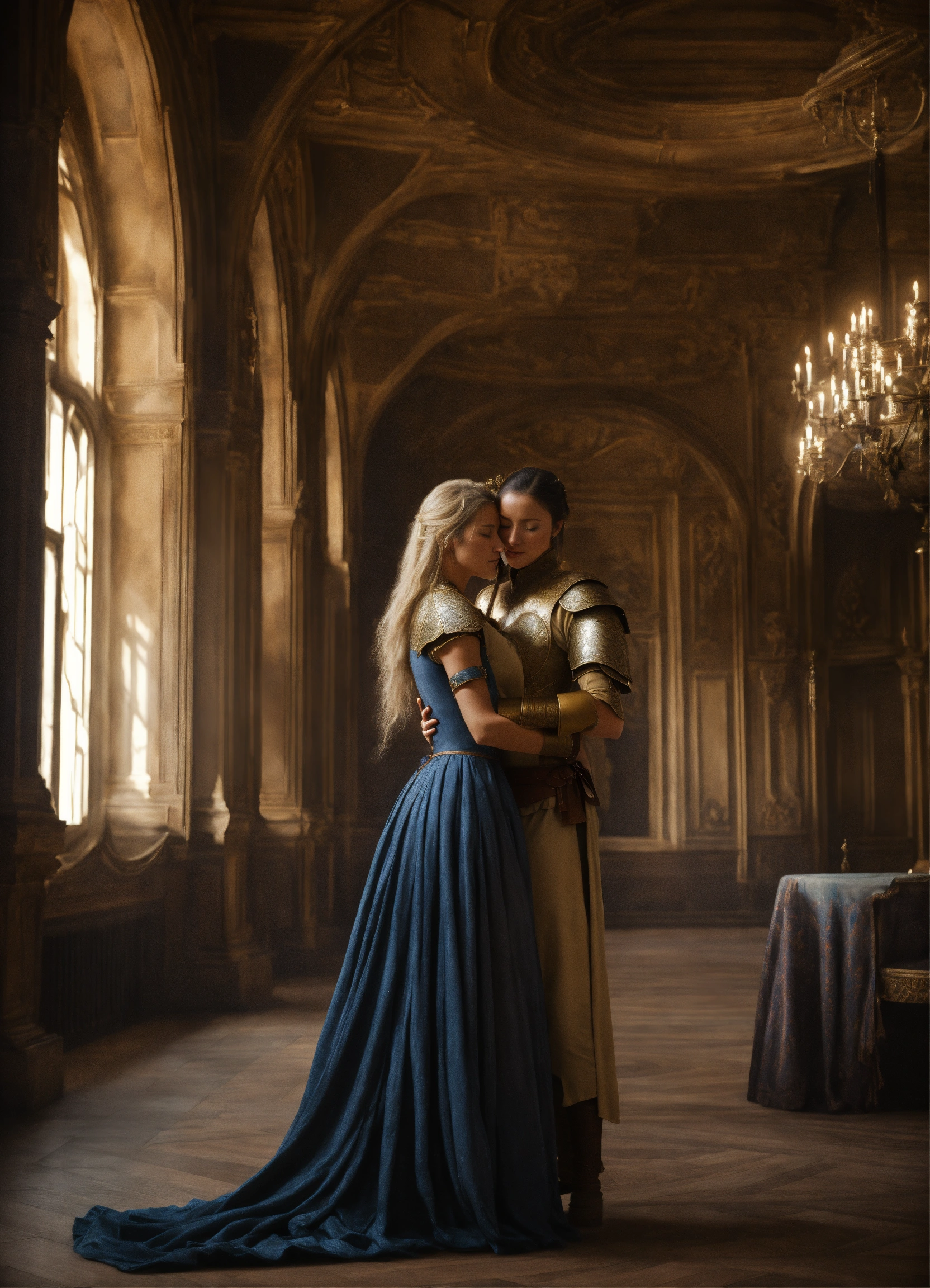 Photorealistic a robust woman warrior embracing a frail in a castle ballroom