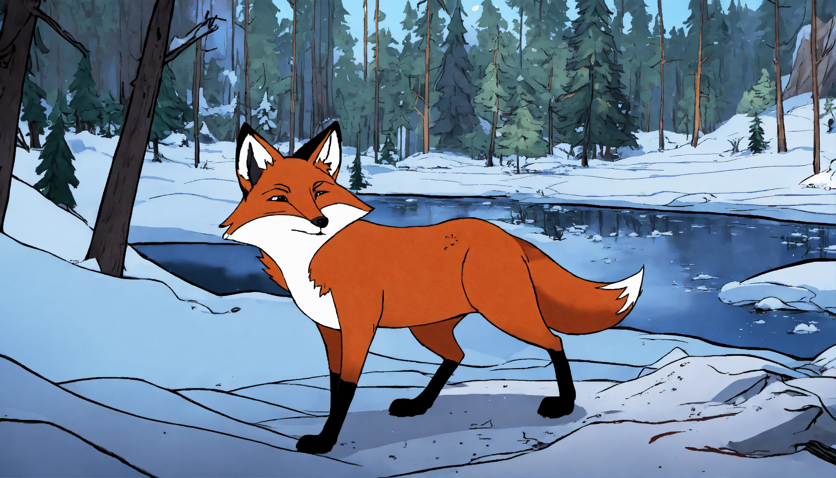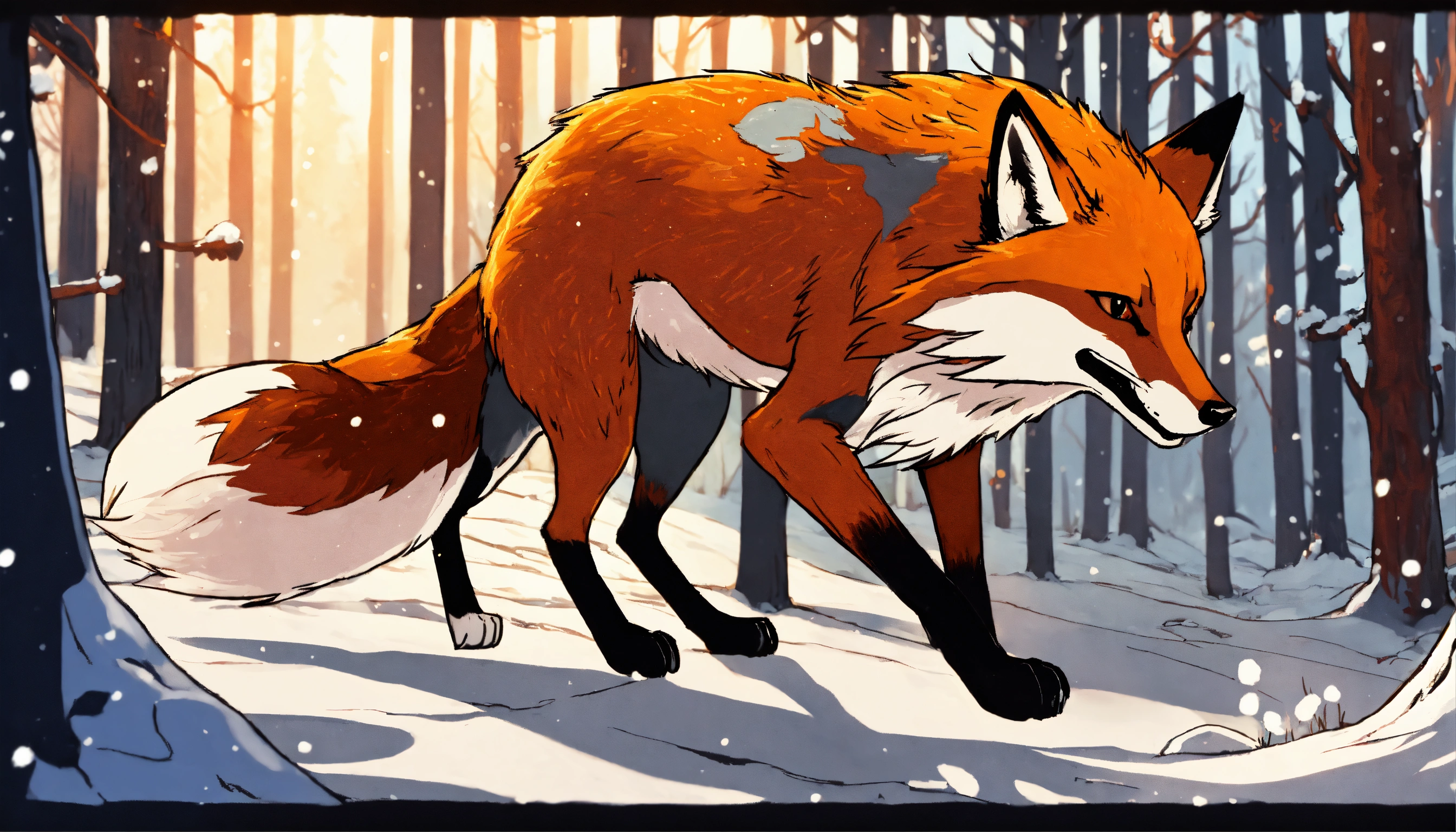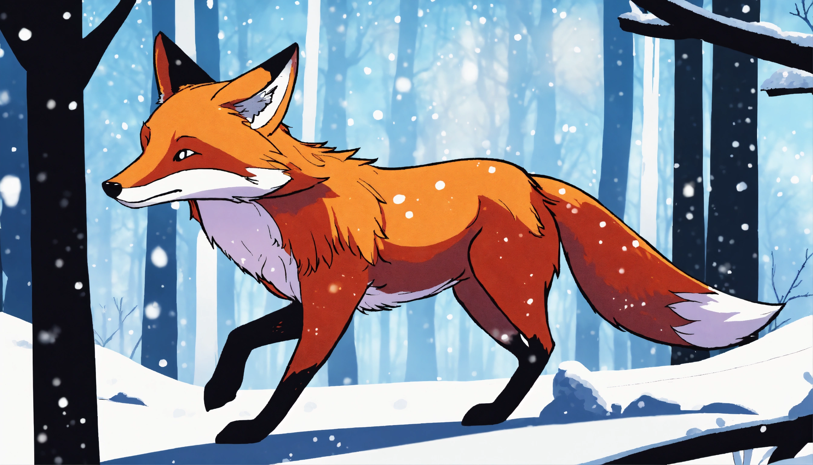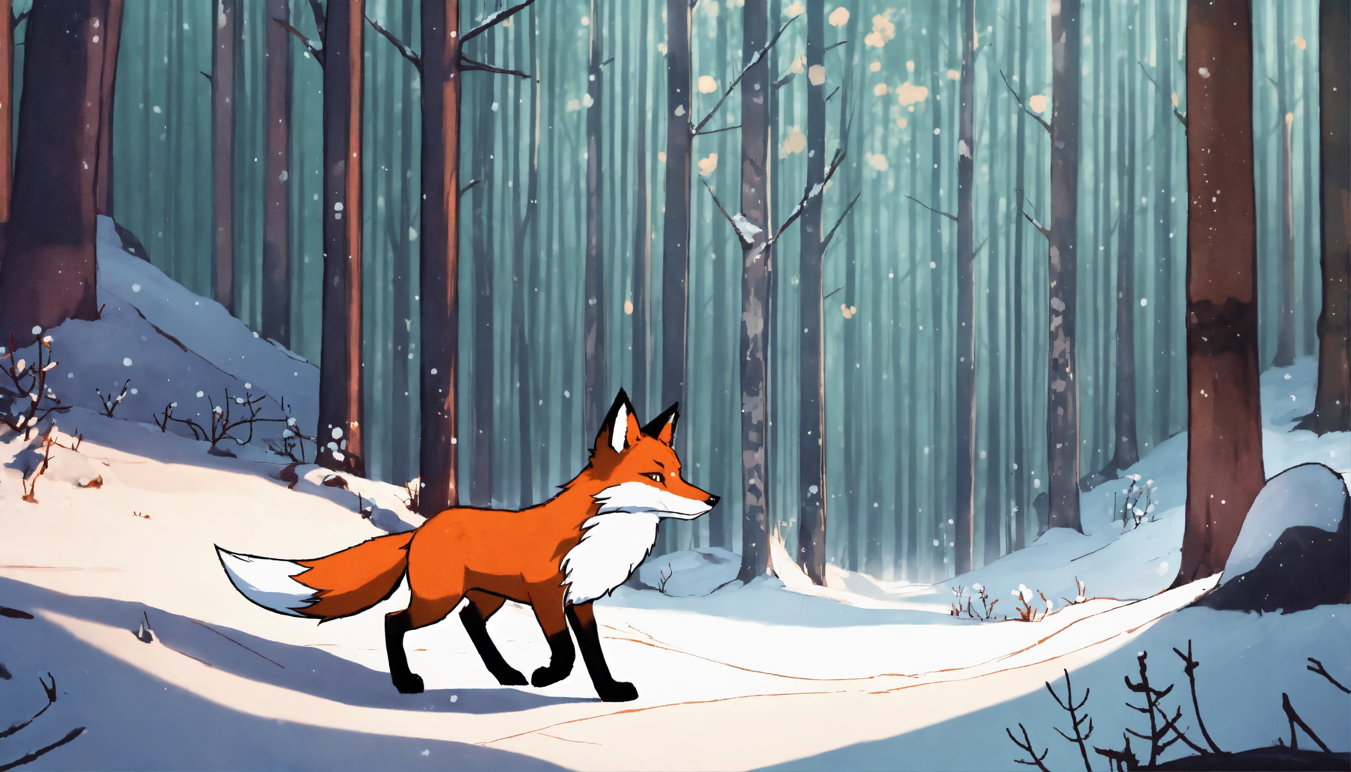 A cartoon-style fox with a head stained with white rides on a wolf through a snowy forest