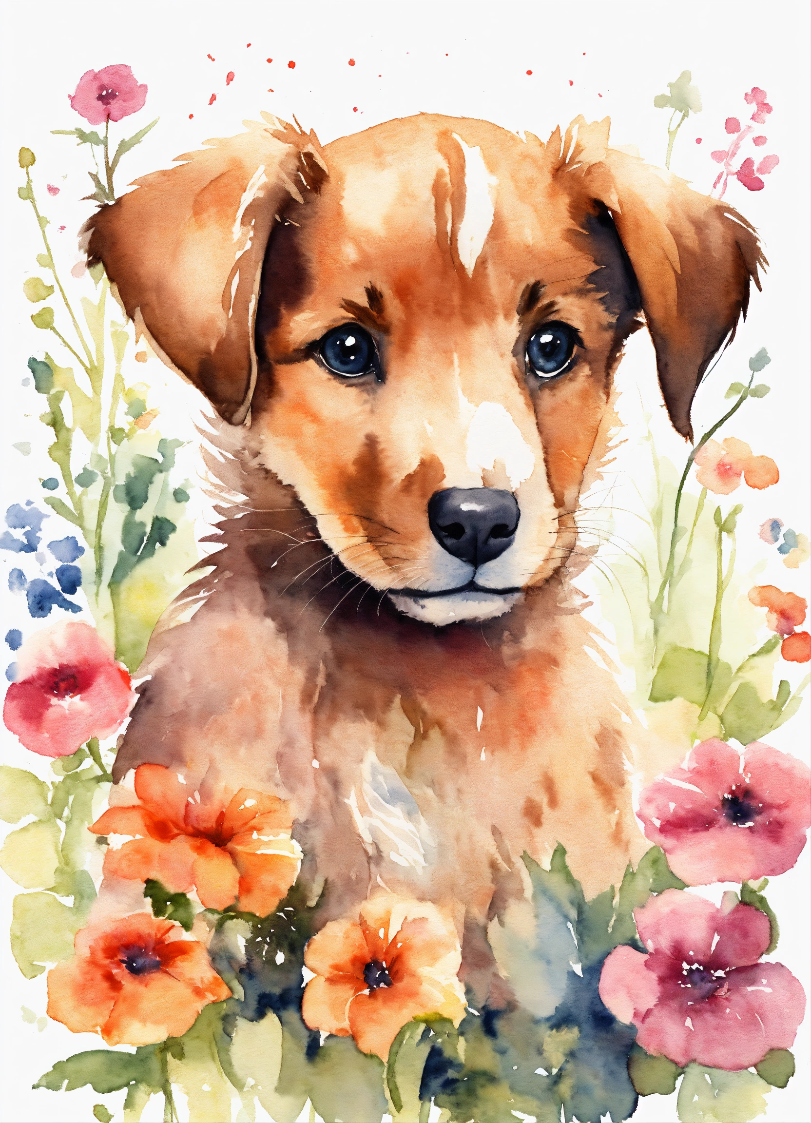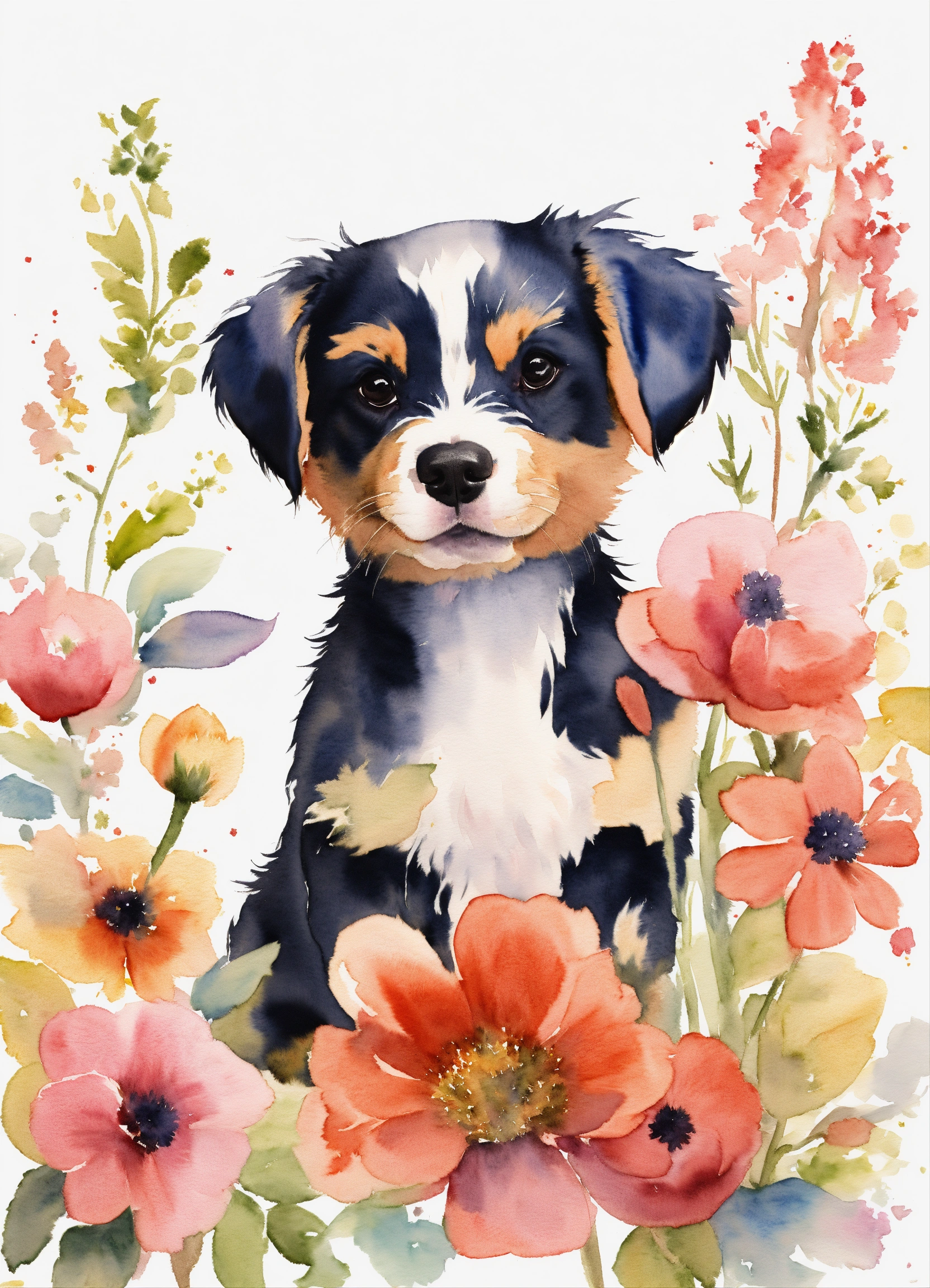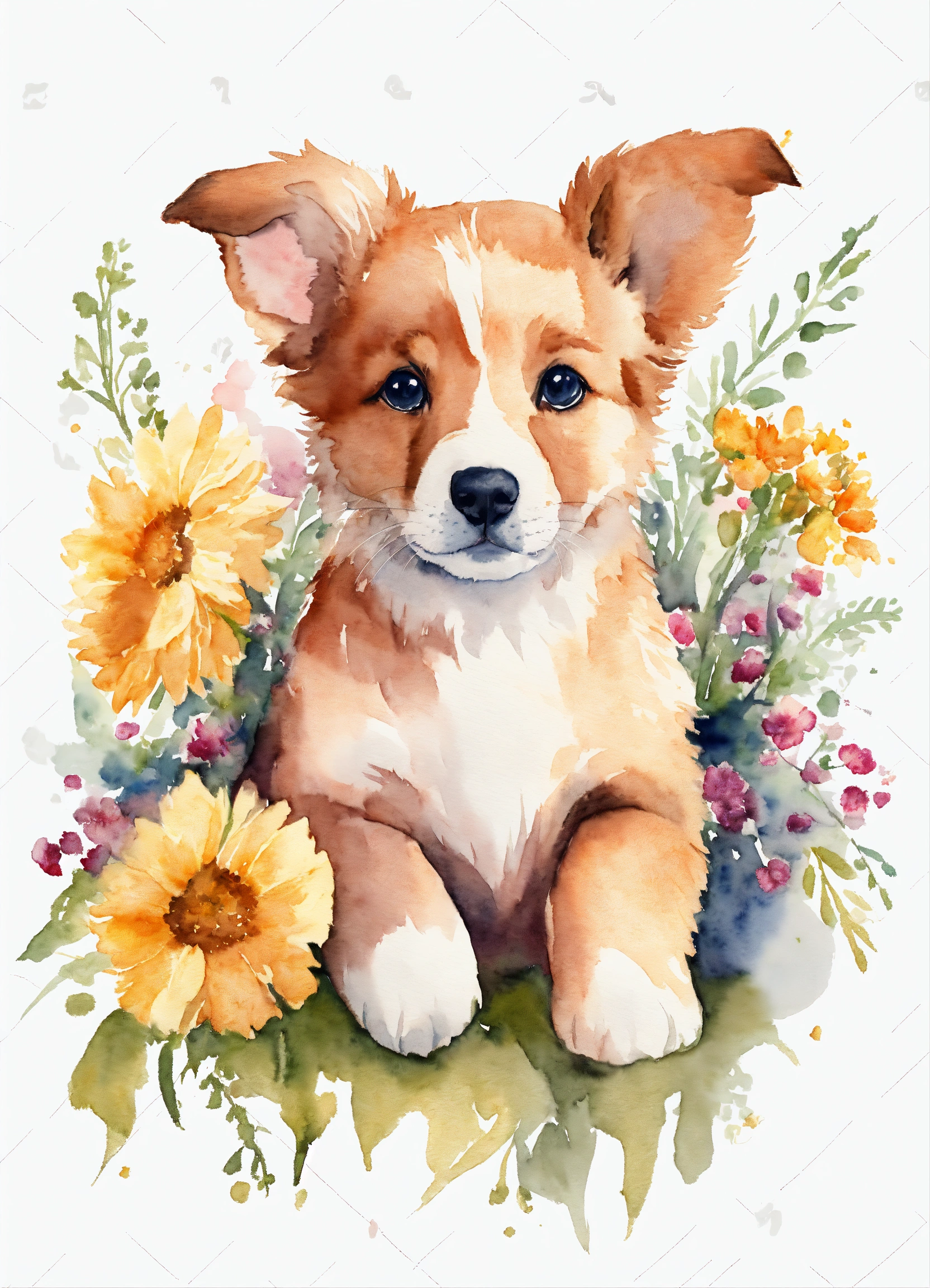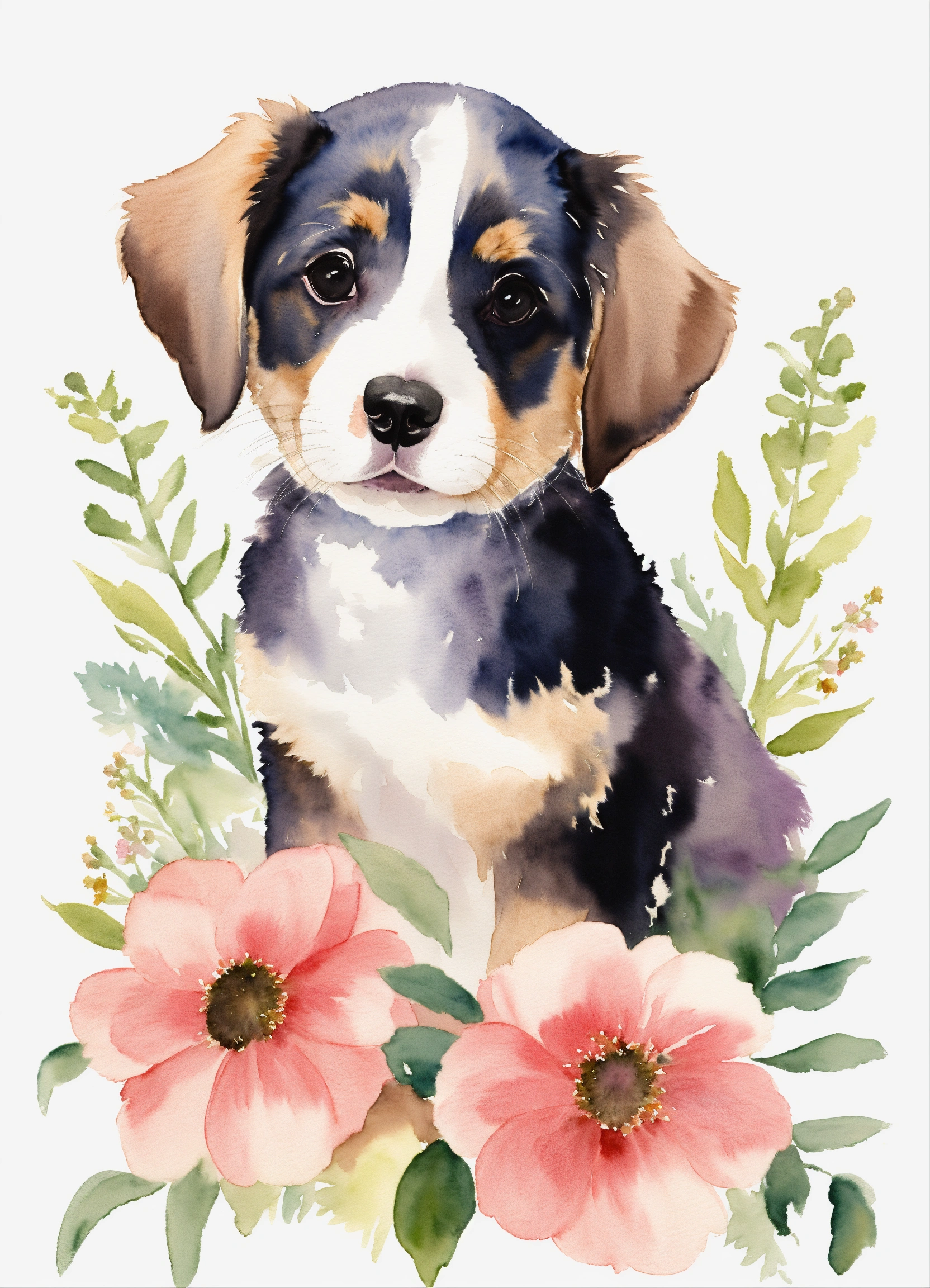 Watercolor drawing of a cute puppy with flowers on a white background