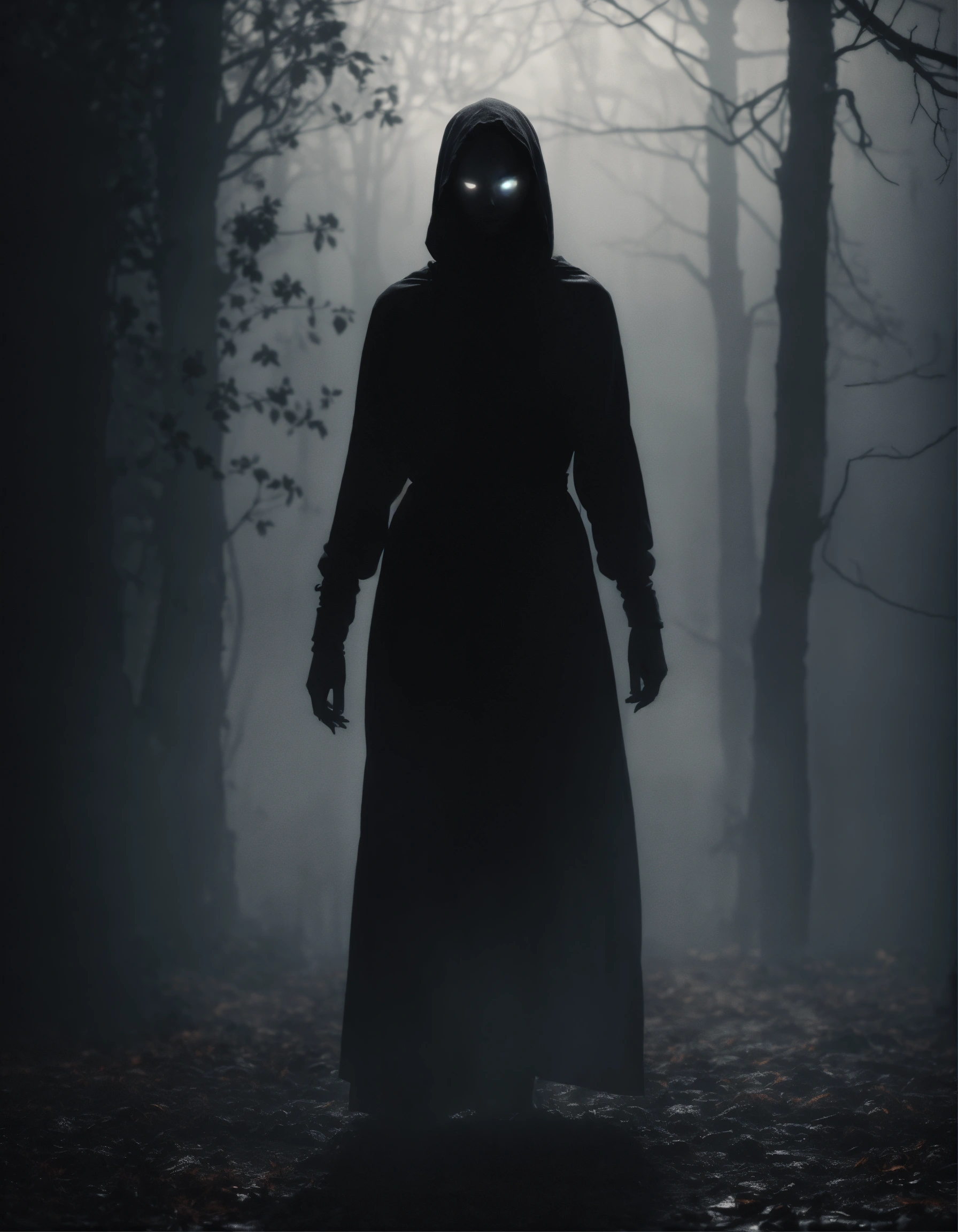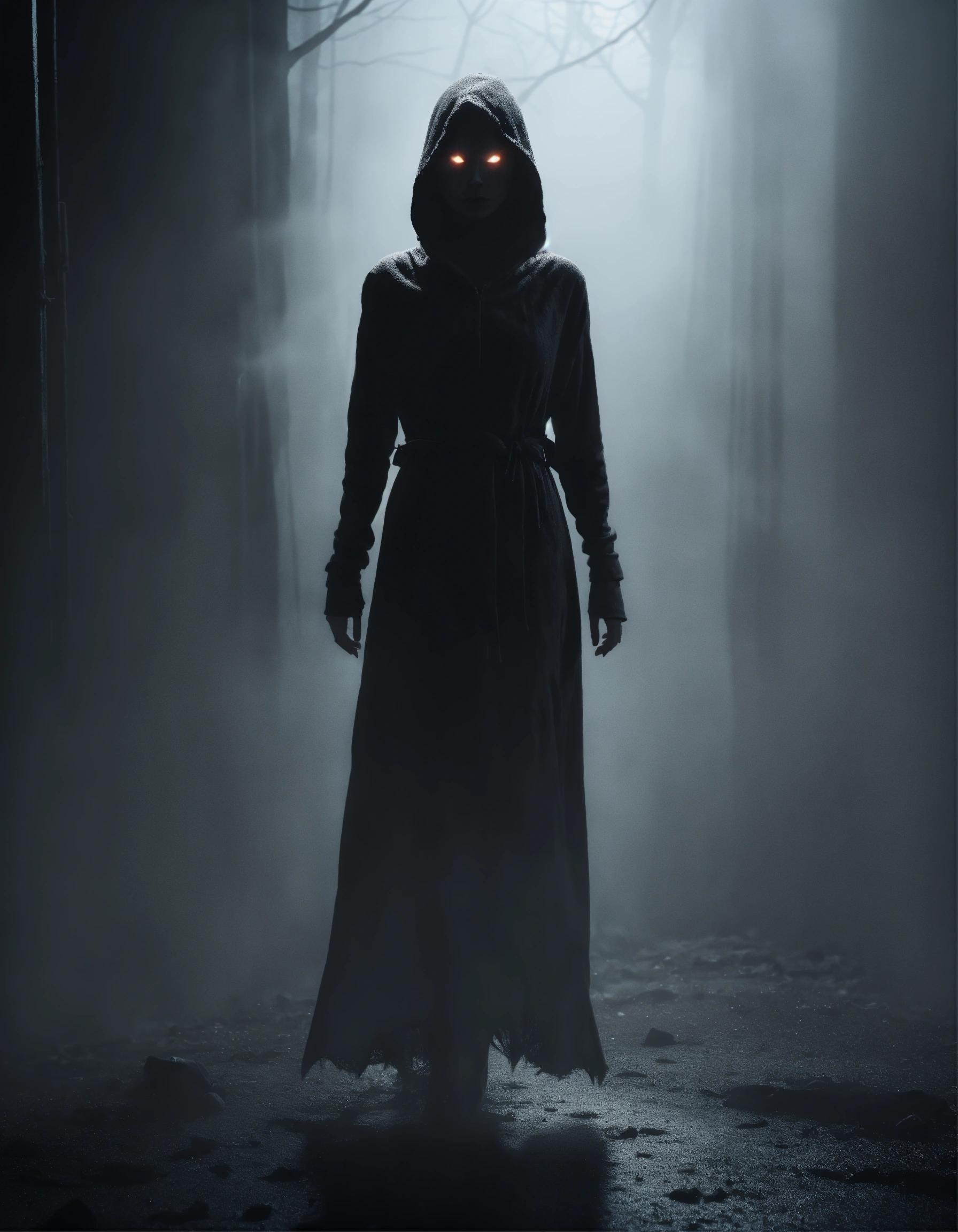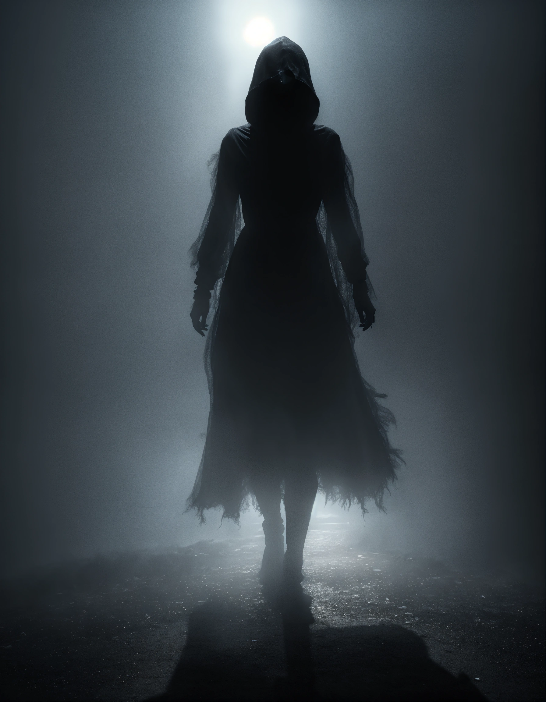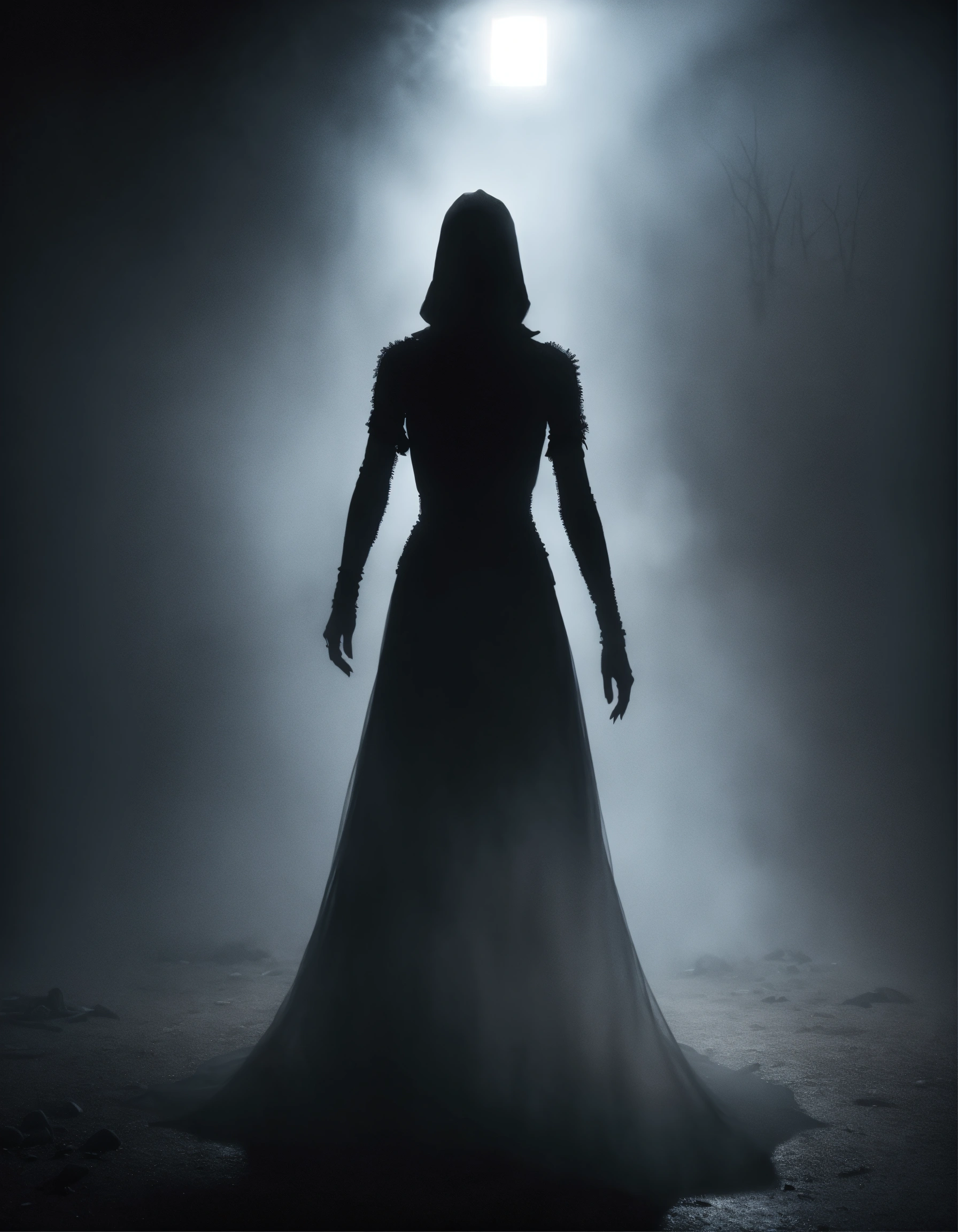 Demonic, spooky, scary shadow figure woman emerging from the darkness, black and grey gradient, foggy, realistic, 8k, unreal engine, cinematic