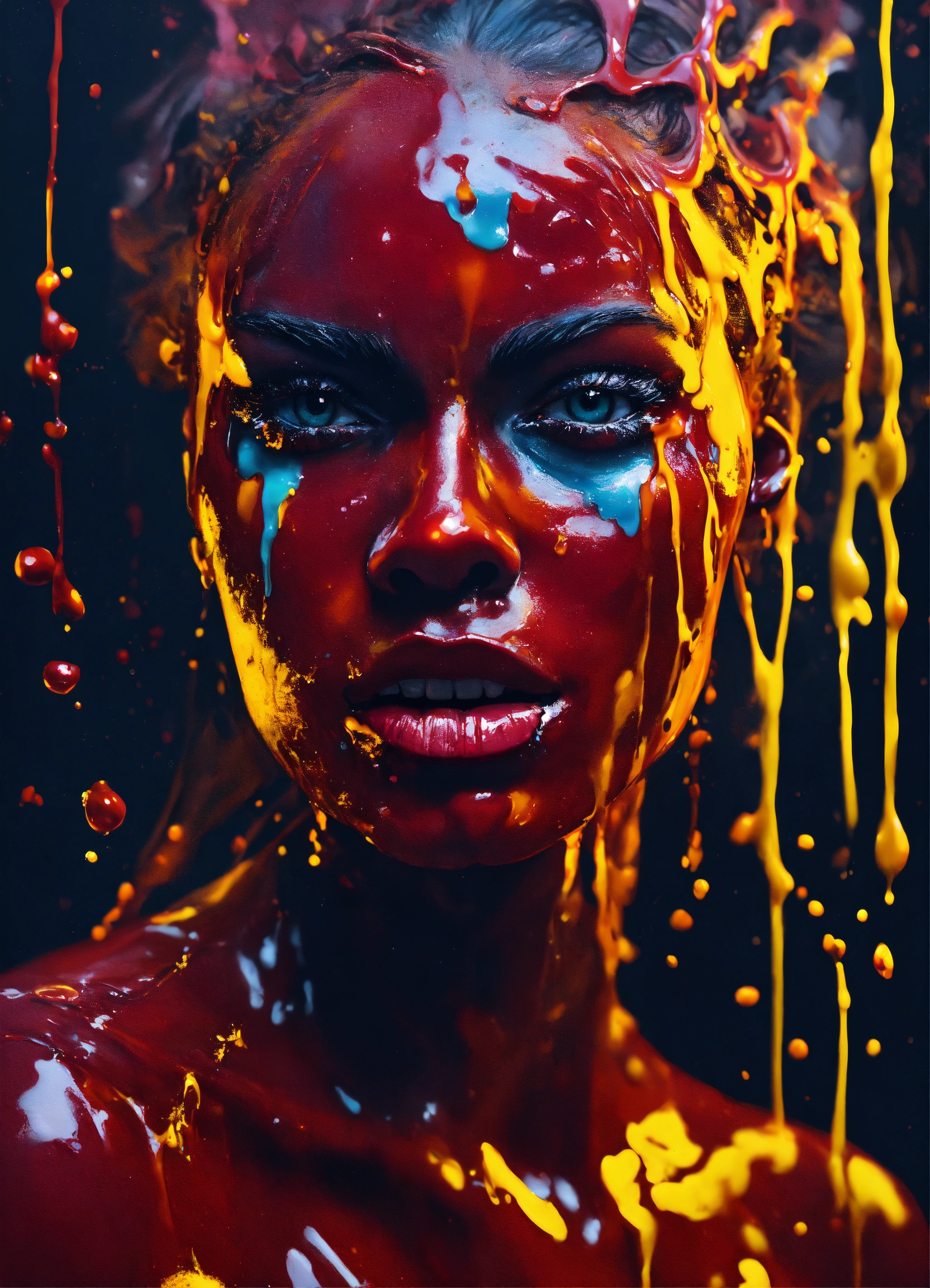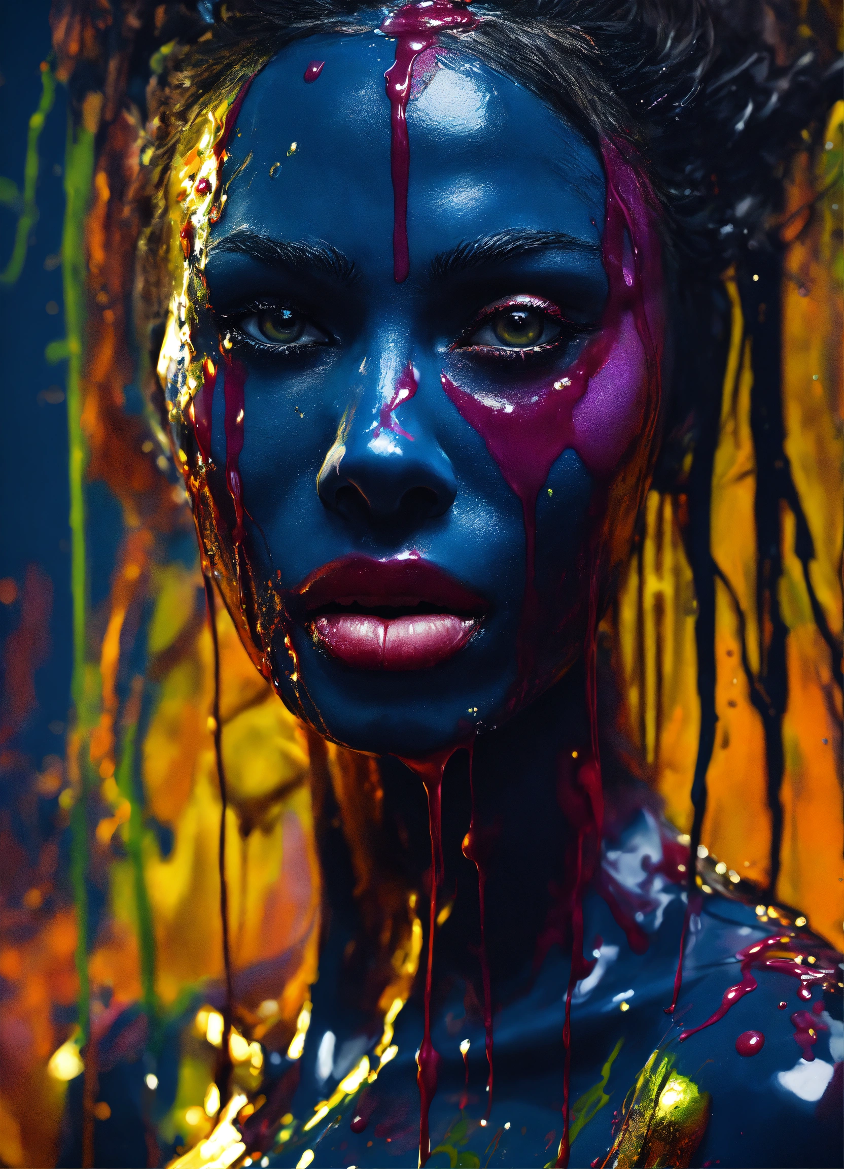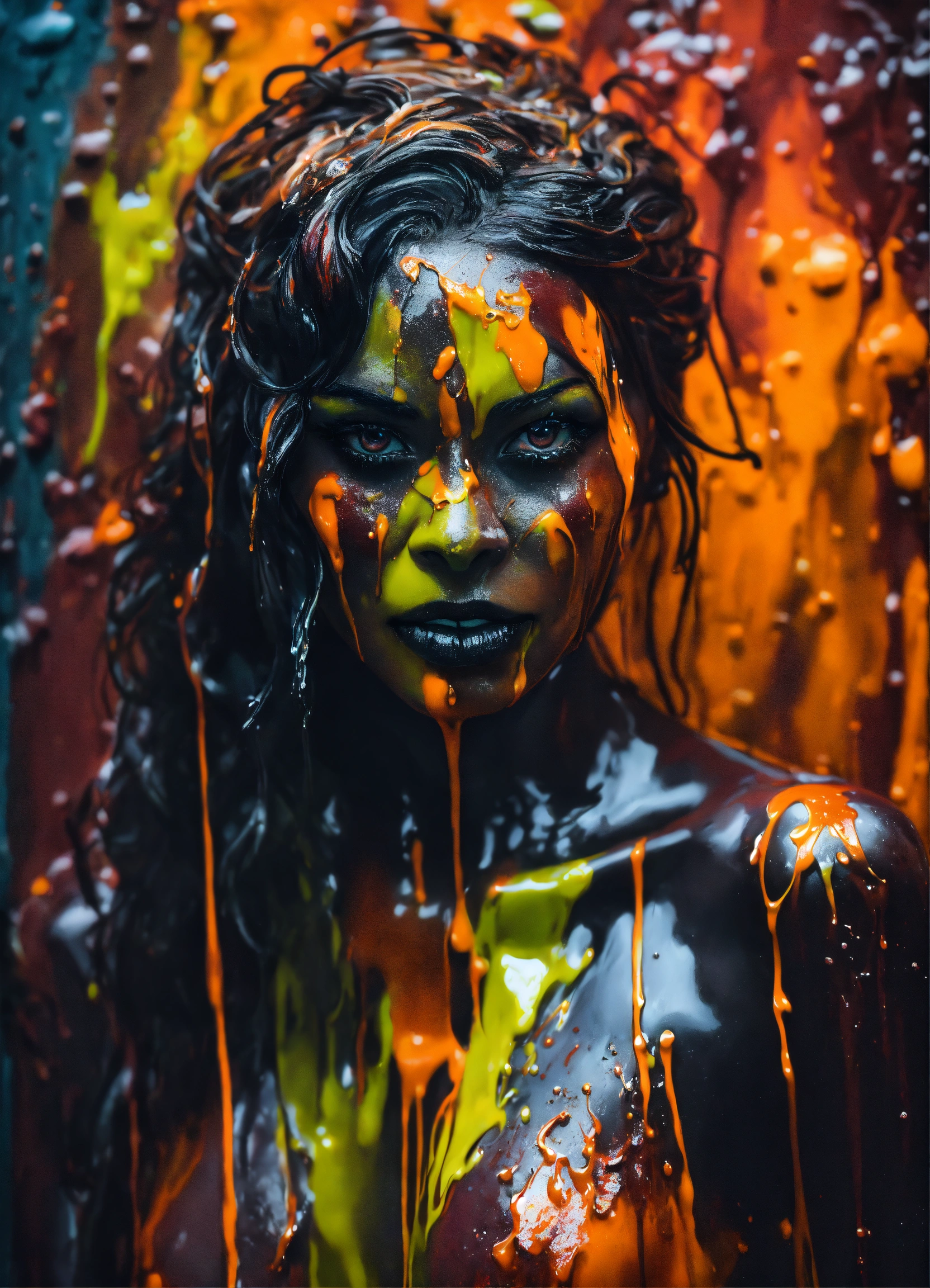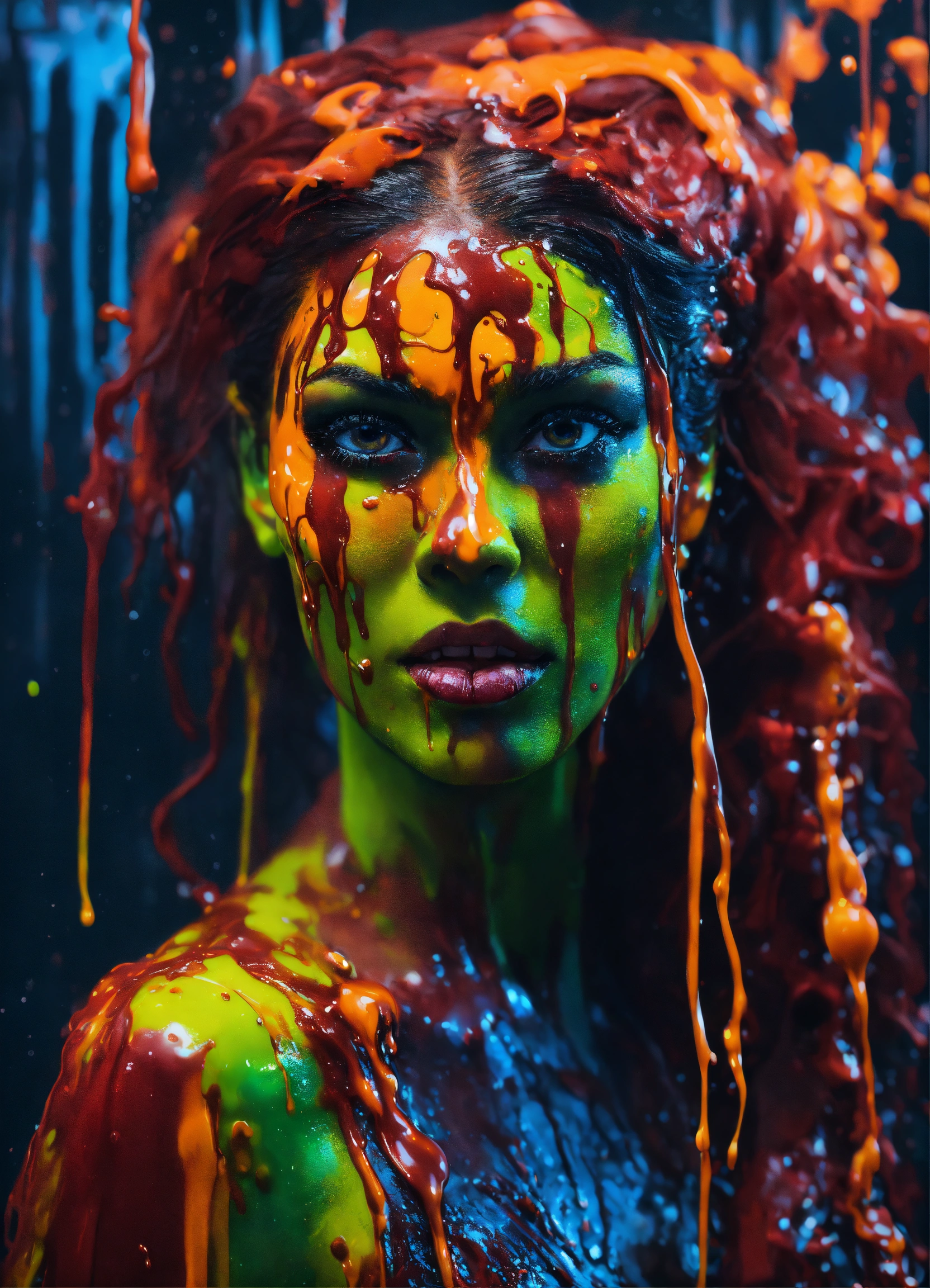 Splash art, a quirky liquid portrait of a hauntingly beautiful dark werewolf woman, splash style of paint, pixar style, halloween colors, liquid, gooey, slime, melting, dark colors, oil on canvas, extremely detailed, realistic photo, 4k realistic photo.
