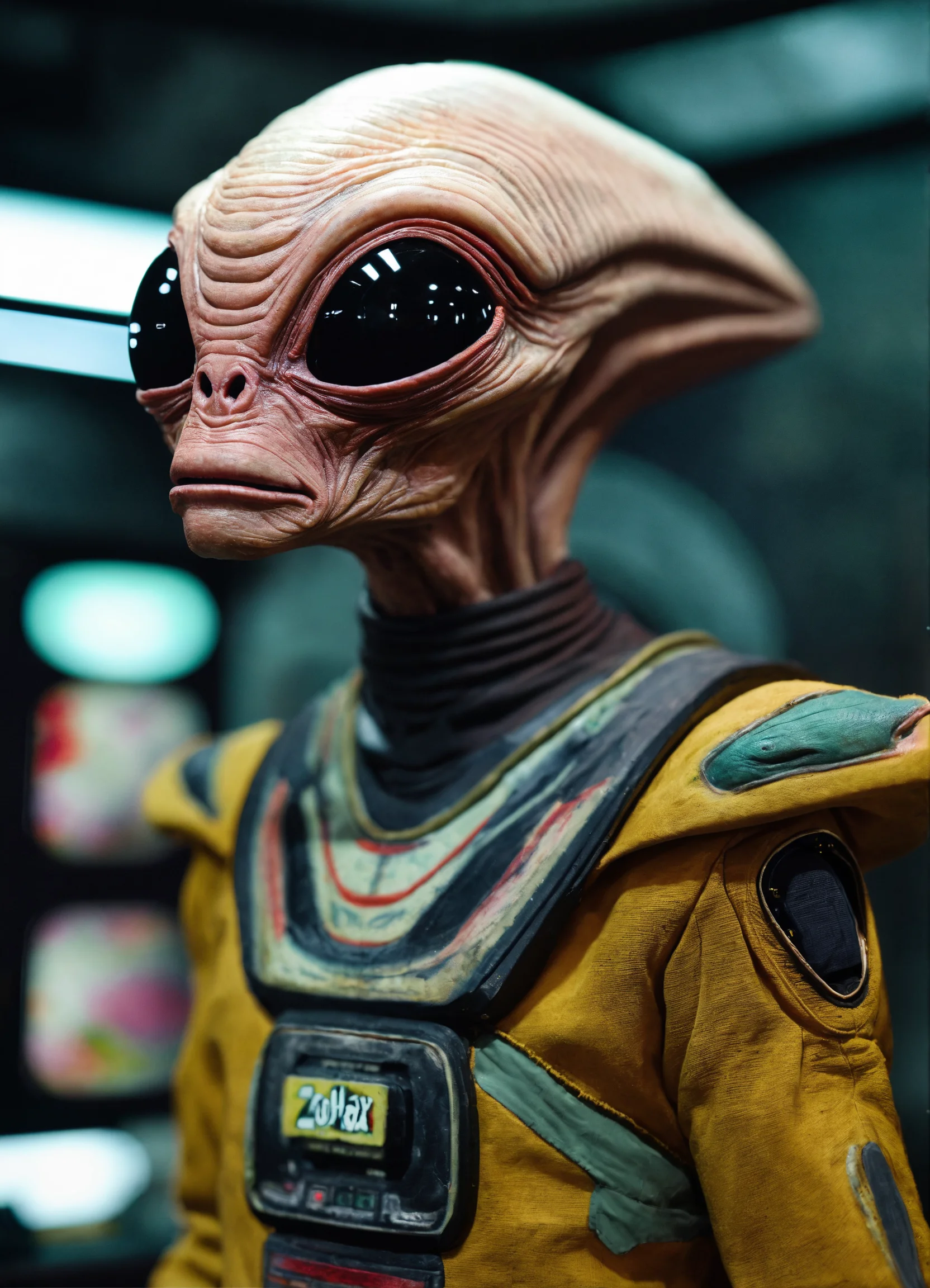 An alien named zorblax wearing a tv presenter's tunic in a tv space scenario. i want it to be hyper-realistic, inspired by the men in black movie. i want it to be a close-up and looking straight ahead.