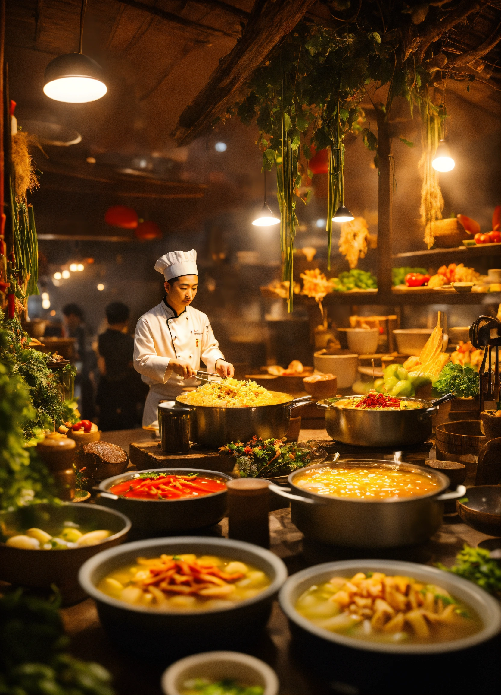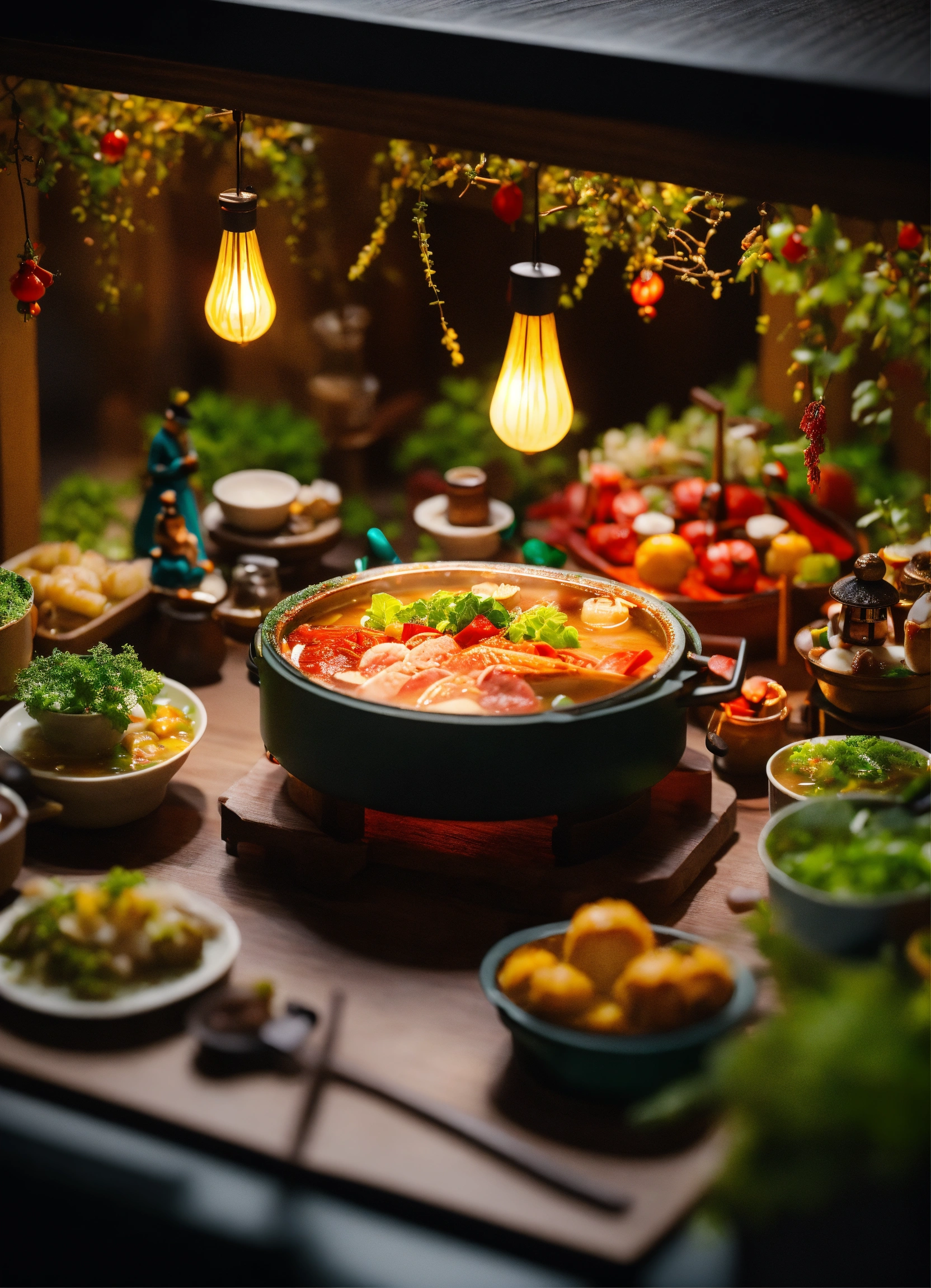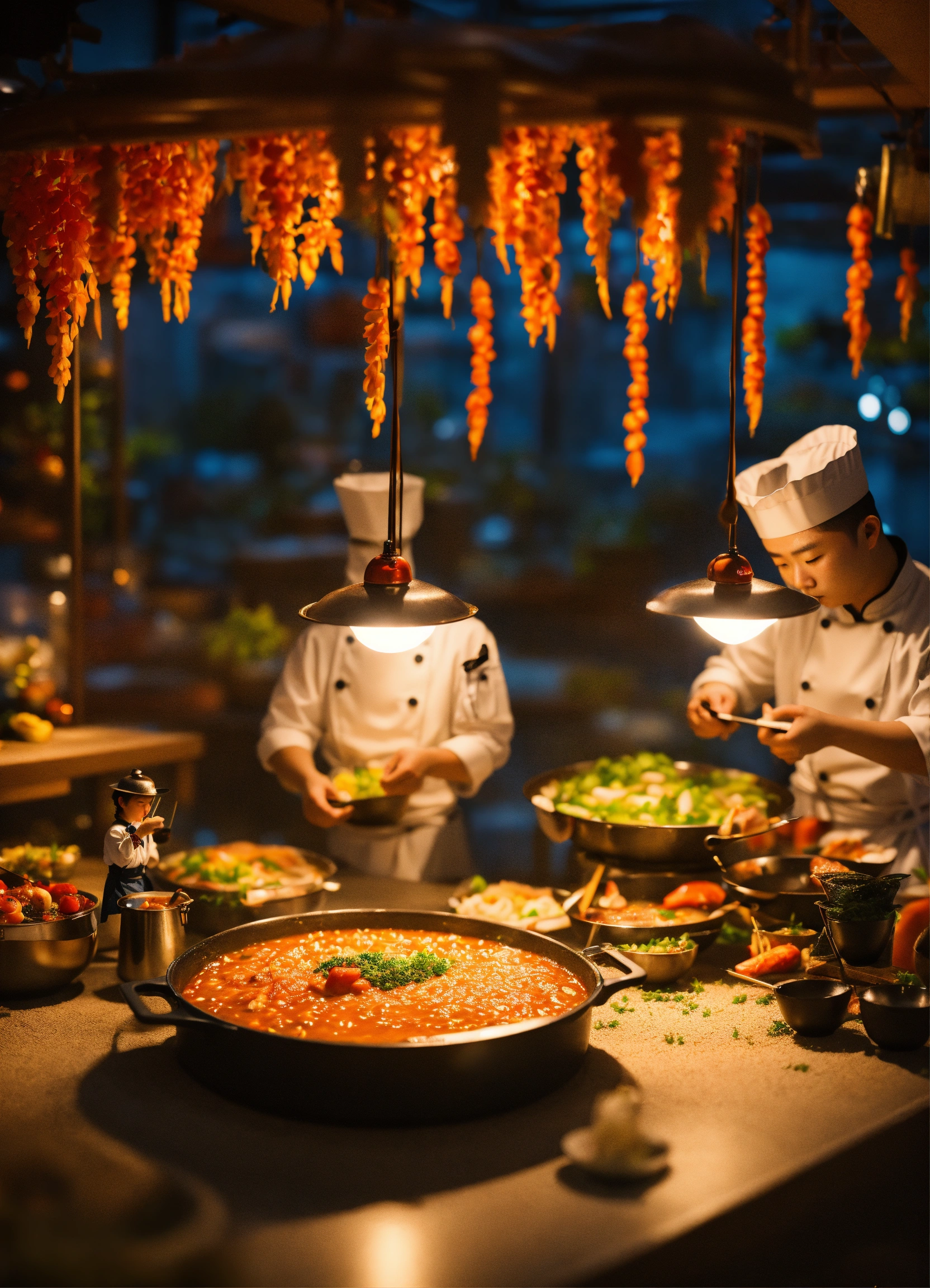Miniature harvest scene, sichuan hotpot restaurant chefs making food, people at work, creative photography posters, miniature photography, beautiful lighting, emphasis lighting, global lighting surreal, ultra - detailed, 8k, simple composition
