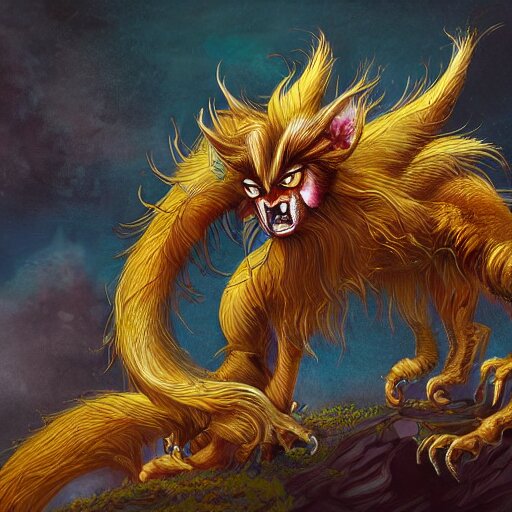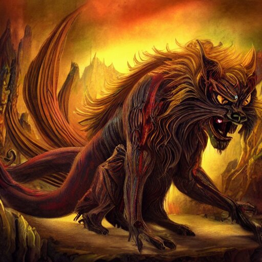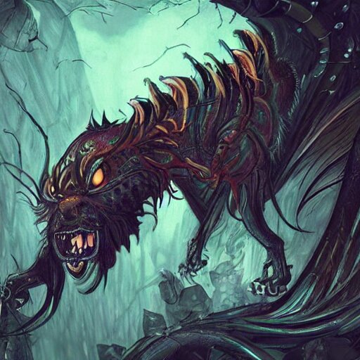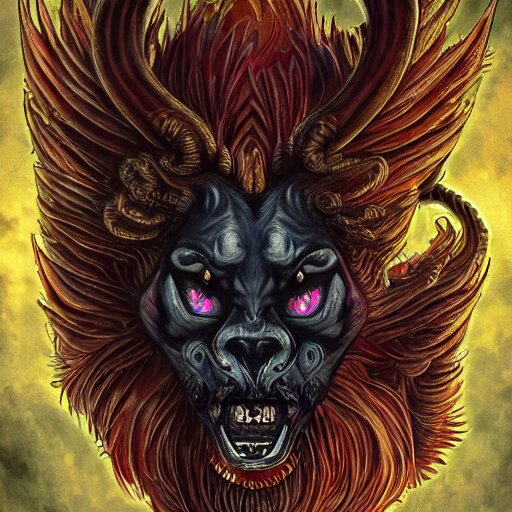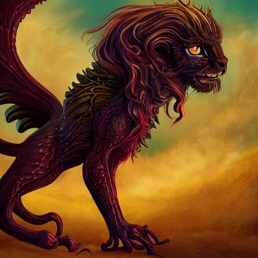 Manticore, gothic art, popping color, detailed, eerie, emotional, gothic, angry, highly detailed, incredibly sharp focus, artstation, deviantart, artgem, insane detail, intense color, vibrant cartoon art, award-winning art, super precise detail, golden ratio, in the style of pixar and disney